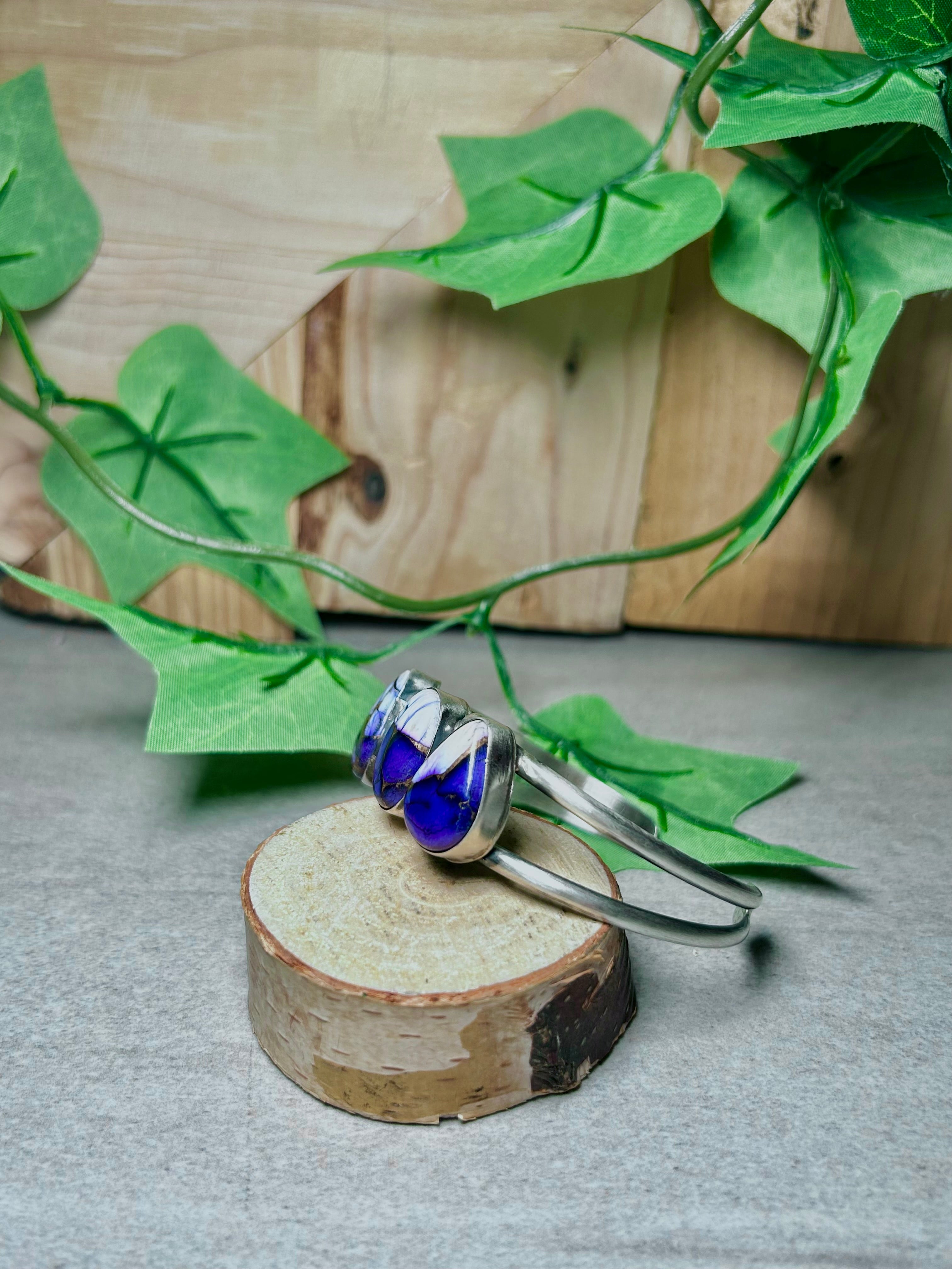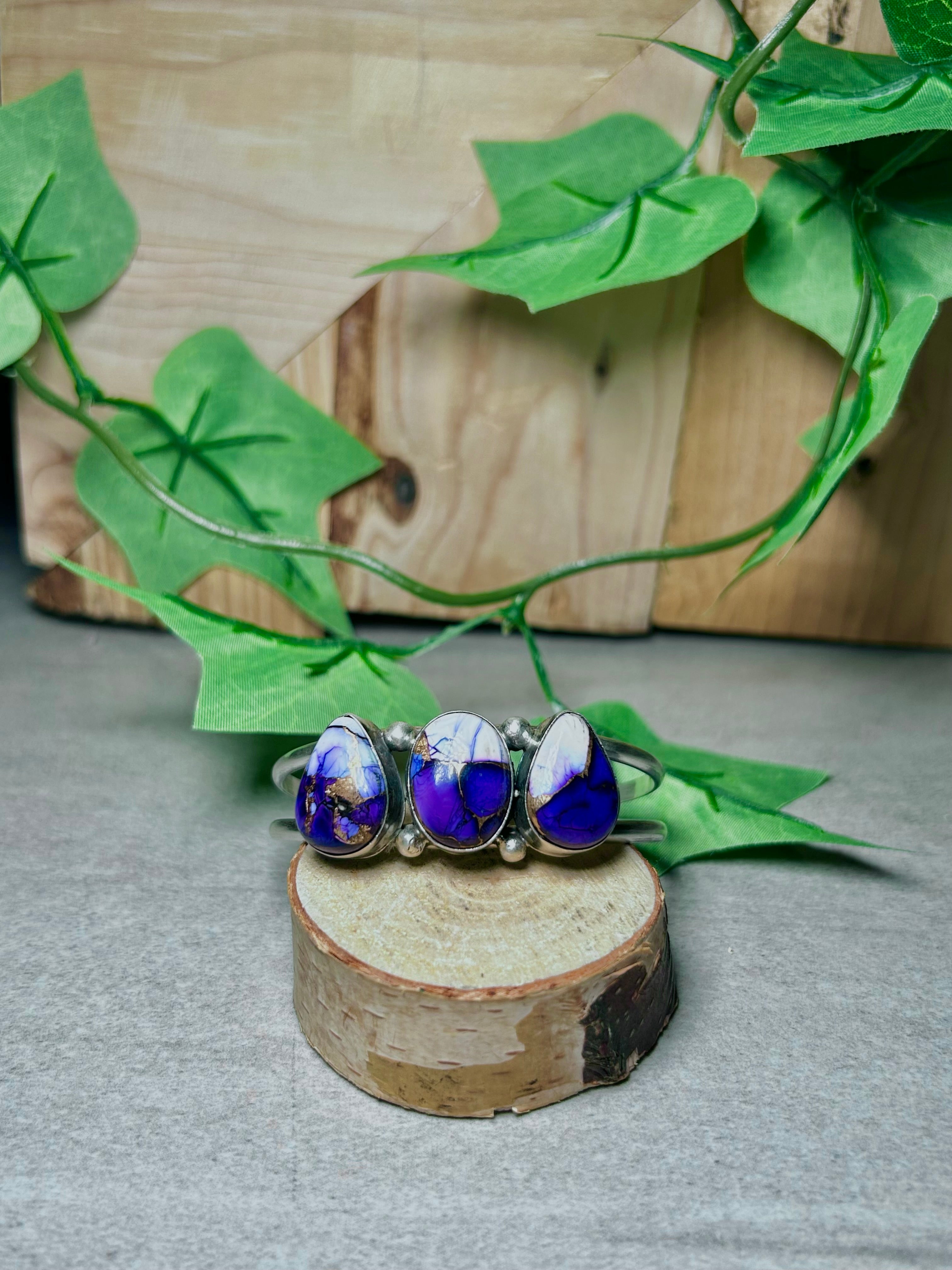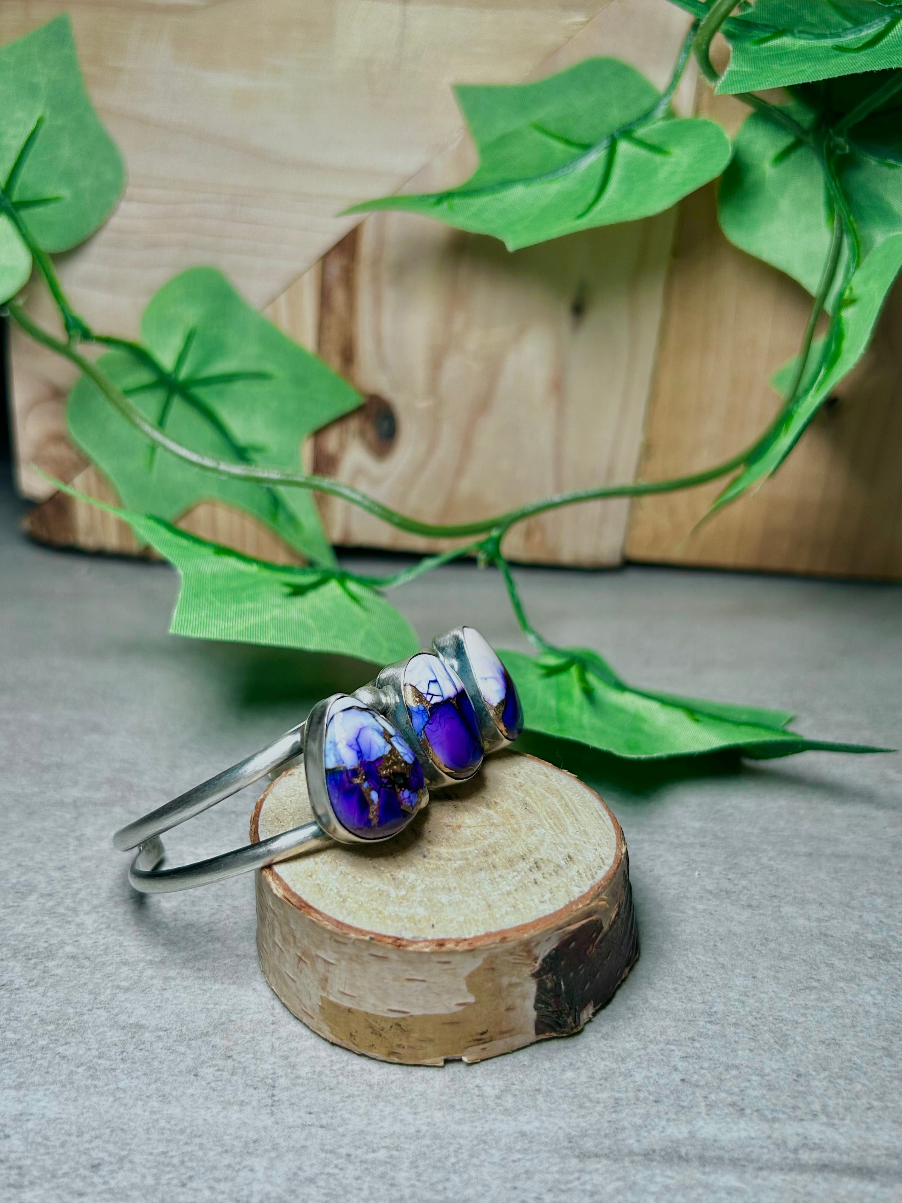 Augustine Largo Grape Dahlia & Sterling Silver Cuff Bracelet. It measures 1 7/8 inches wide with an inside circumference of 5 1/2 inches and a gap of 1 inch Signed by the artist and stamped sterling silver.