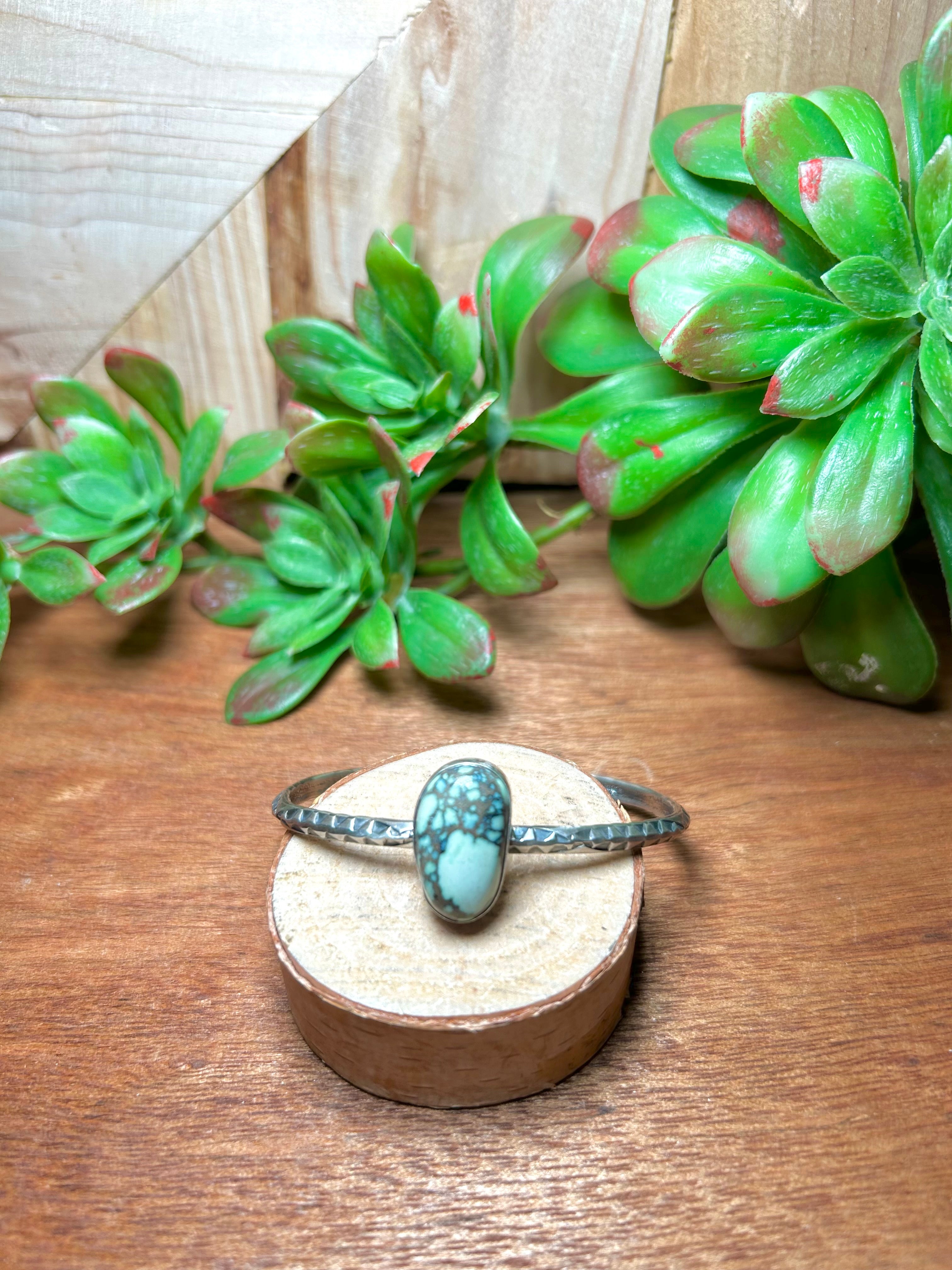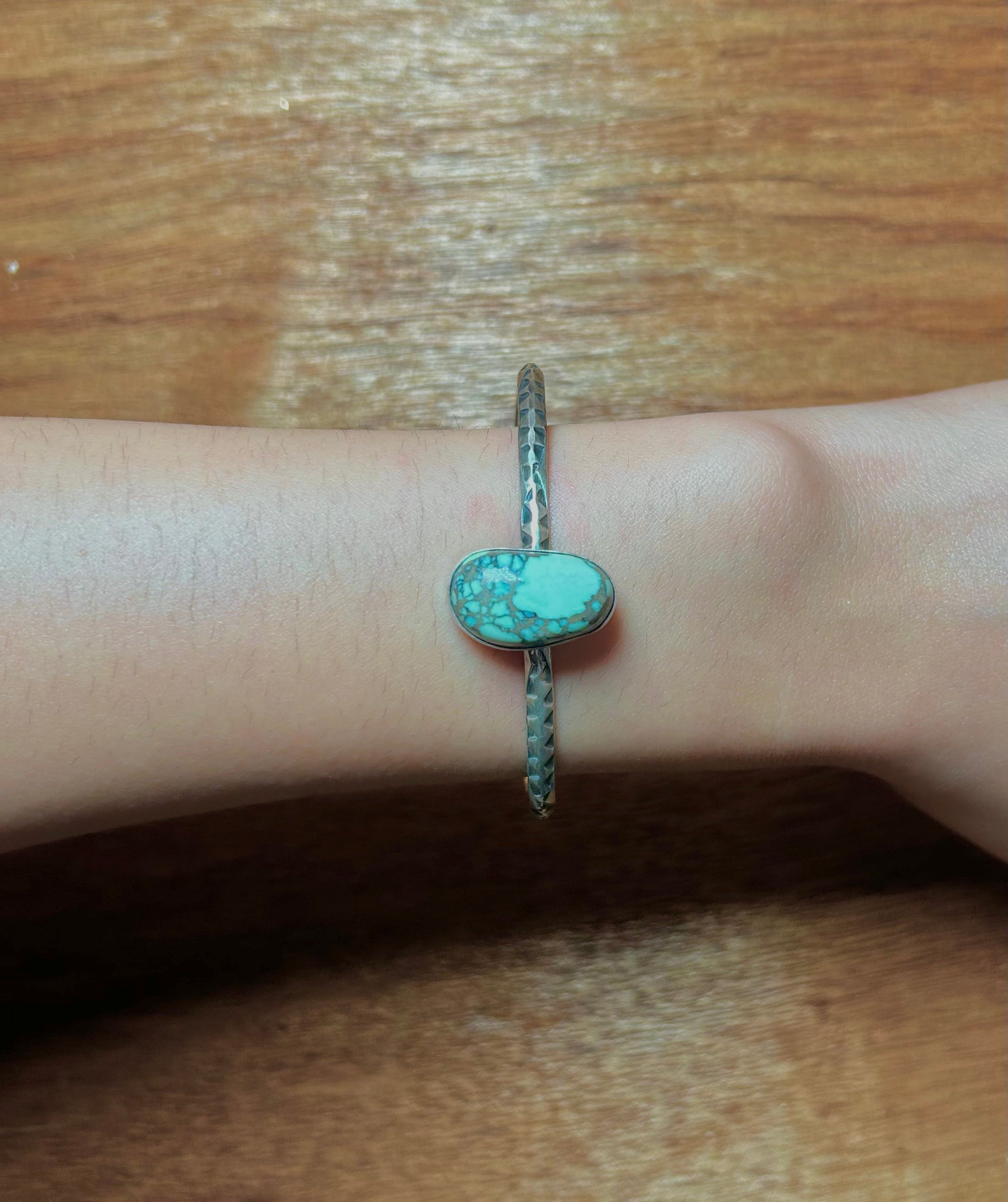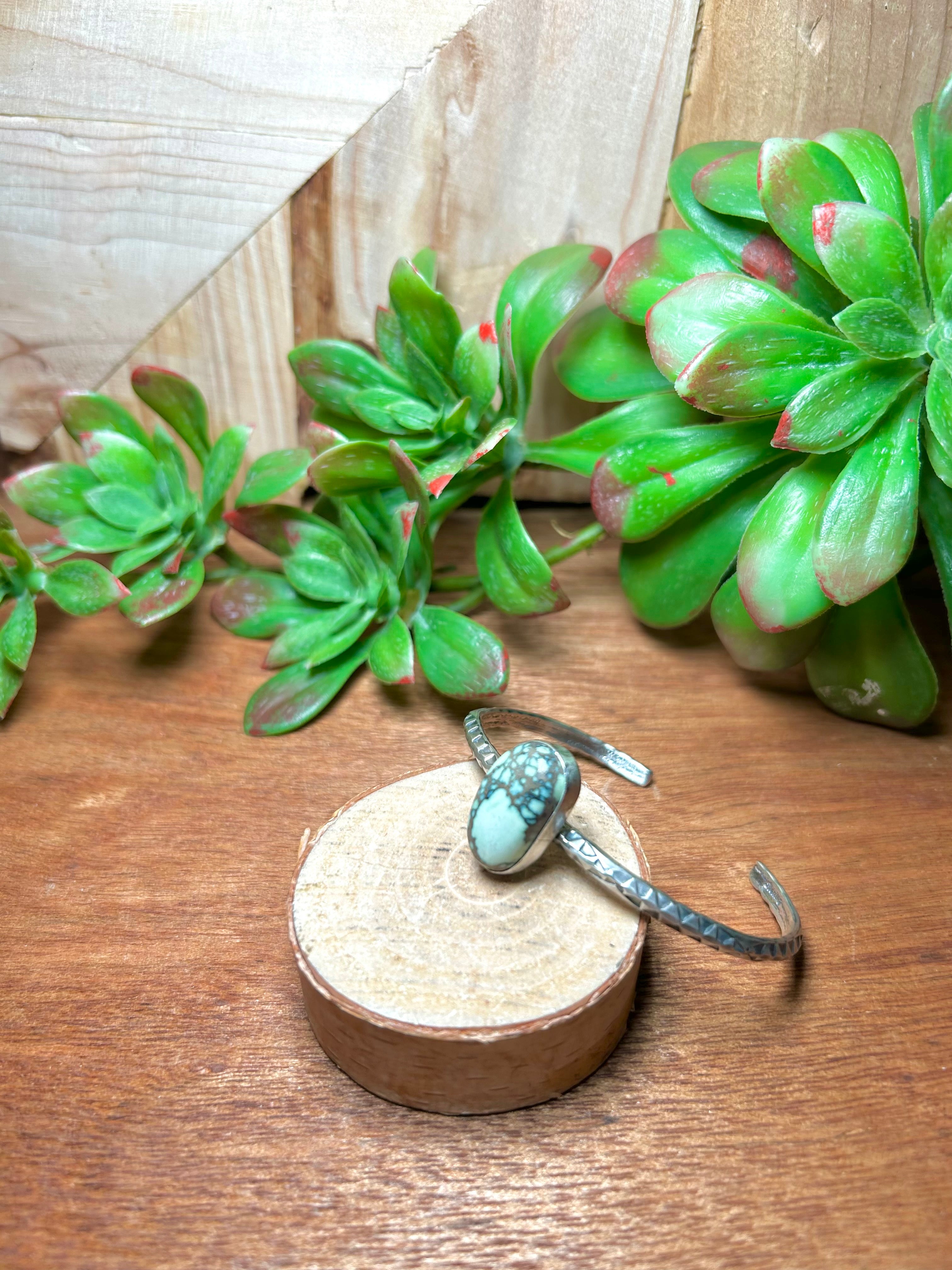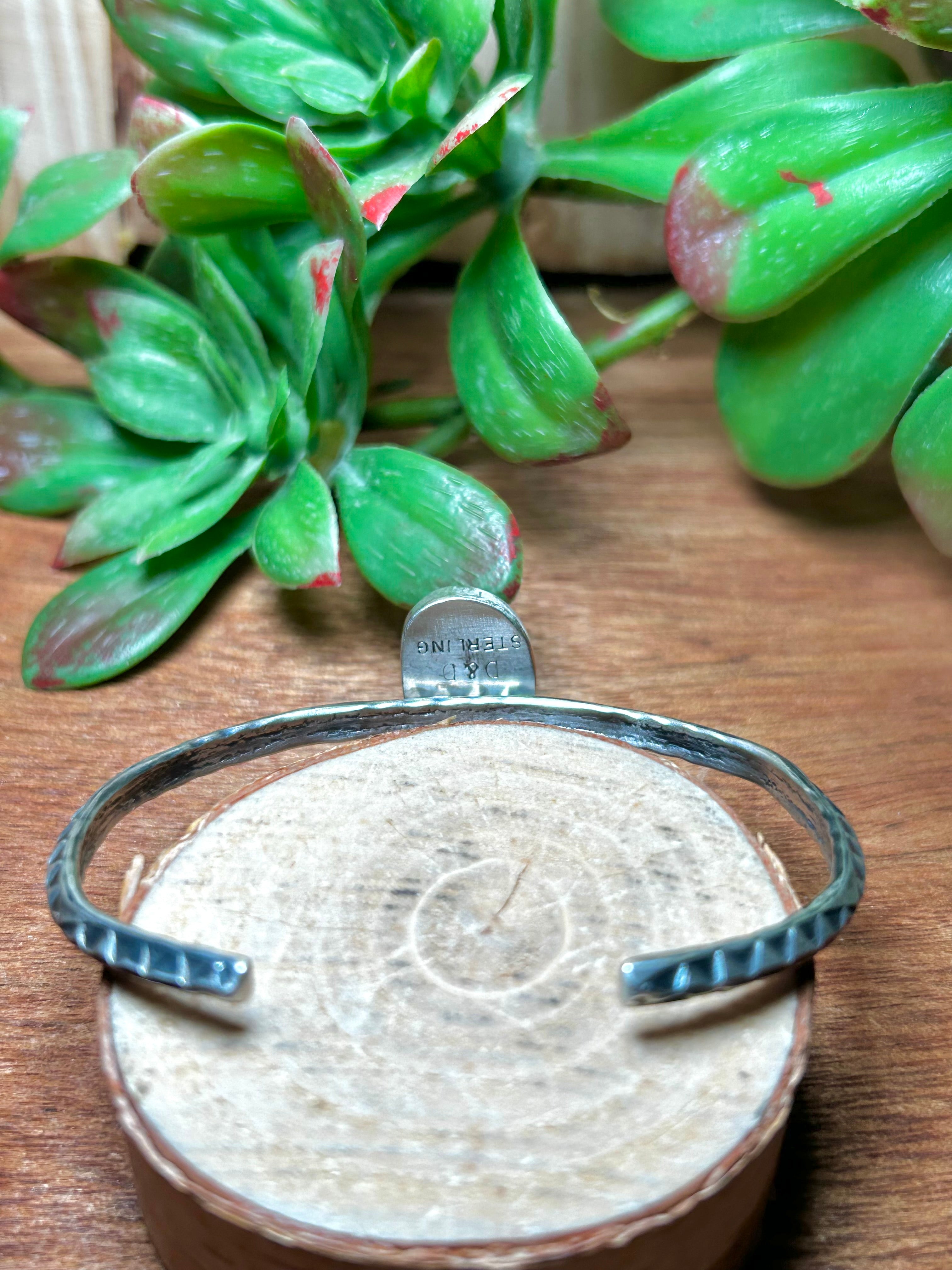 Navajo Made New Lander Varicsite & Sterling Silver Cuff Bracelet. It measures 3/4 of an inch wide with an inside circumference of 5 1/4 inches and a gap of 1 1/8 inches. Signed by artist and stamped sterling silver.