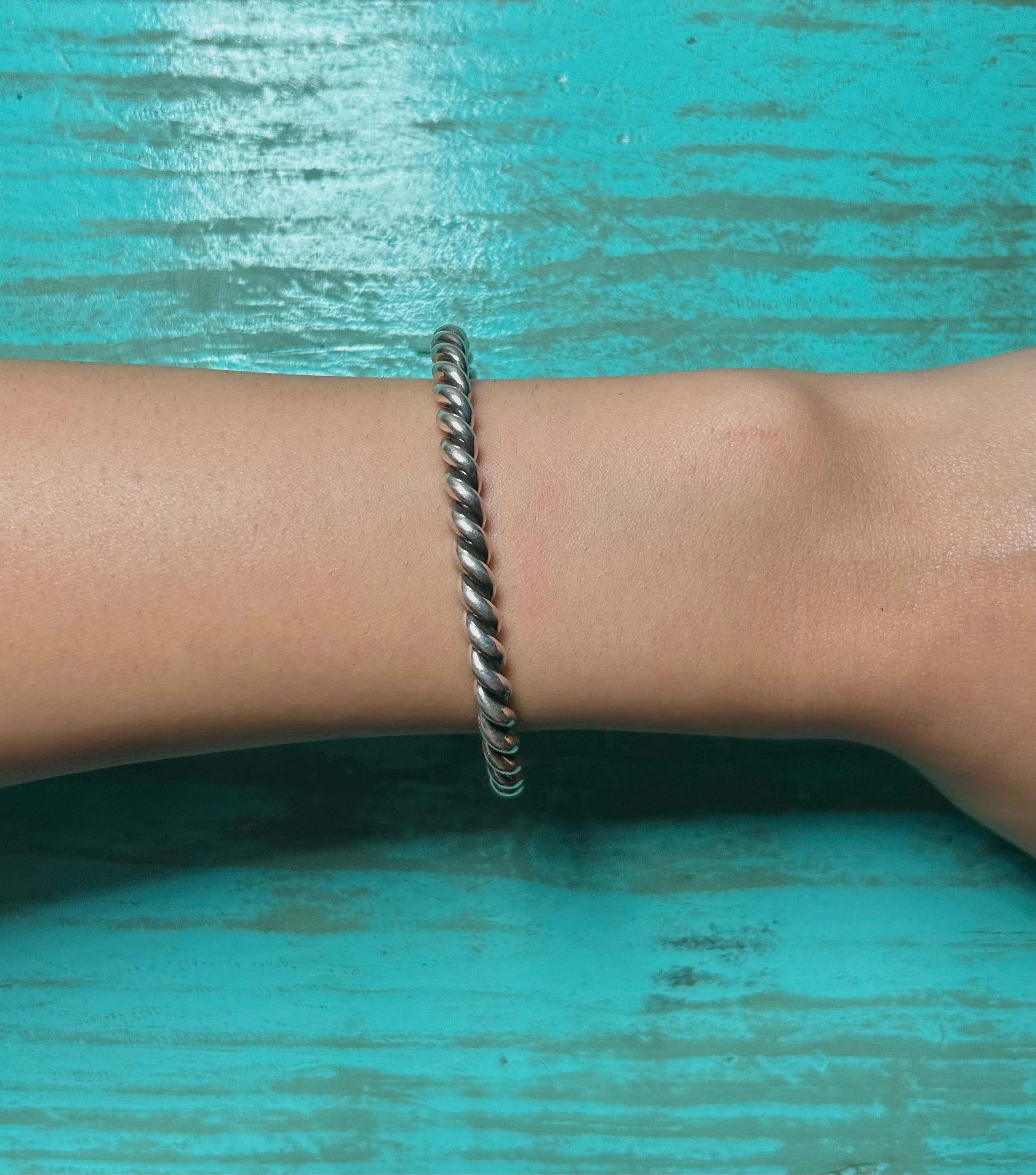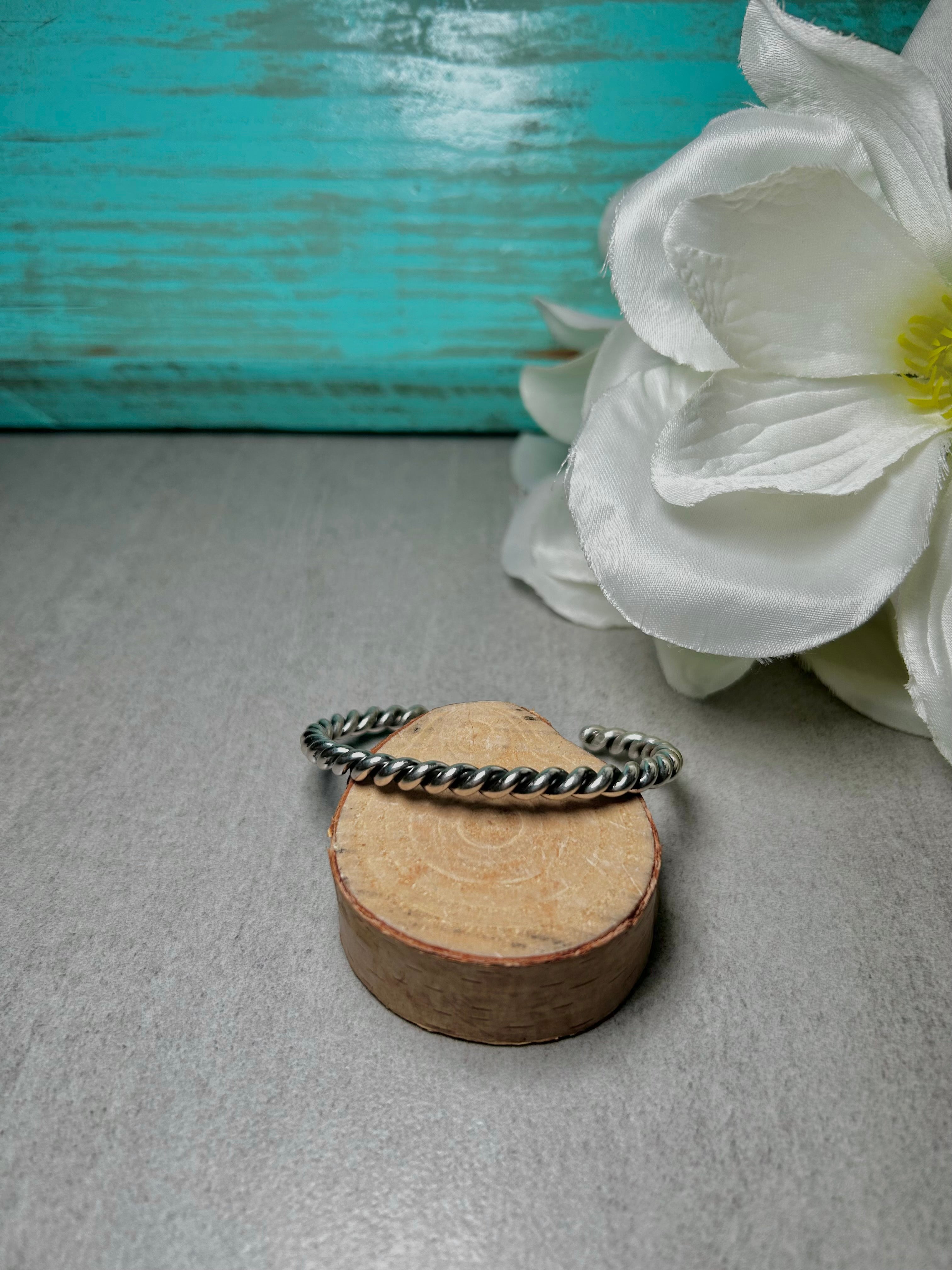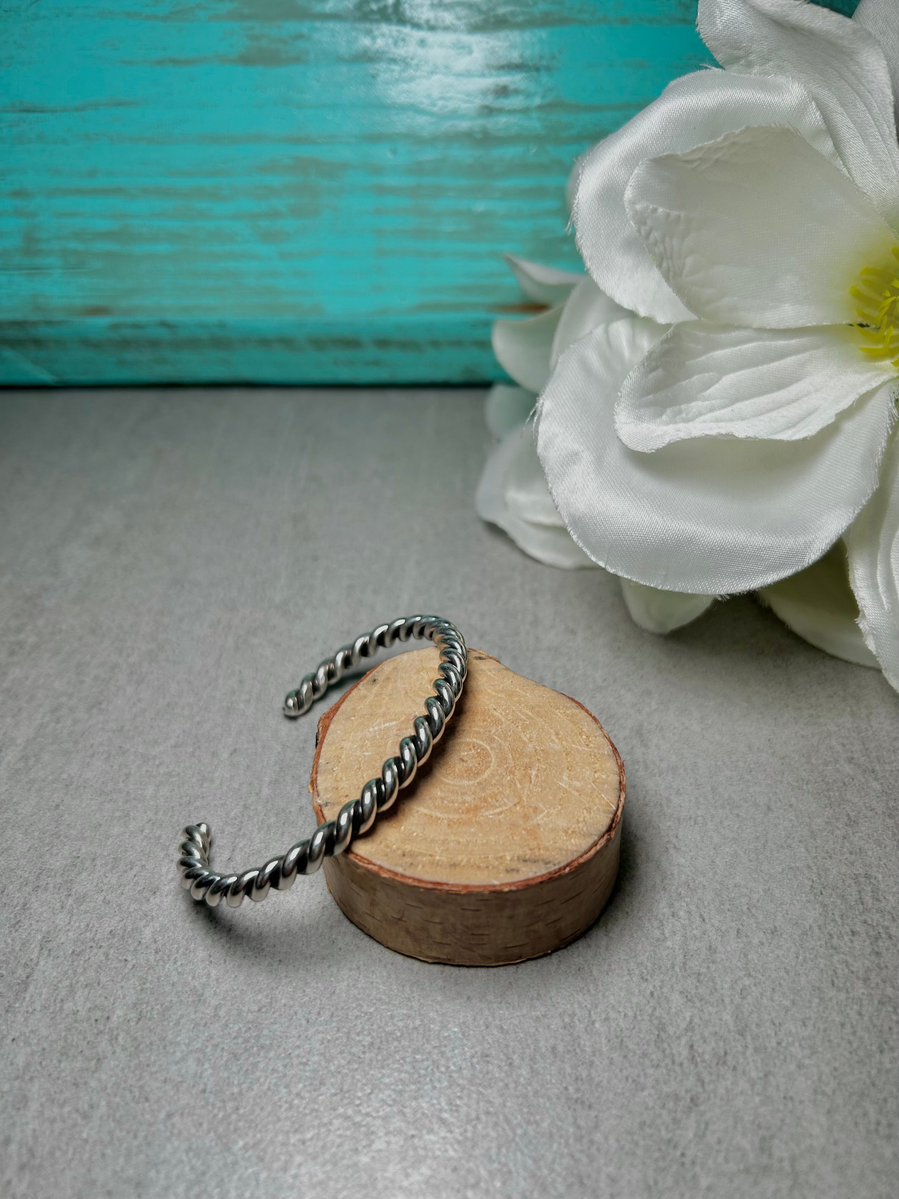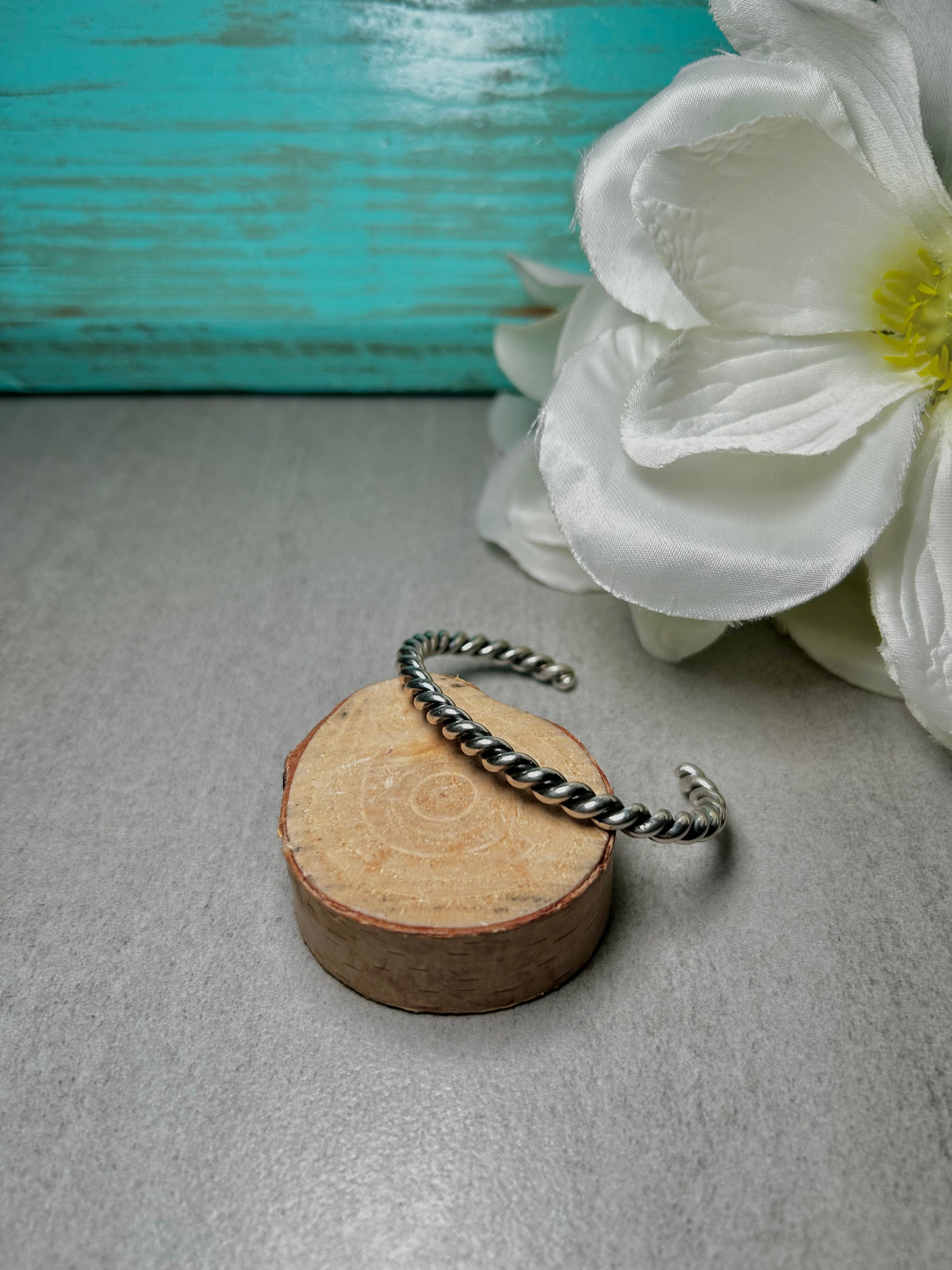 Navajo Made Sterling Silver Cuff Bracelet. It measures 1/4 of an inch wide with an inside circumference of 4 7/8 inches and a gap of 1 1/4 inches. Signed by the artist and stamped sterling silver.