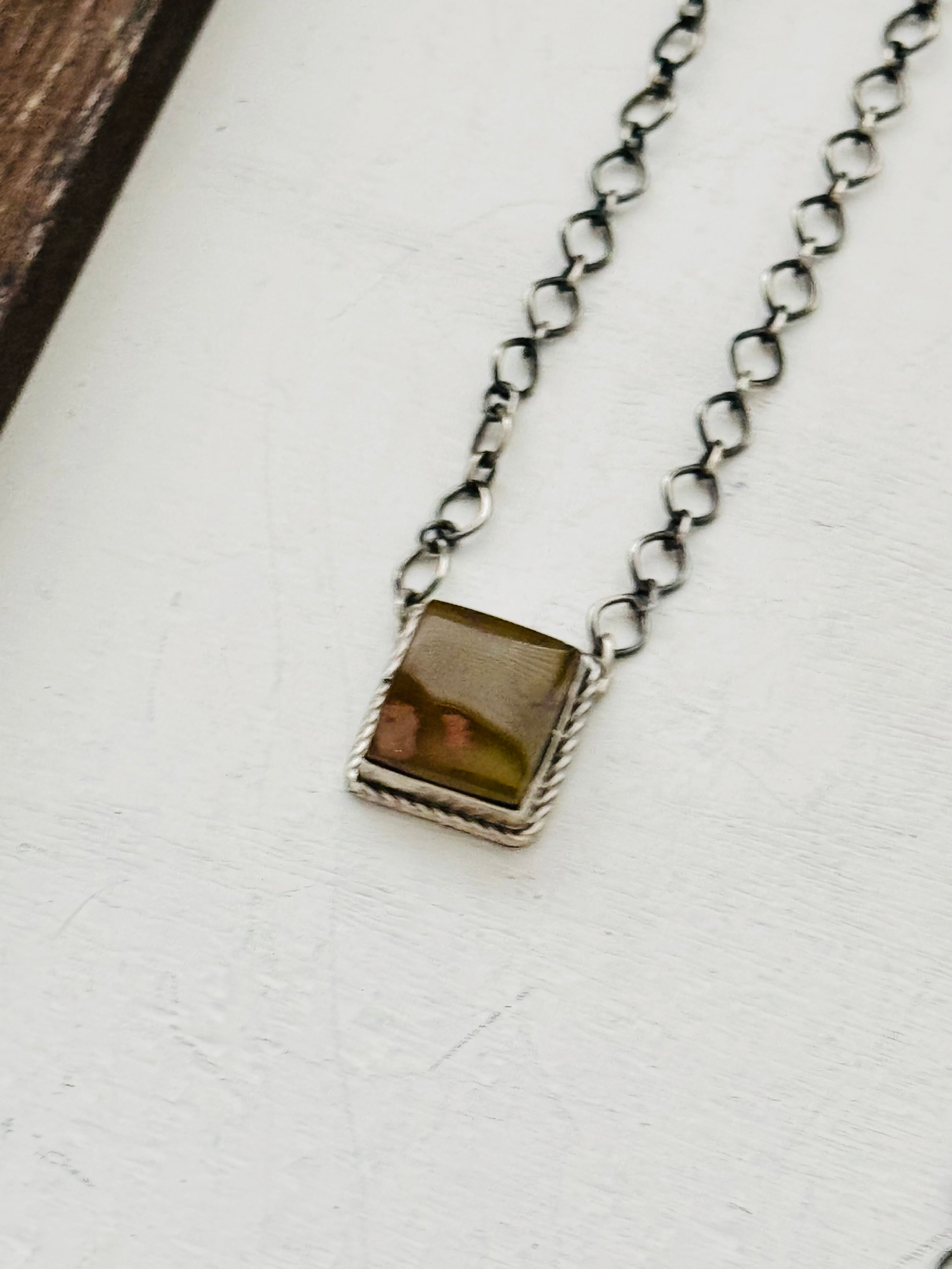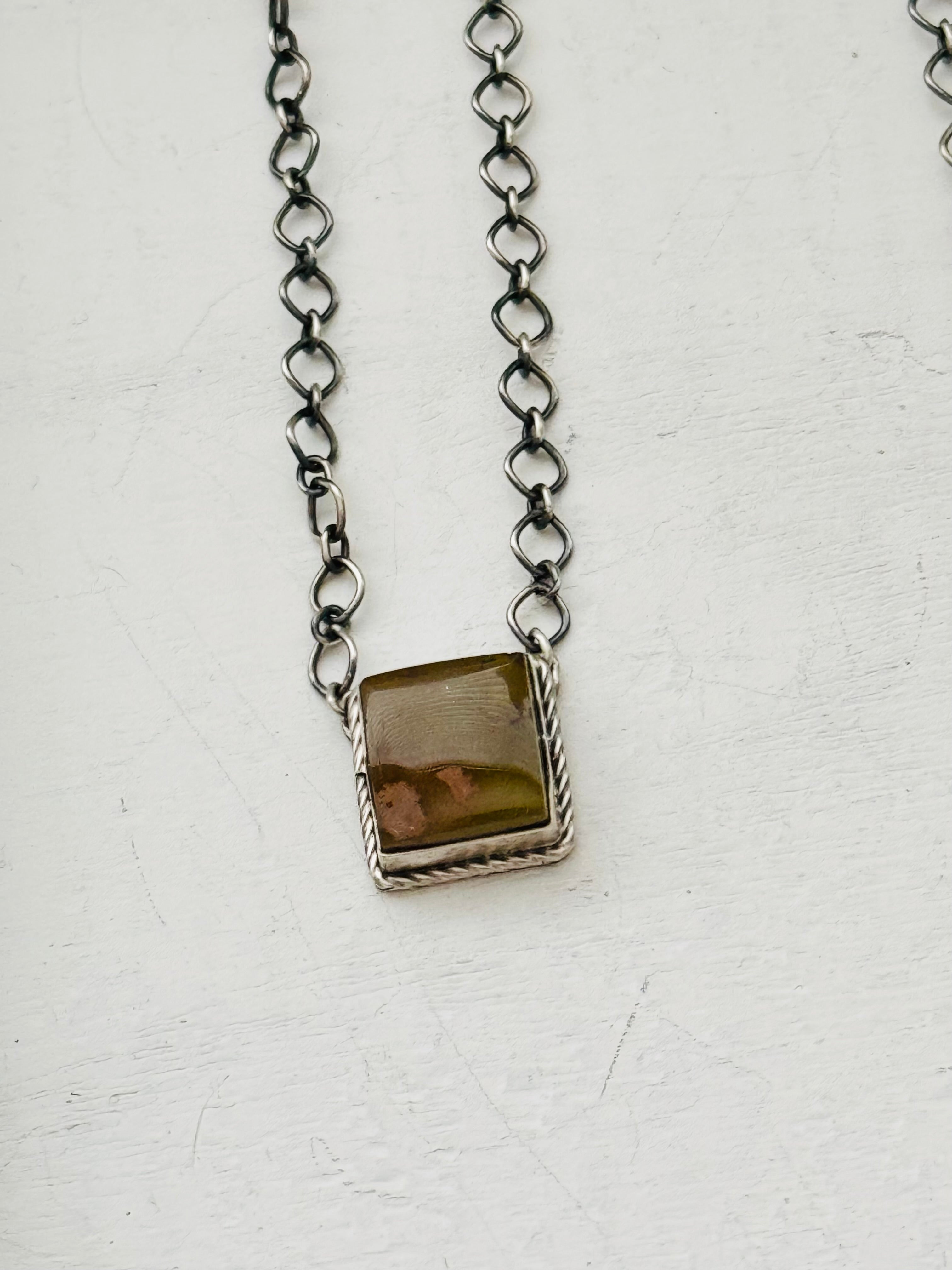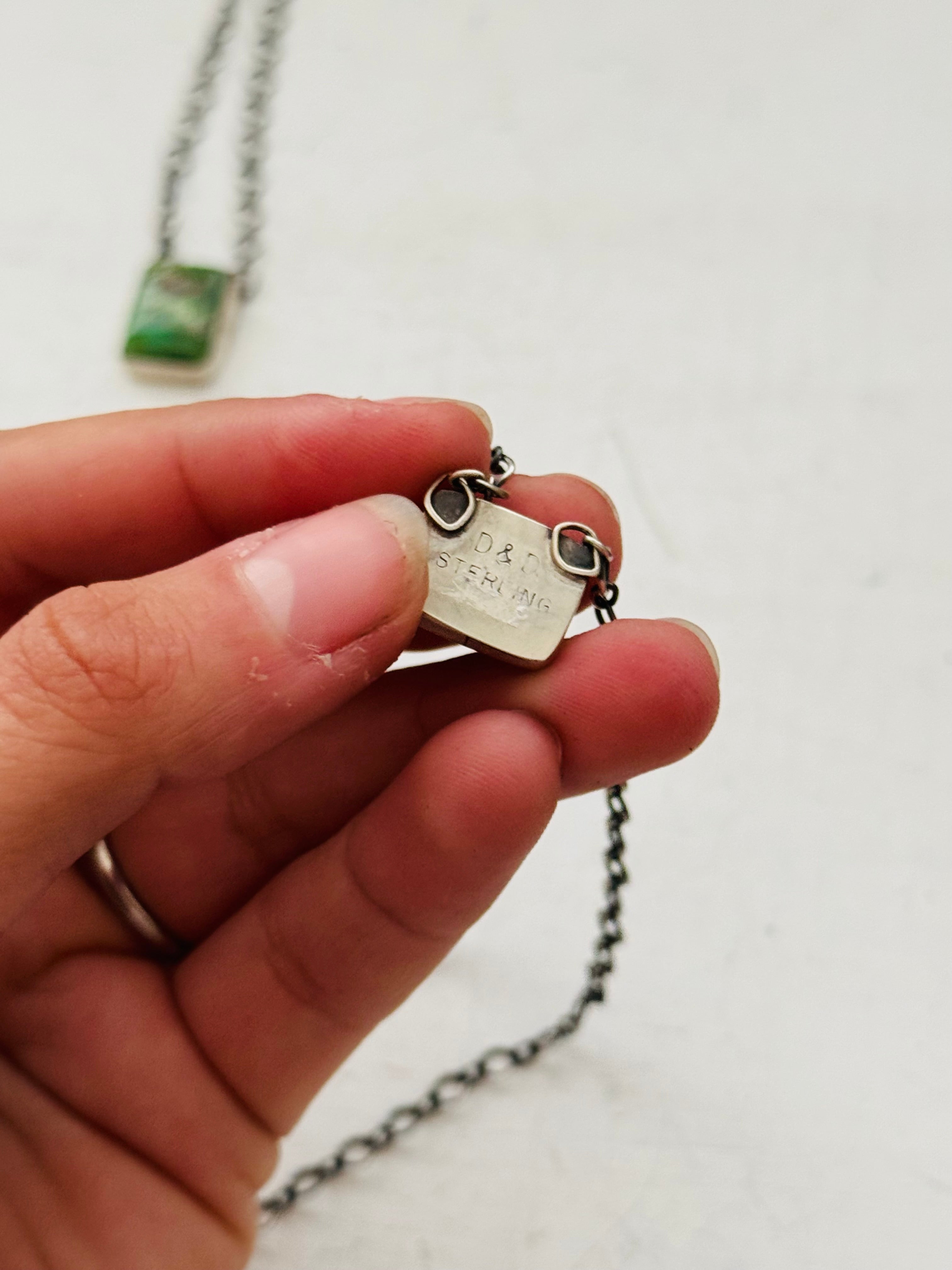 Navajo Made Royston Turquoise & Sterling Silver Necklace. It measures 18 inches long with hang while the chain by itself measures 17 inches long. Signed by the artist and stamped sterling silver.
