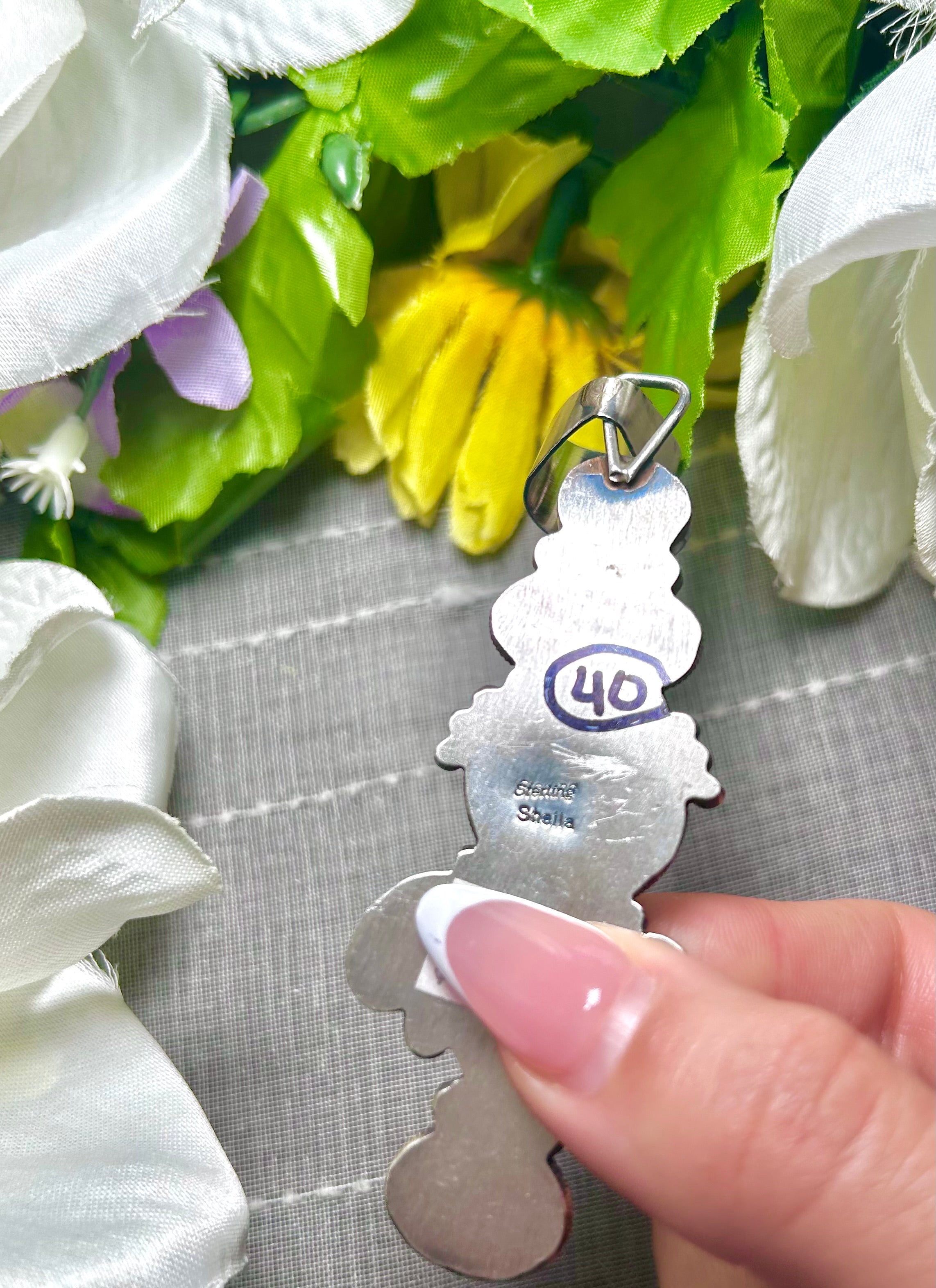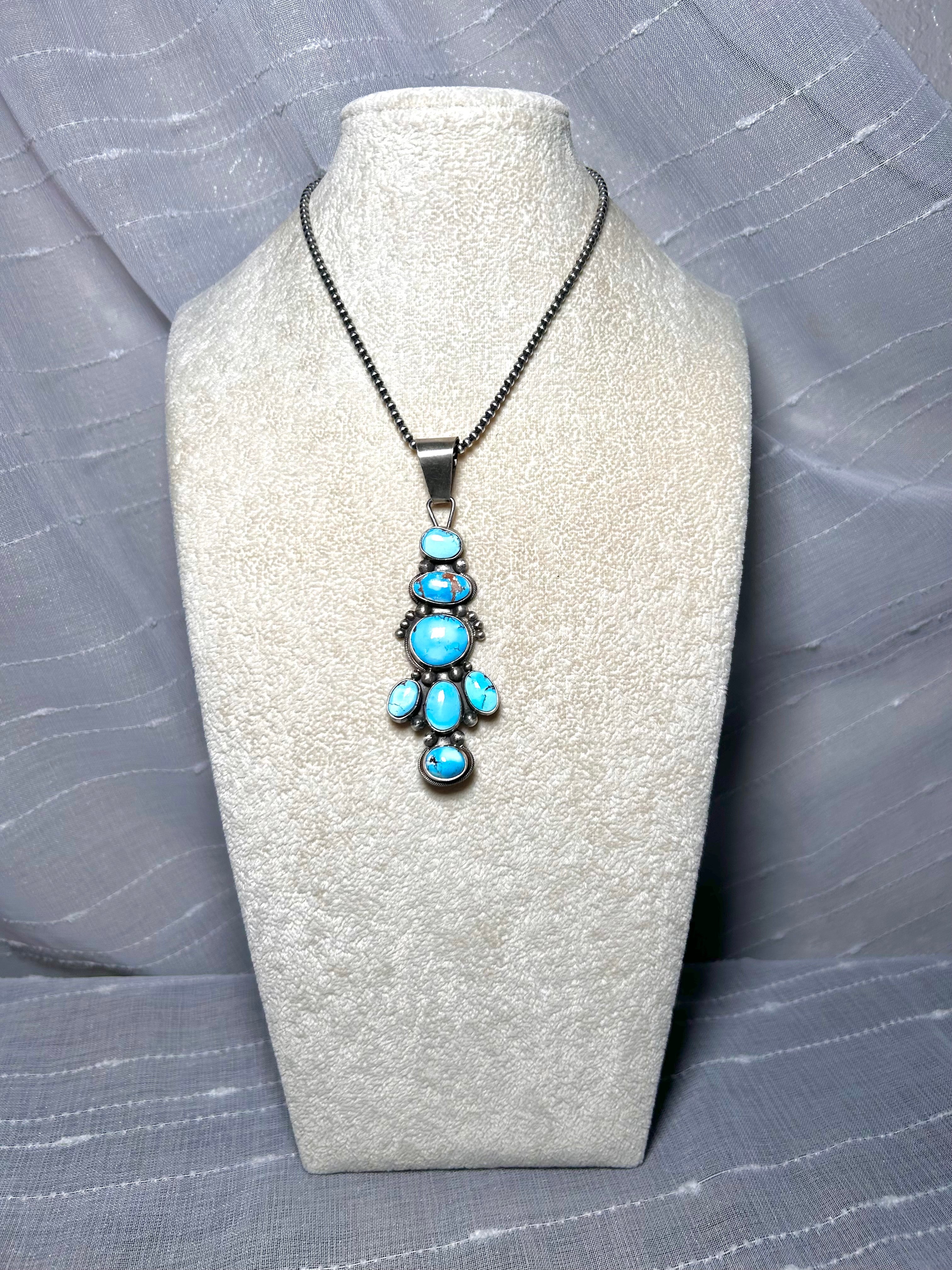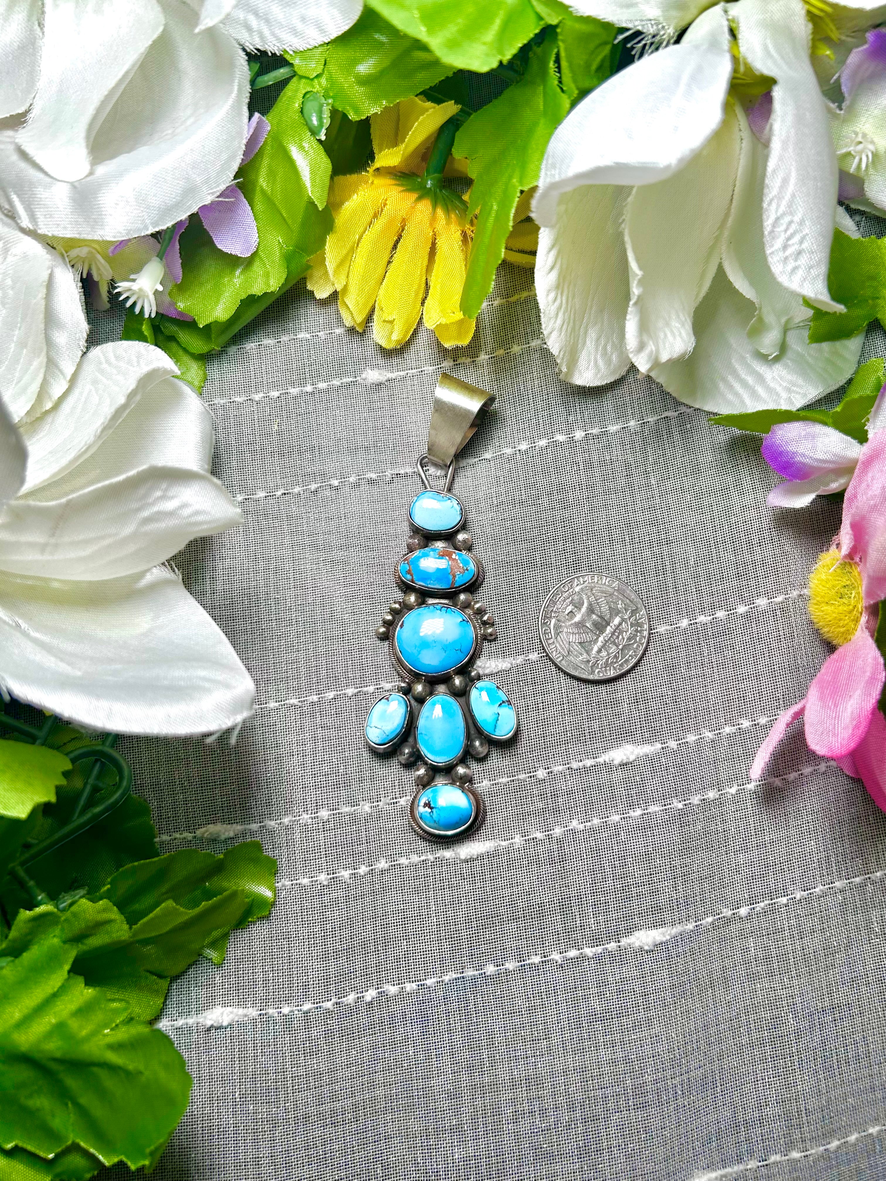 Sheila Becenti Golden Hill Turquoise & Sterling Silver Pendant. It measures 4 inches long and 1 1/4 inches wide. Pendant Only! Signed by the artist and stamped sterling silver.