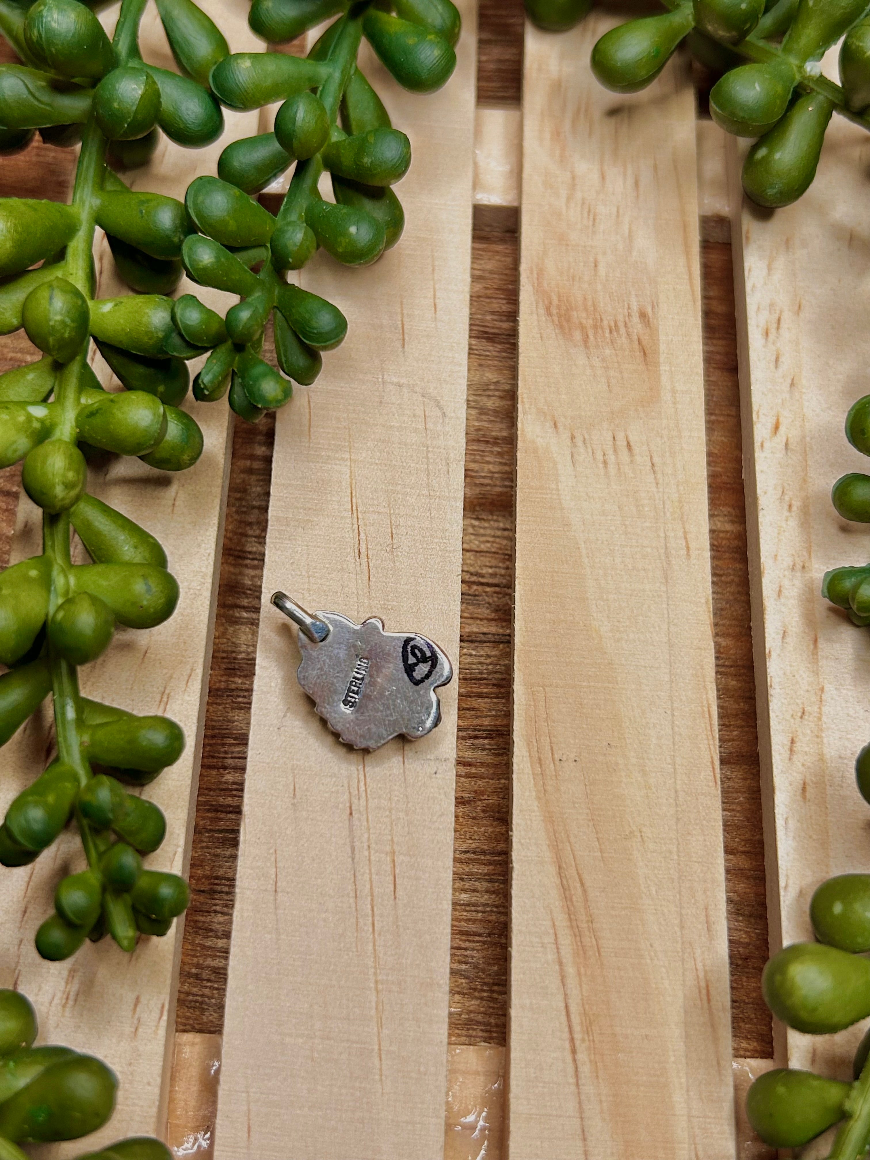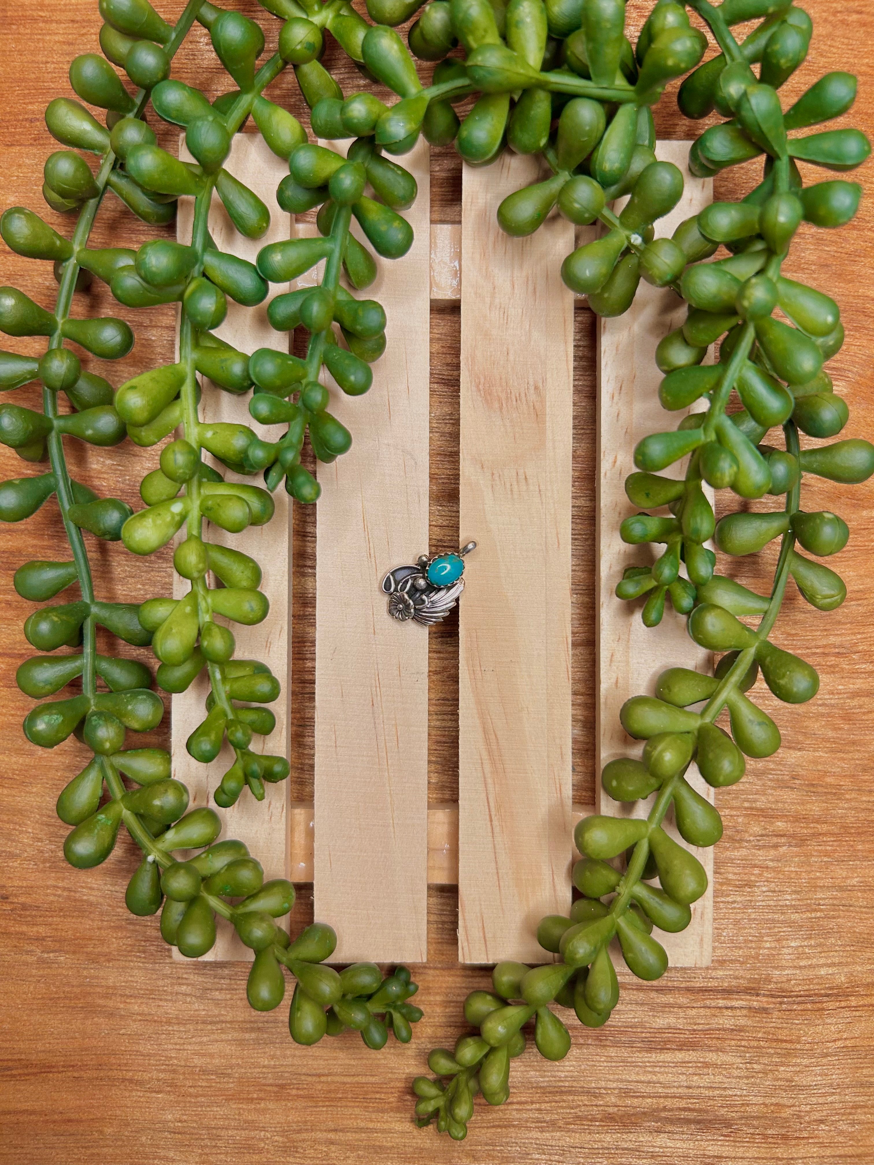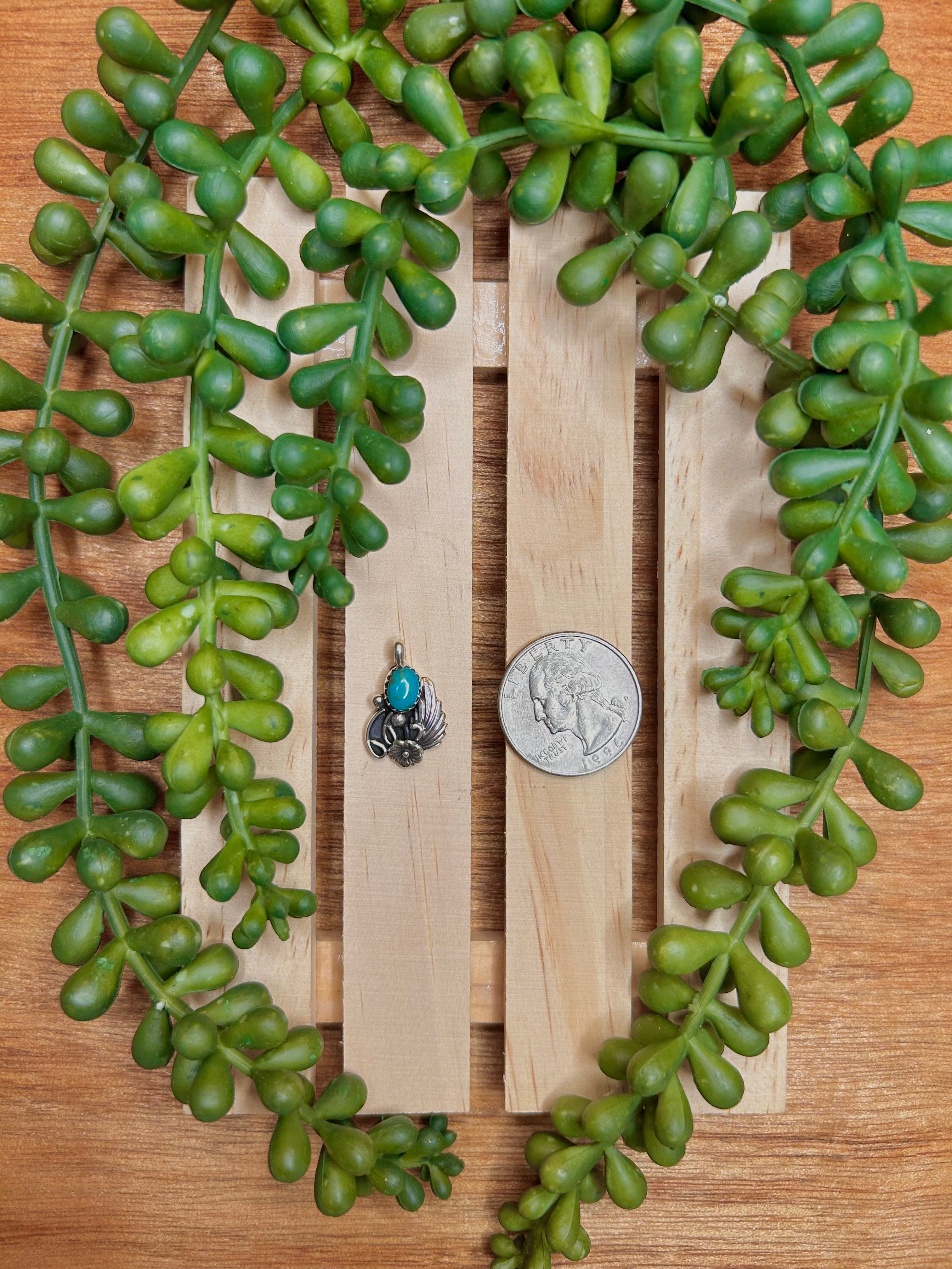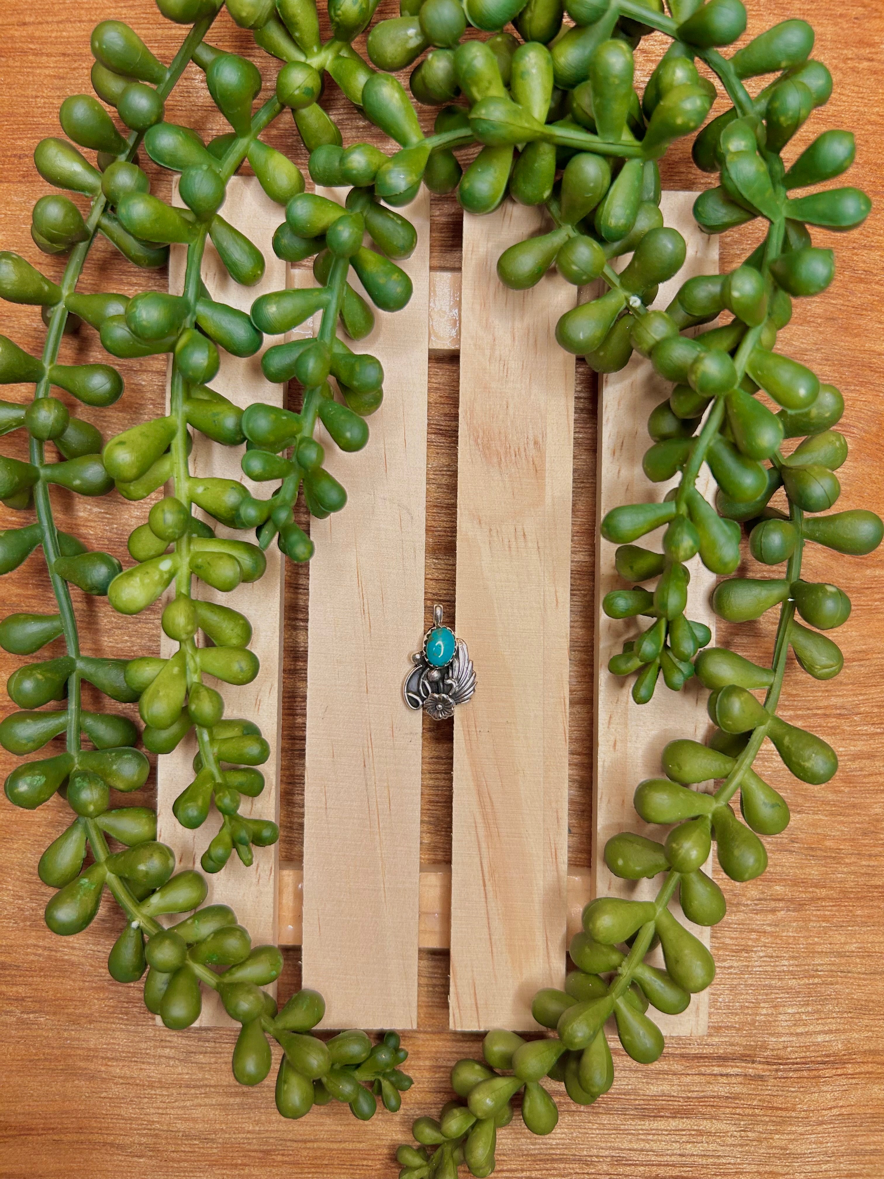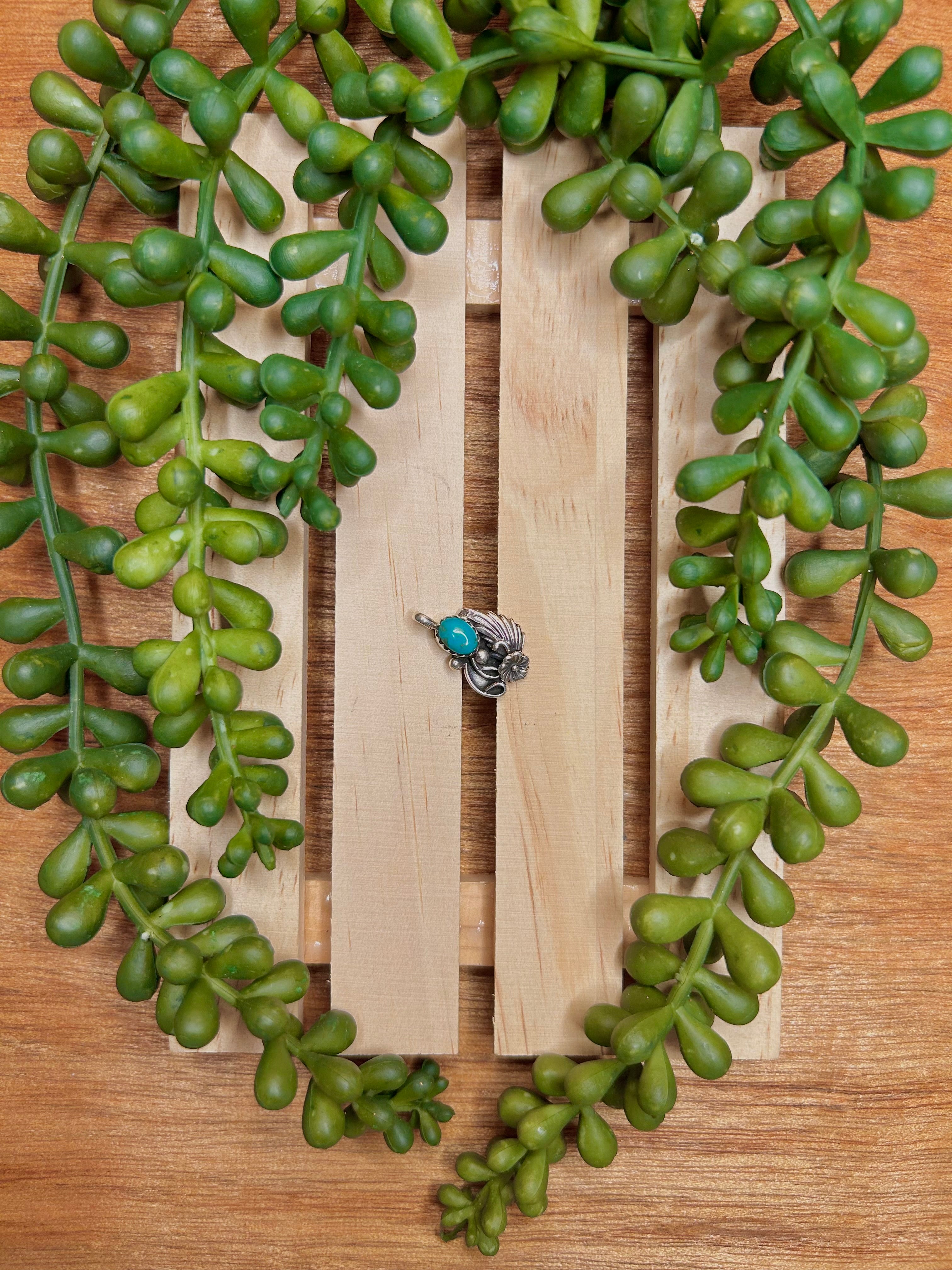 Navajo Made Kingman Turquoise & Sterling Silver Pendant. It measures 3/4 of an inch long and 1/2 of an inch wide. Pendant Only. Signed by the artist and stamped sterling silver. Stones will differ due to natural stones.