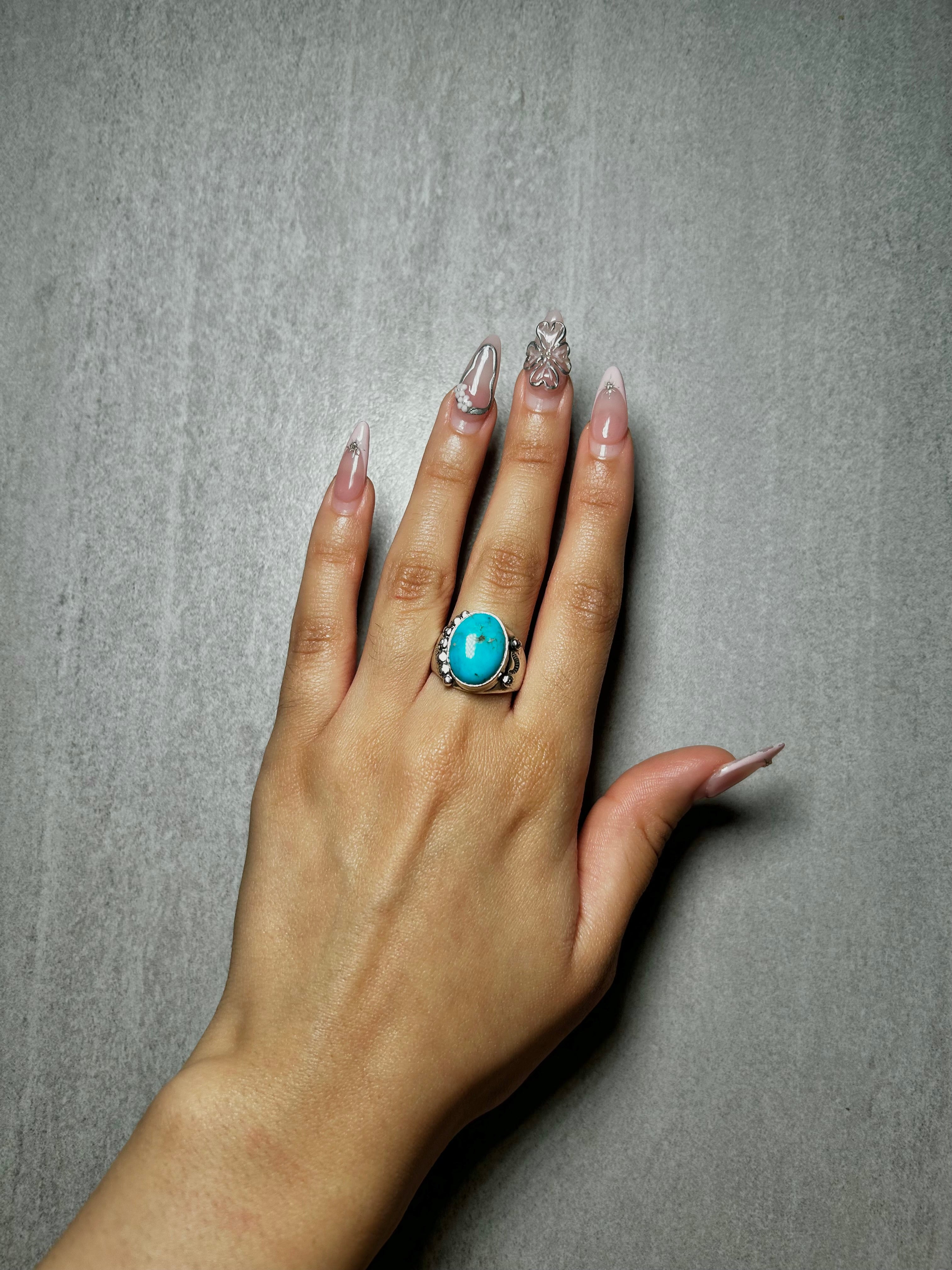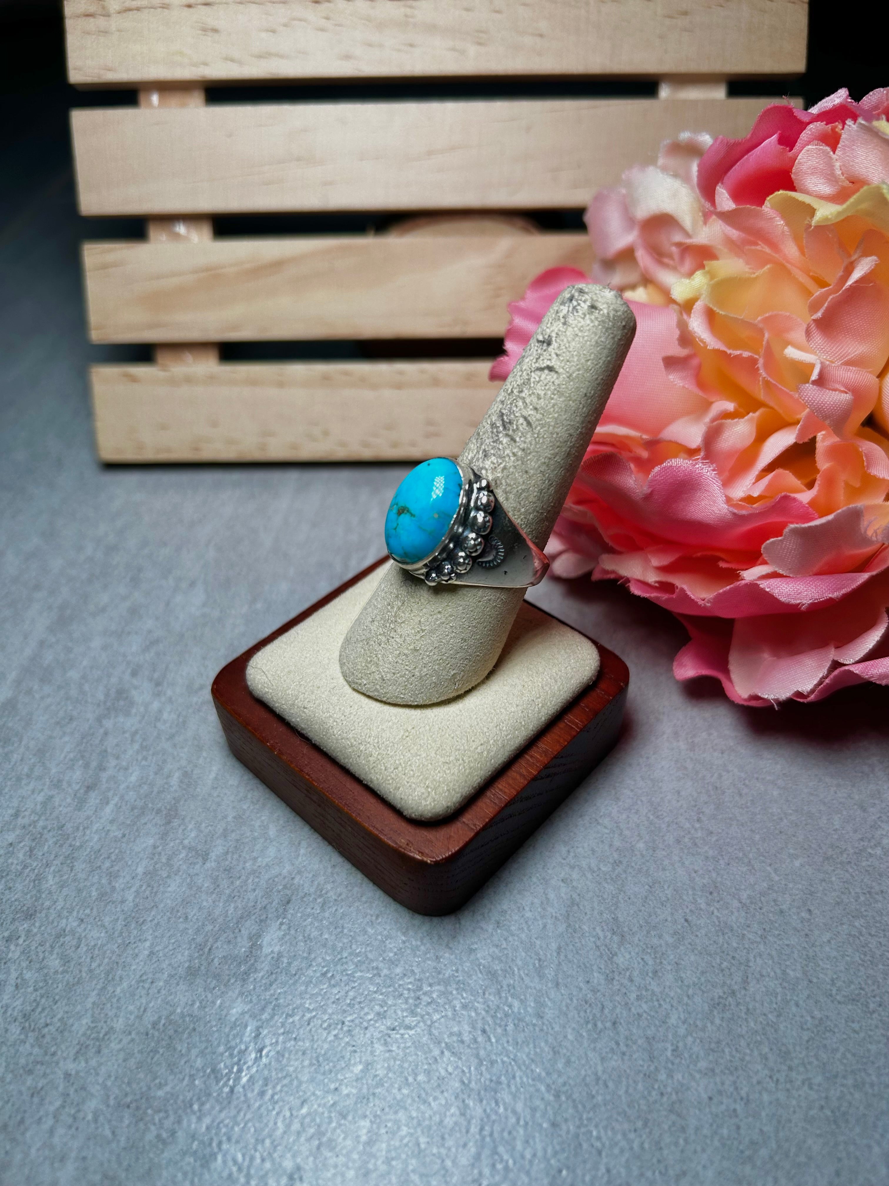 Navajo Made Kingman Turquoise & Sterling Silver Ring Size 8.75. It measures 3/4 of an inch long and 1/2 of an inch wide. Stamped sterling silver and signed.