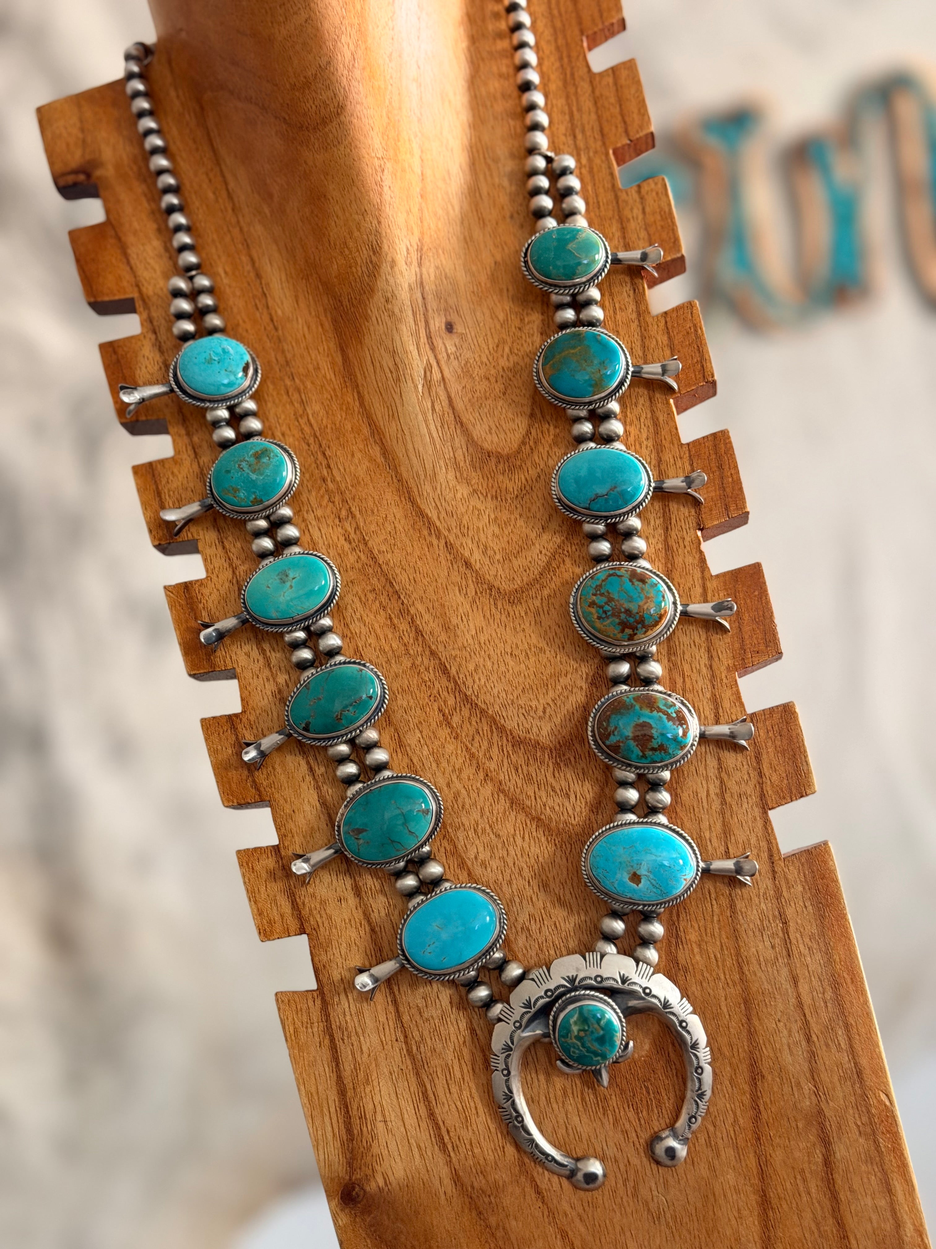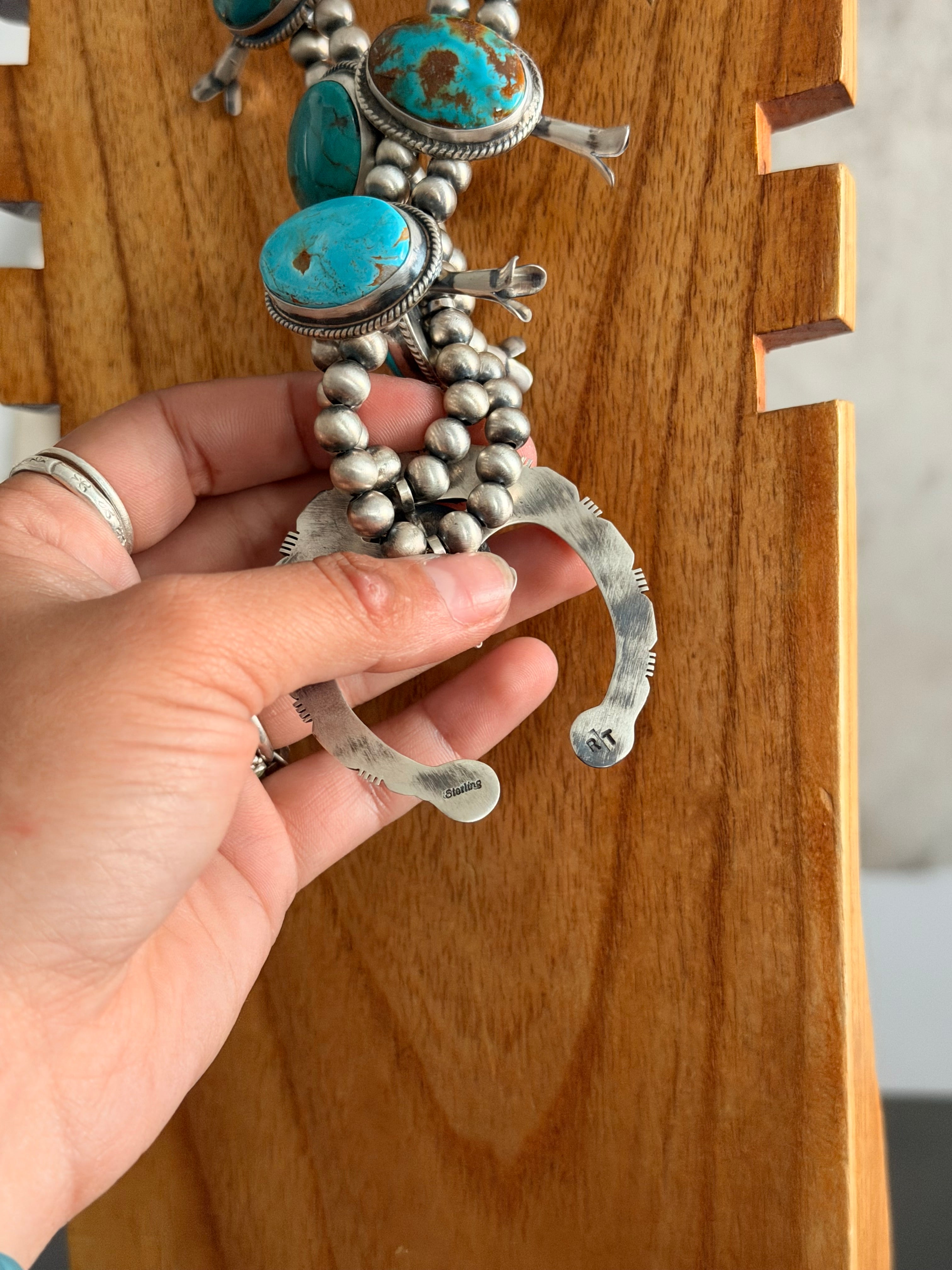 Navajo Made Royston Turquoise & Sterling Silver Squash Blossom Necklace Set