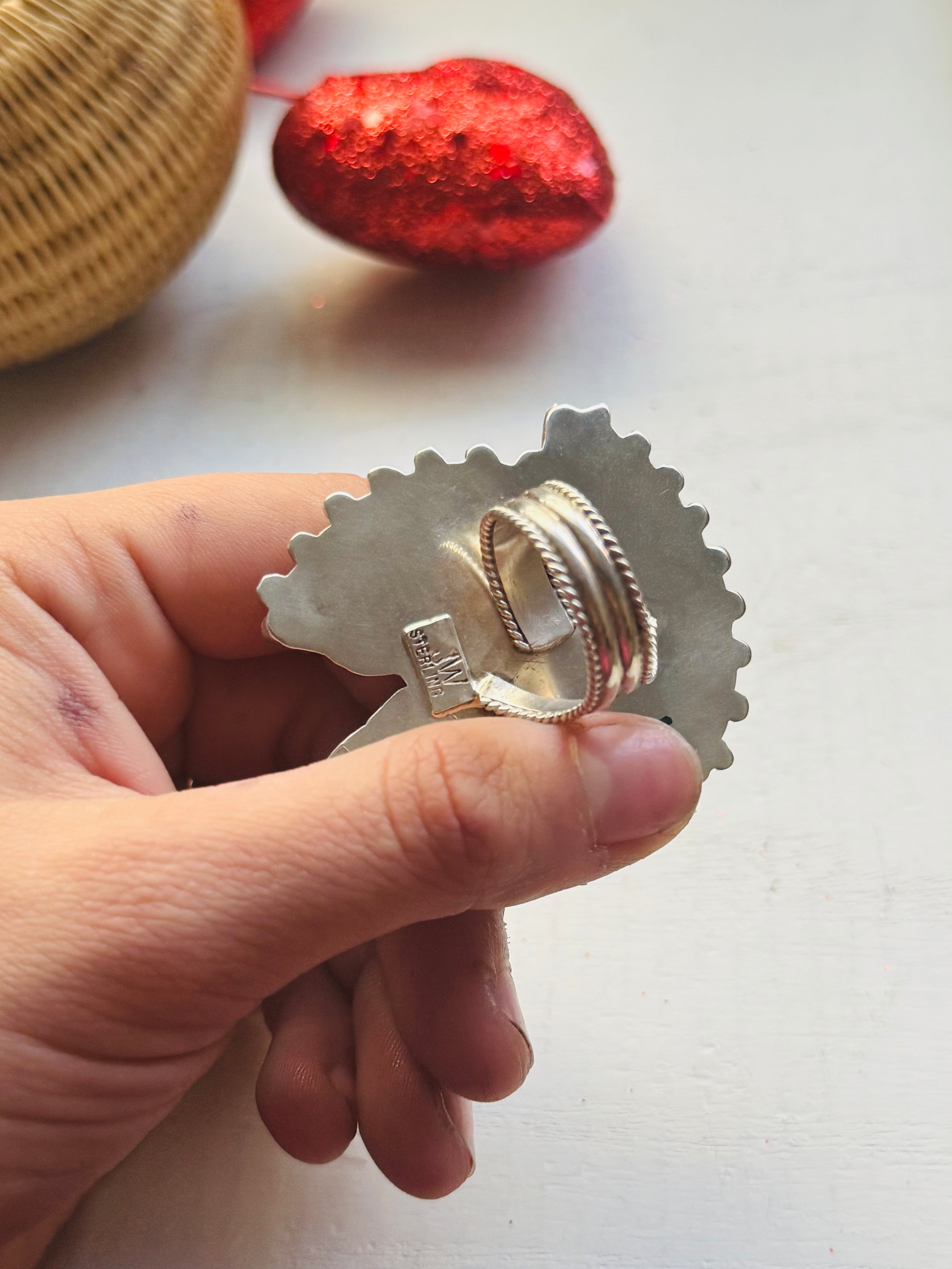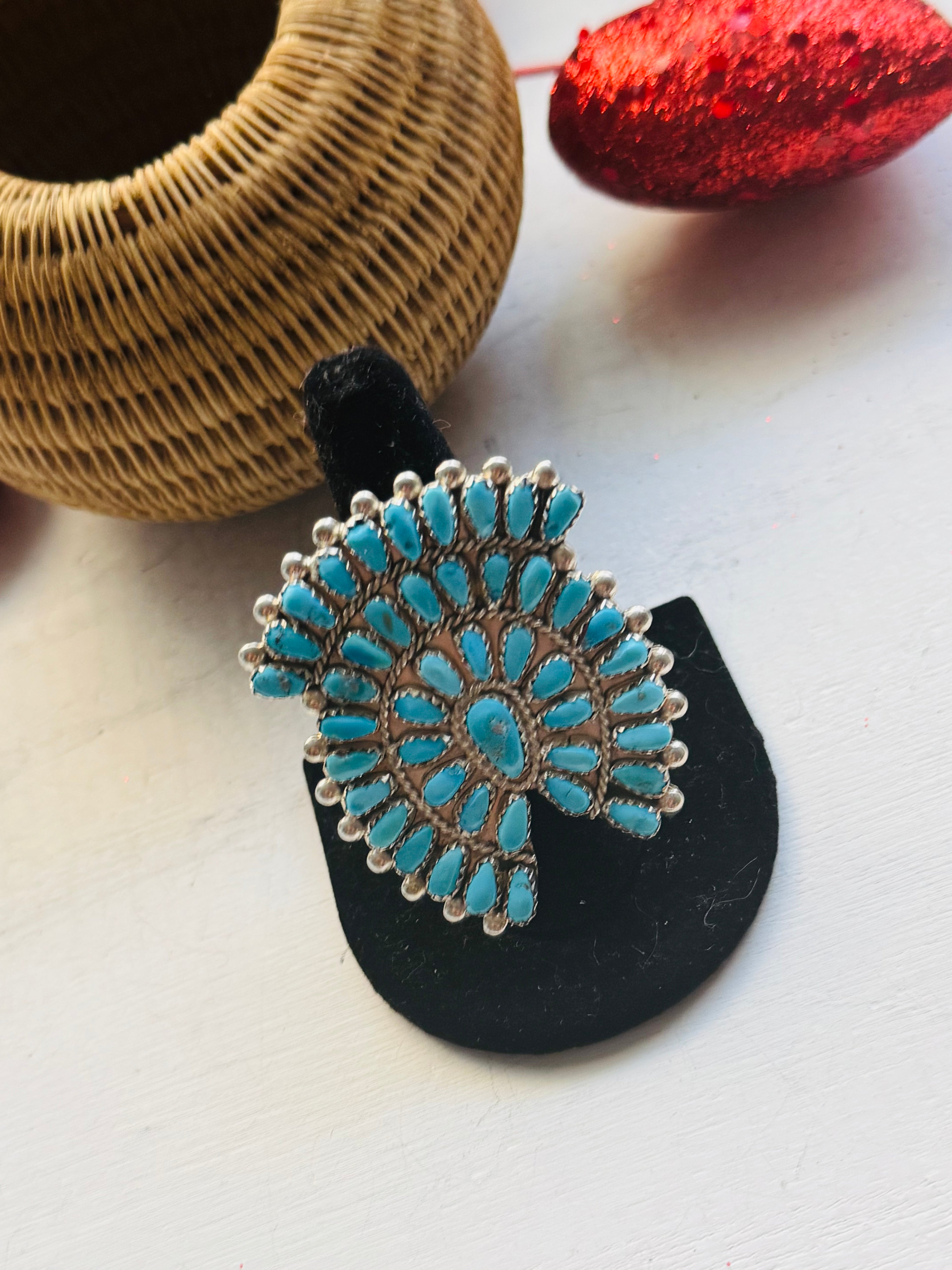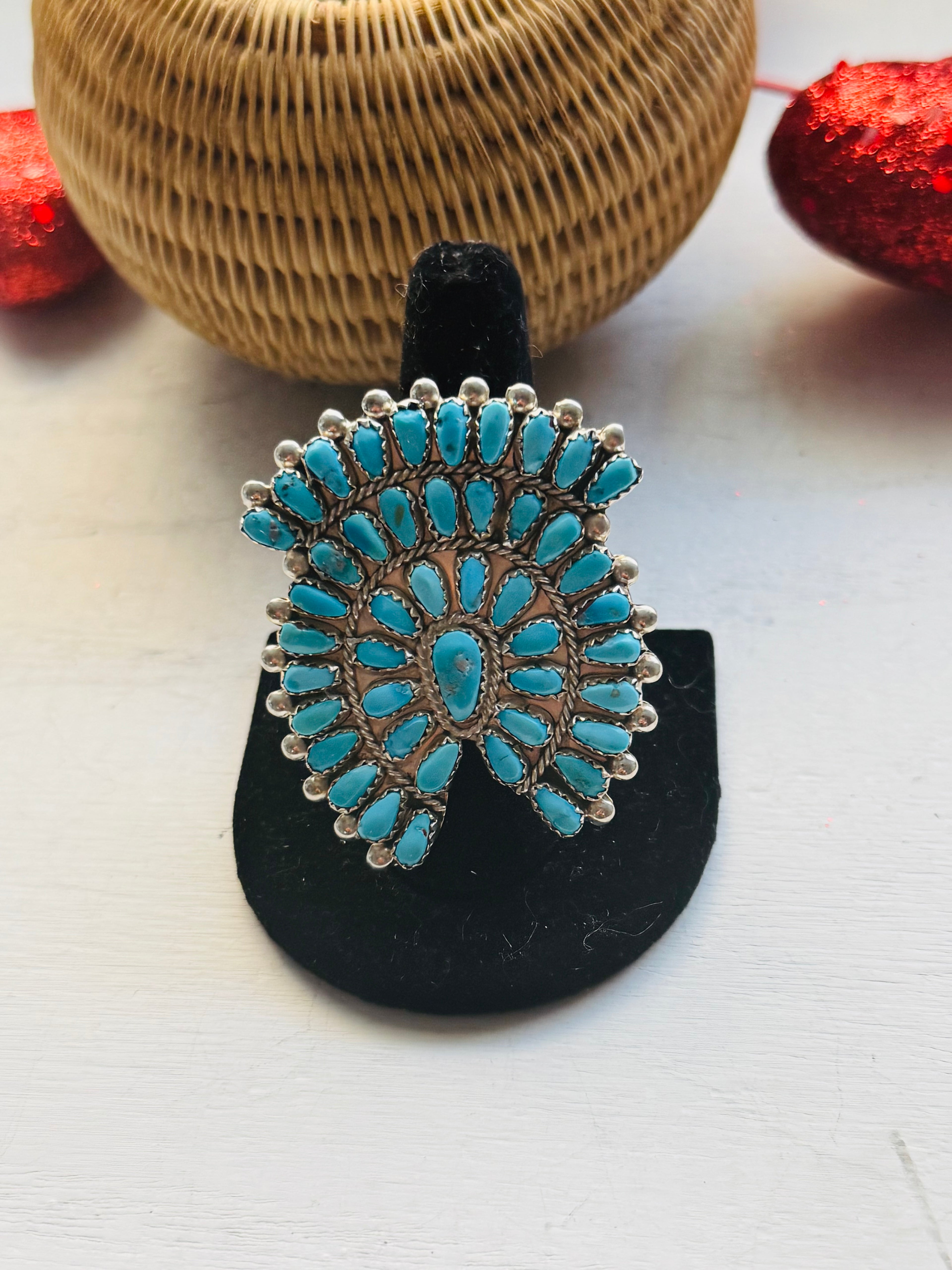 Navajo Made Sleeping Beauty & Sterling Silver Cluster Adjustable Ring. It measures 2 inches long and 1 5/8 inches wide. Signed by artist and stamped sterling silver.