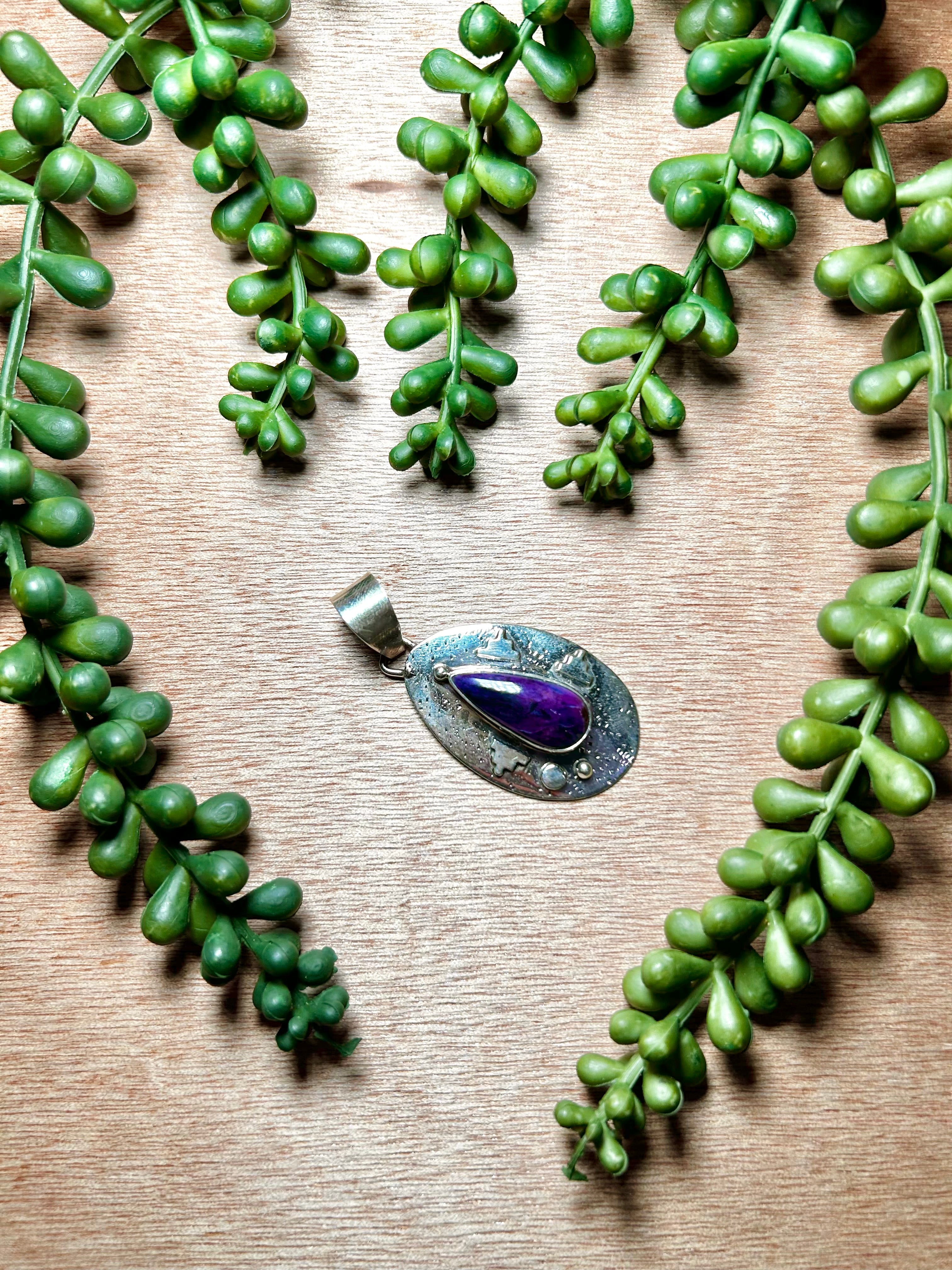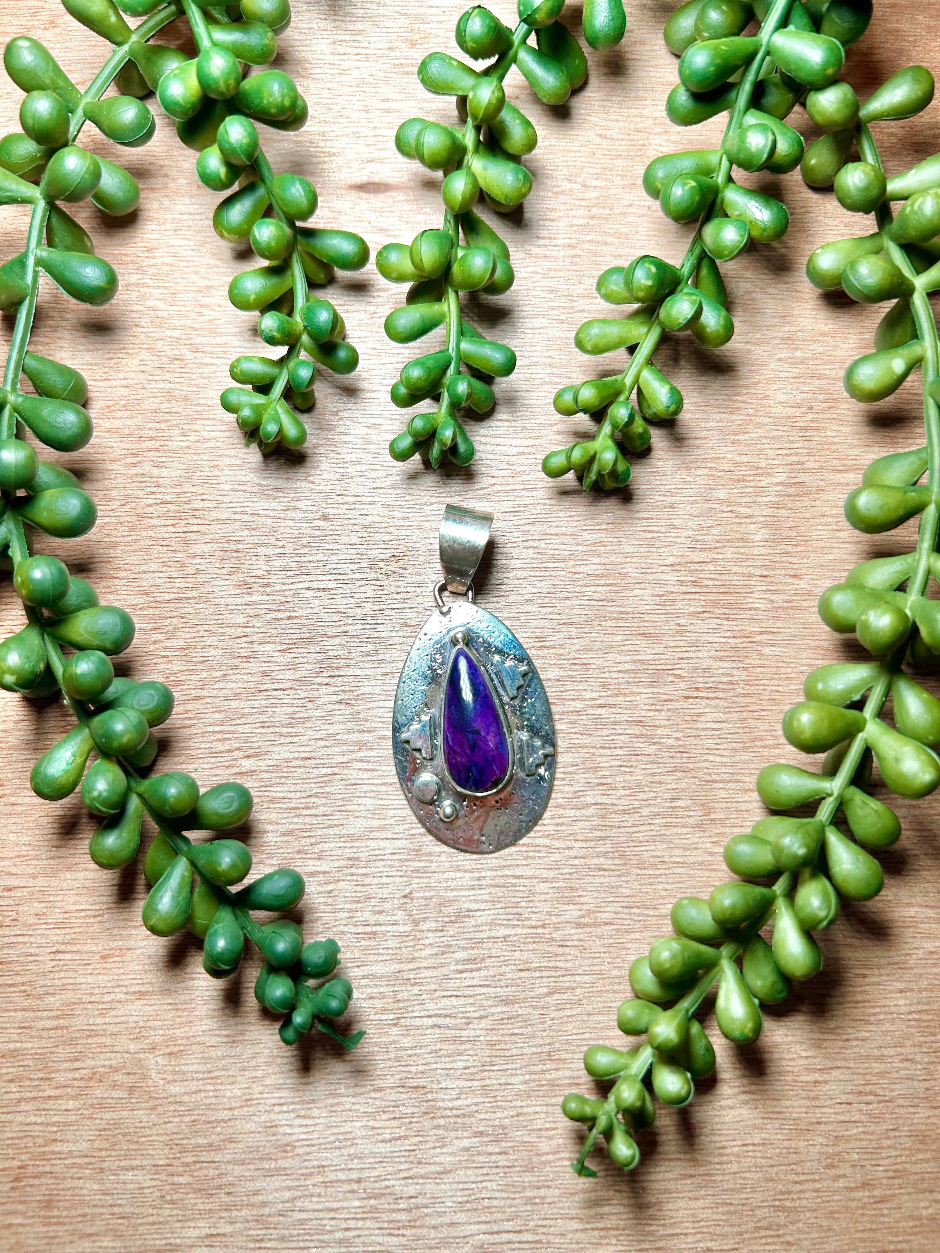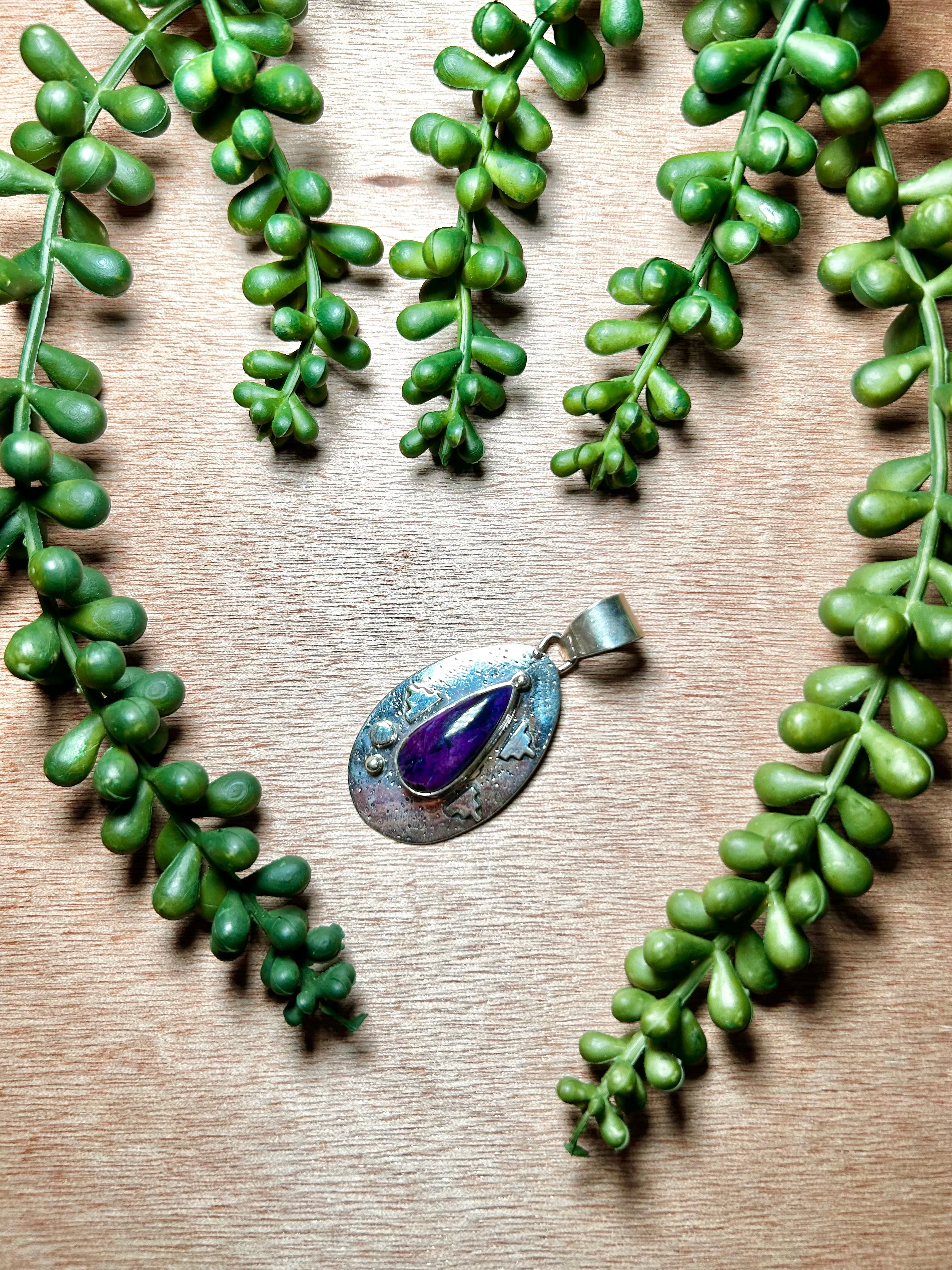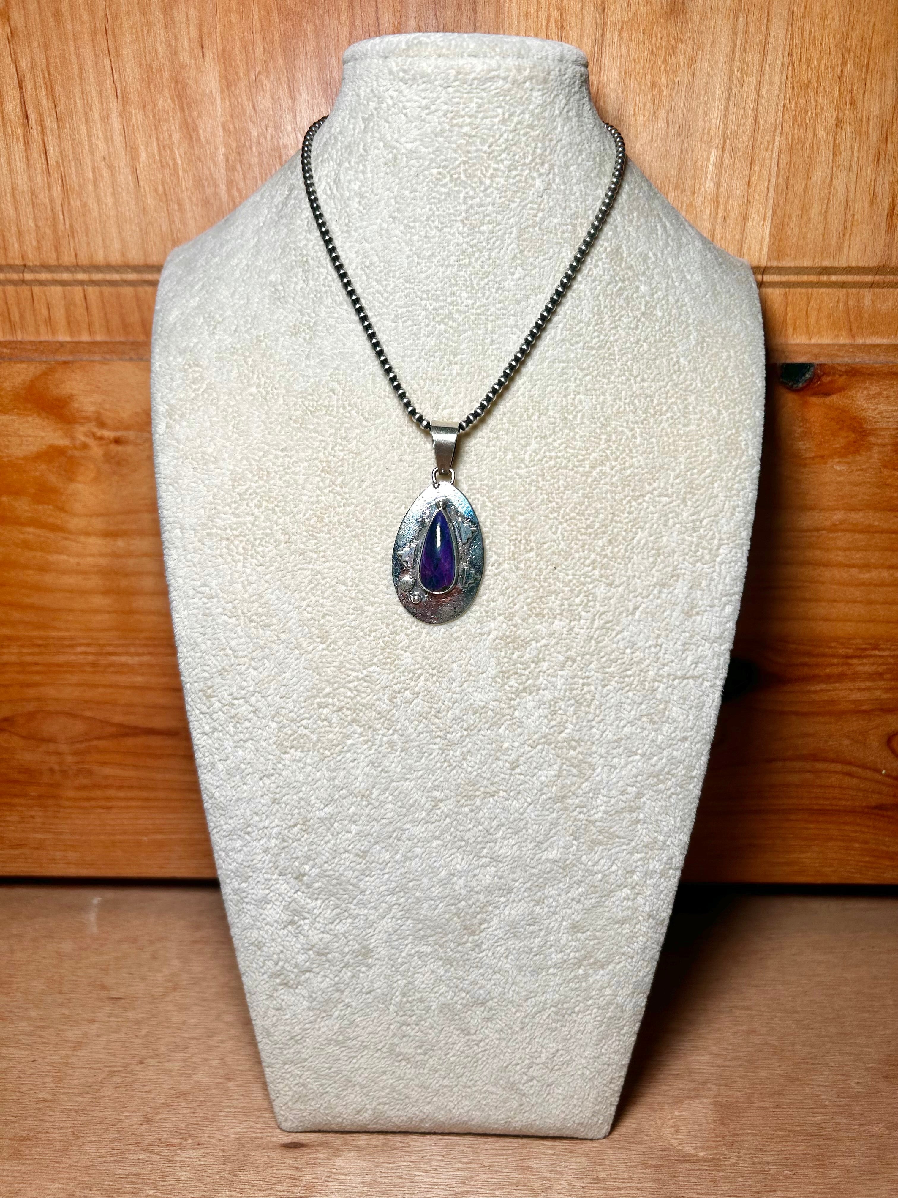 Navajo Made Sngilite & Sterling Silver Pendant. It measures 2 1/4 inches long and 1 1/8 inches wide. Pendant Only! Signed by the artist and stamped sterling silver.
