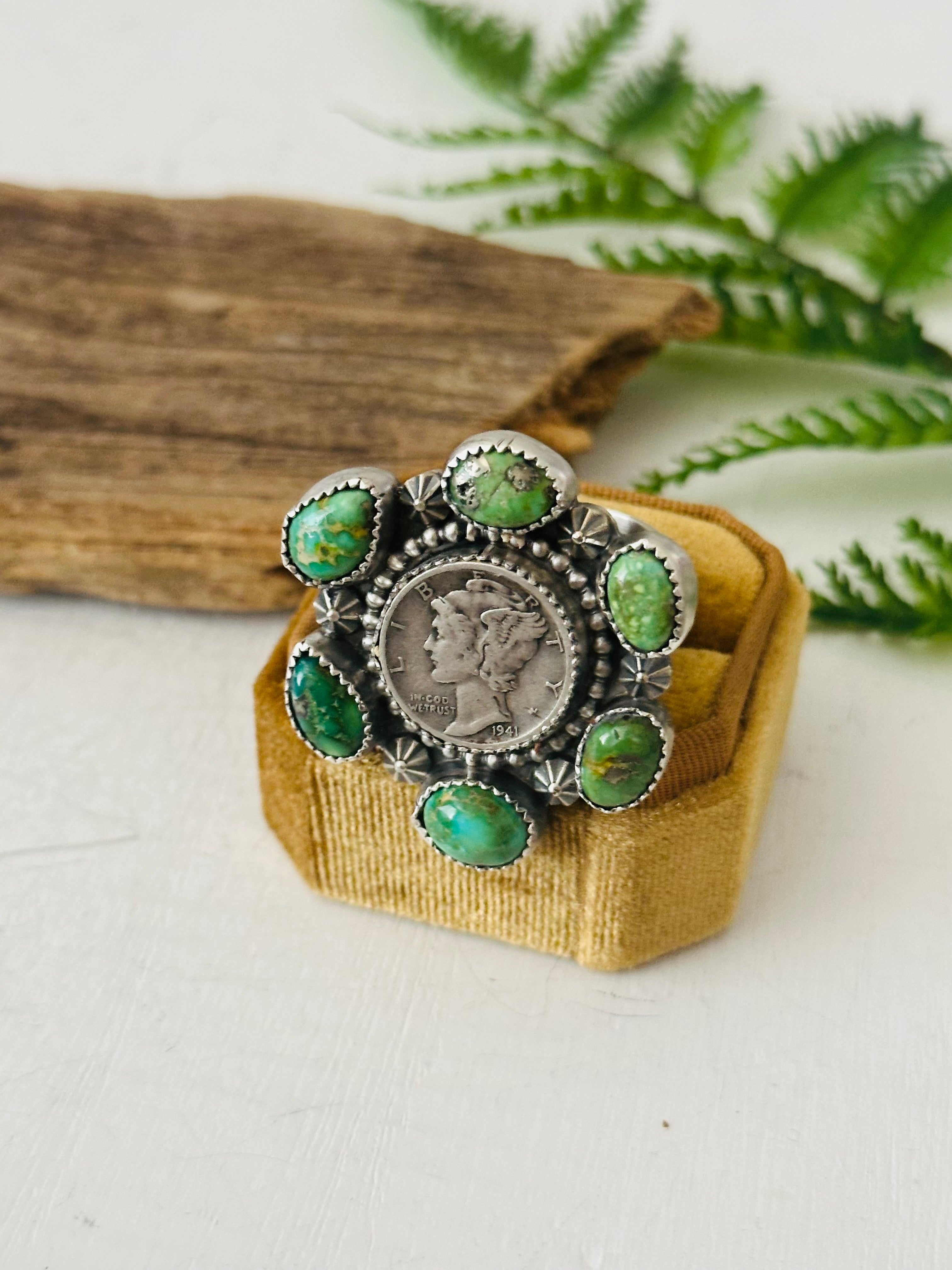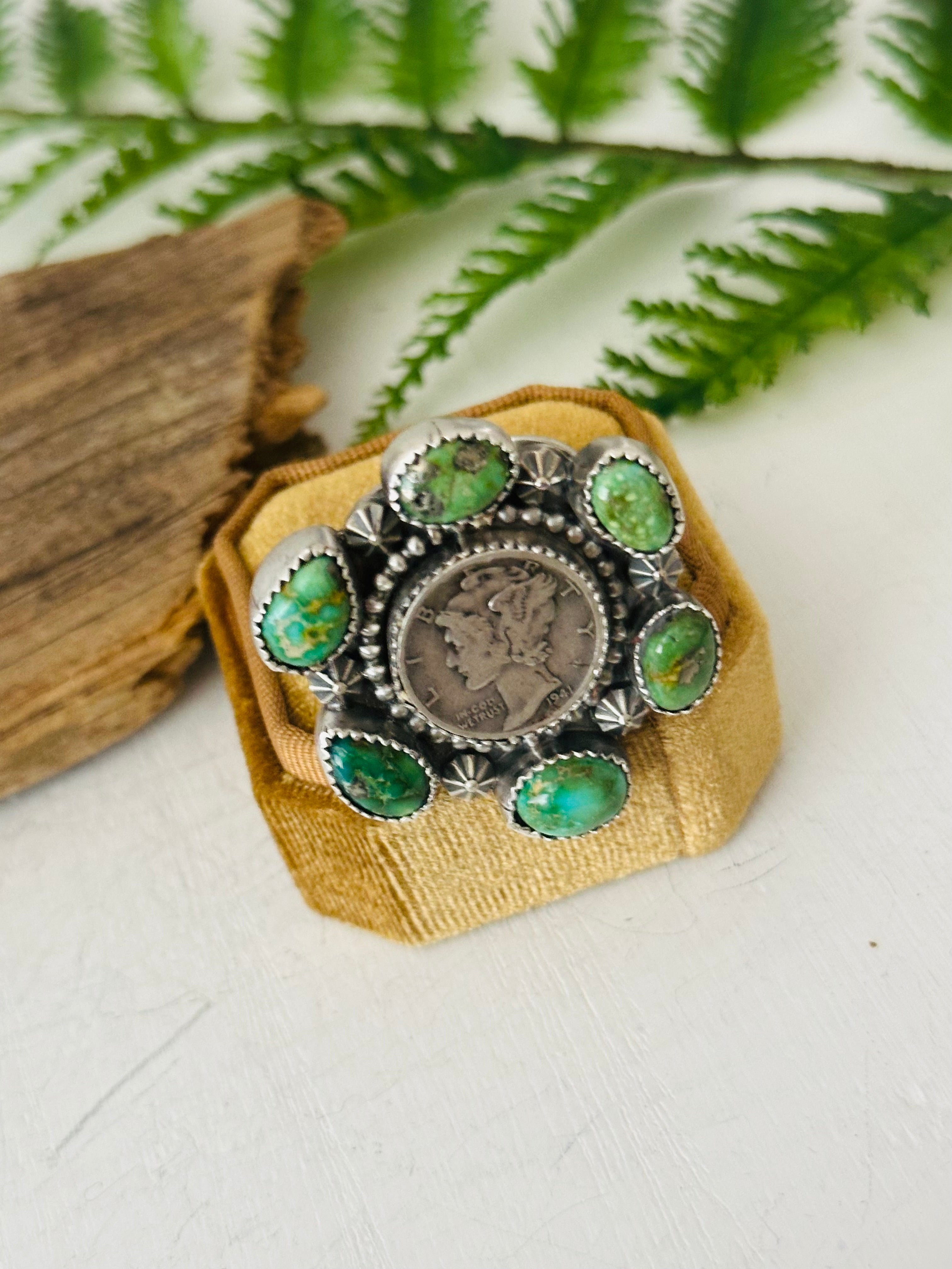 Navajo Made Sonoran Gold Turquoise & Sterling Silver Adjustable Ring. It measures 1 5/8 inches round. Signed by artist and stamped sterling silver.