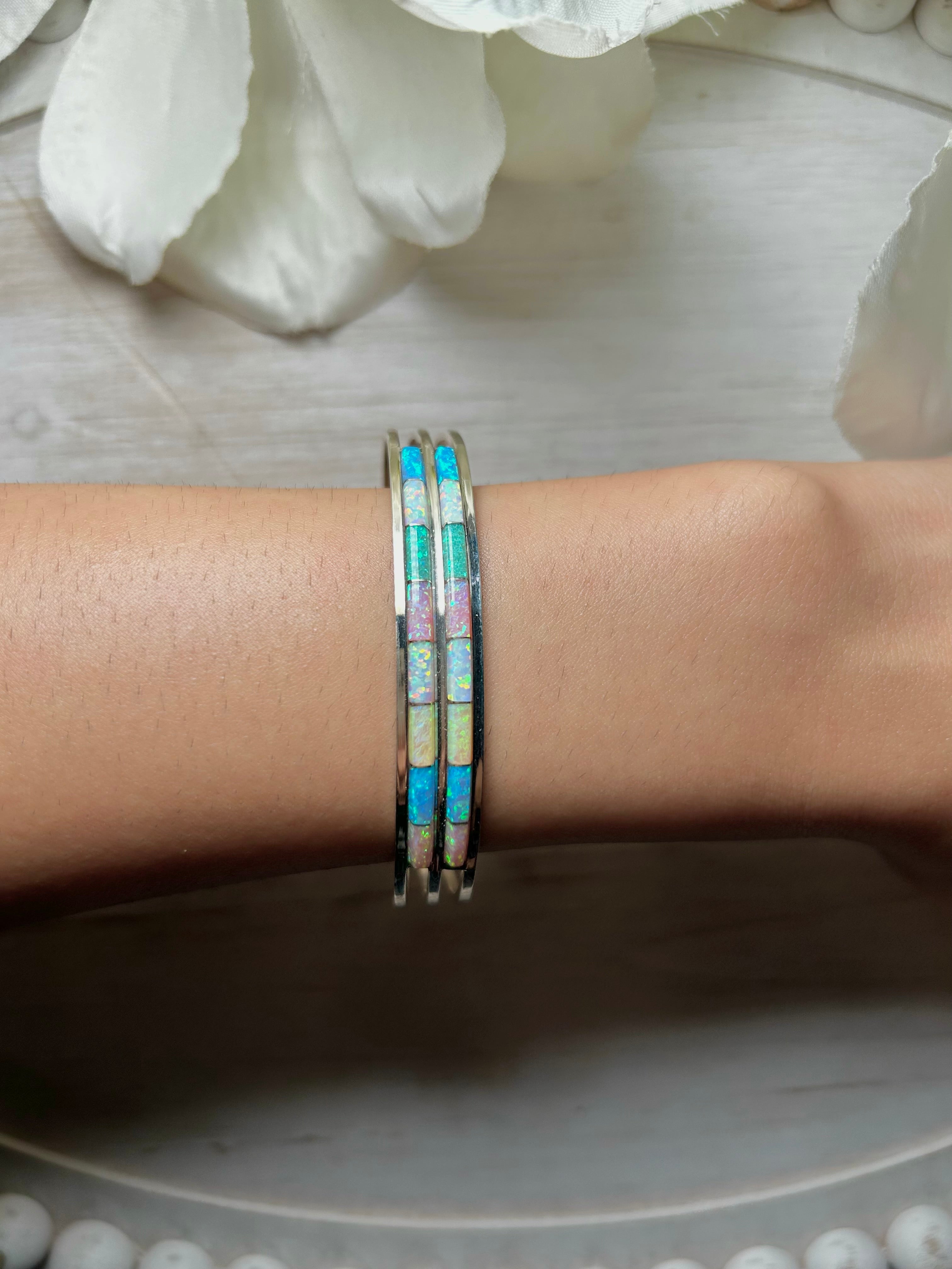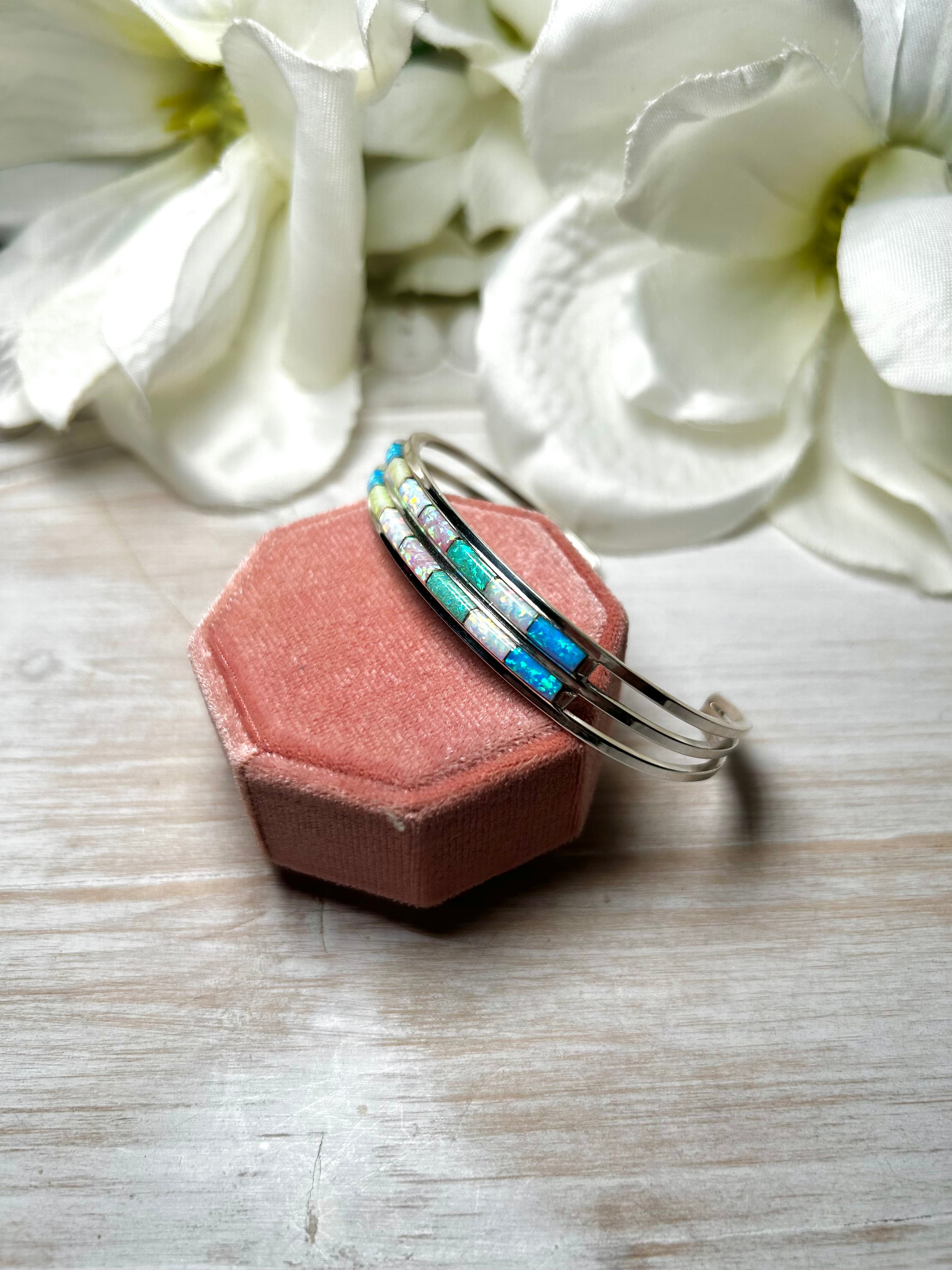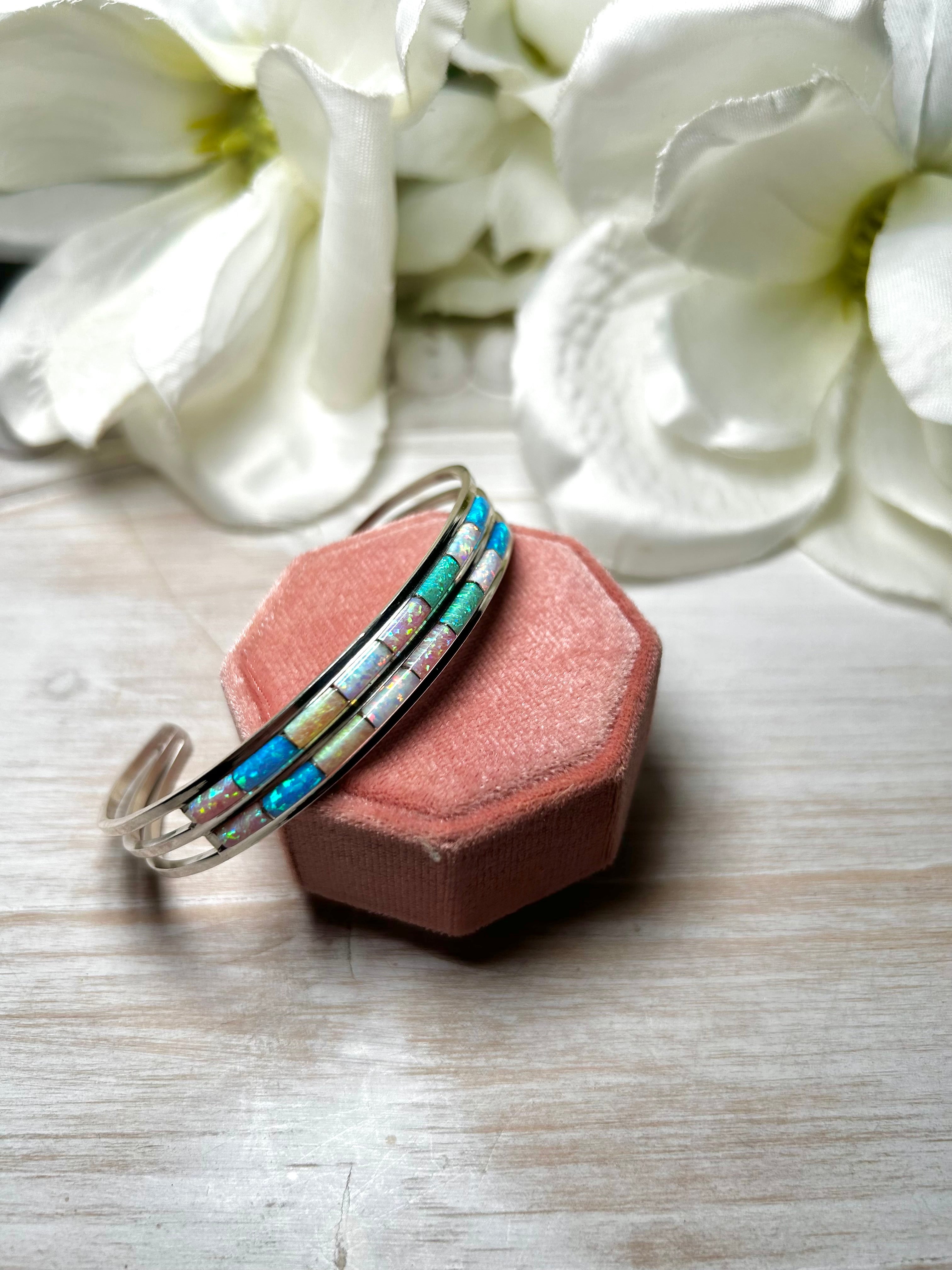 Navajo Man-Made Opal & Sterling Silver Cuff Bracelet. It measures 3/8 of an inch wide with an inside circumference of 5 3/8 inches and a gap of 1 1/8 inches. Stamped sterling silver.