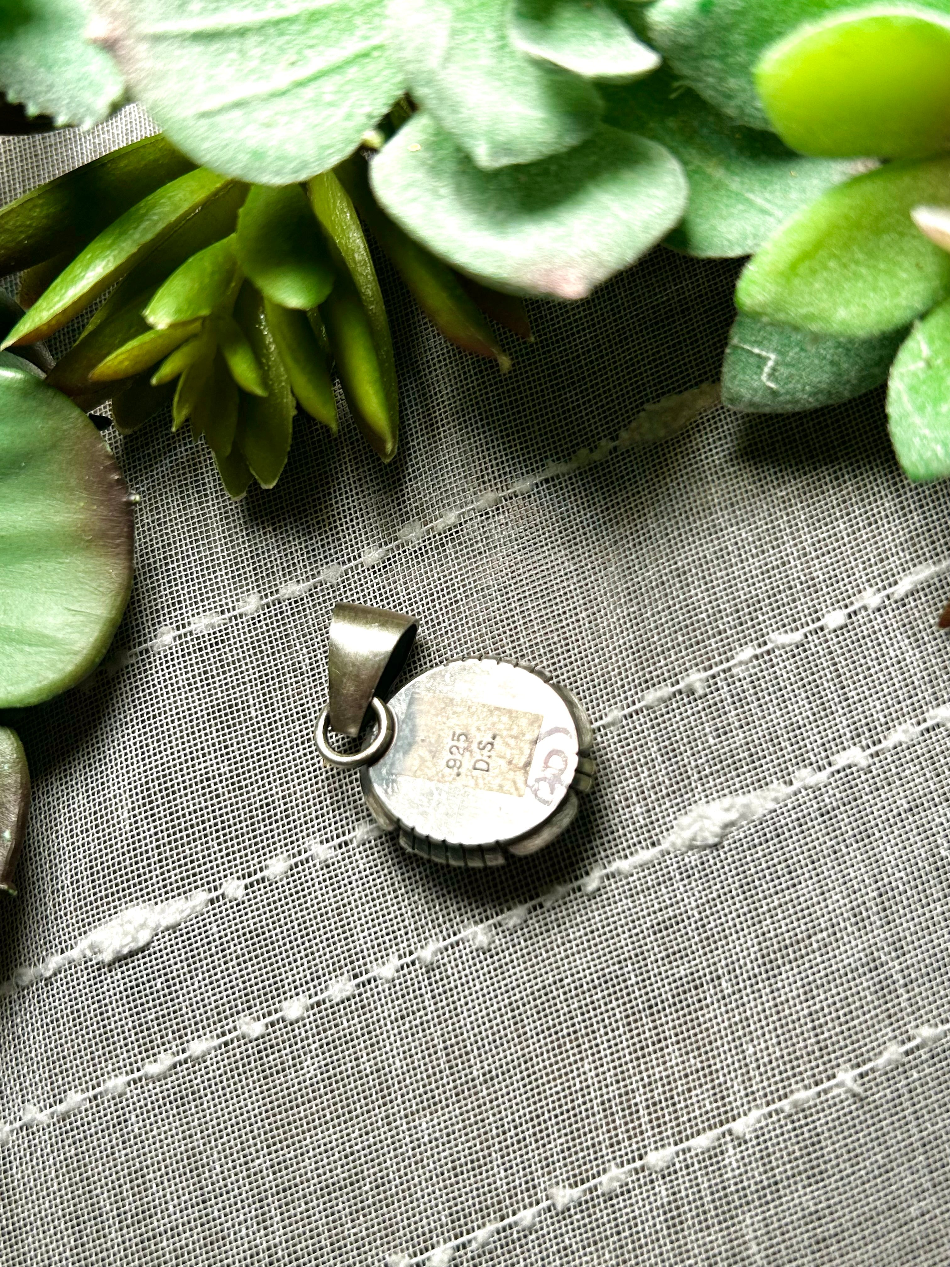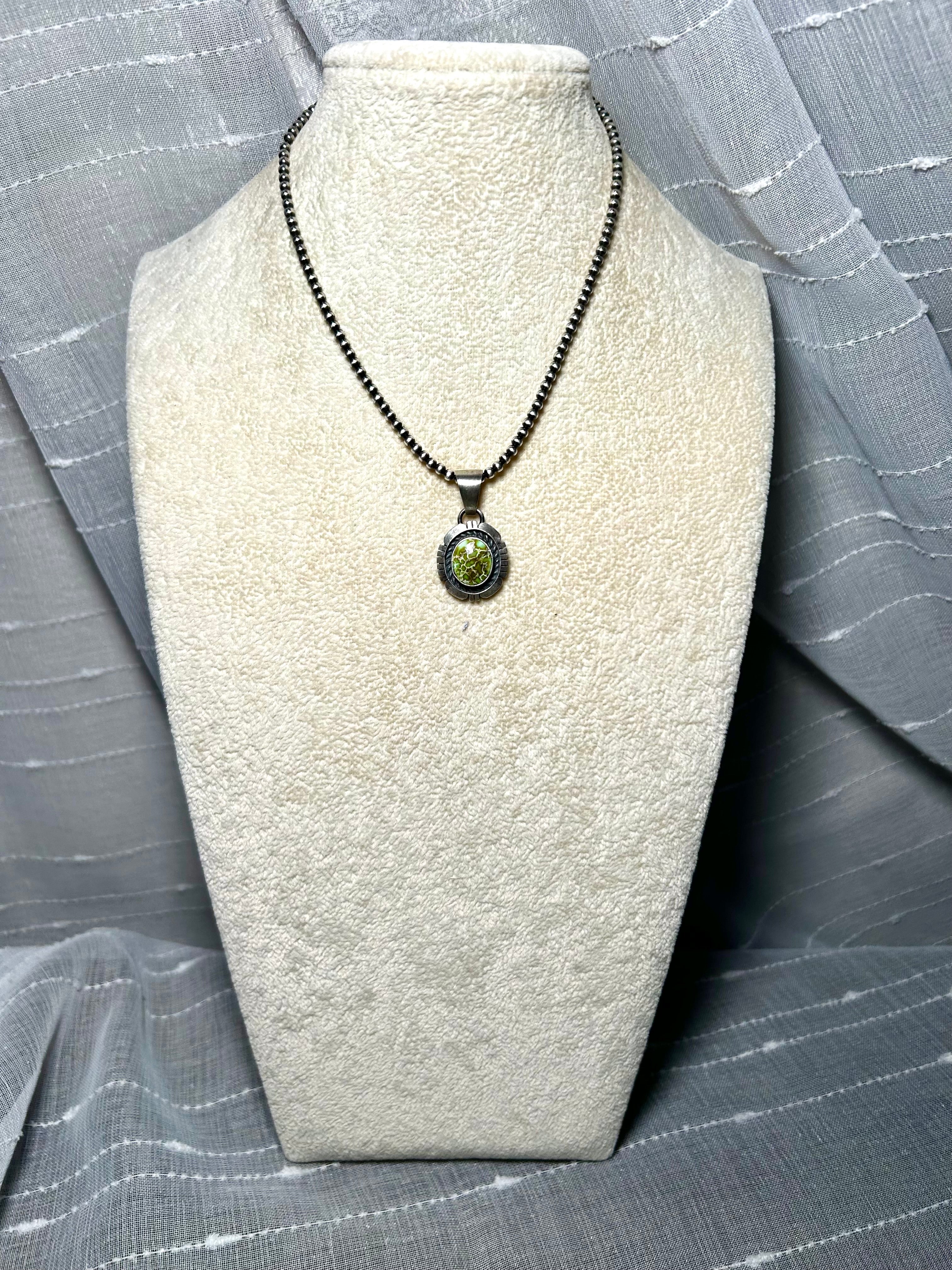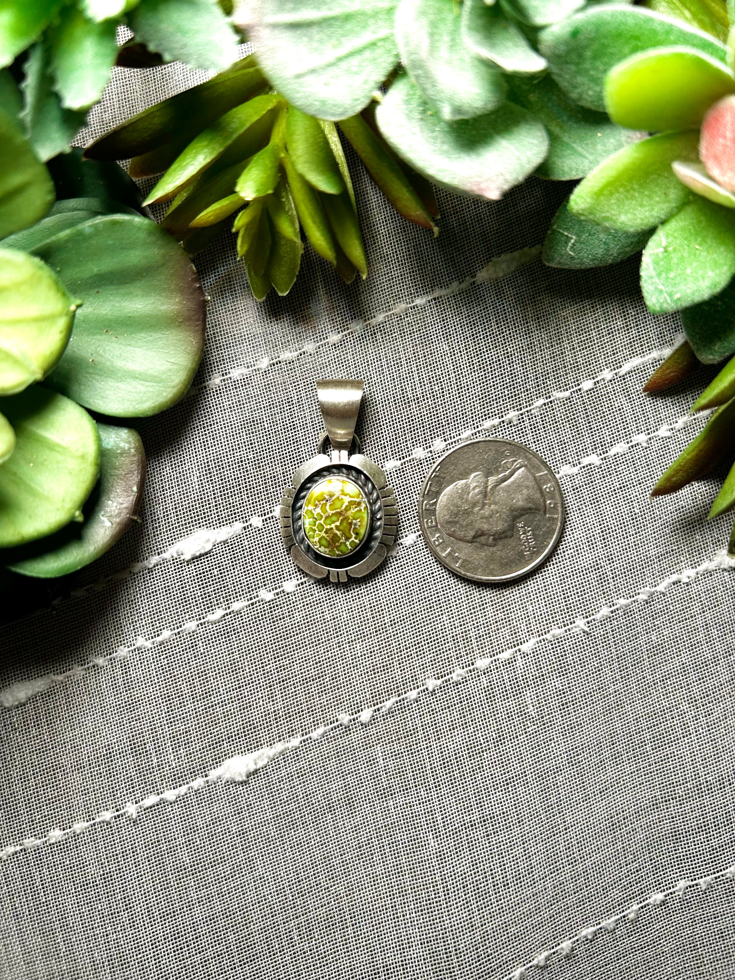 Navajo Made Sonoran Mountain Turquoise & Sterling Silver Pendant. It measures 1 3/8 inches long and 3/4 of an inch wide. Pendant Only! Signed by the artist and stamped sterling silver.