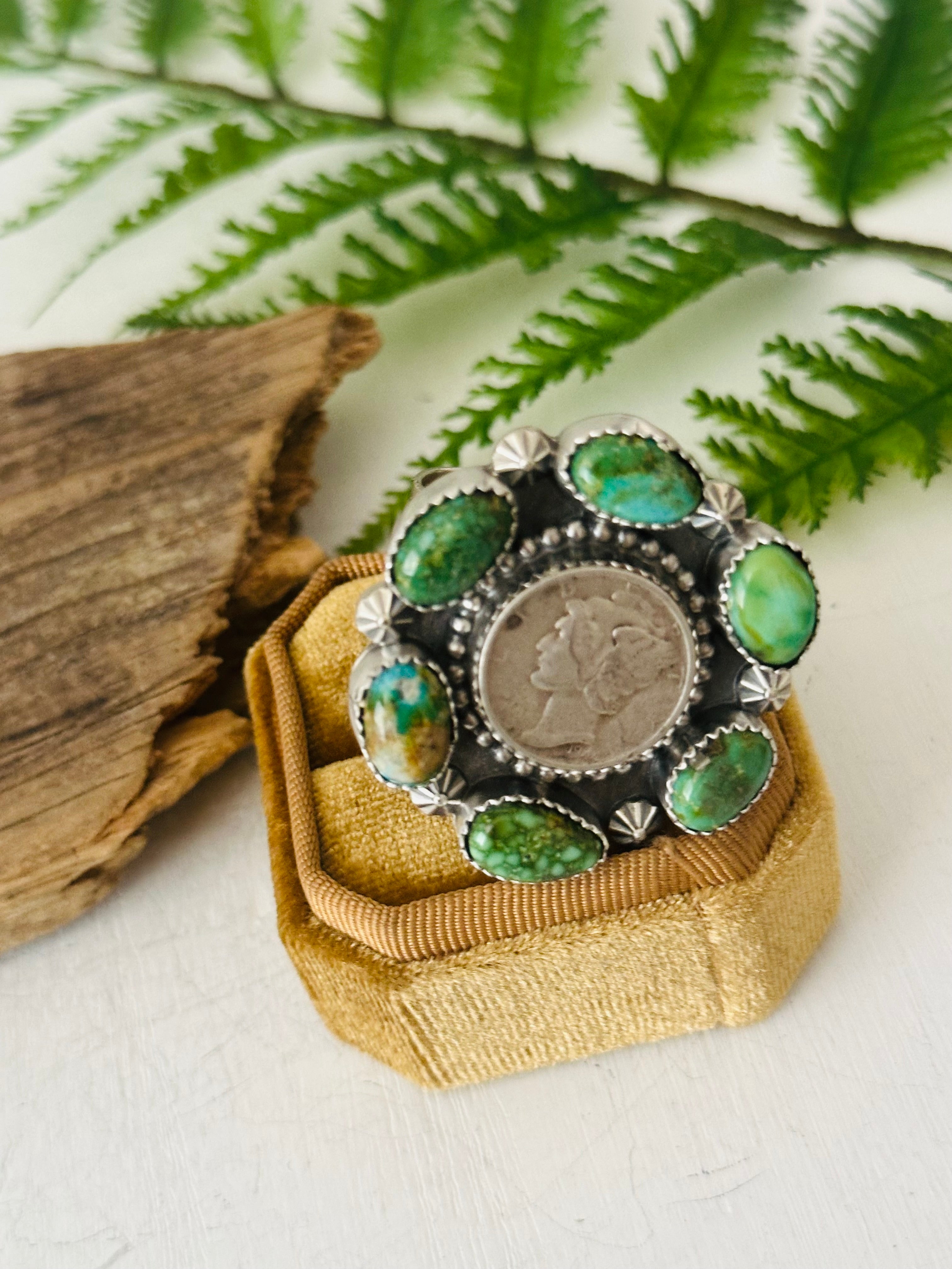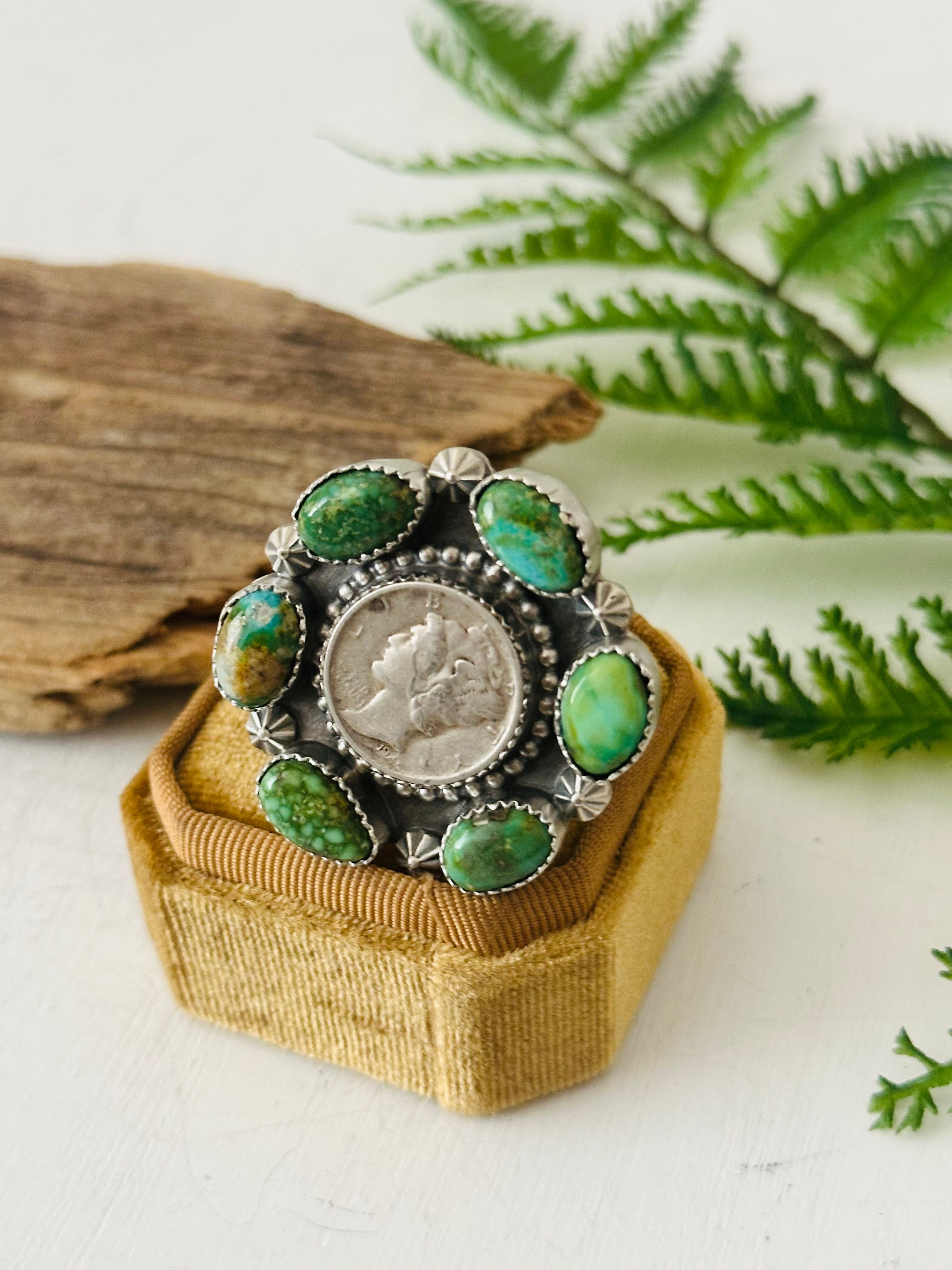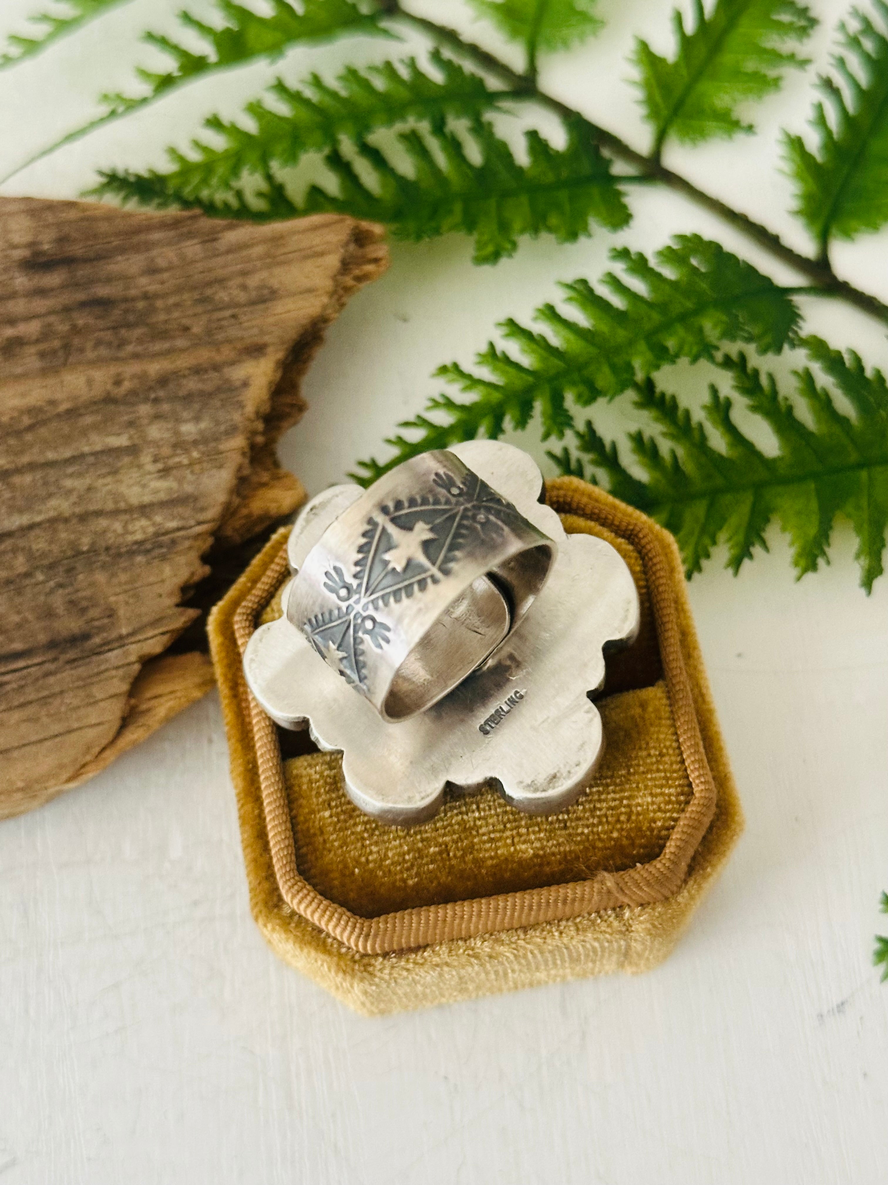 Navajo Made Sonoran Gold Turquoise & Sterling Silver Adjustable Ring. It measures 1 5/8 inches round. Signed by artist and stamped sterling silver.