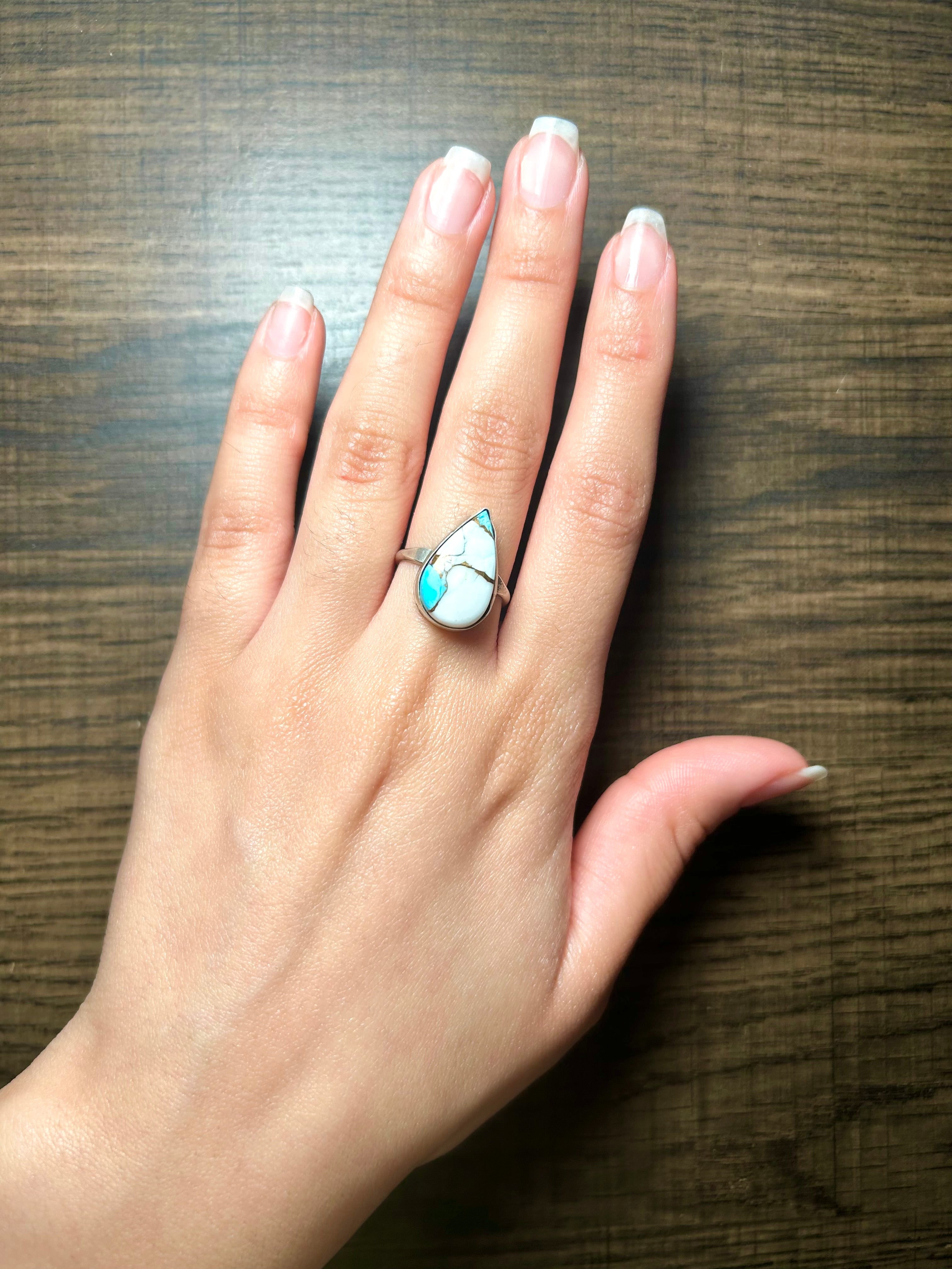 Navajo Made Sonoran Gold Turquoise & Sterling Silver Ring Size 7.25. It measures 3/4 of an inch long and 1/2 of an inch wide. Signed by artist and stamped sterling silver.