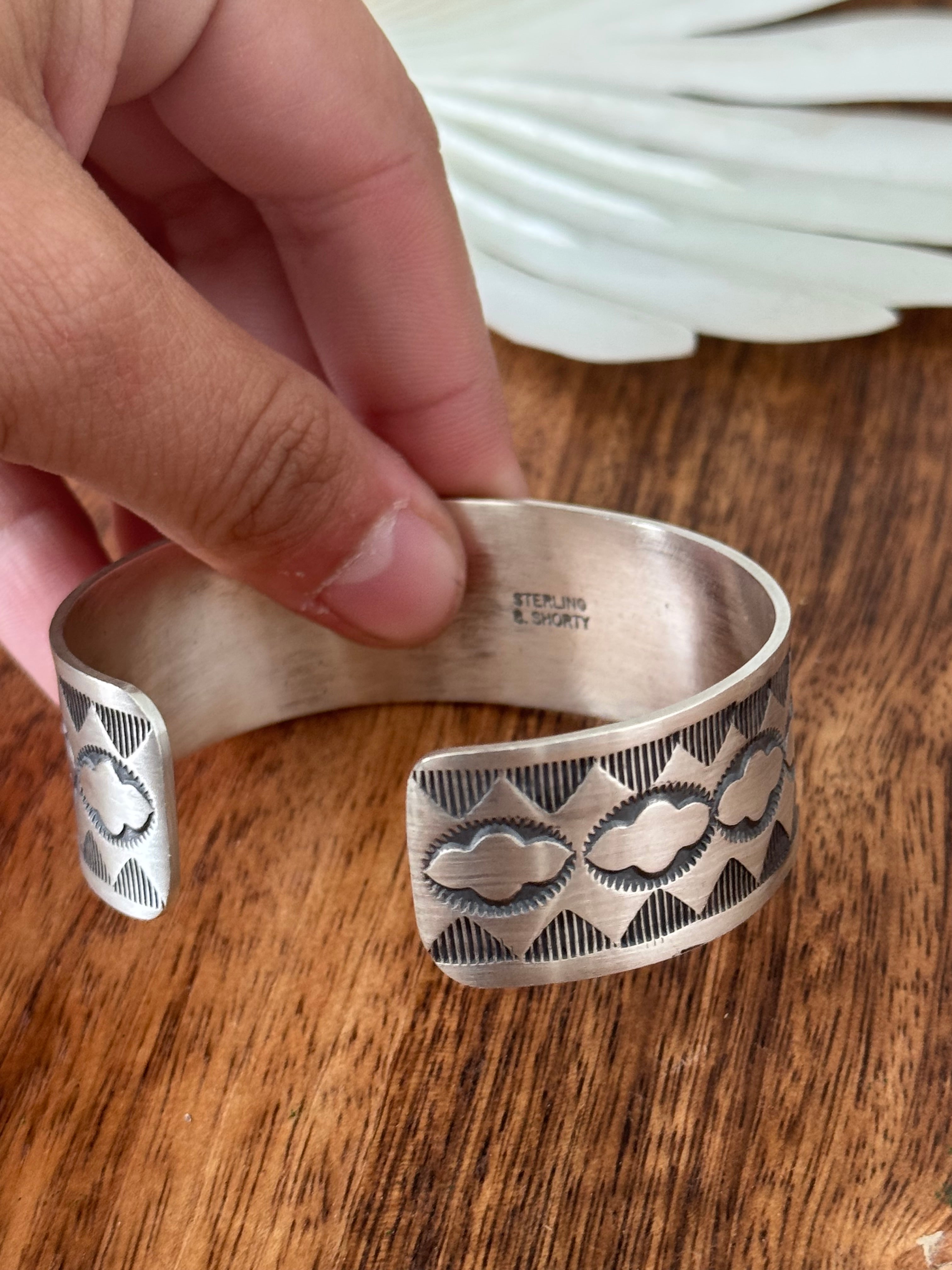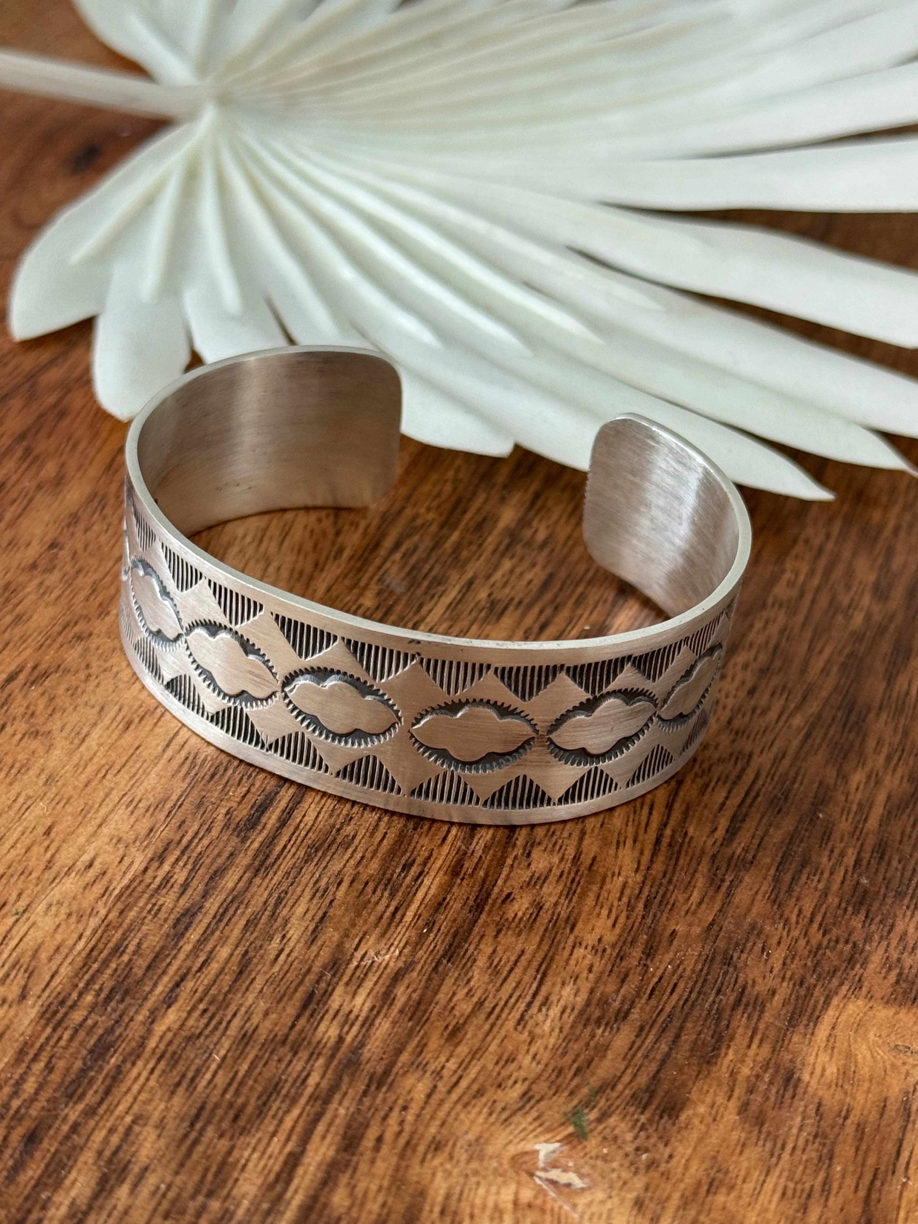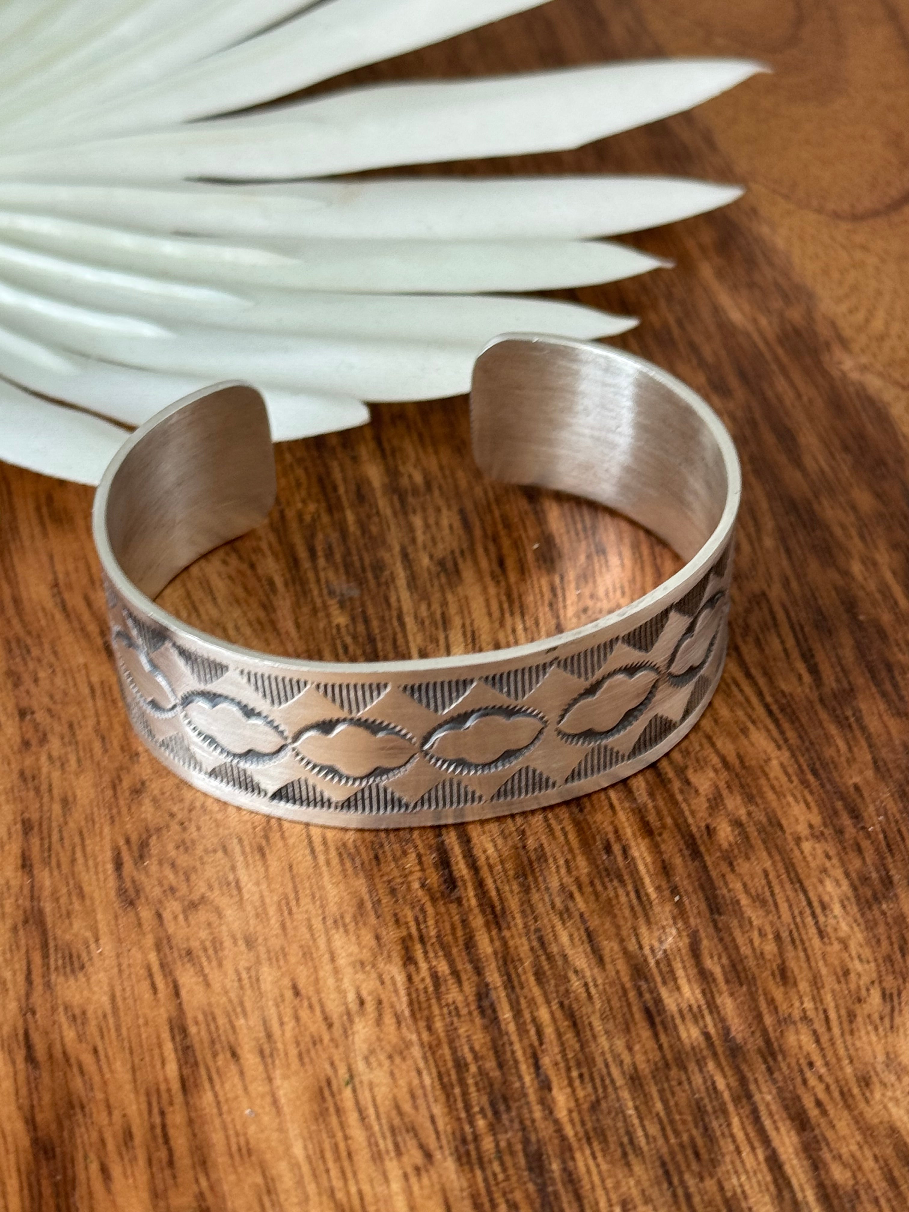 Navajo Made Sterling Silver Cuff Bracelet. It measures 3/4 of an inch wide with an inside circumference of 5 5/8 inches and a gap of 3/4 of an inch. Signed by the artist and stamped sterling silver.