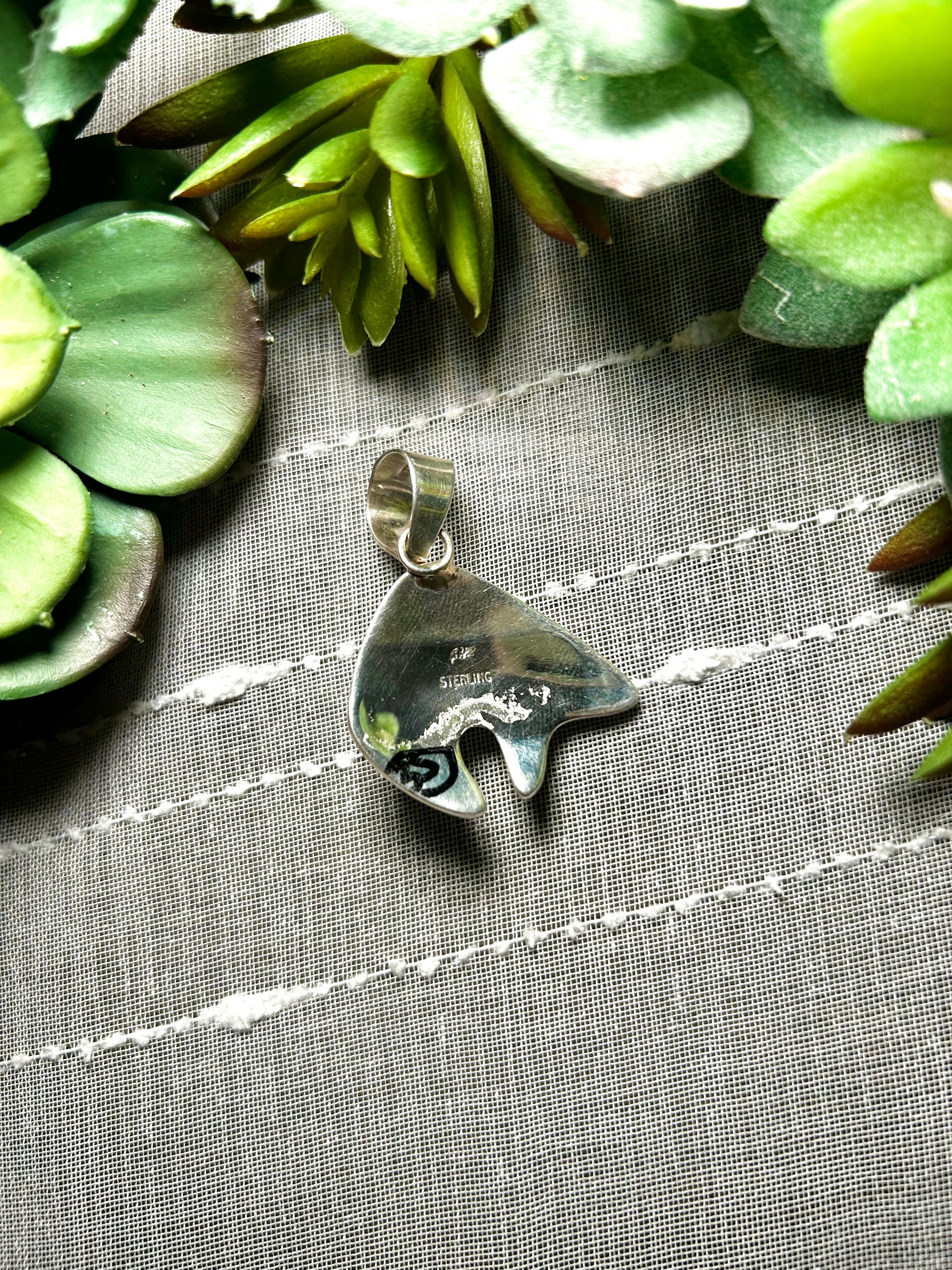 Shirley Henry Sonoran Mountain Turquoise & Sterling Silver Pendant. It measures 1 5/8 inches long and 1 1/4 inches wide. Pendant Only! Signed by the artist and stamped sterling silver.