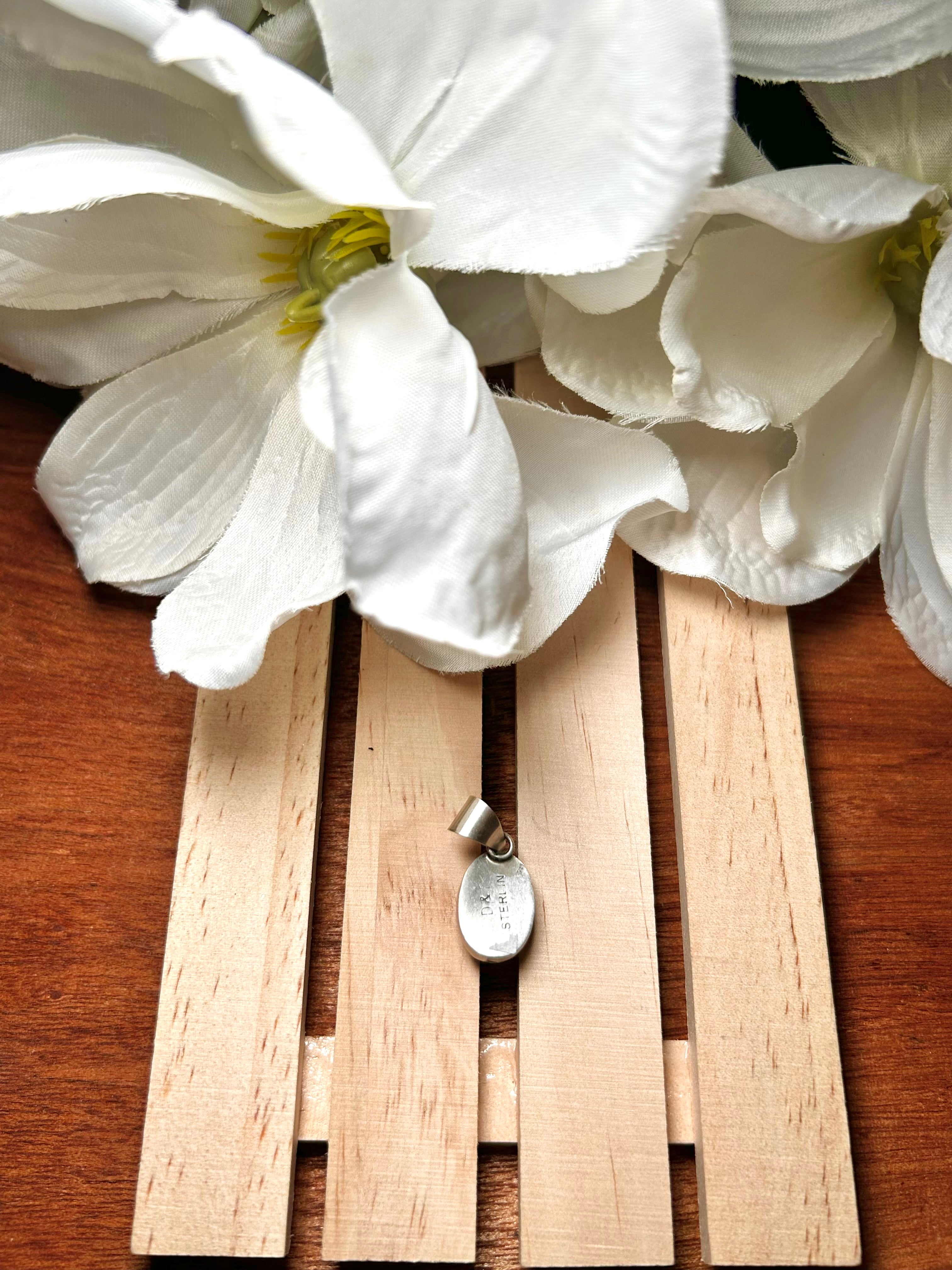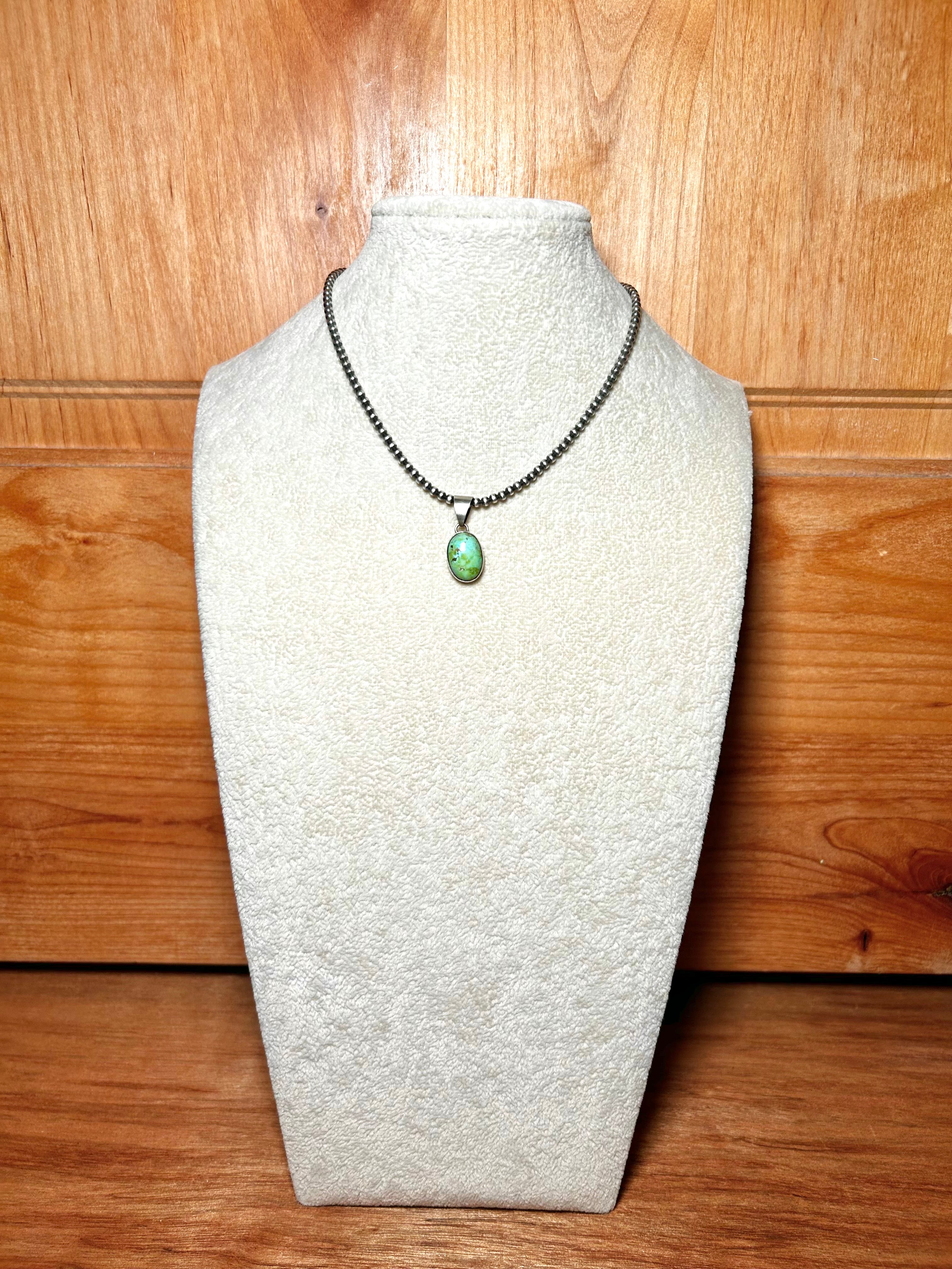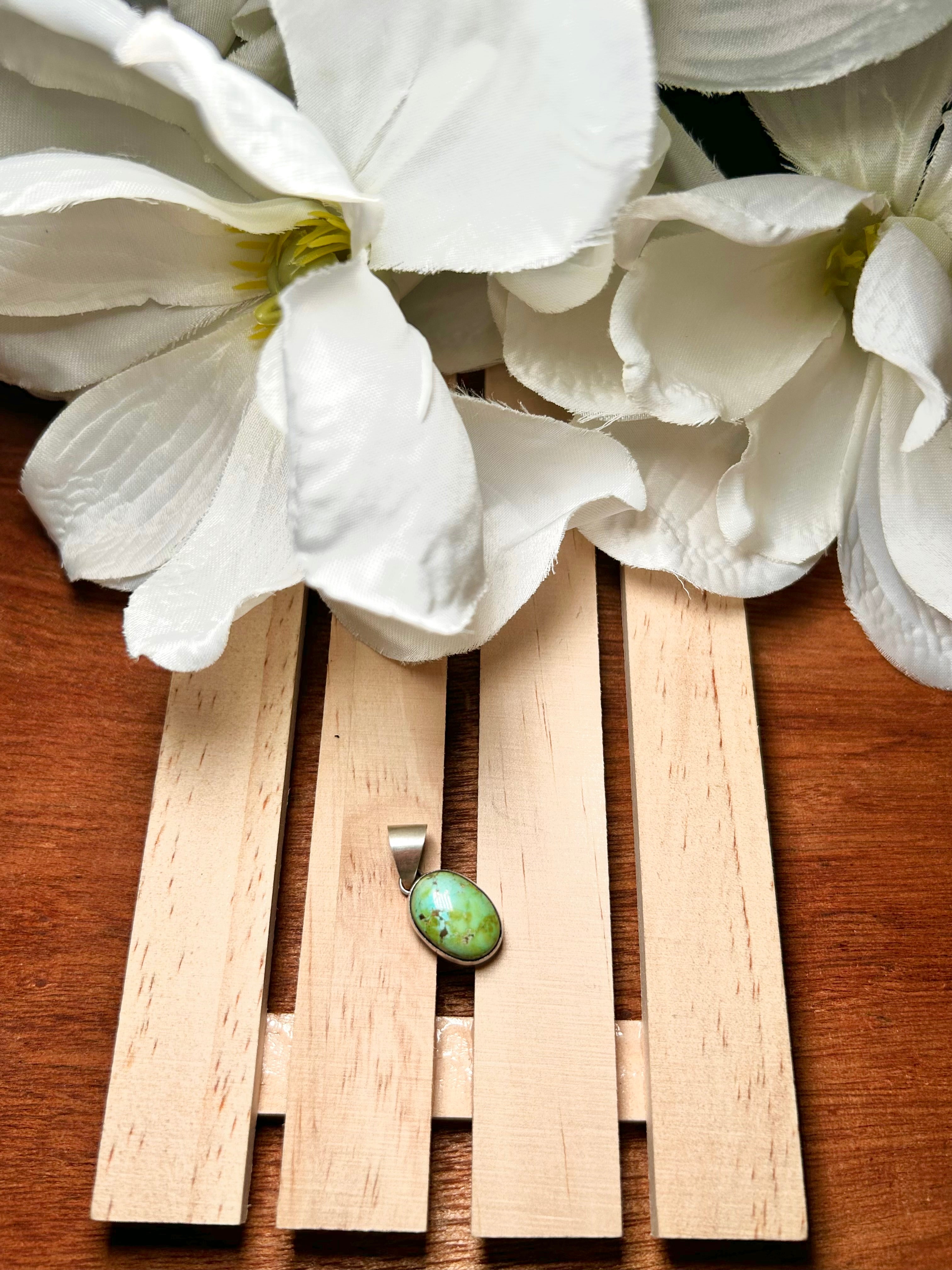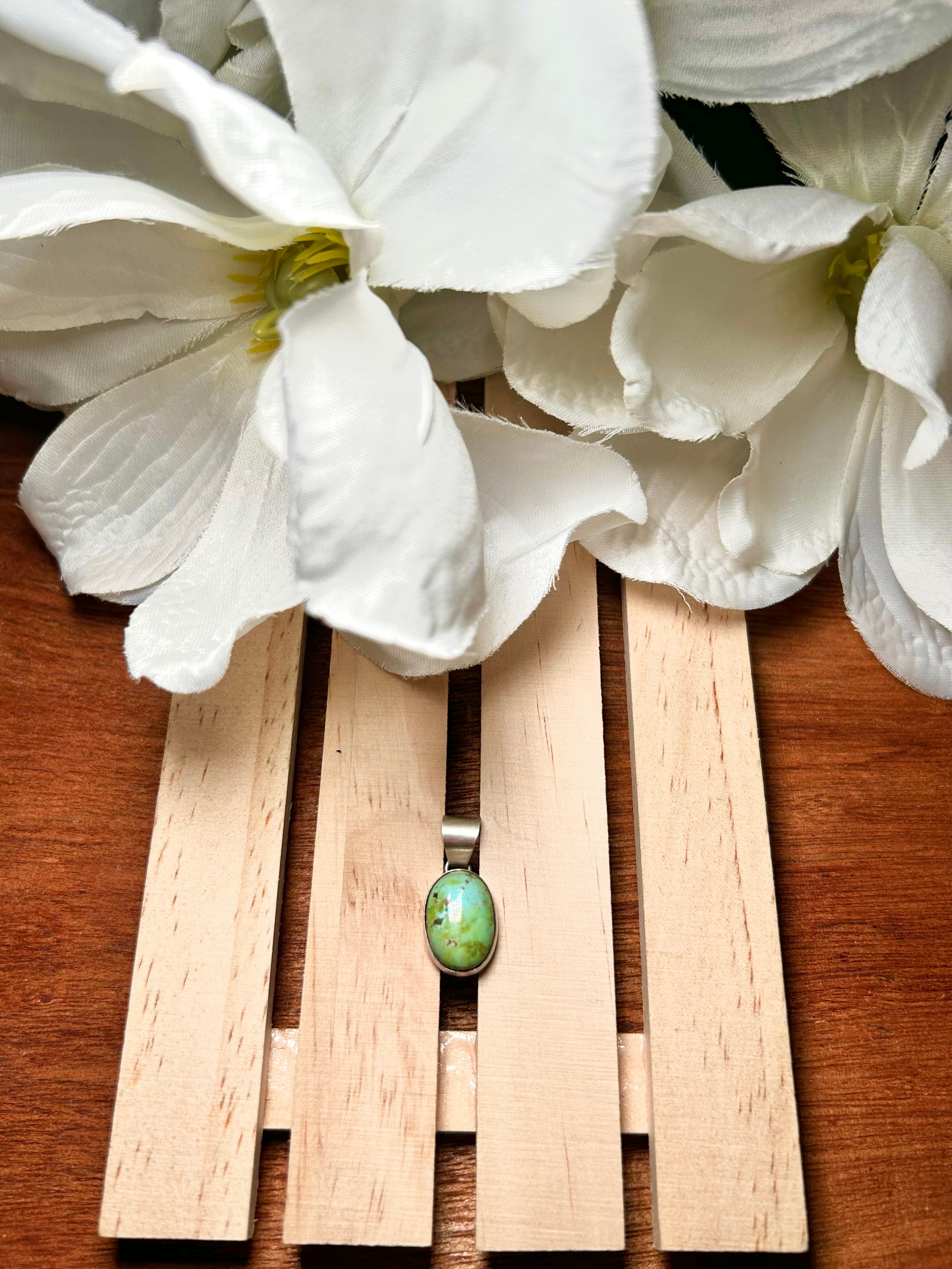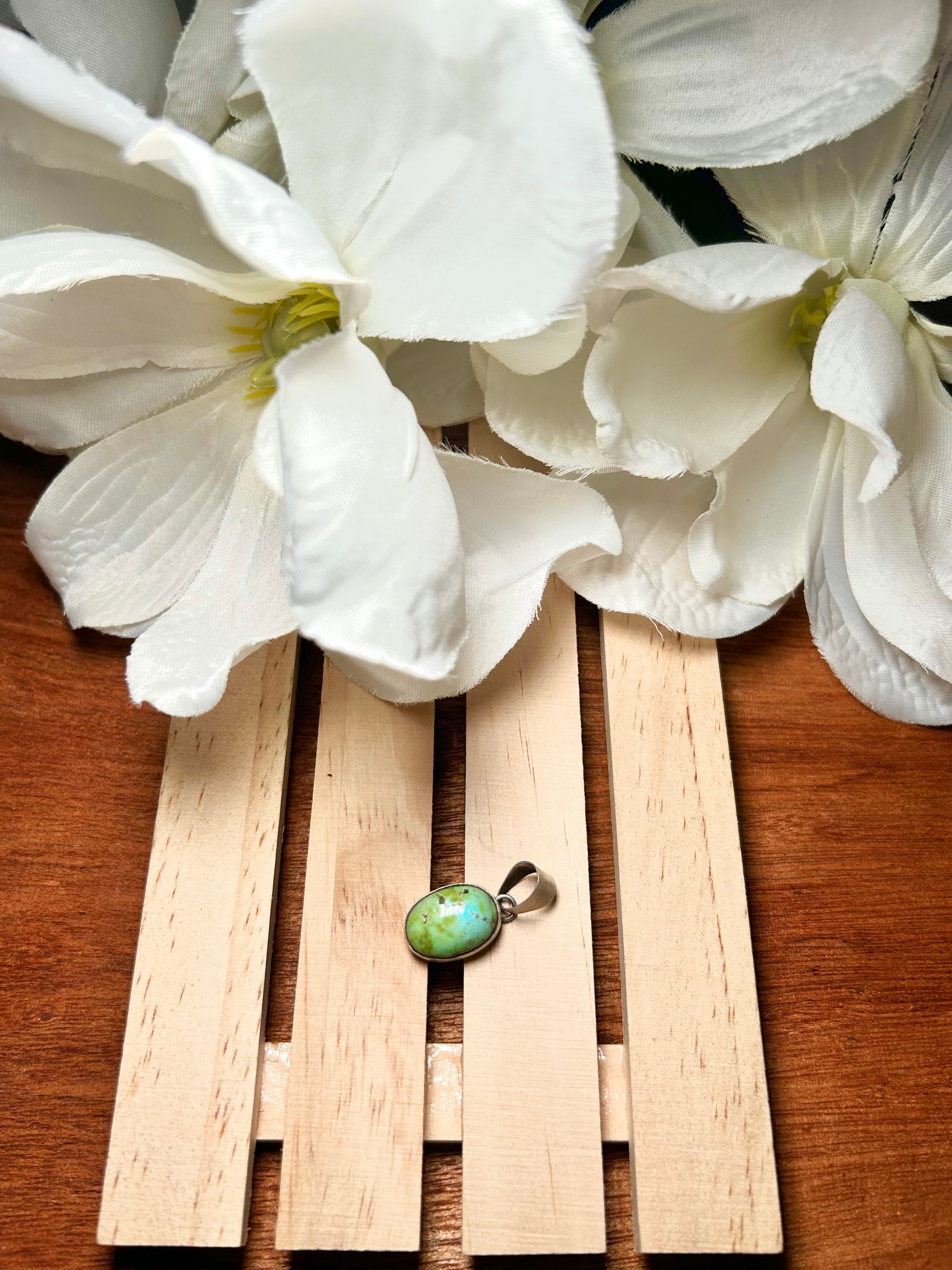 Navajo Made Royston Turquoise & Sterling Silver Pendant. It measures 1 1/4 inch long and 1/2 of an inch wide. Pendant Only. Signed by the artist and stamped sterling silver.