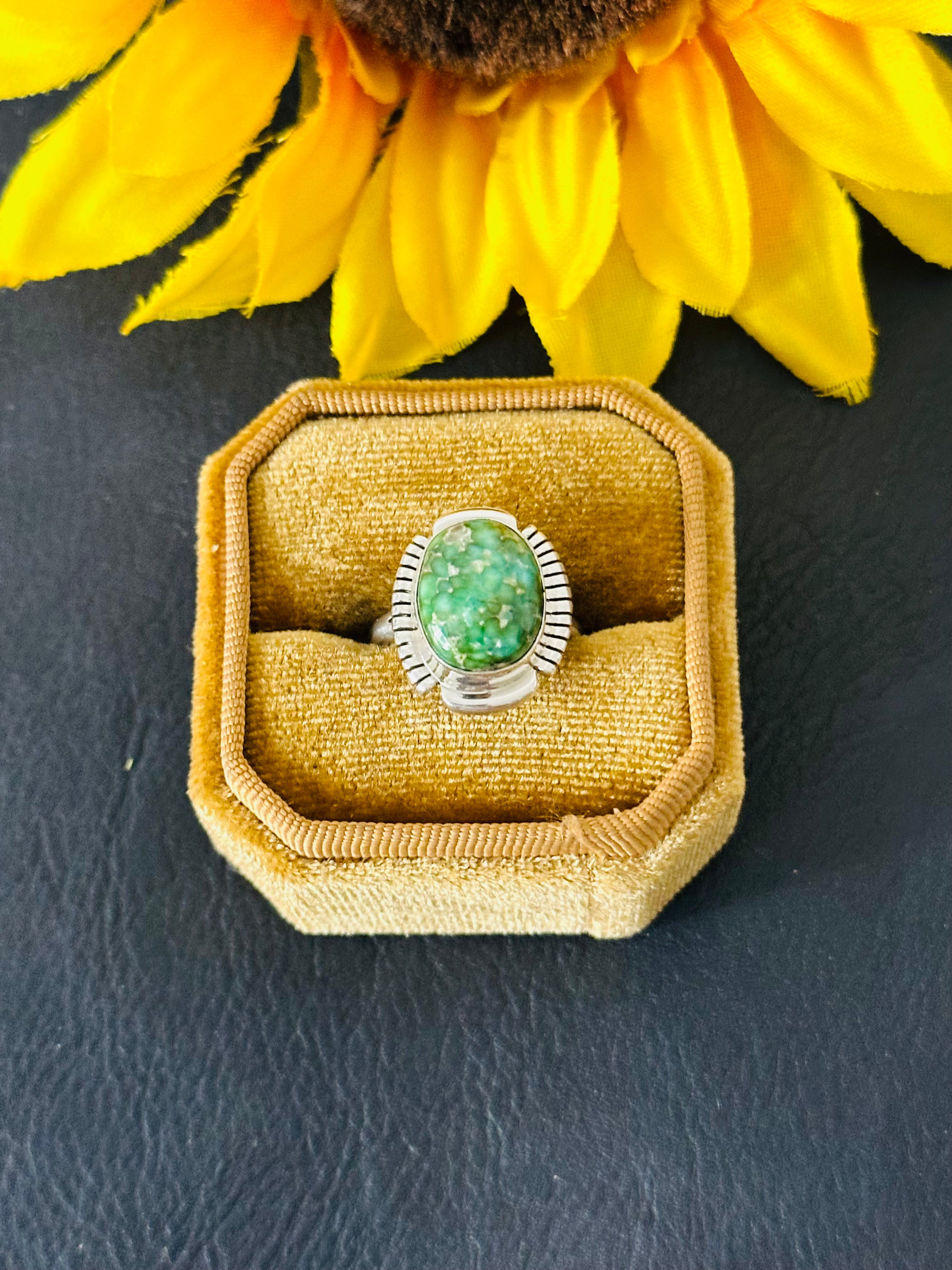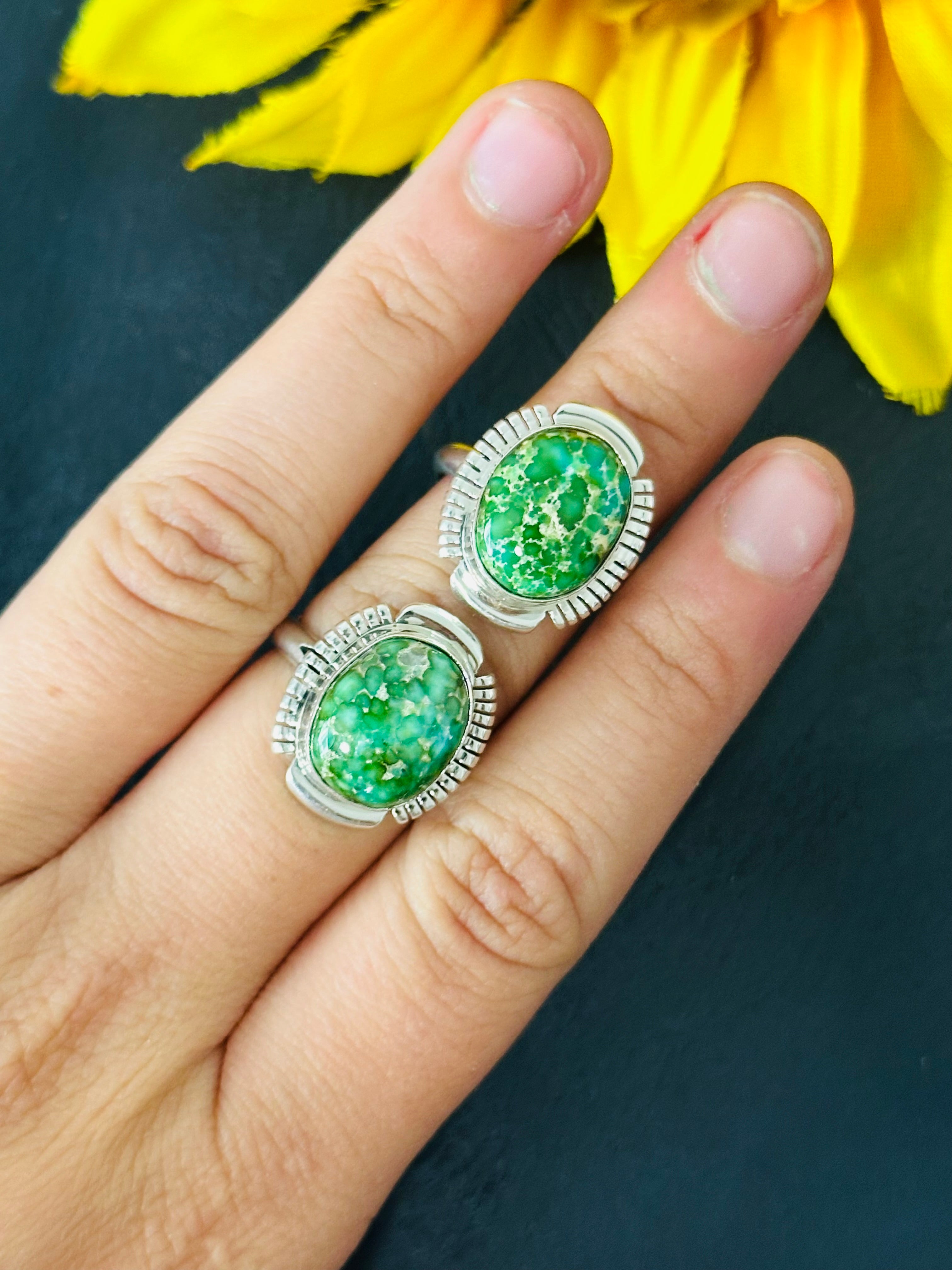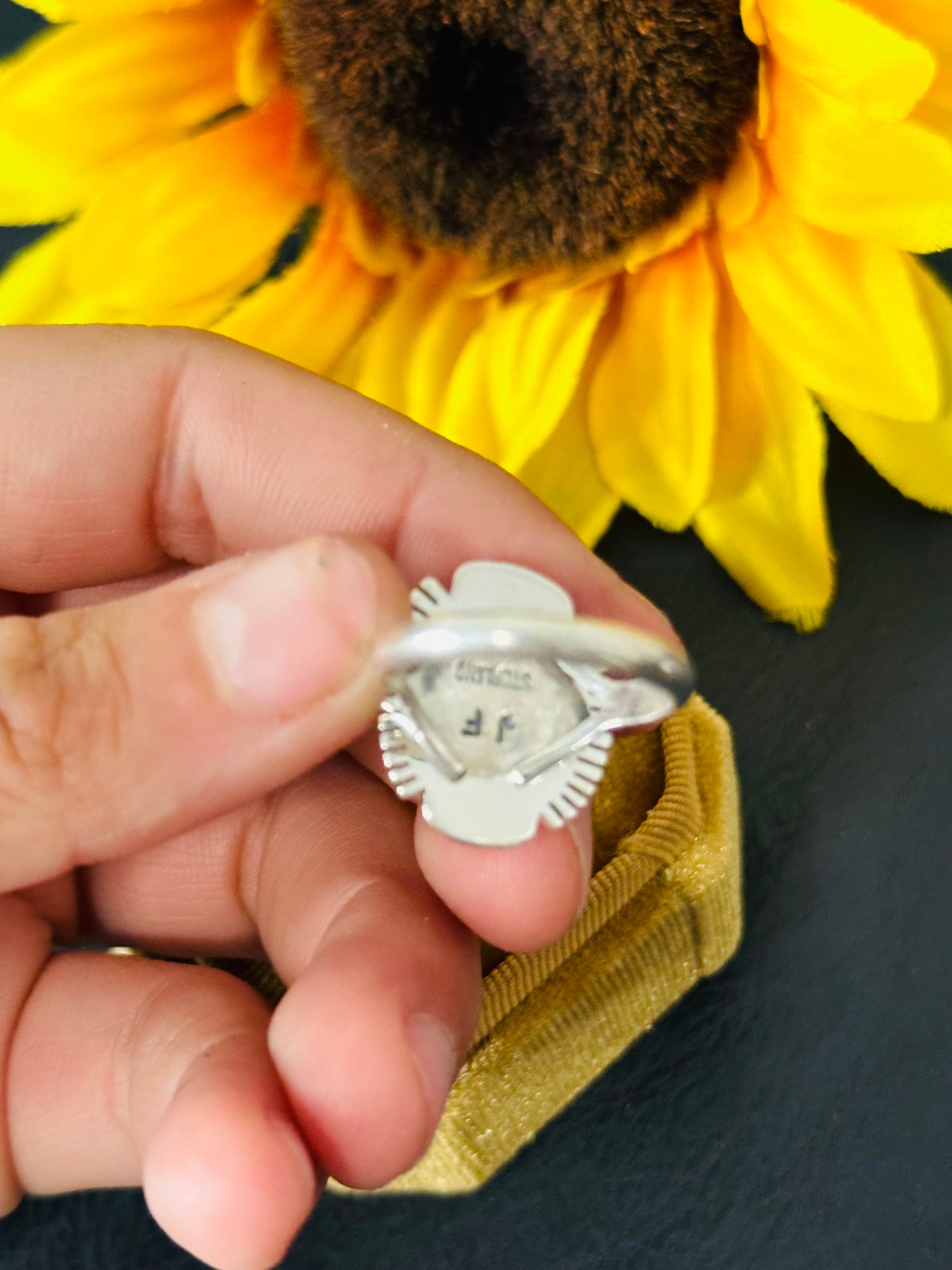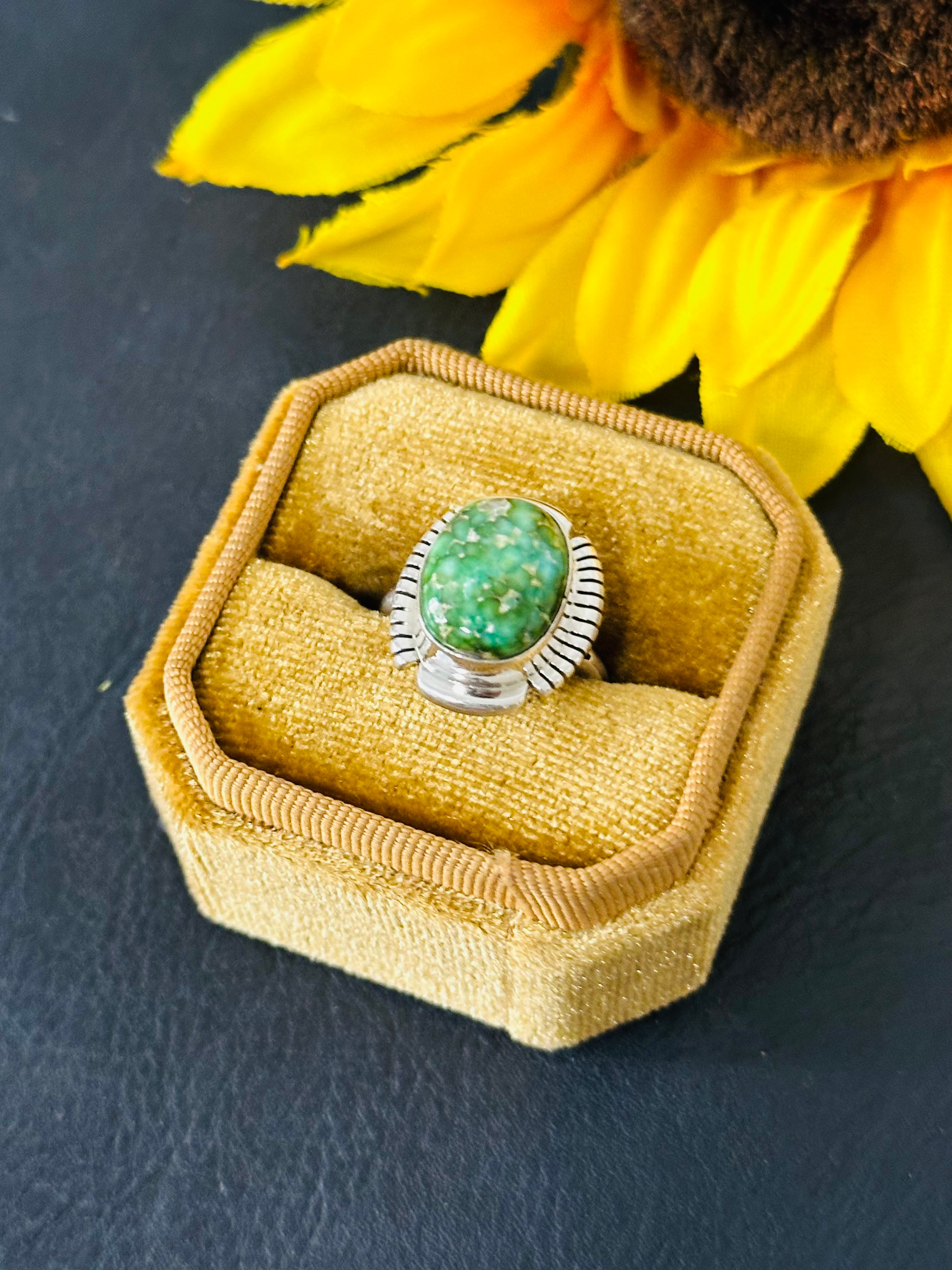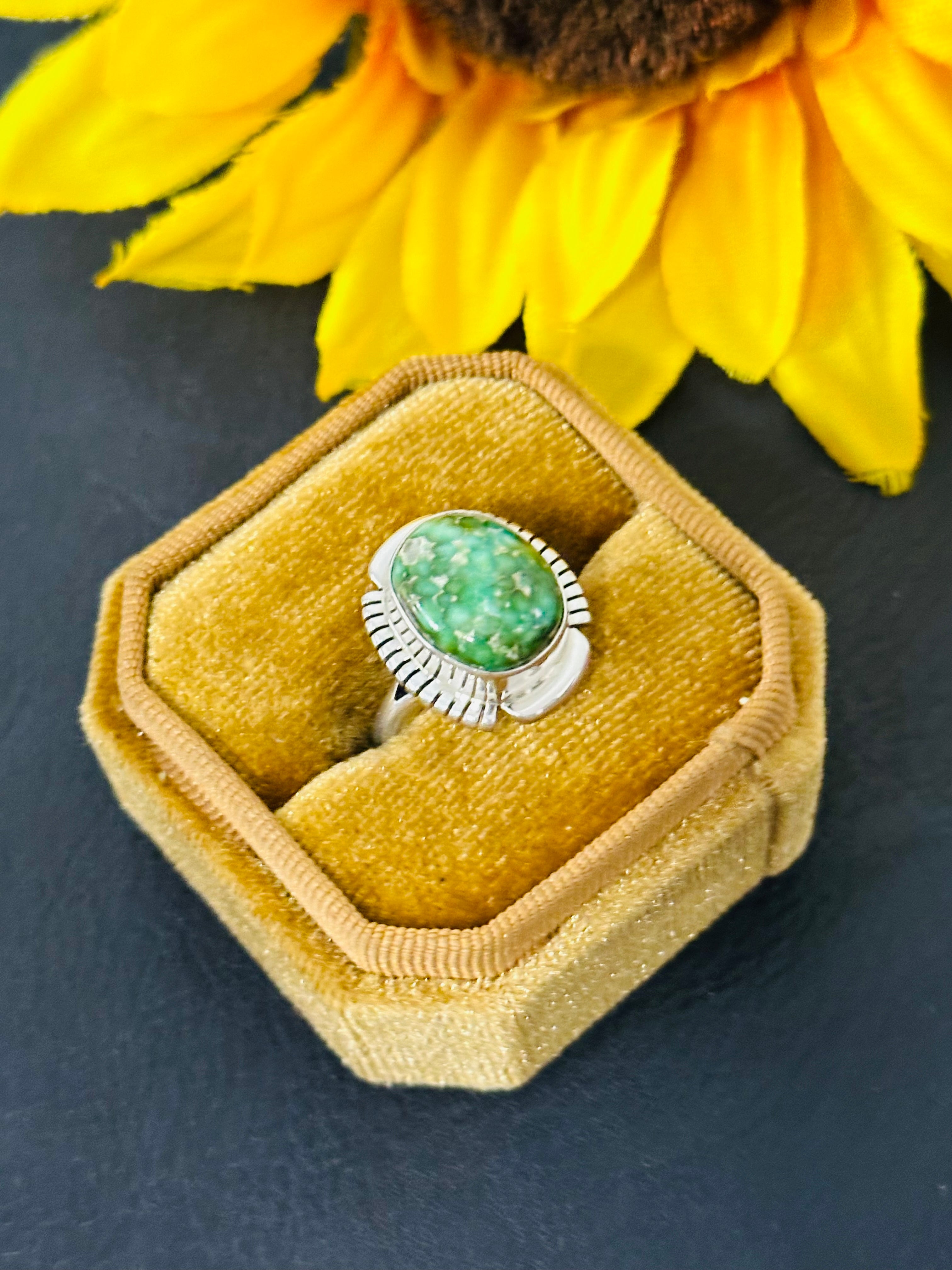 Beautiful ring, Navajo Made Sonoran Gold Turquoise & Sterling Silver Ring. It measures 3/4 of an inch long and 1/2 of an inch wide. Signed by the artist and stamped sterling silver.