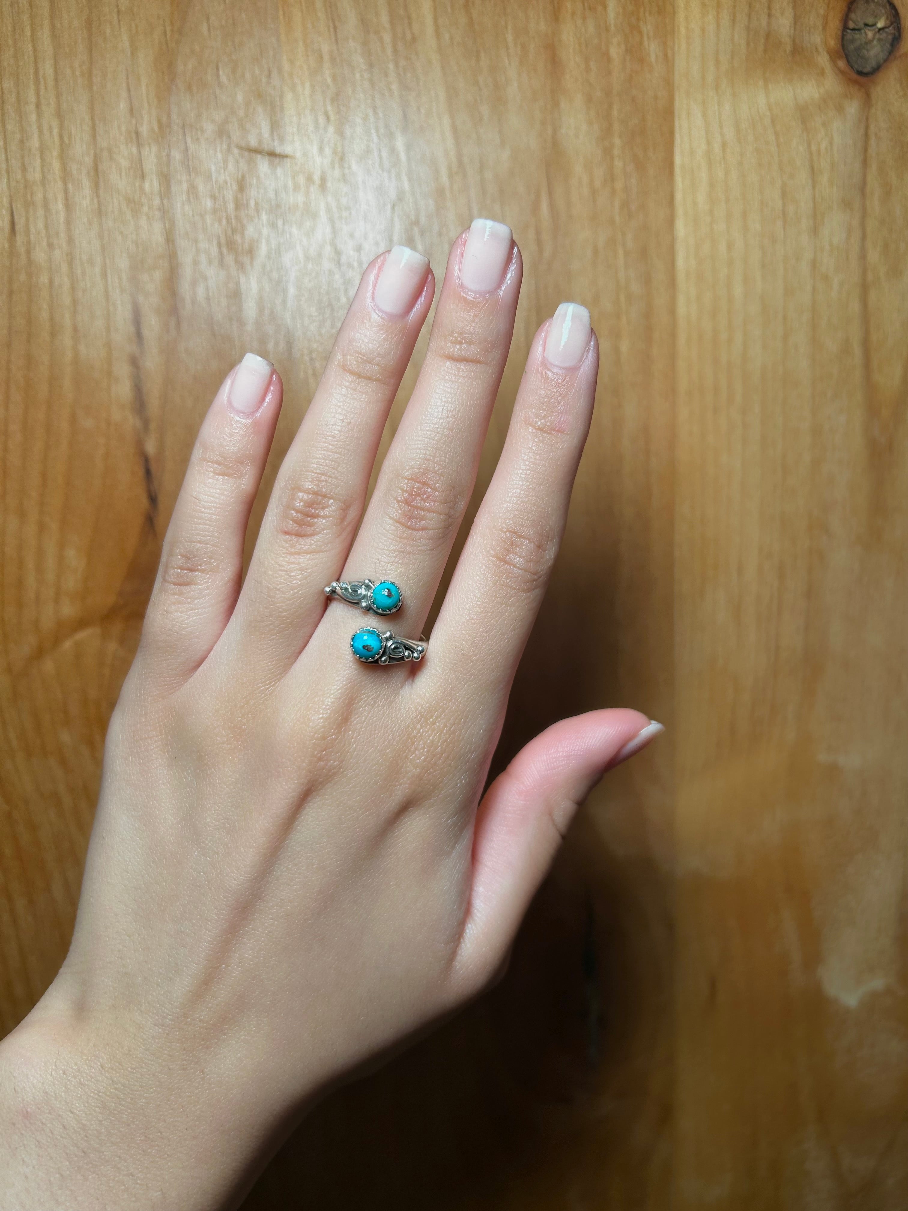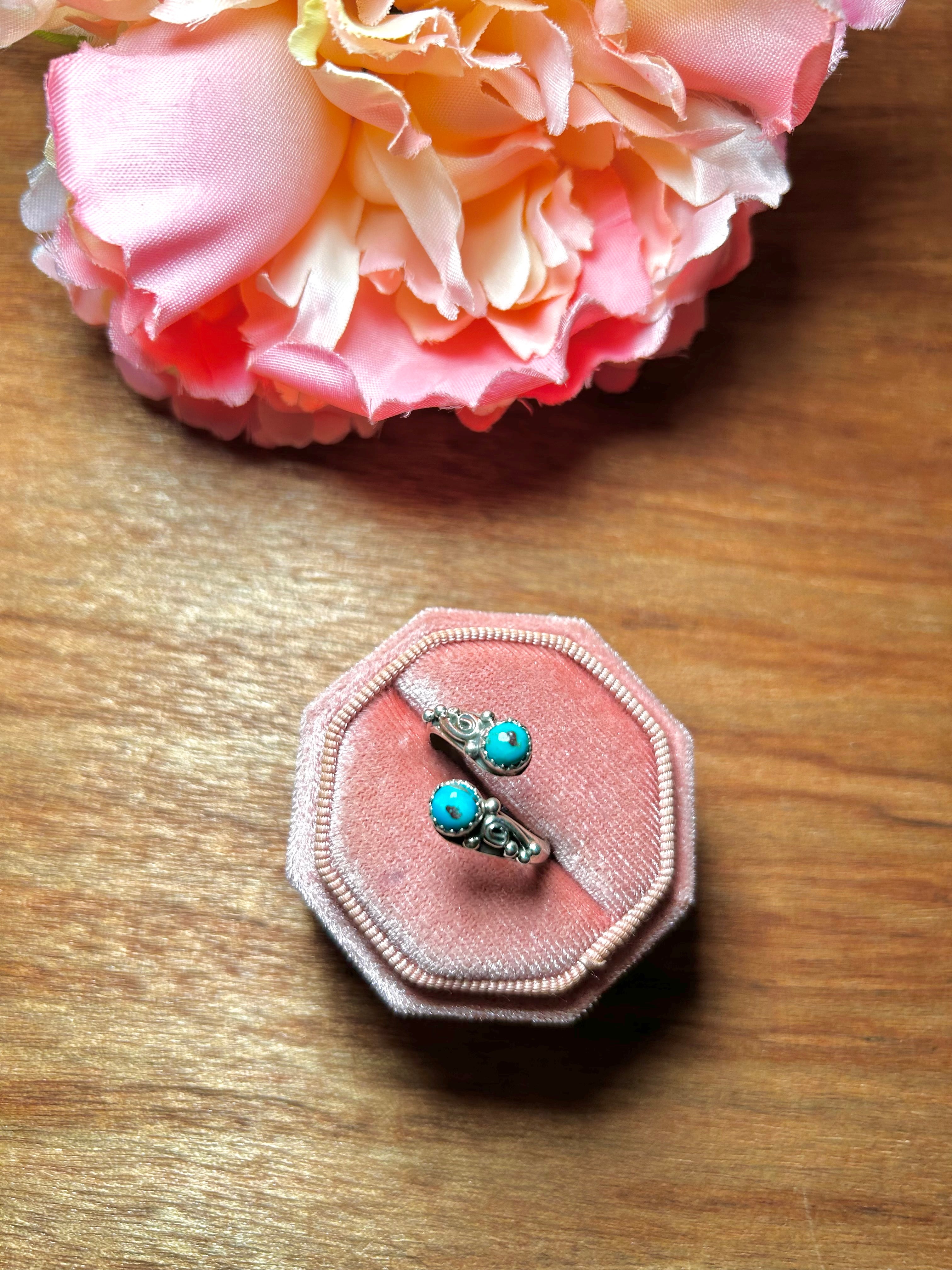 Navajo Made Kingman Turquoise & Sterling Silver Adjustable Ring. It measures 1/2 of an inch long and 1/2 of an inch wide. Stamped sterling silver and signed. Stones will vary due to natural stones