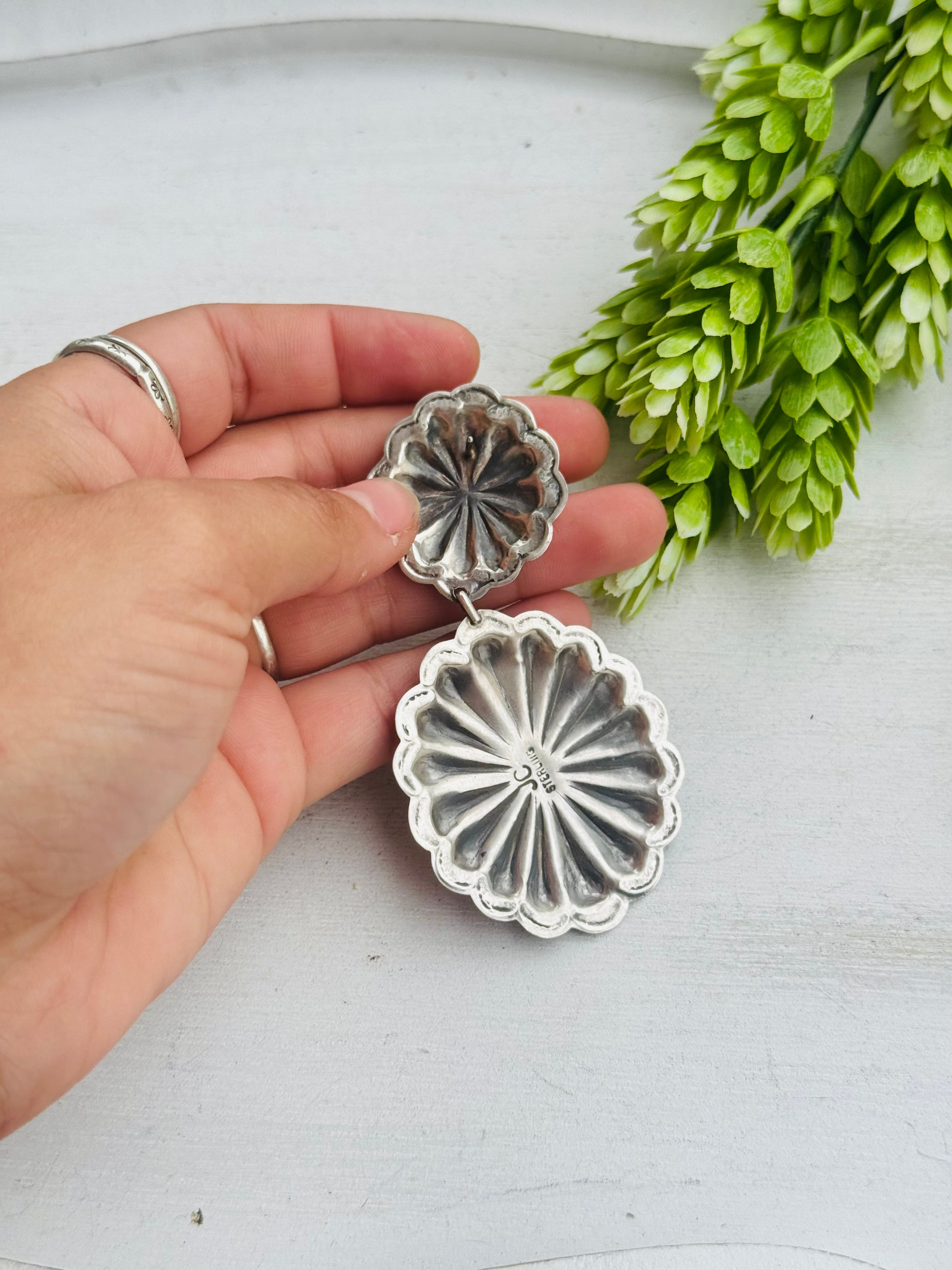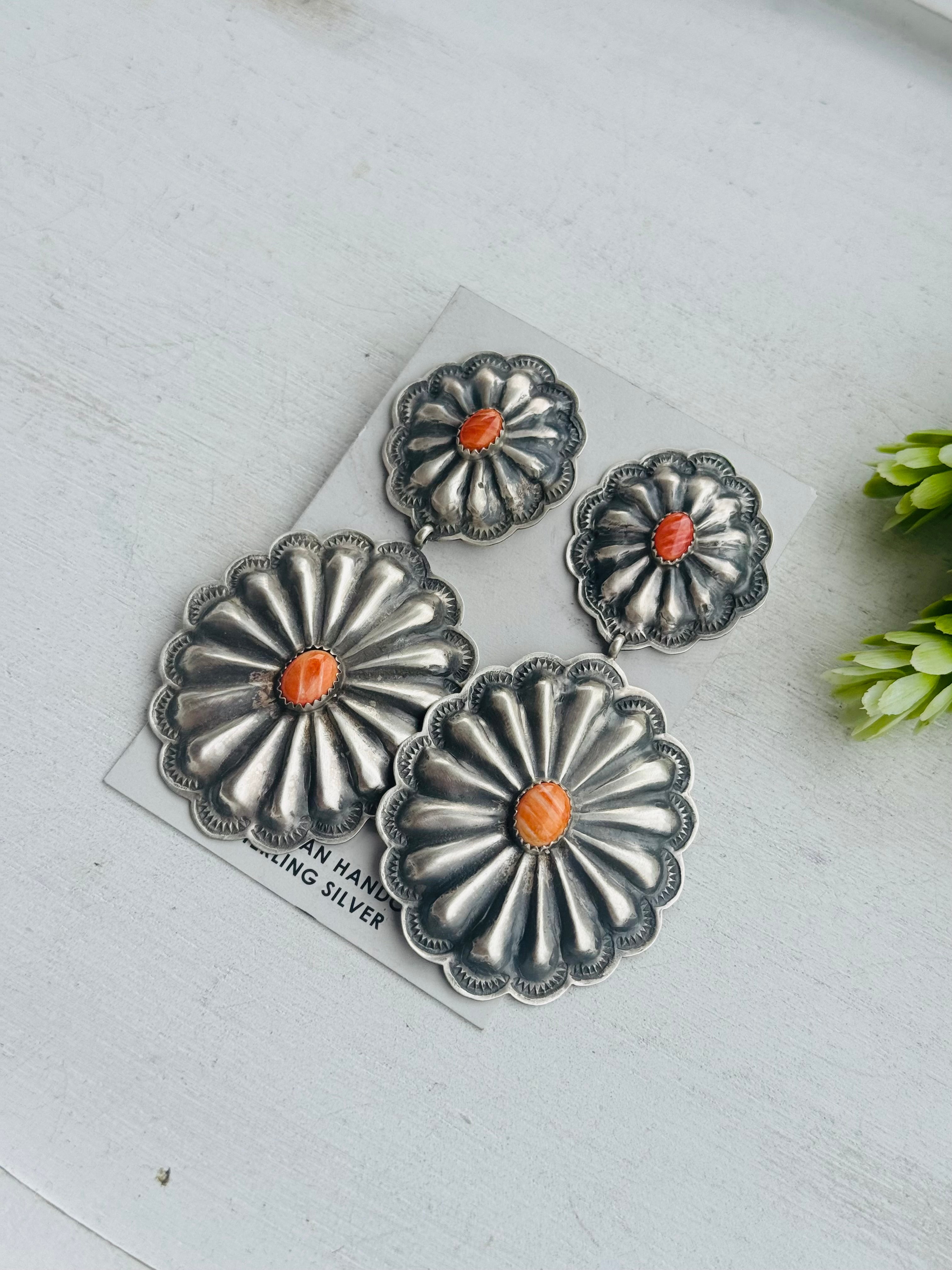Navajo Made Spiny Oyster & Sterling Silver Post Concho Earrings. It measures 3 1/4 inches long and 1 3/4 inches wide. Signed and stamped