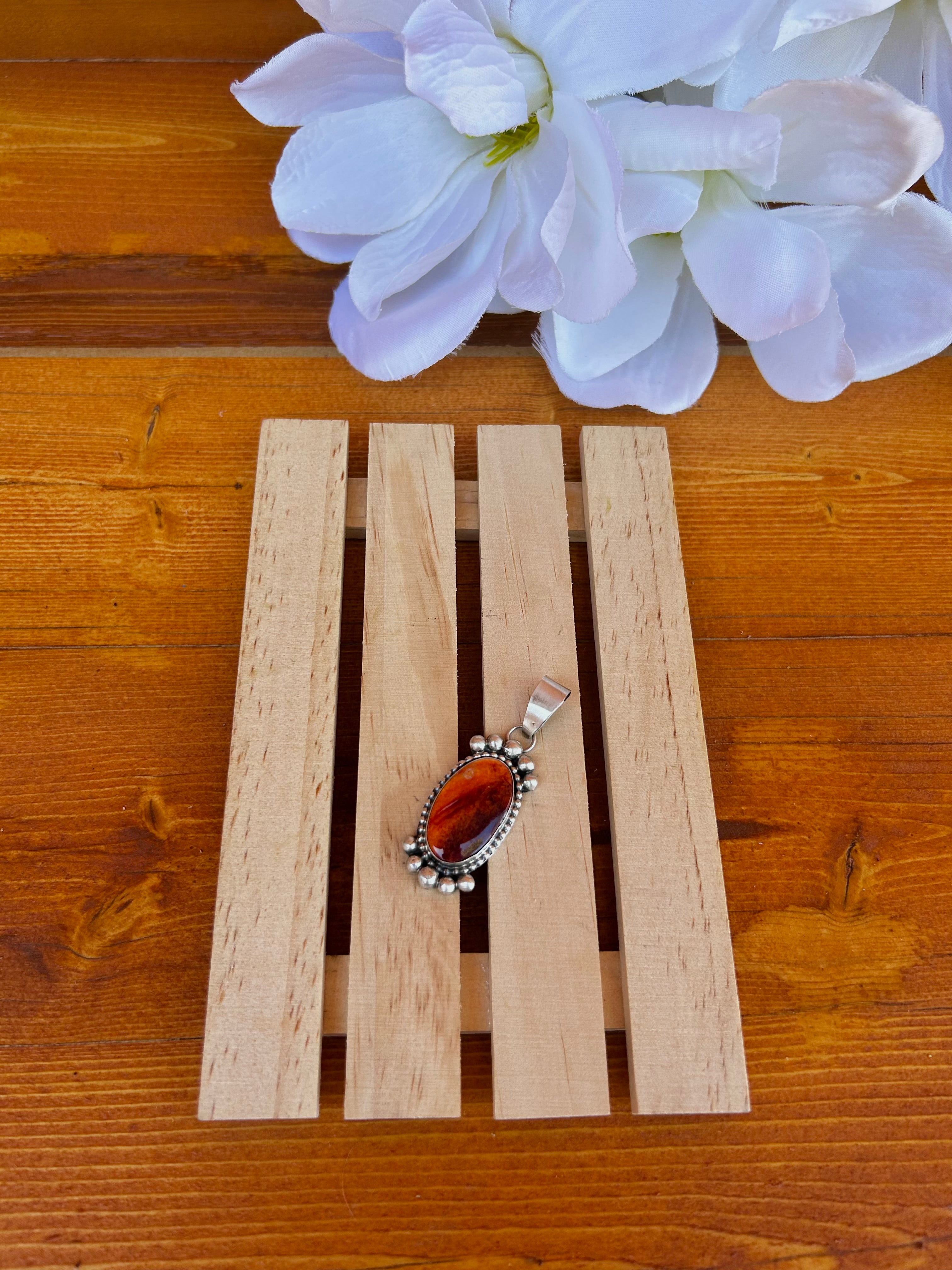 Navajo Made Spiny Oyster & Sterling Silver Pendant. It measures 2 inches long and 5/8 of an inch wide. Pendant Only. Signed by the artist and stamped sterling silver.