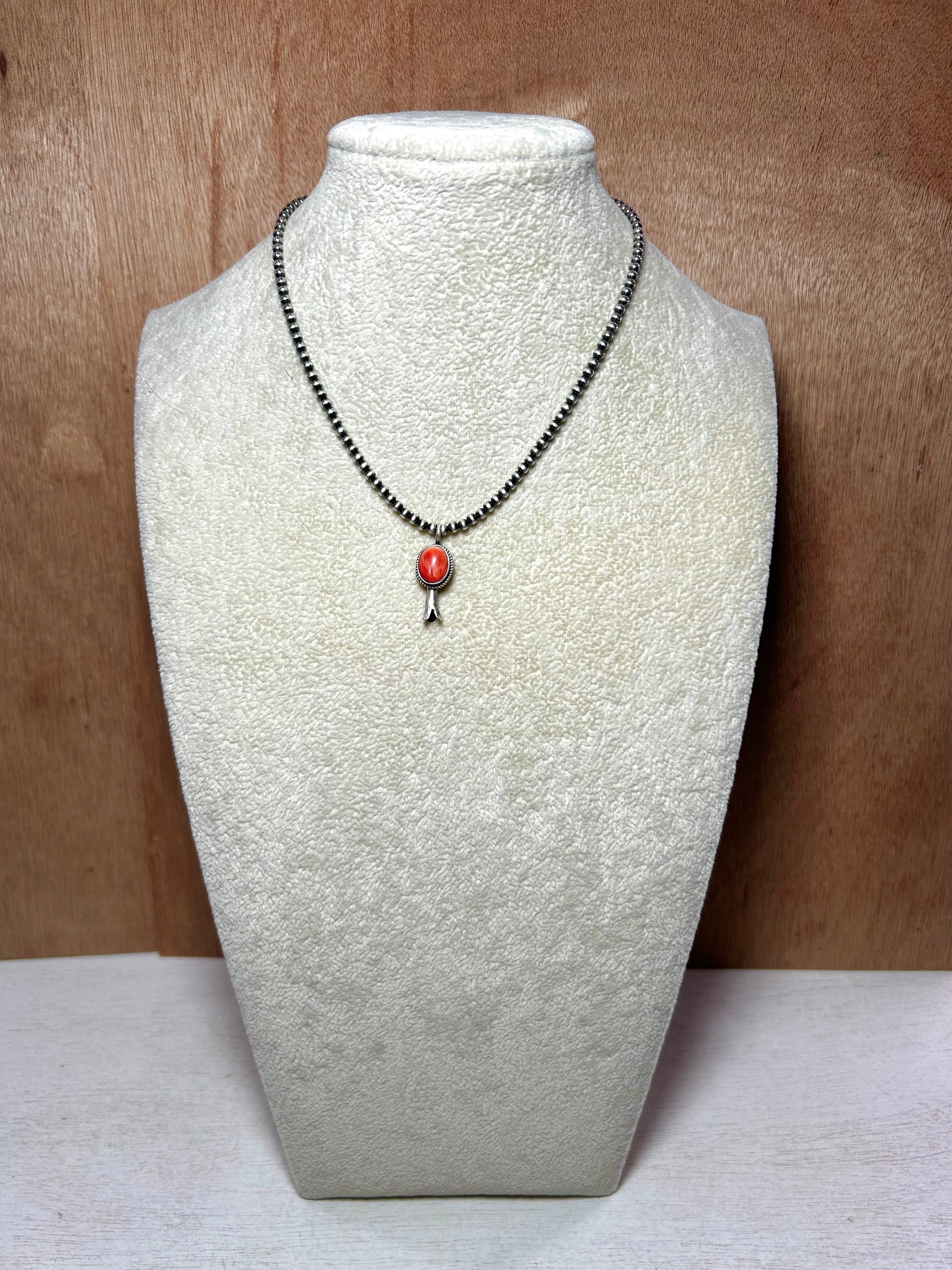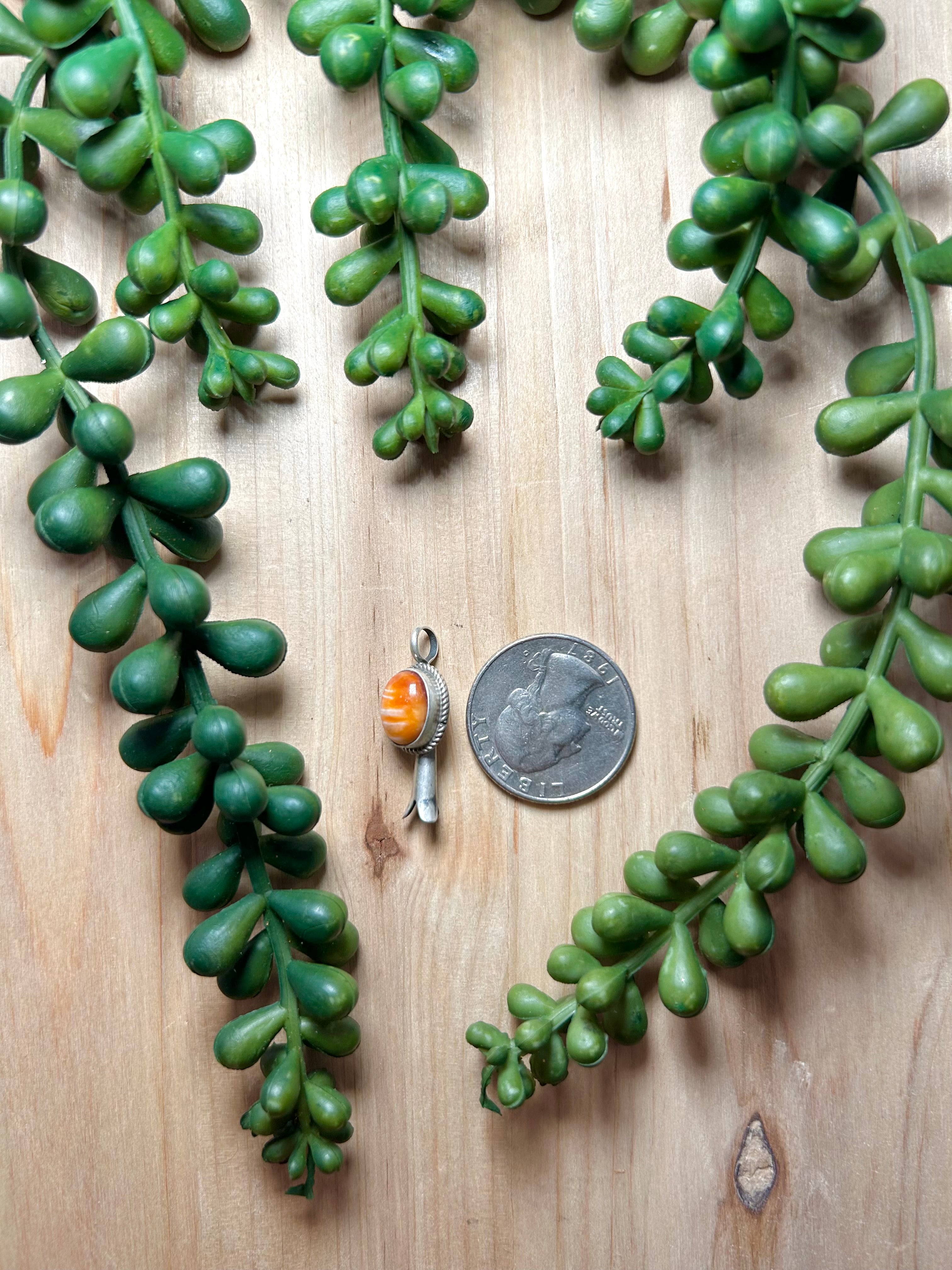 Navajo Made Spiny Oyster & Sterling Silver Pendant. It measures 1 inch long and 1/2 of an inch wide. Pendant Only. Signed by the artist and stamped sterling silver.