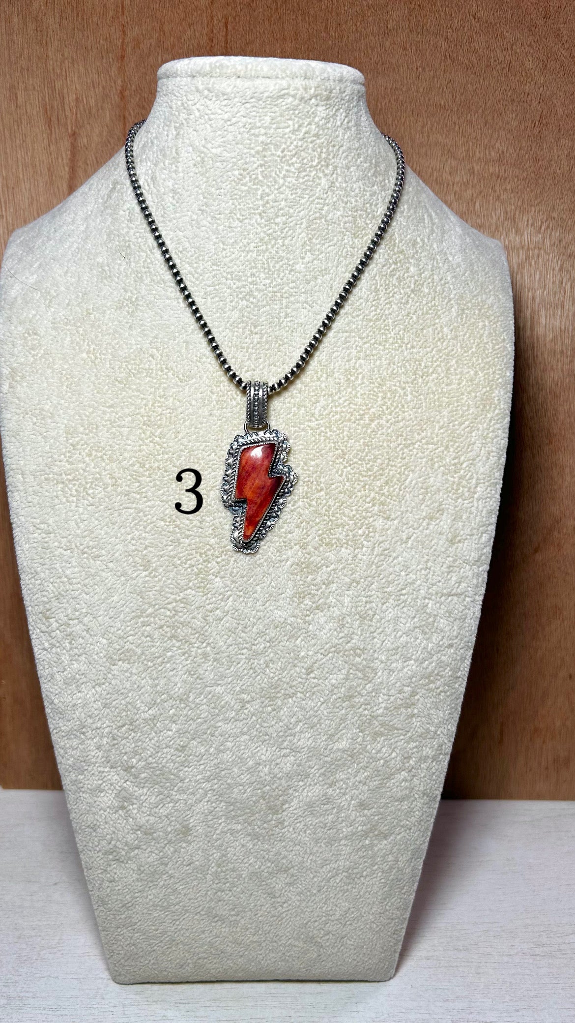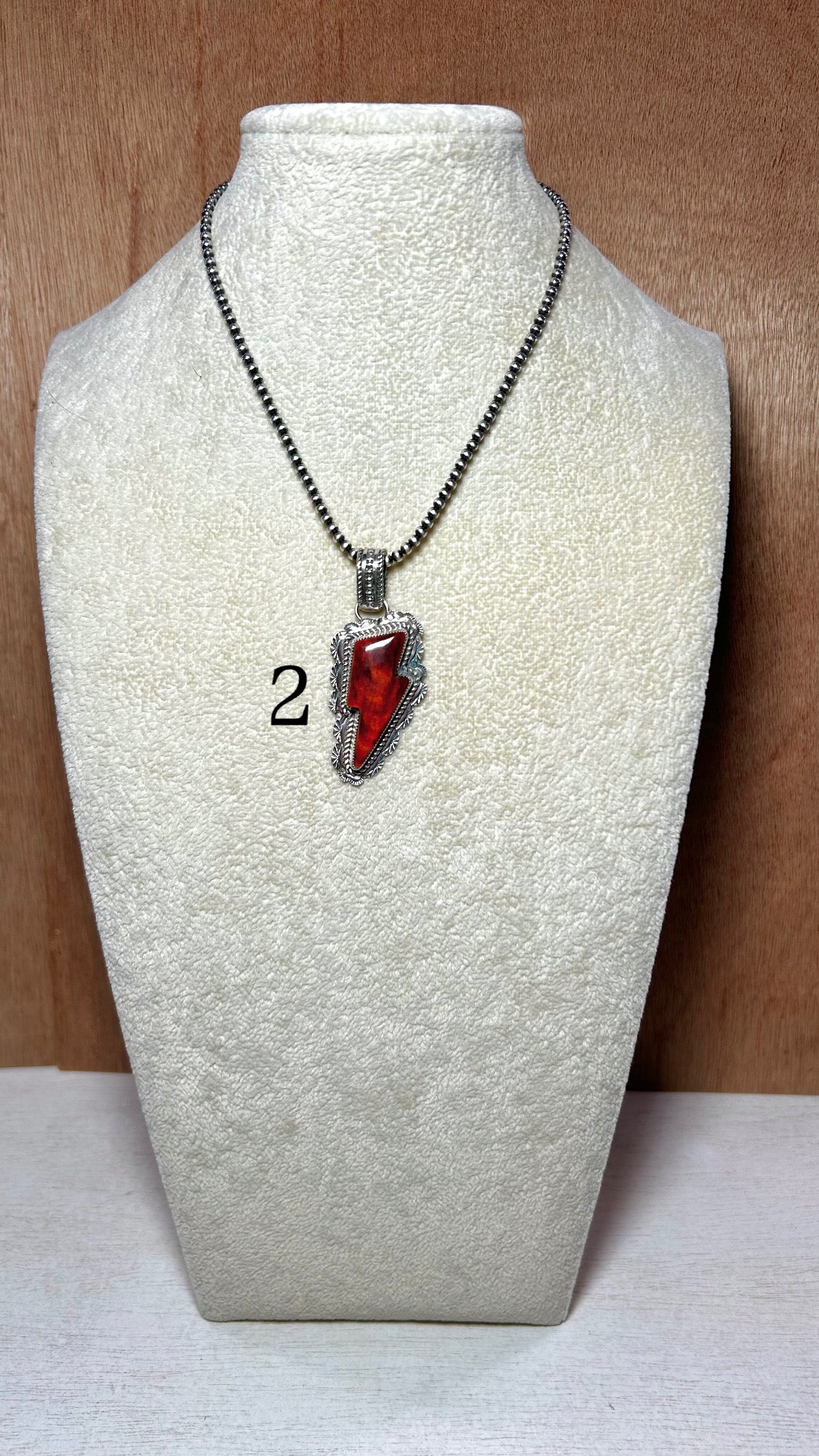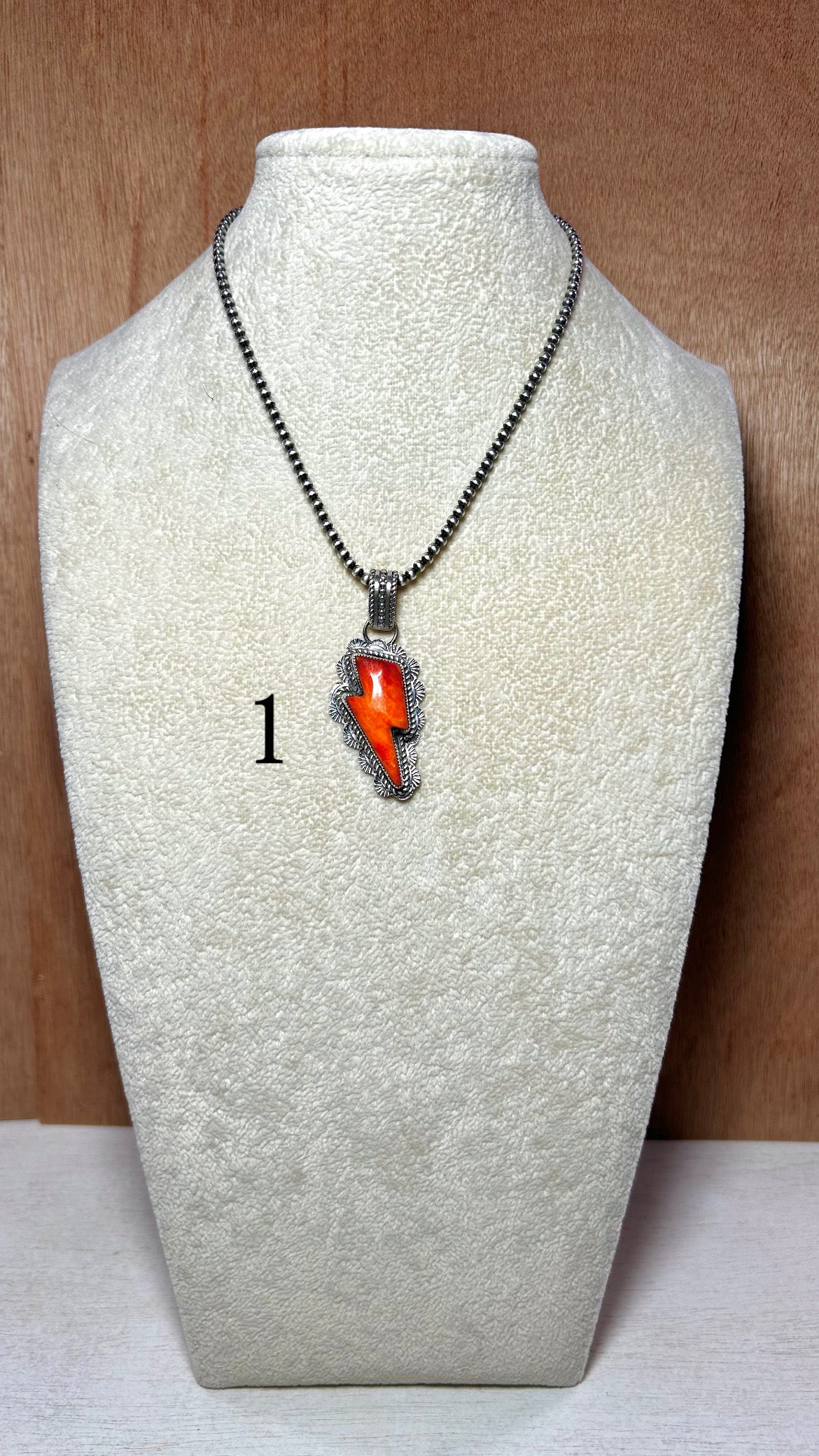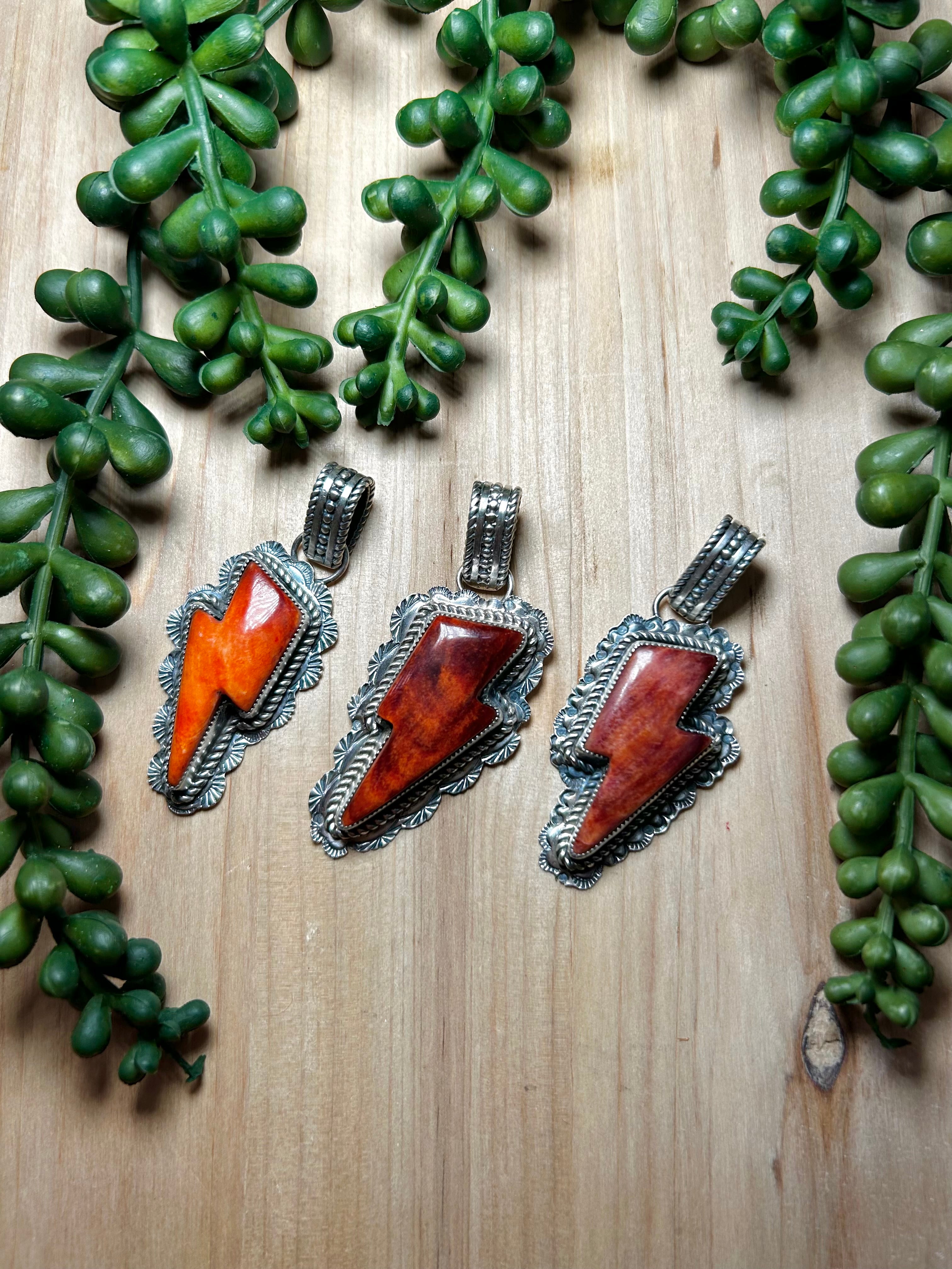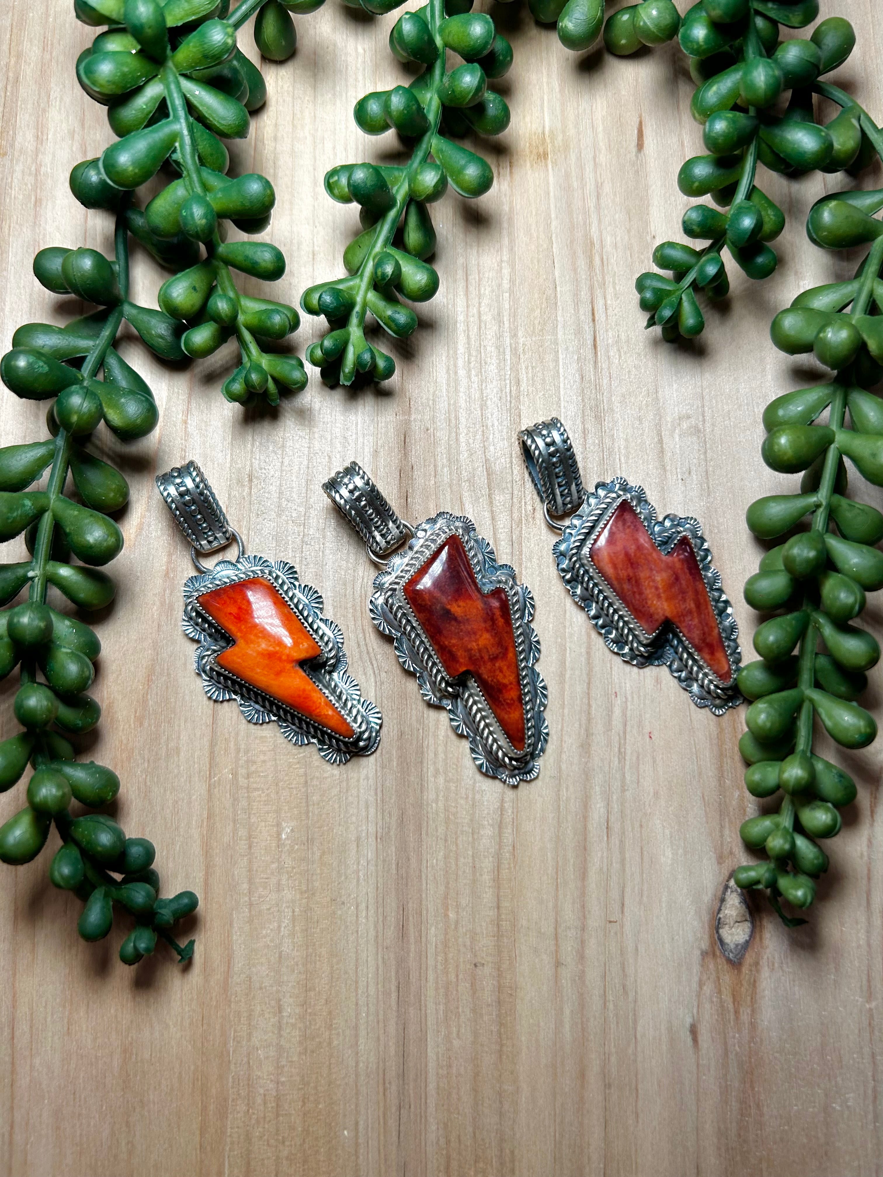 Navajo Made Spiny Oyster & Sterling Silver Pendant. It measures 2 1/4 inches long and 1 inch wide. Pendant Only. Signed by the artist and stamped sterling silver.