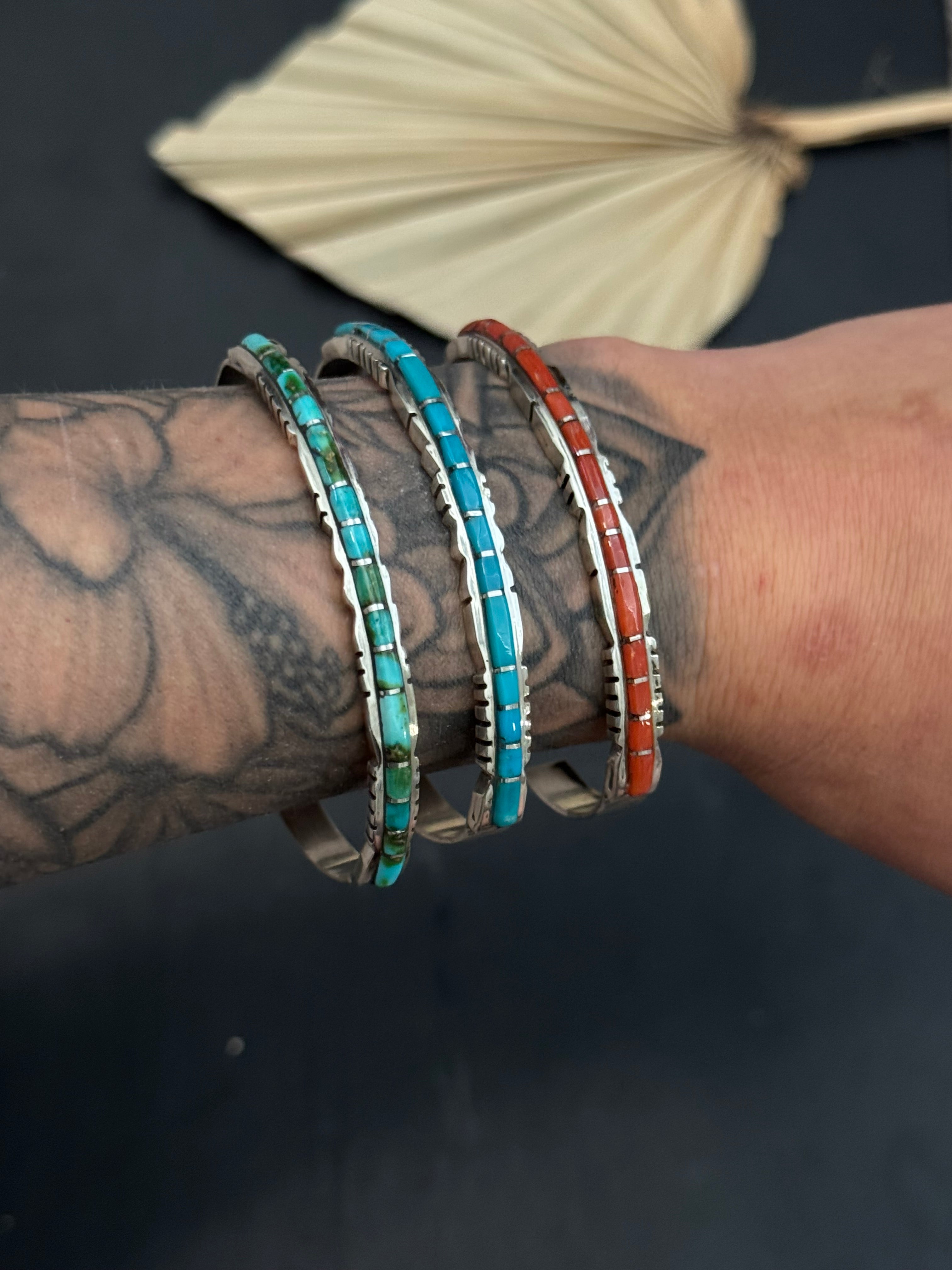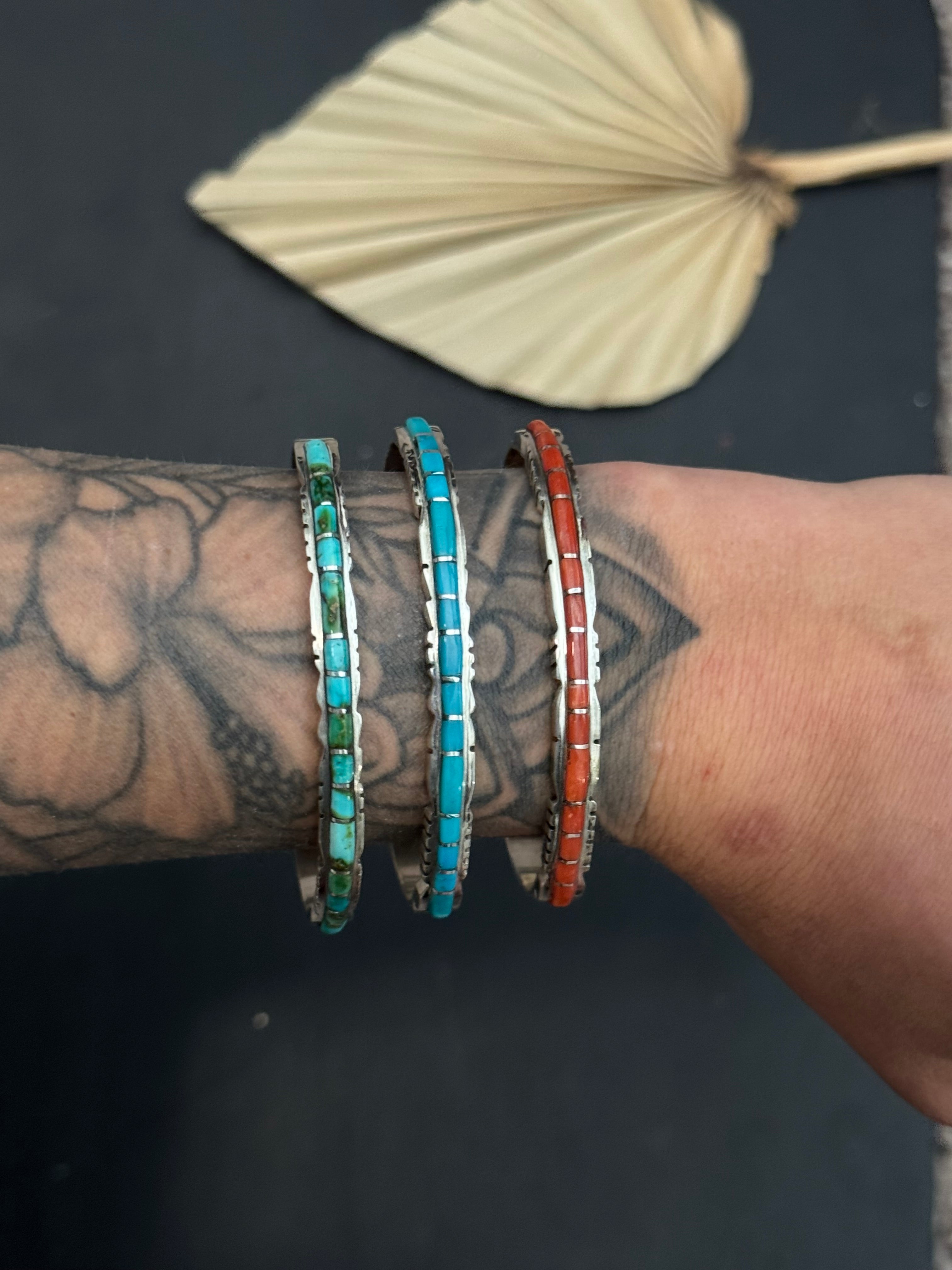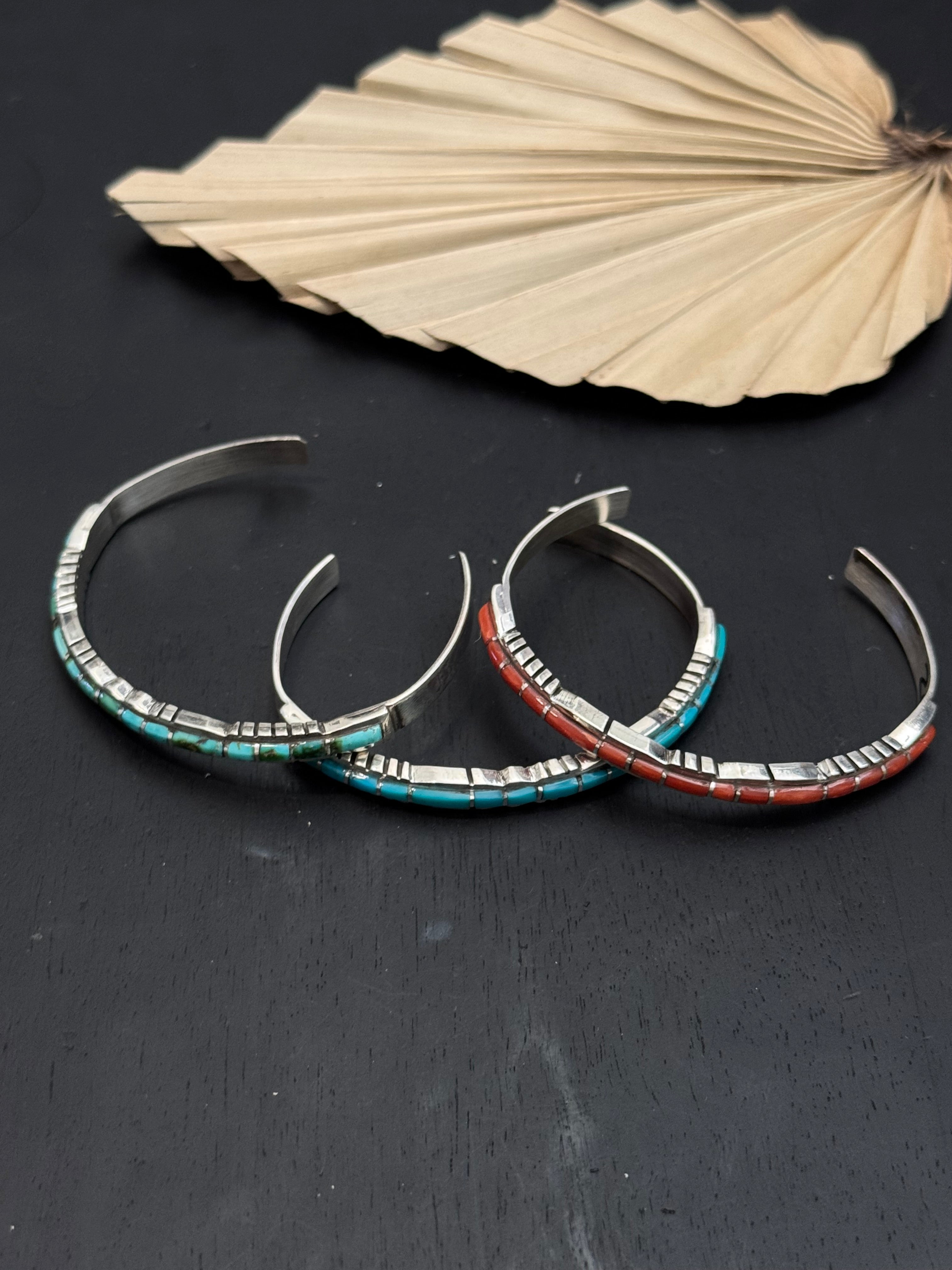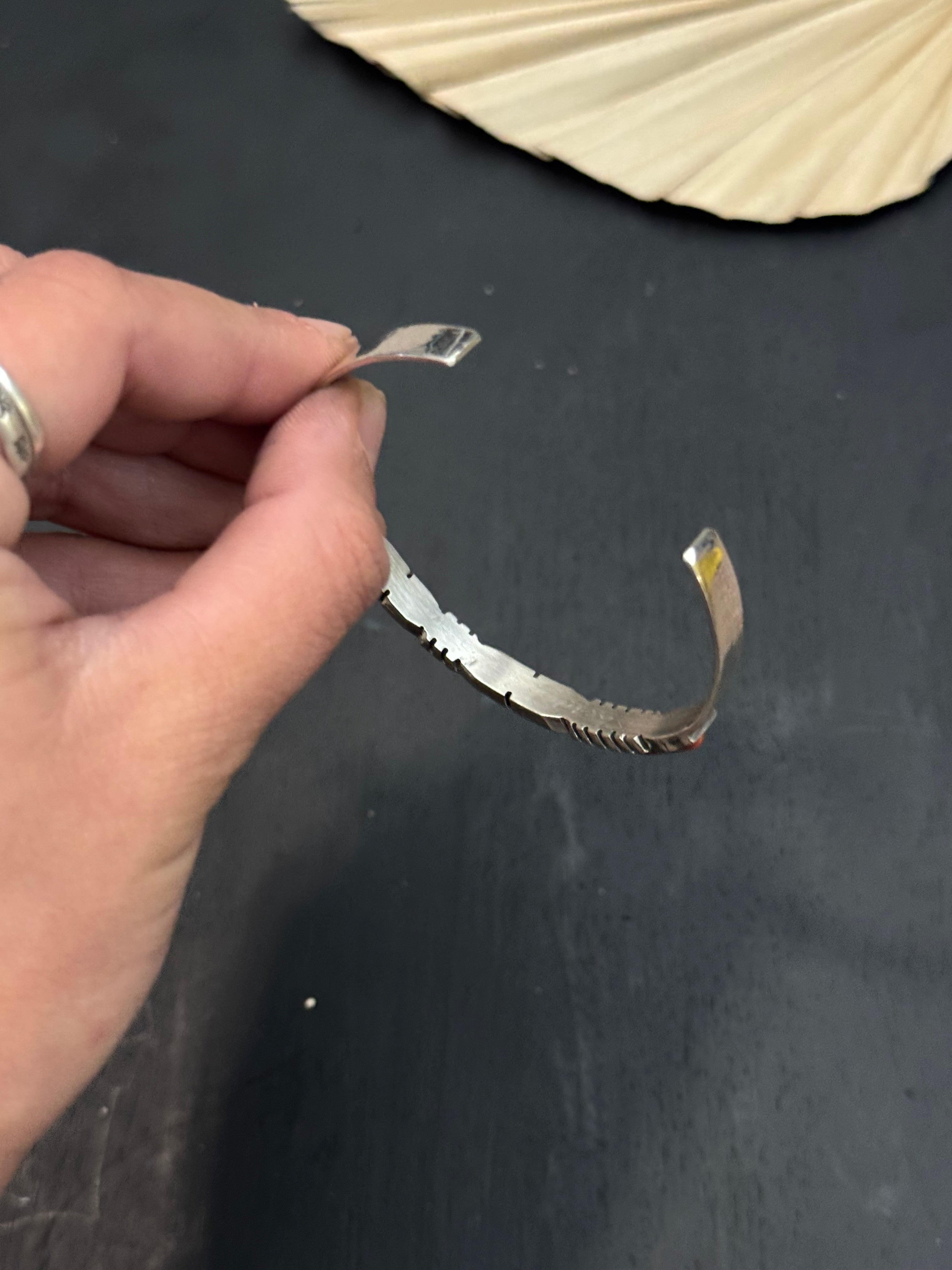 Navajo Made Sterling Silver Cuff Bracelet. It measures 1/4 of an inch wide with an inside circumference of 5 1/4 inches and a gap of 1 1/4 inches. Signed by the artist and stamped sterling silver. Stones will differ to natural stones.