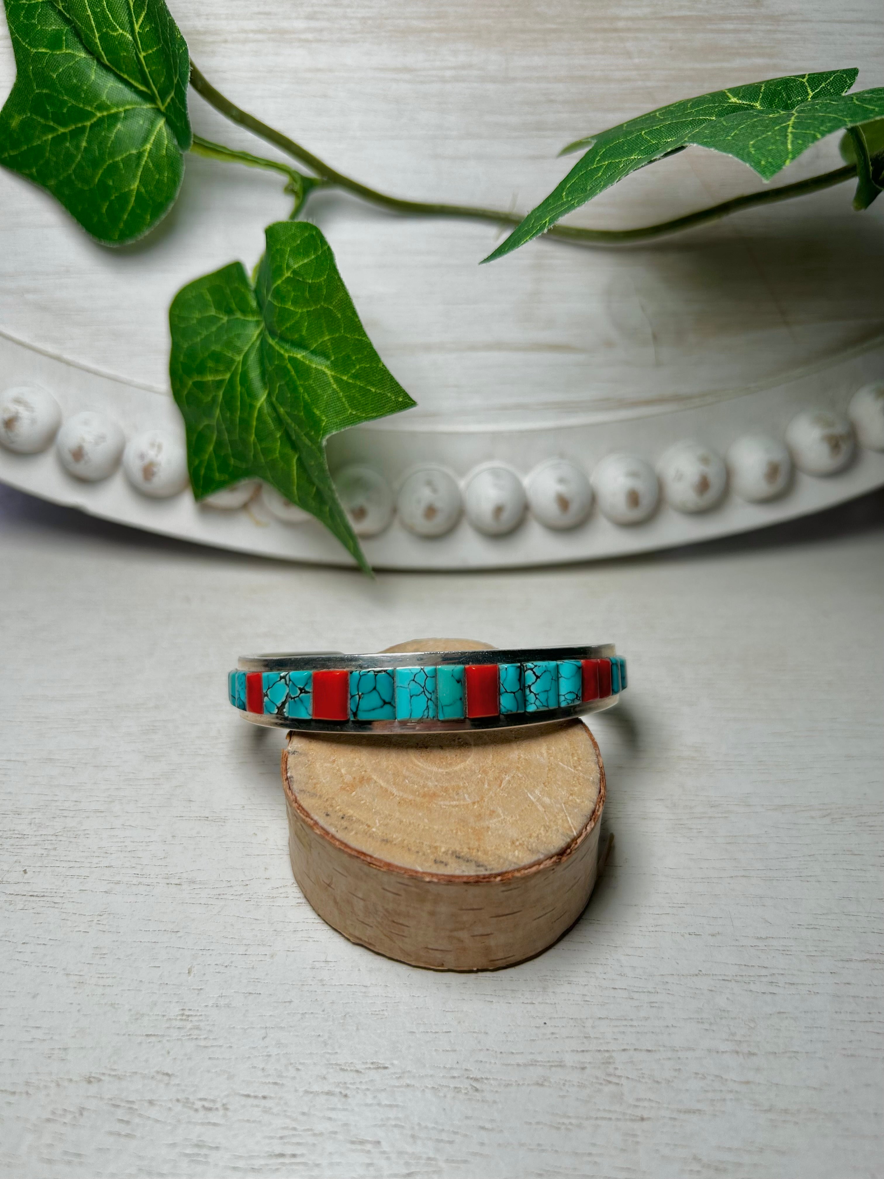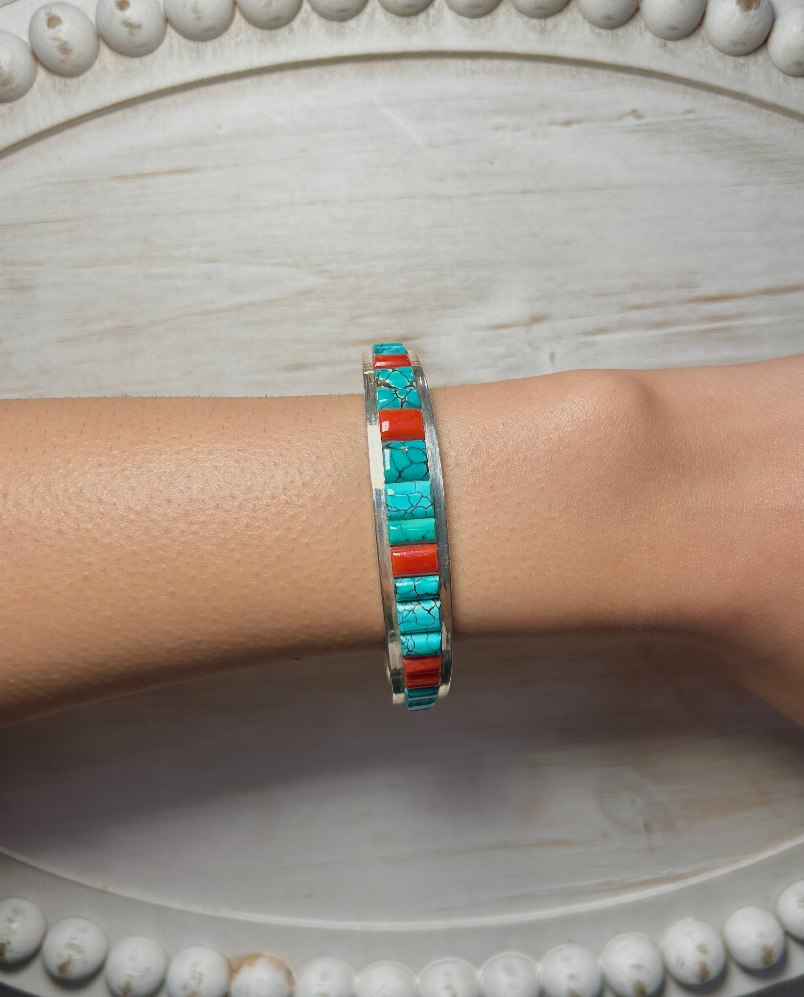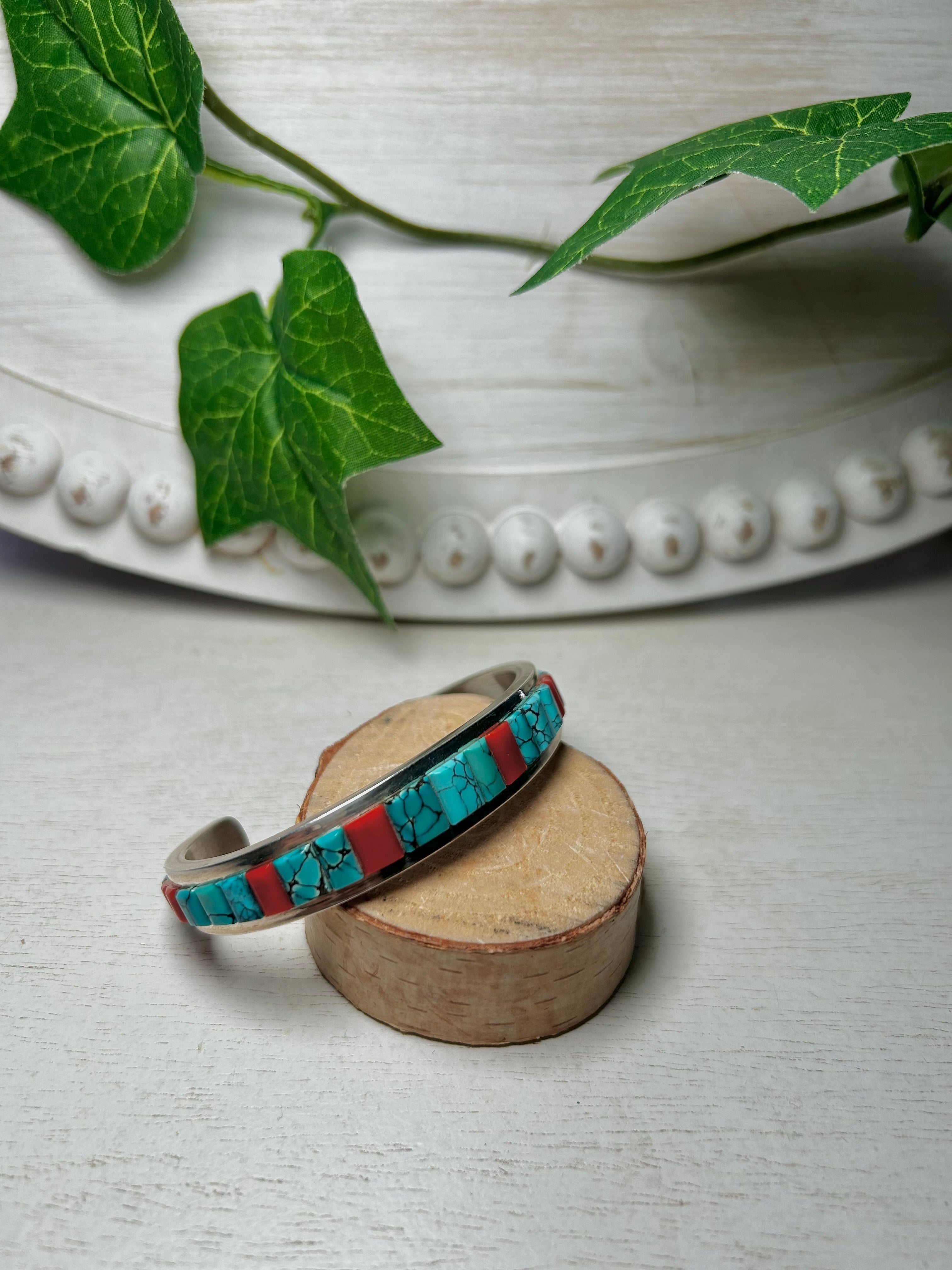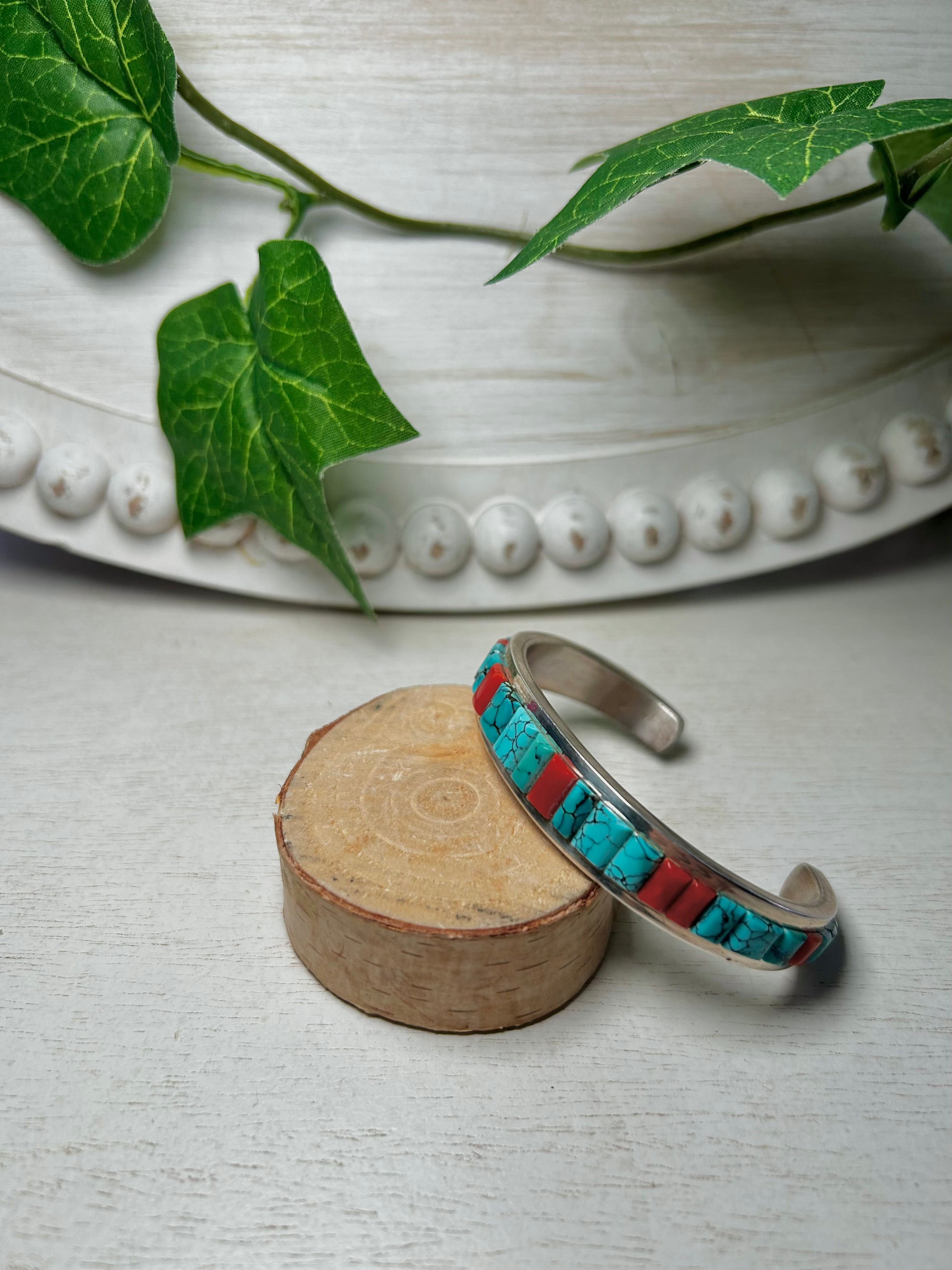 Thomas Francisco Made in 90’s Multi Stone & Sterling Silver Cuff Bracelet. It measures 1/2 of an inch wide with an inside circumference of 5 1/8 inches and a gap of 1 3/8 inches. Stamped sterling silver.