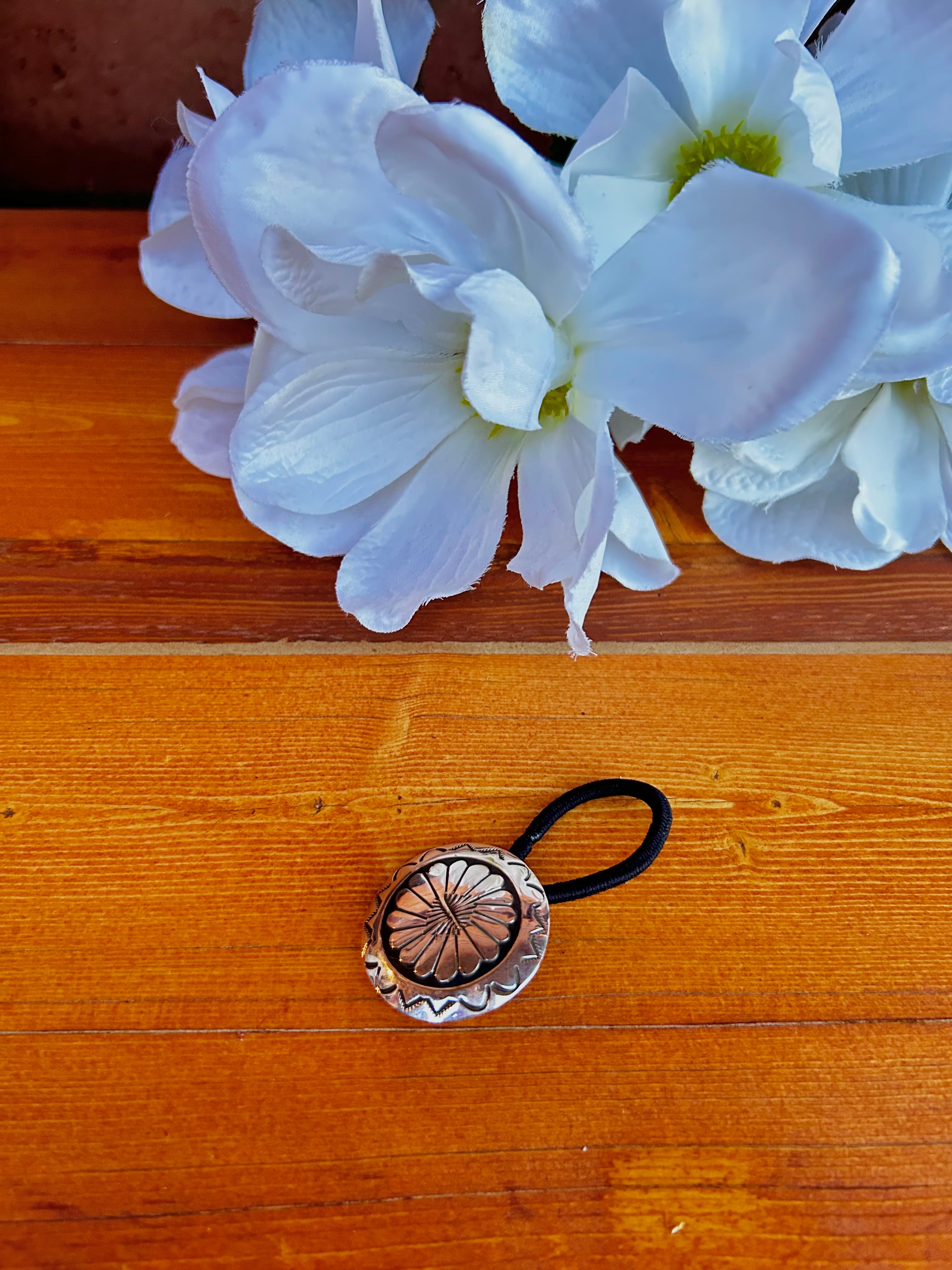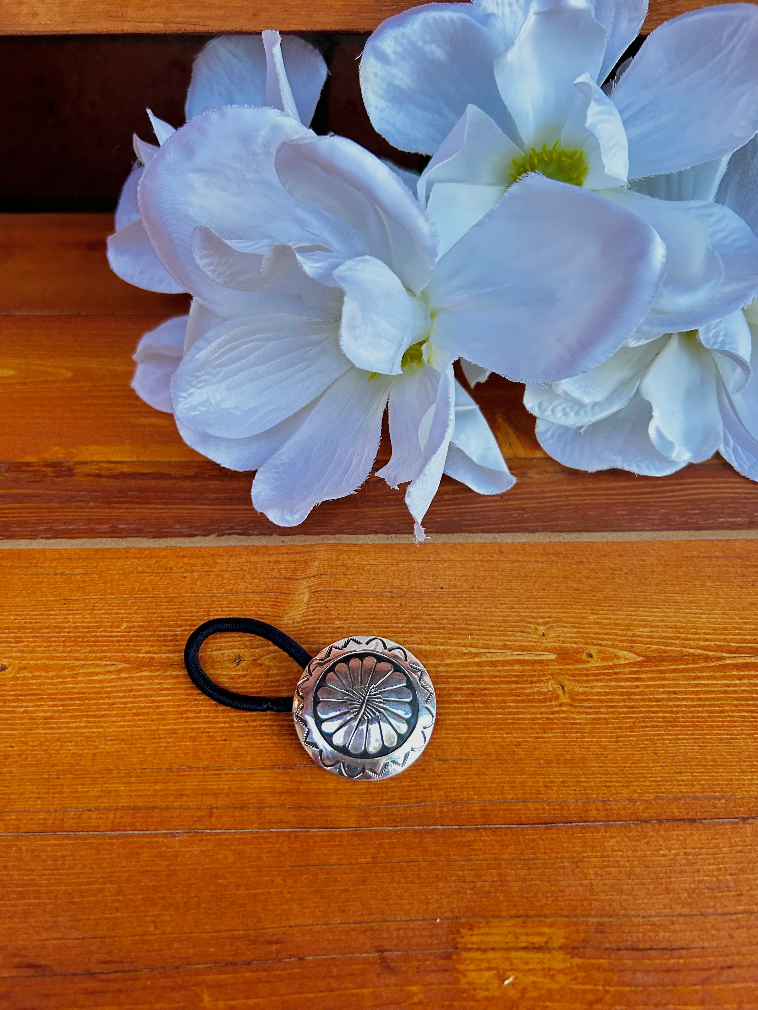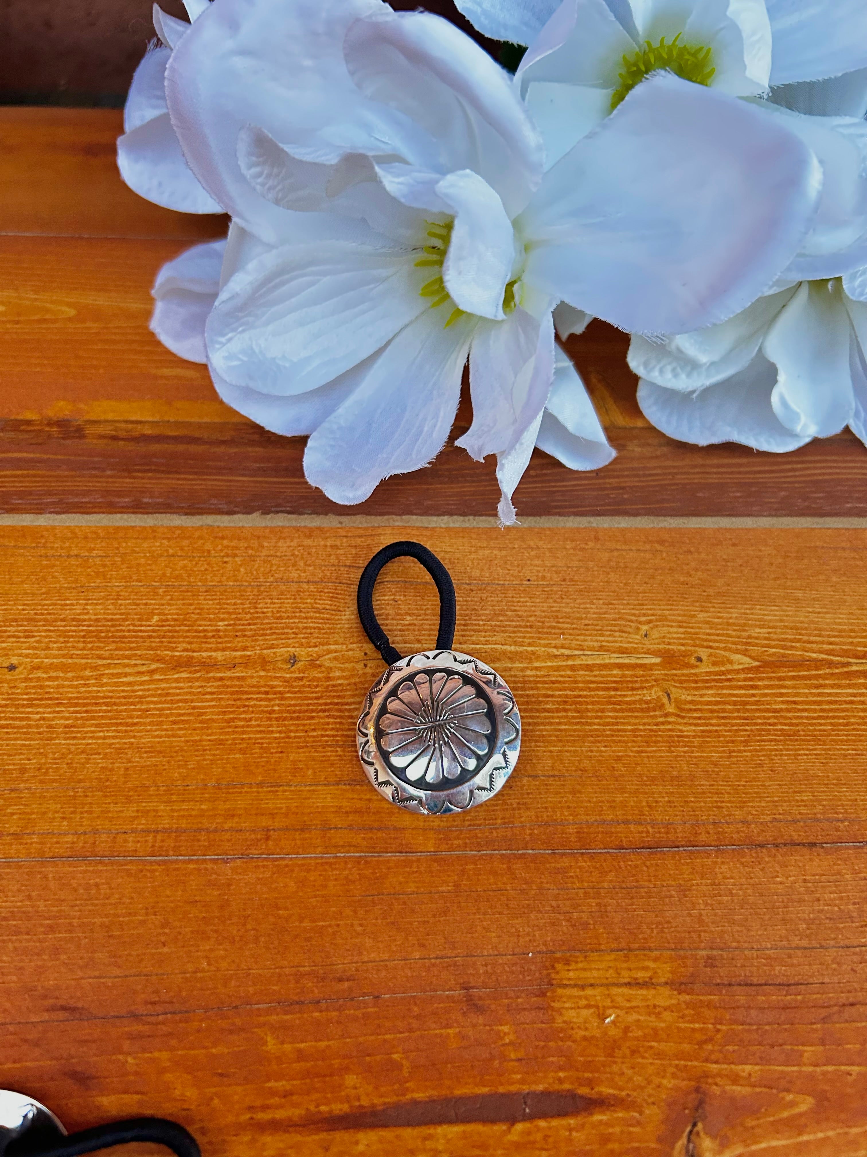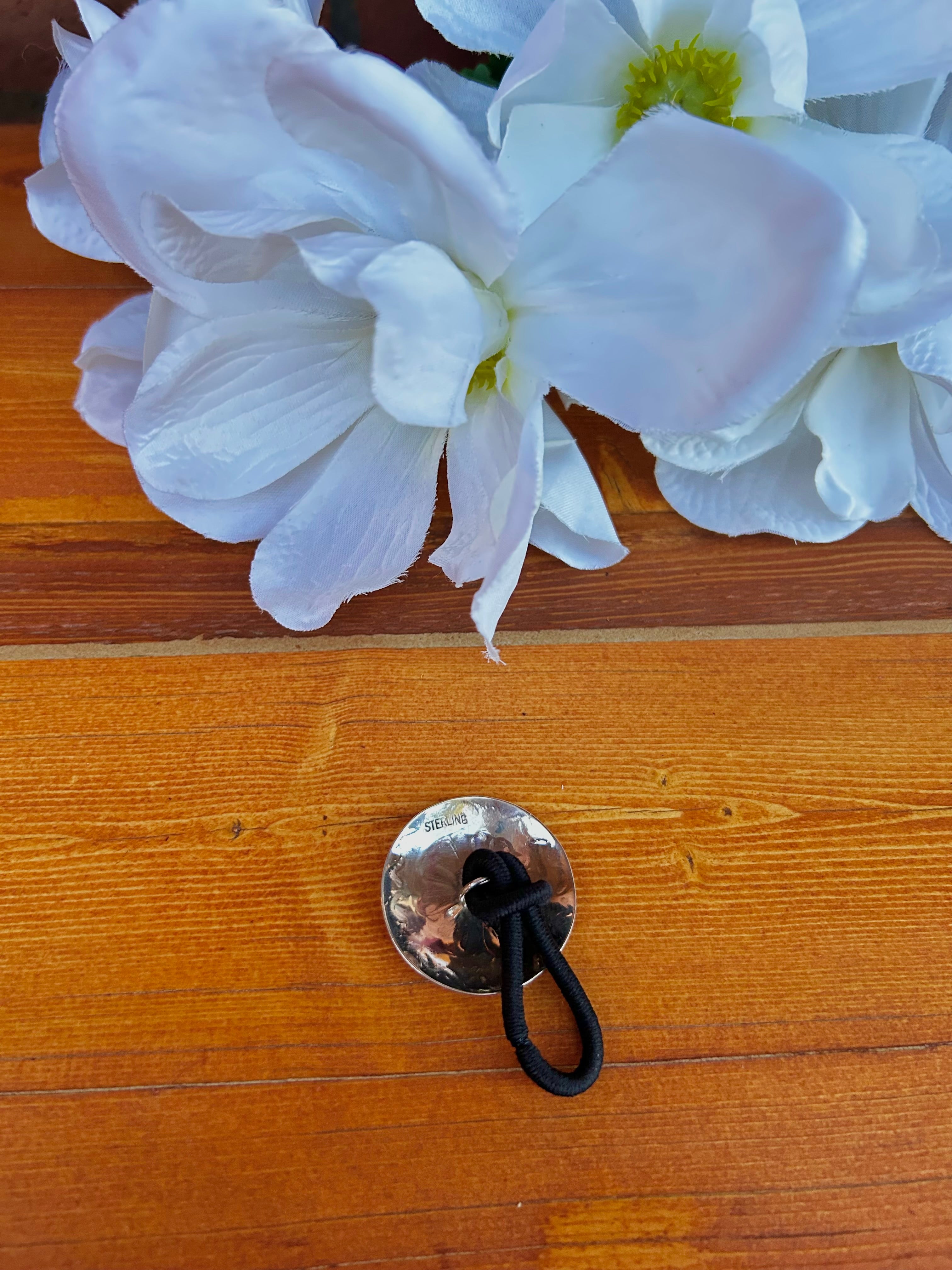 Navajo Made Sterling Silver Hair Tie. It Measures 1 3/8 inches long and 1 3/8 inches wide. Stamped Sterling and signed.