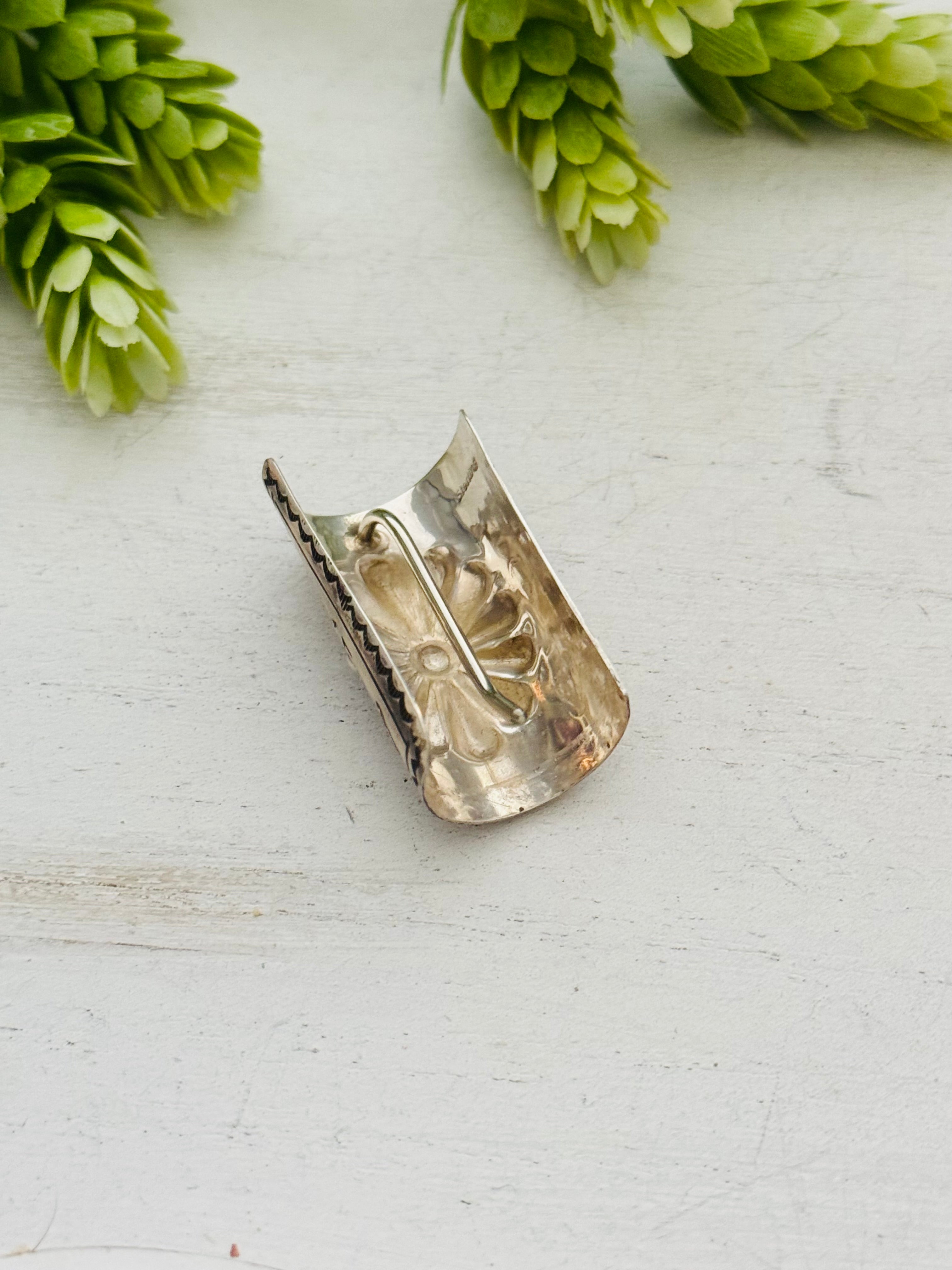 Navajo Made Sterling Silver Ponytail Holder. It measures just over 2 inches long and just under 1 1/4 inches wide. Stamped sterling silver.