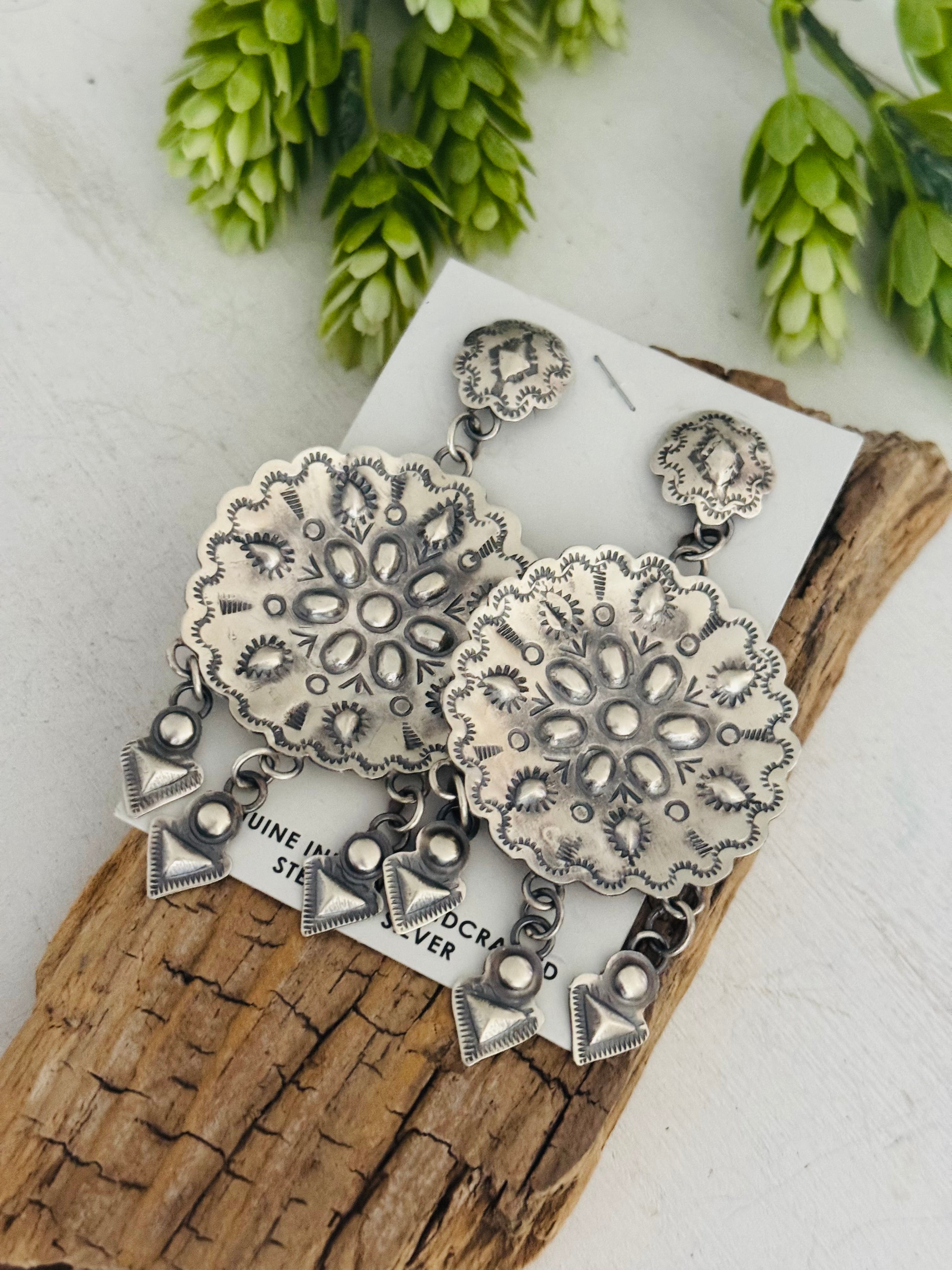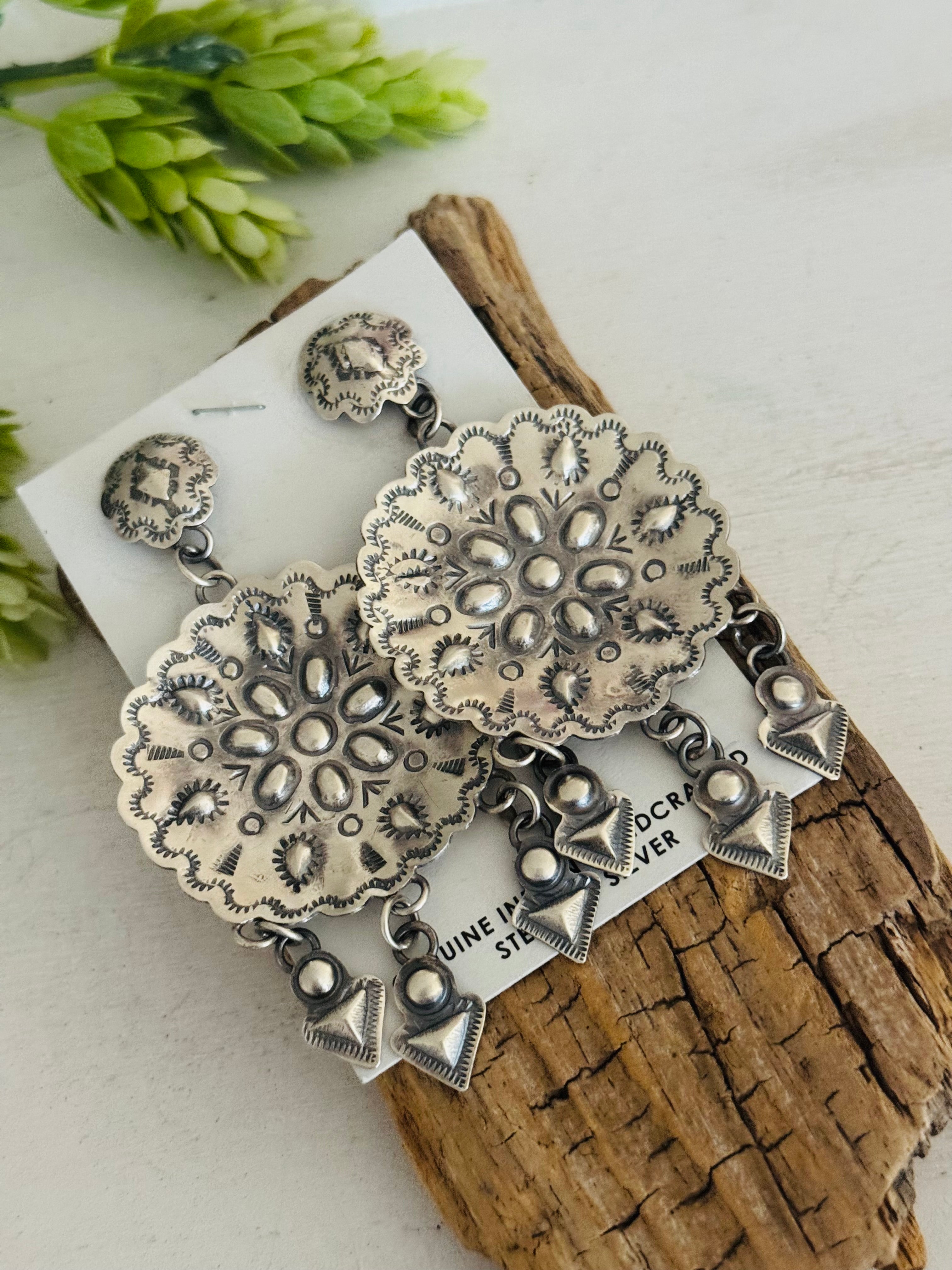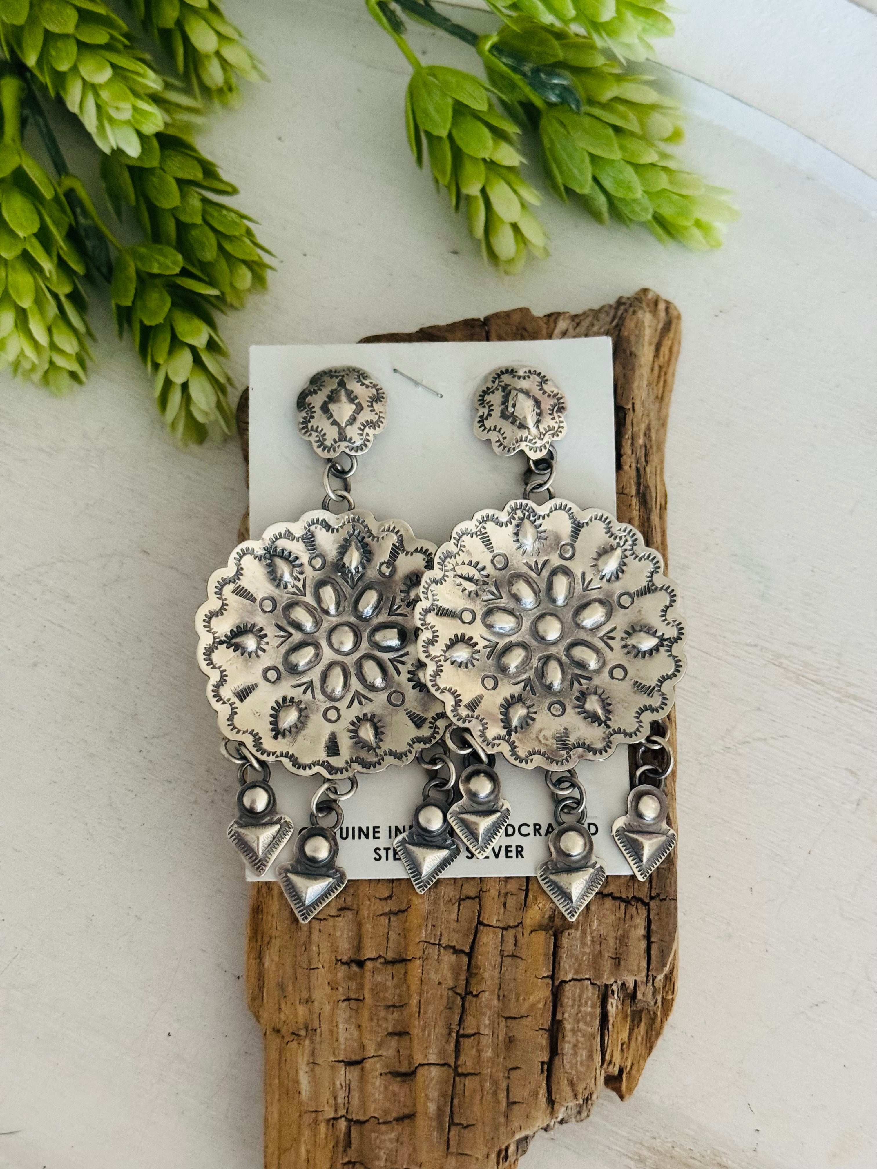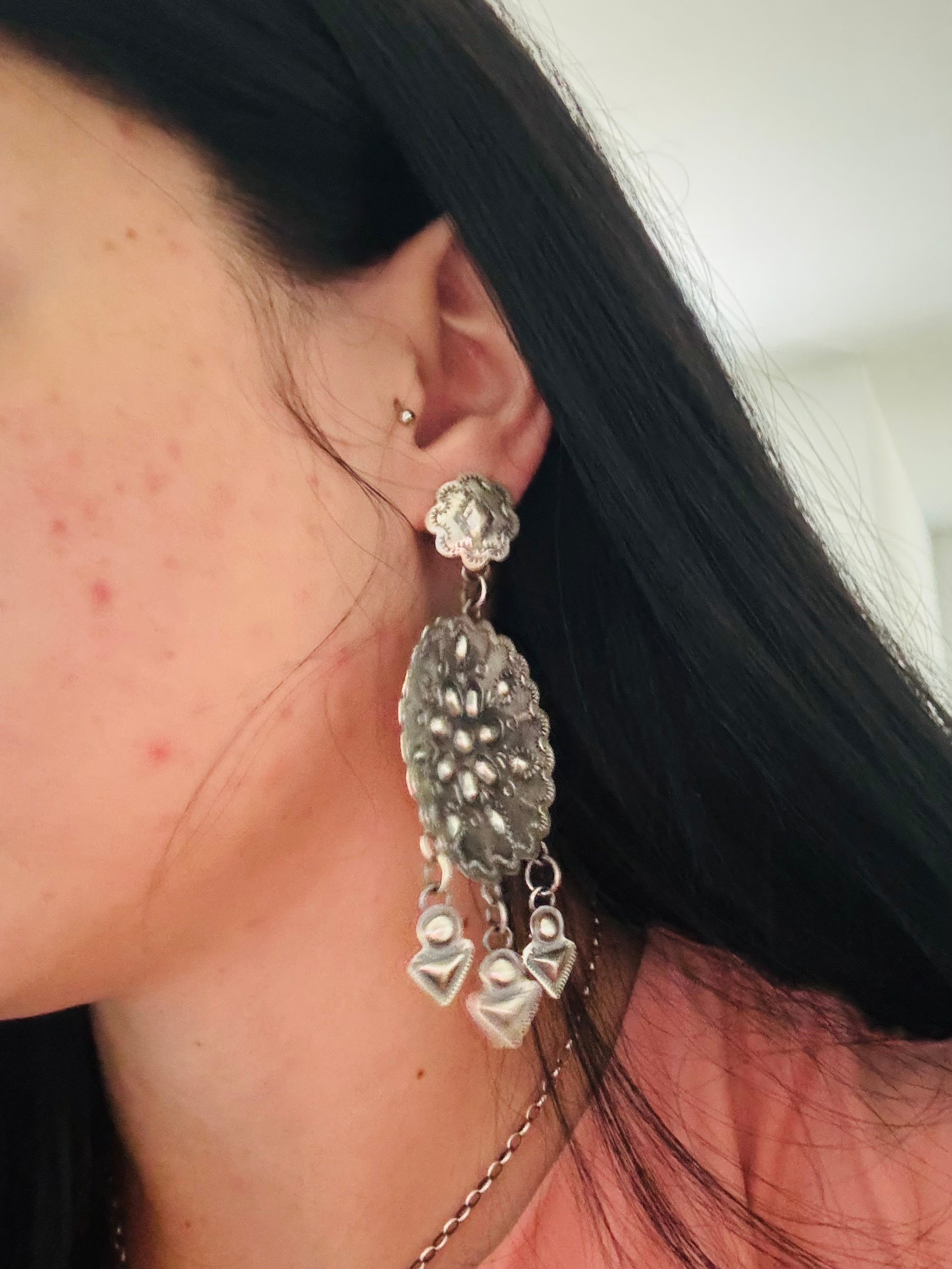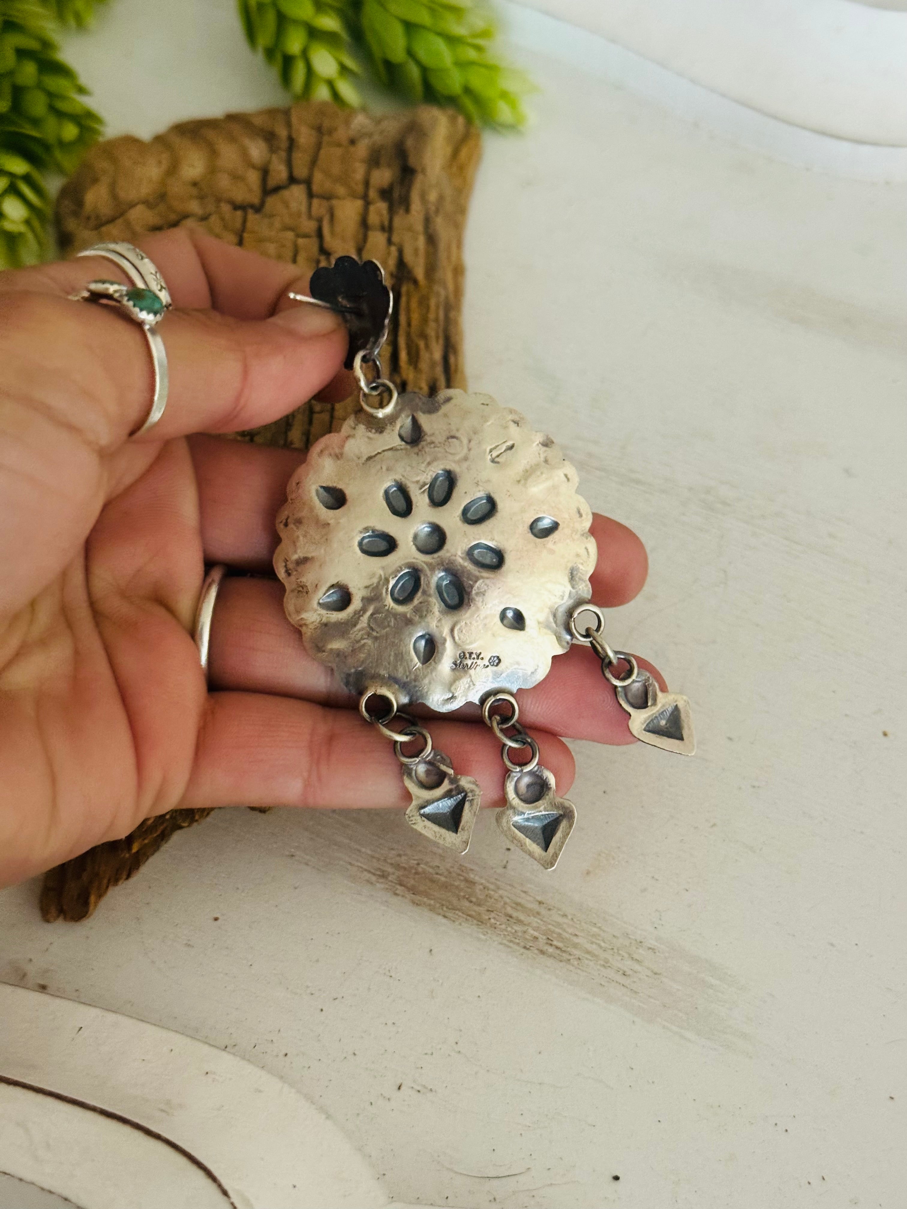 In love with these everyday dangle earrings. Navajo Made & Sterling Silver Post Dangle Concho Earrings. It measures 3 1/2 inches long and 1 3/4 inches wide. Stamped and signed.