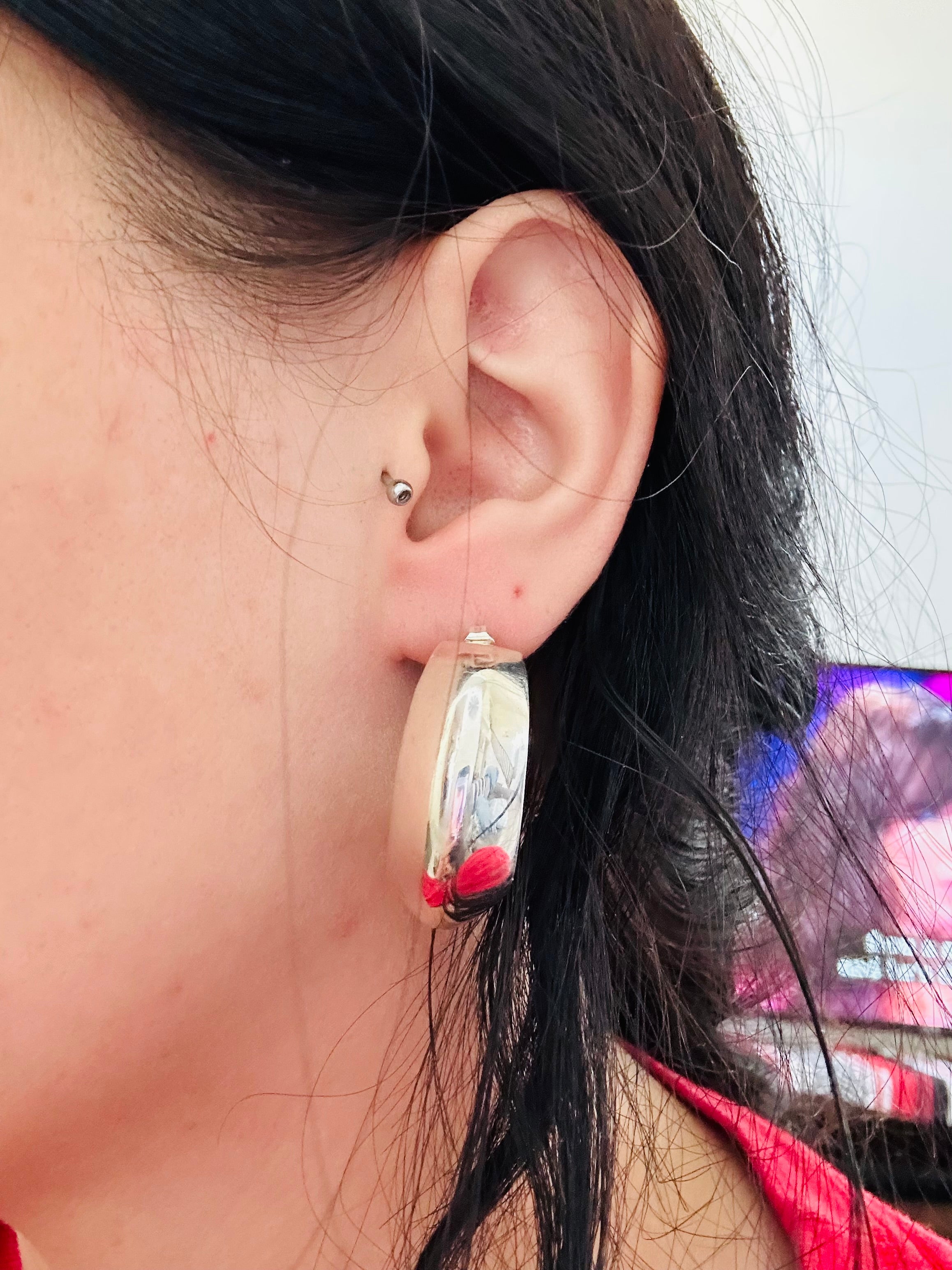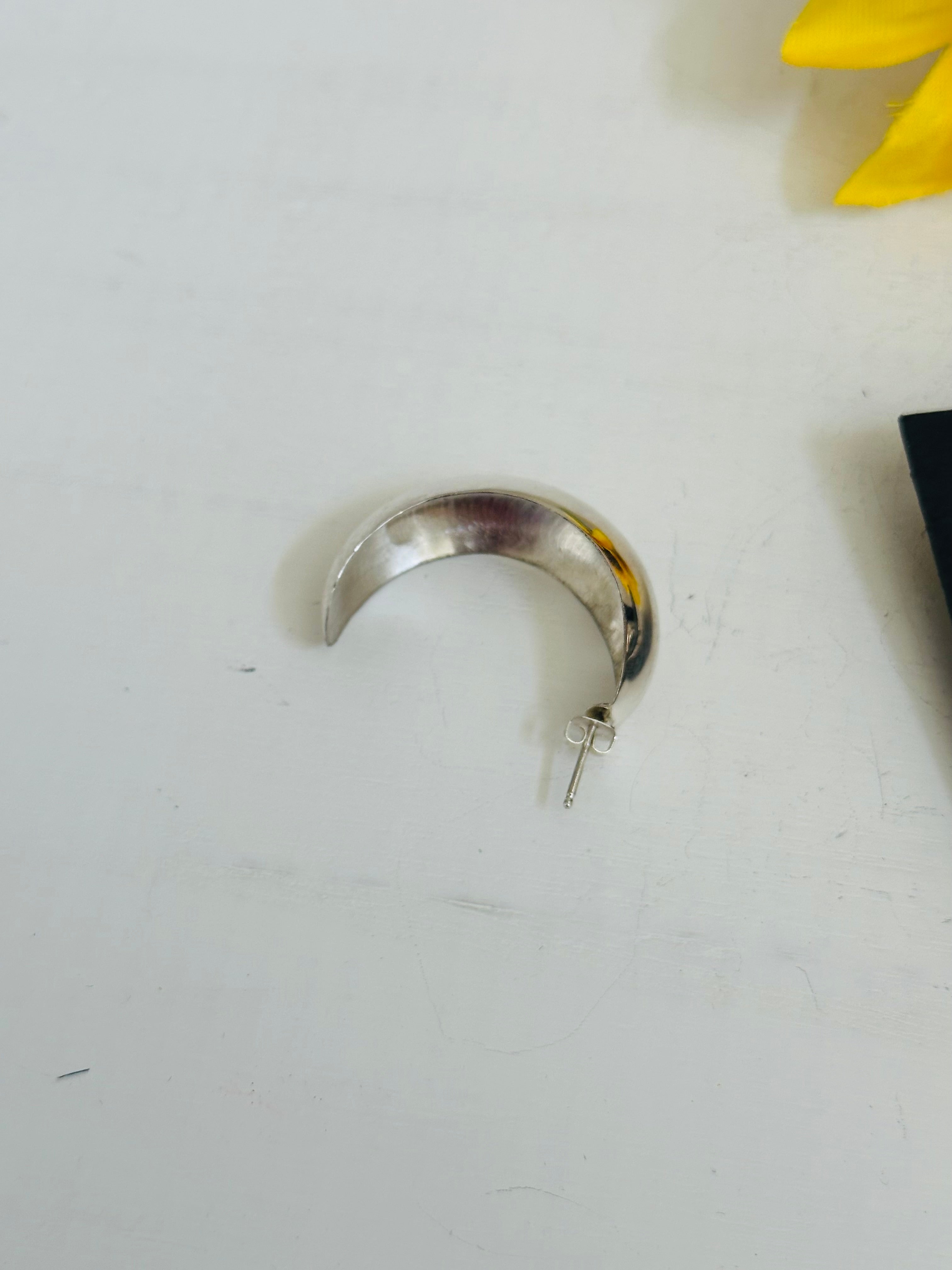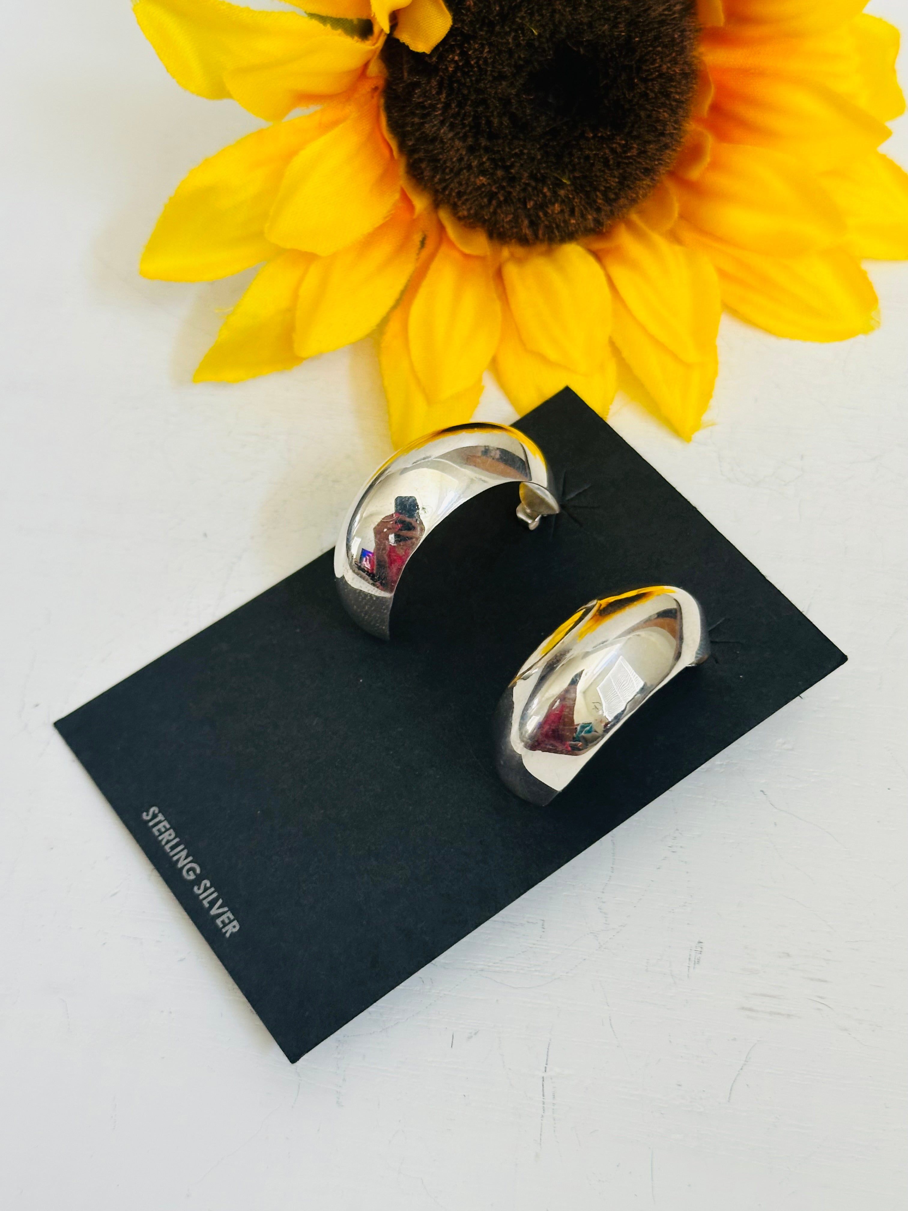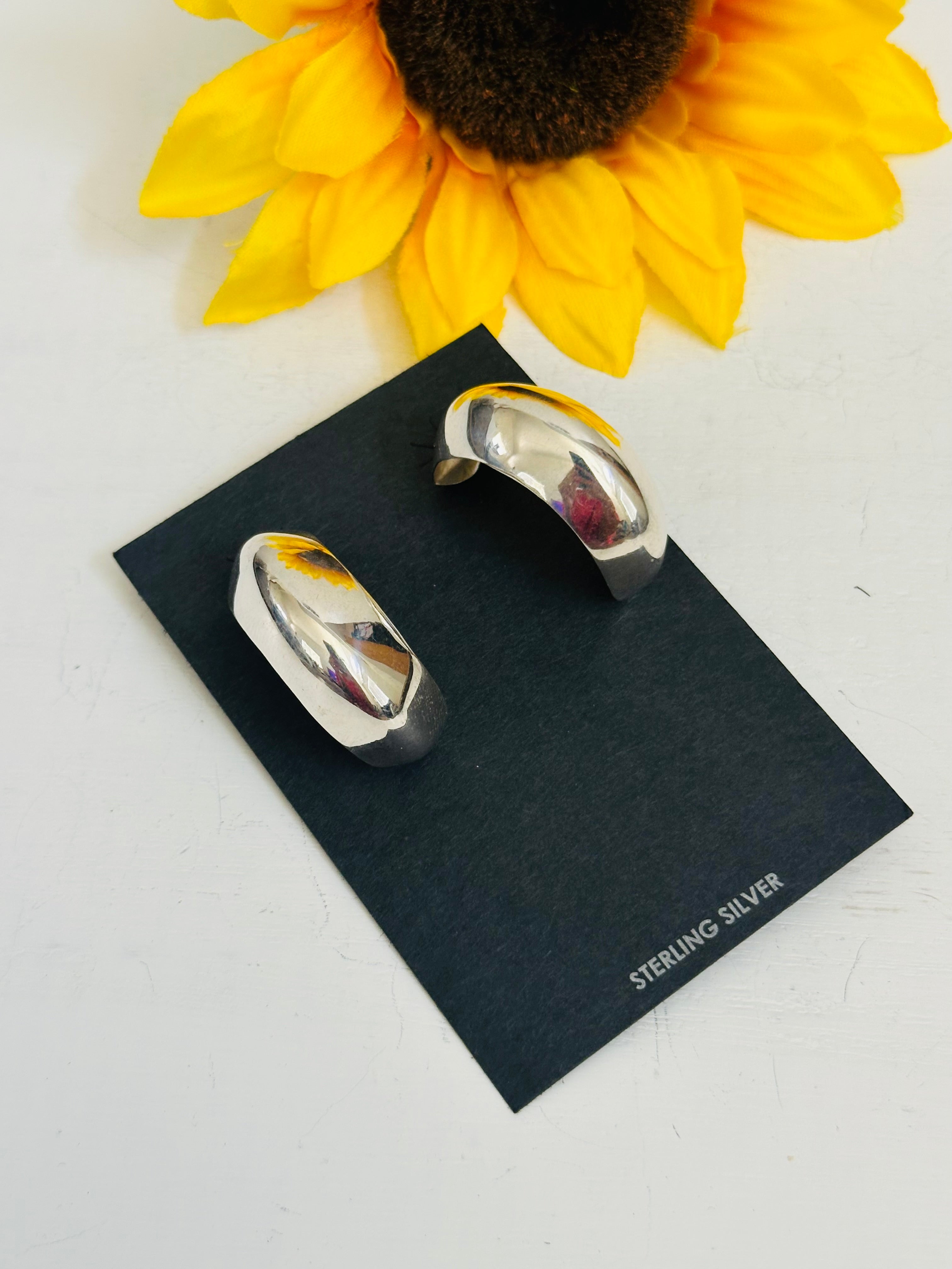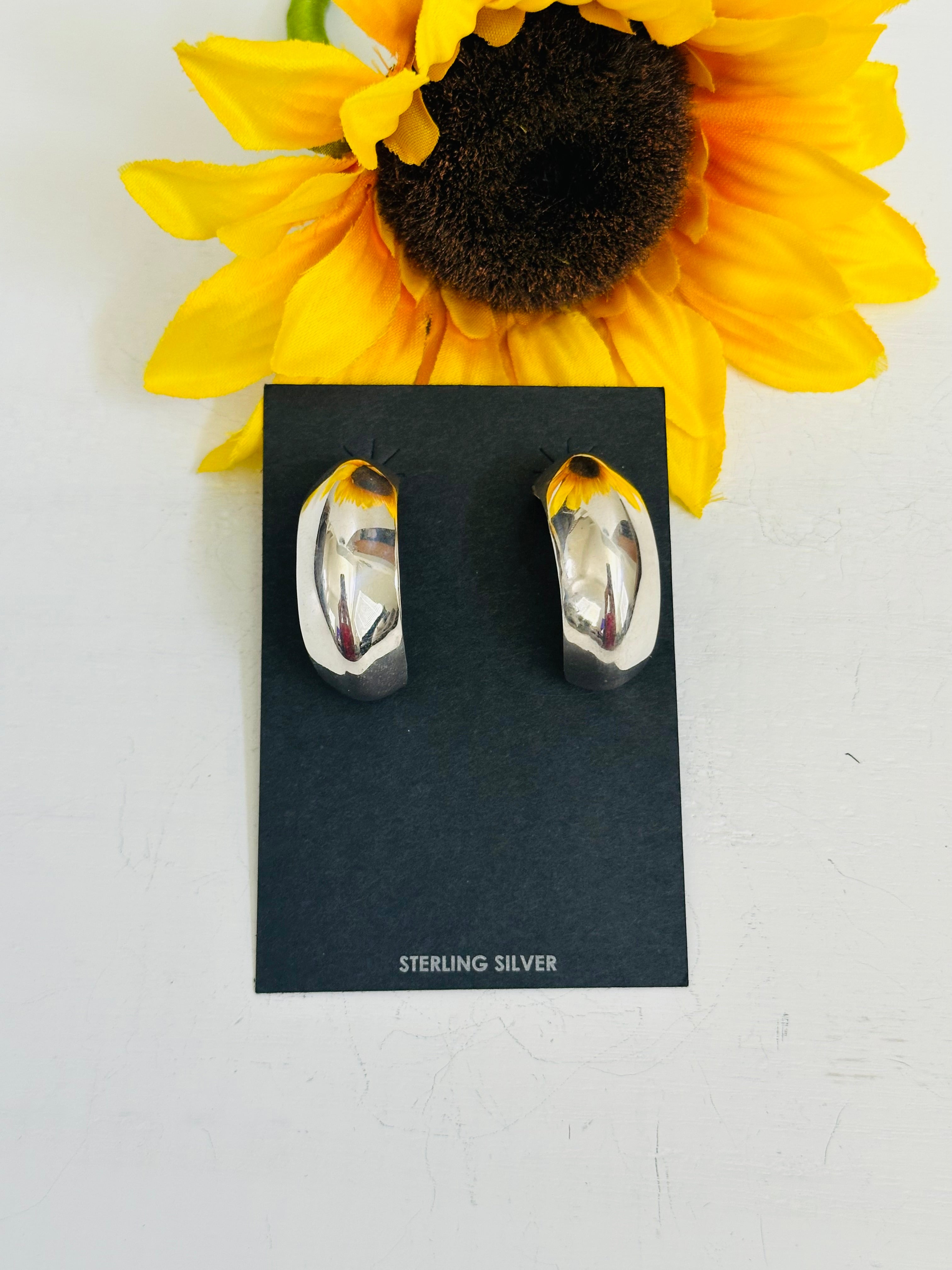 Navajo Made& Sterling Silver Post Hoop Earrings. they measure 1 1/4 inches long and 1/4 of an inch wide. Signed by the artist and stamped sterling silver.