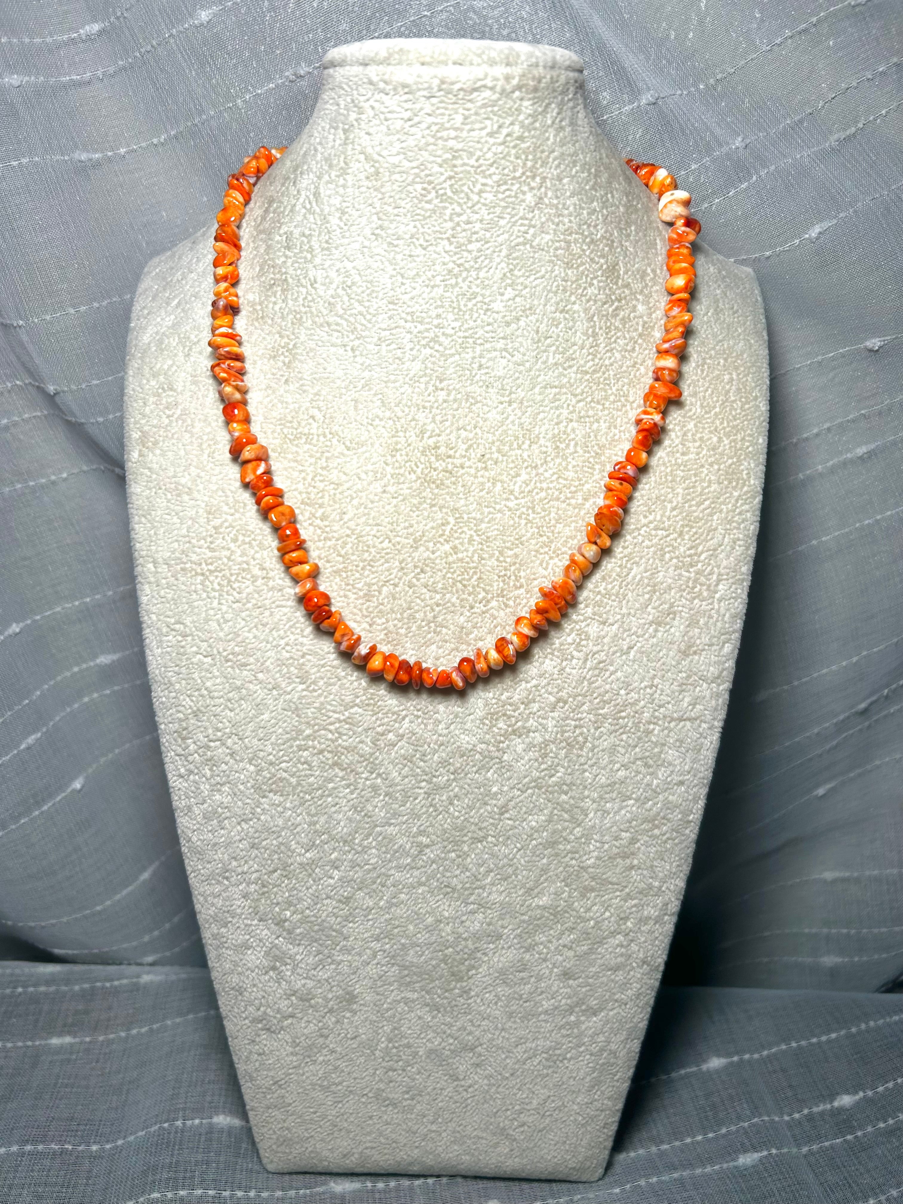 Navajo Made Strung Spiny Oyster & Sterling Silver Necklace. It measures 20 1/2 inches long. Signed by the artist and stamped sterling silver.