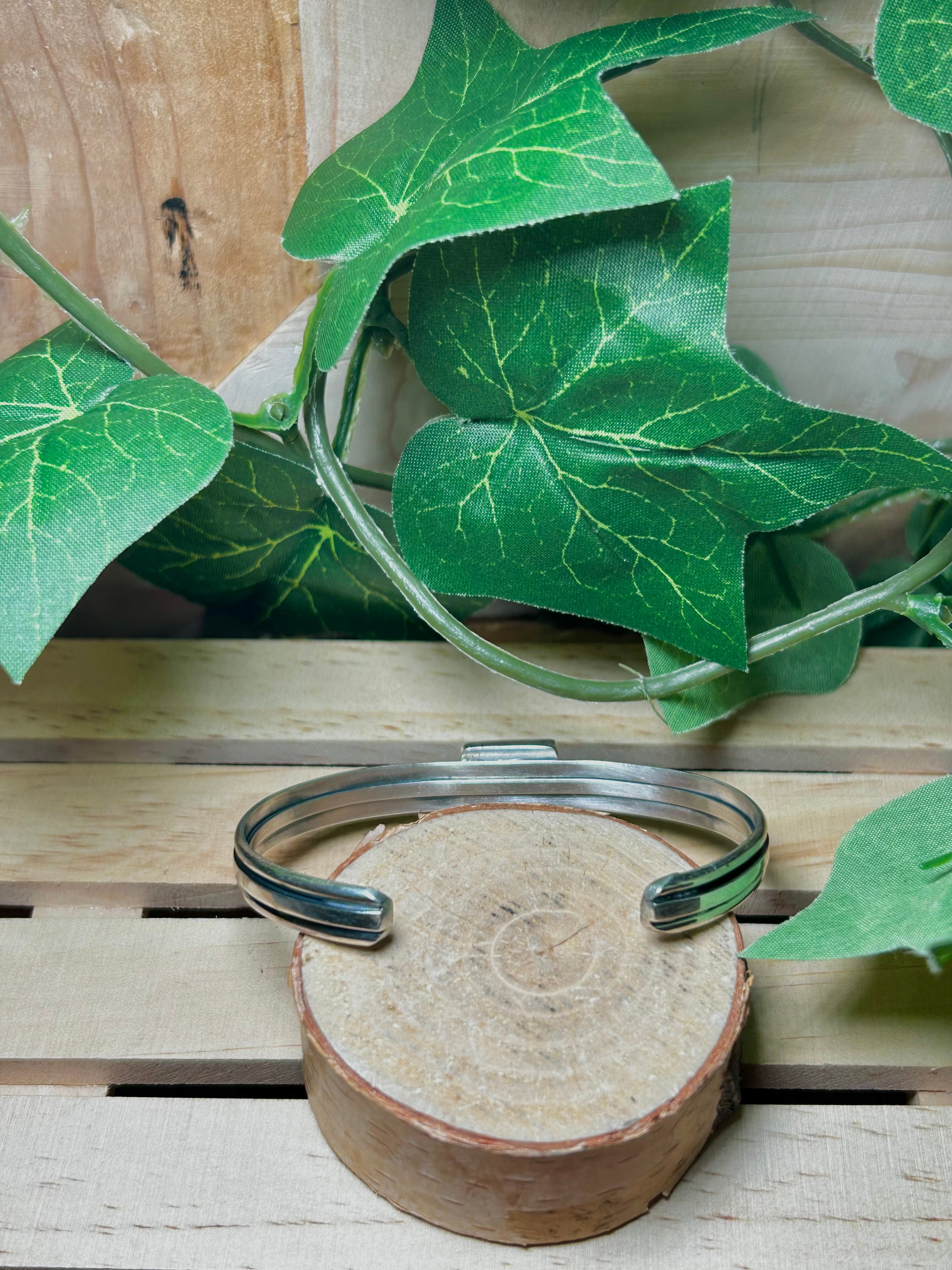 Navajo Made Kingman Turquoise & Sterling Silver Cuff Bracelet. It measures 3/8 of an inch wide with an inside circumference of 5 1/8 inches and a gap of 1 1/4 of an inch. Signed by the artist and stamped sterling silver.