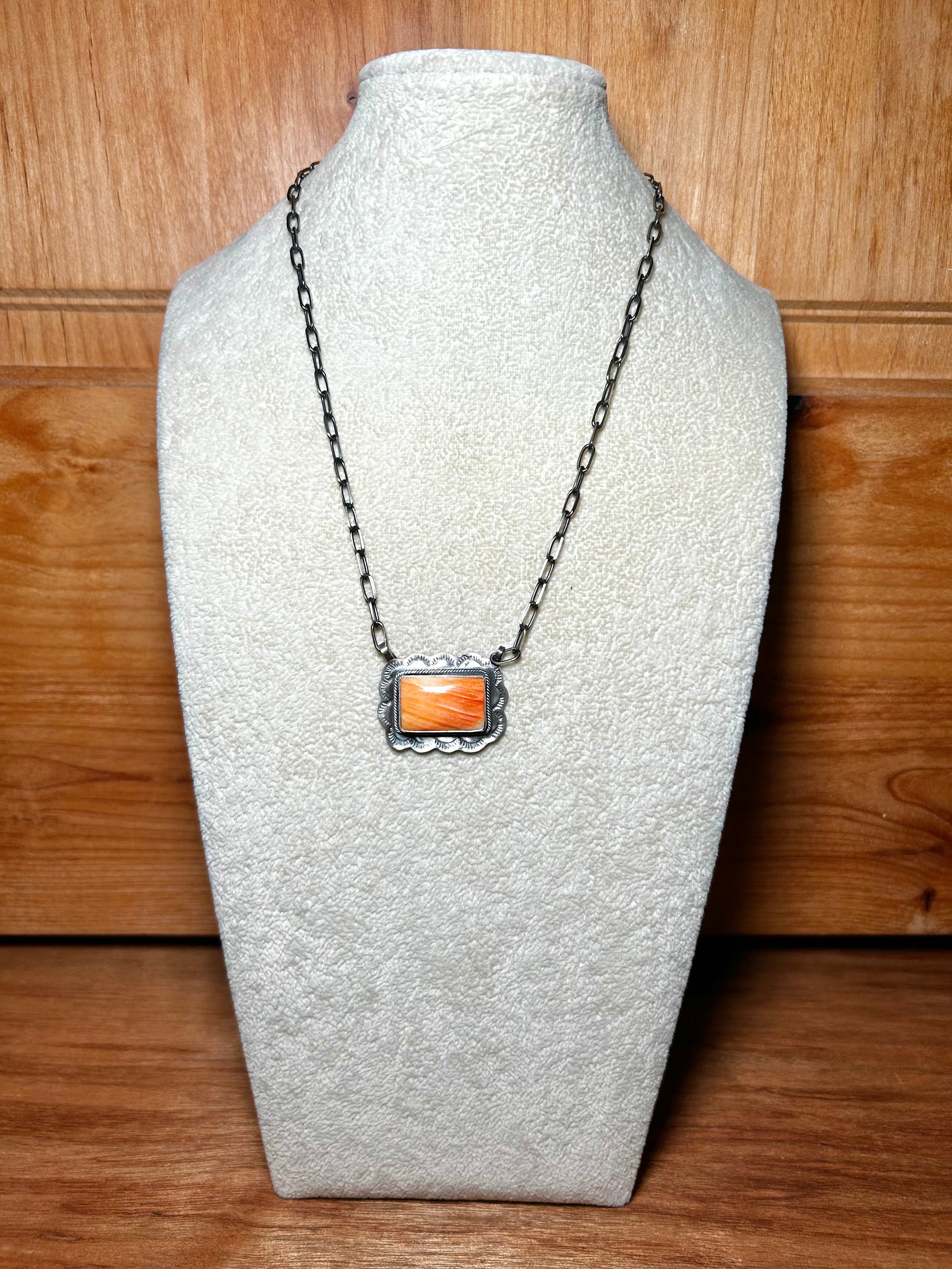 Navajo Made Spiny Oyster & Sterling Silver Necklace. It measures 19 1/2 inches long with hang while the chain measures 17 1/2 inches long. Signed by the artist and stamped sterling silver.
