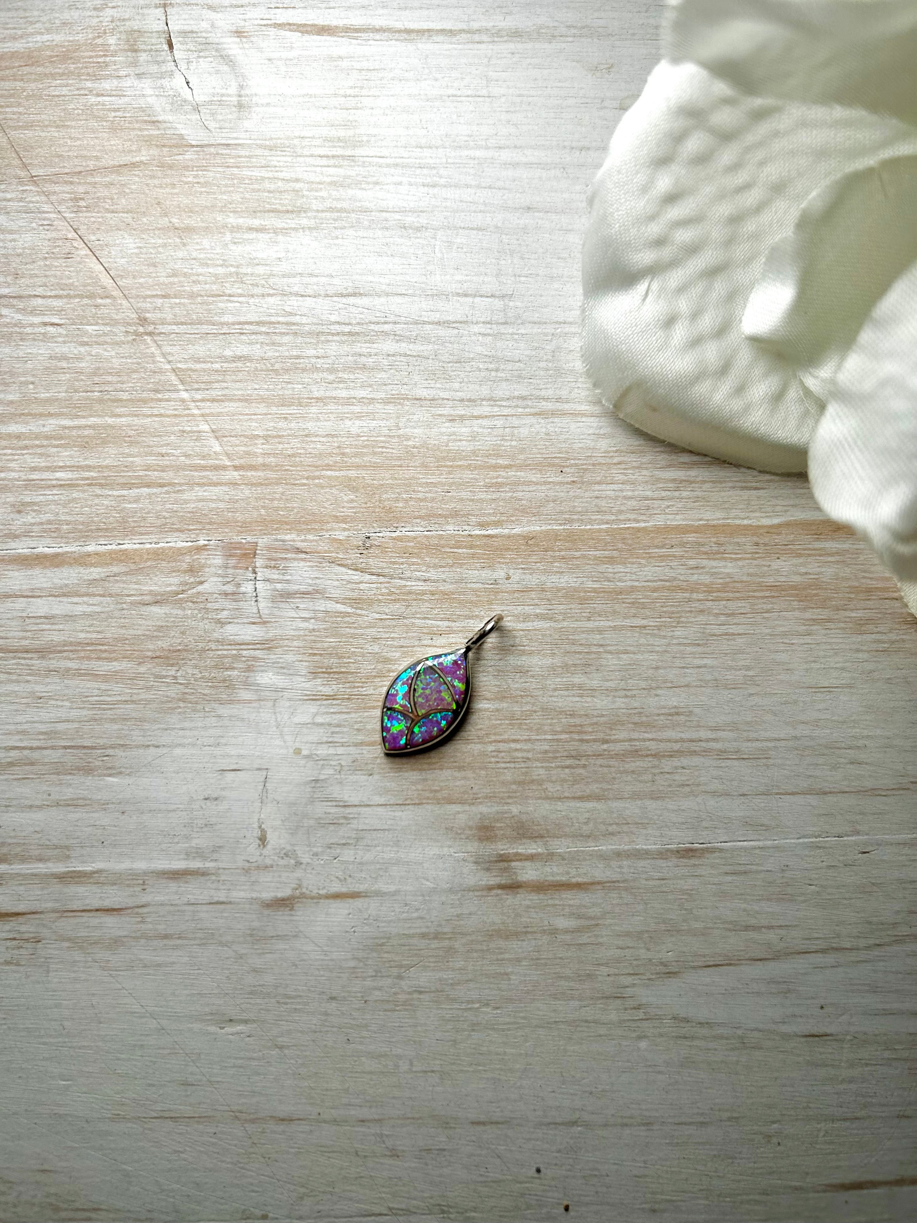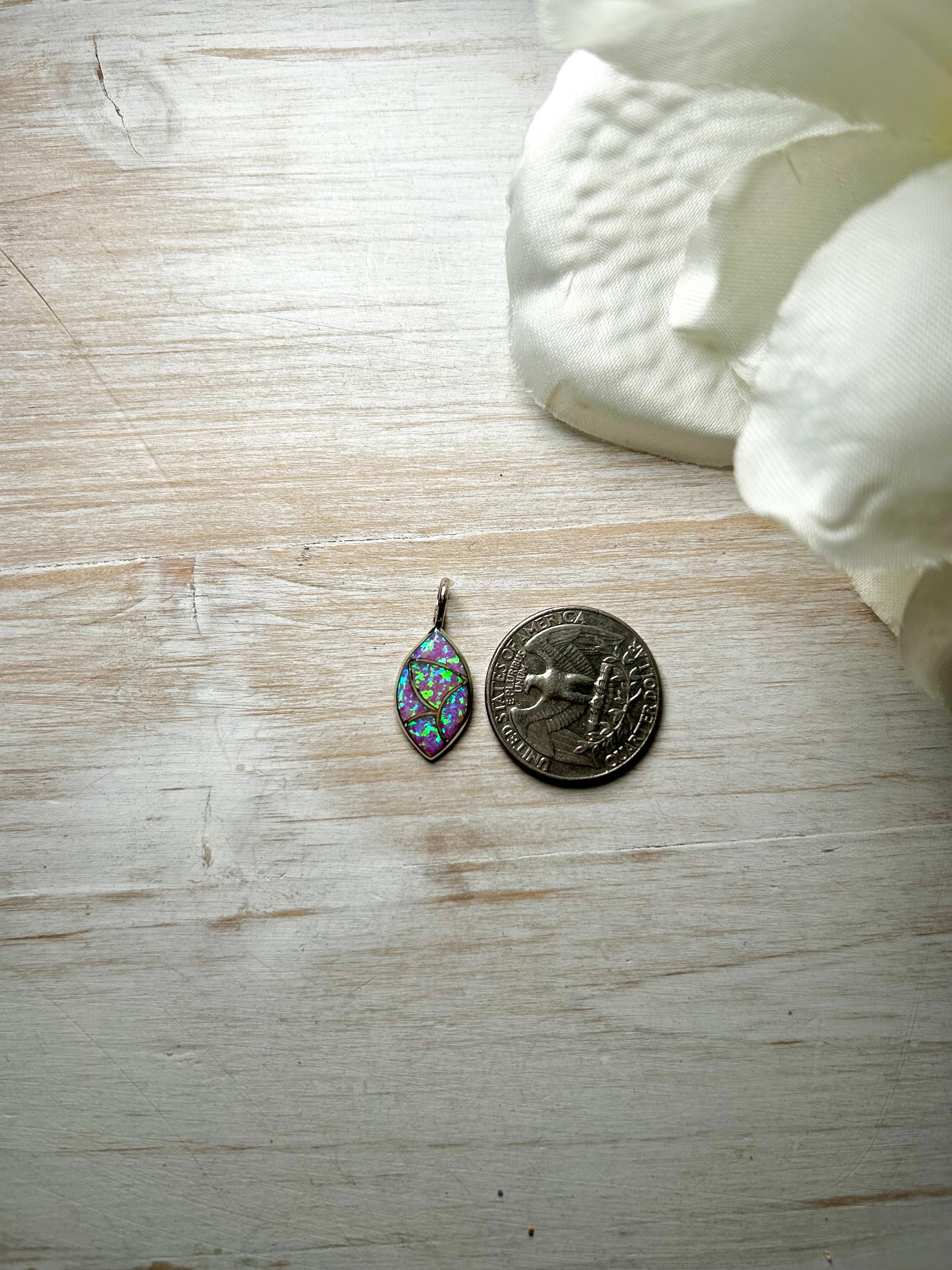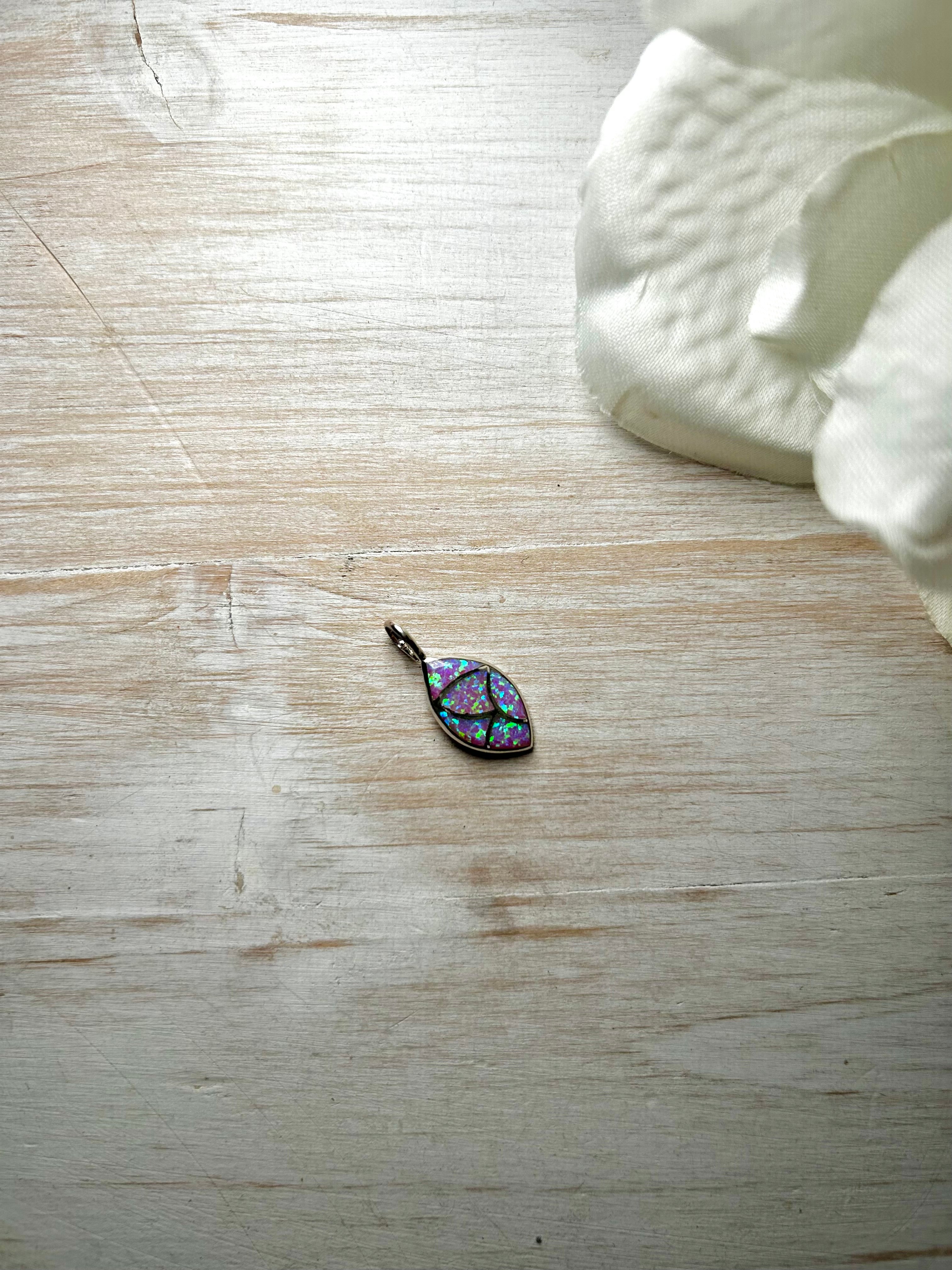 Navajo Man-Made Opal & Sterling Silver Pendant. It measures 1 inch long and 3/8 of an inch wide. Signed by the artist and stamped sterling silver. Pendant only!