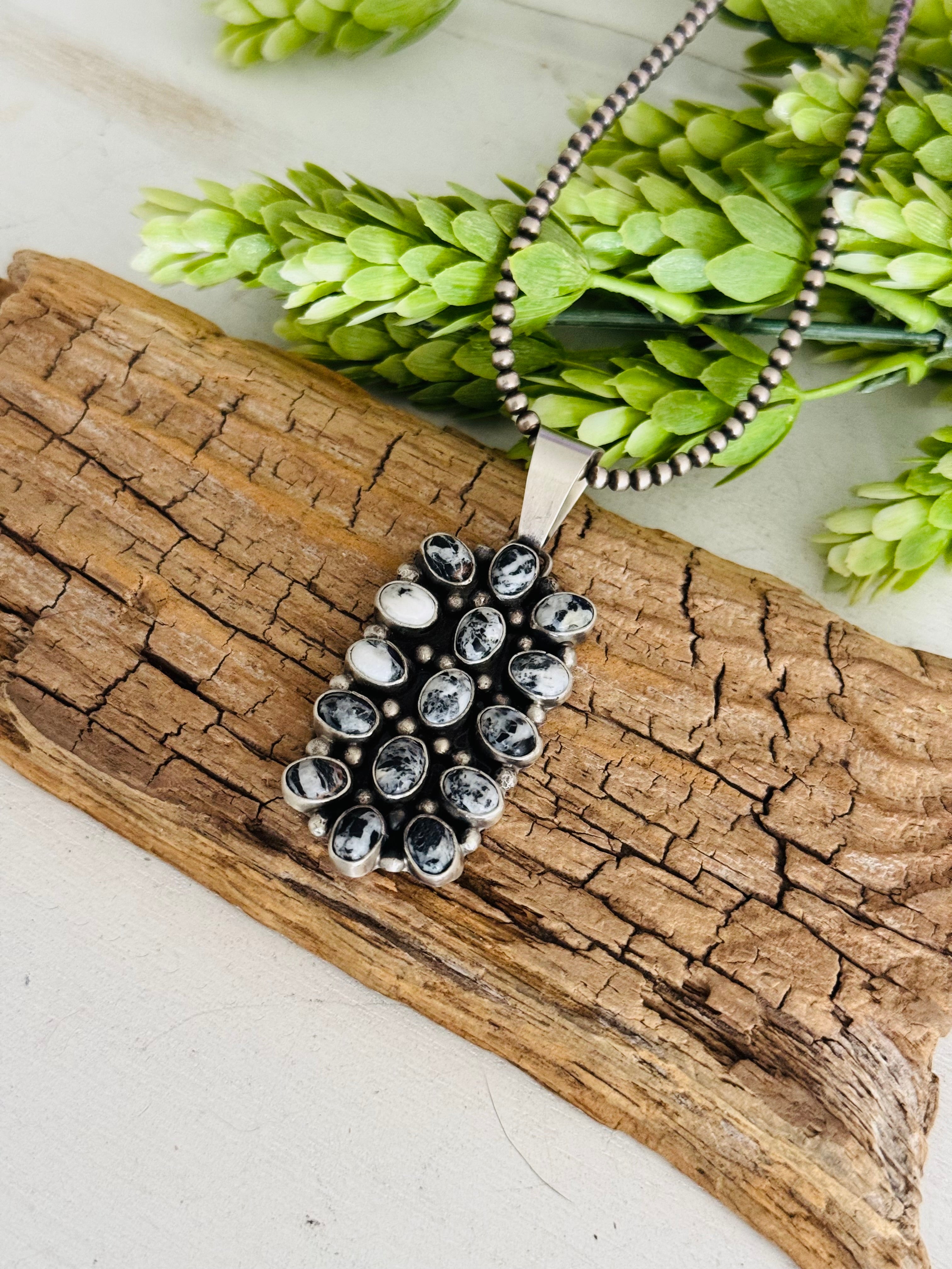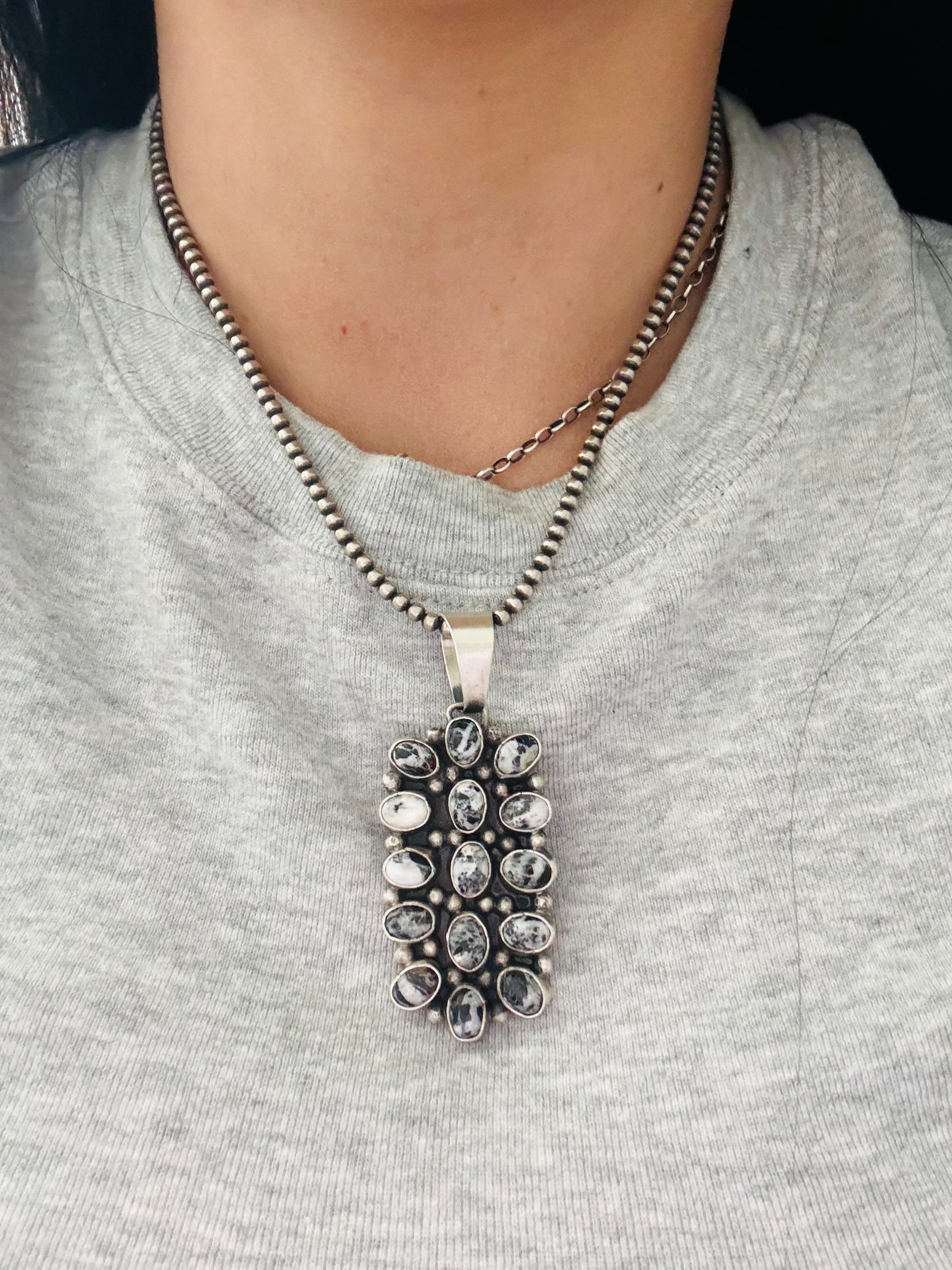 Gorgeous pendant, very well made. Navajo Made White Buffalo & Sterling Silver Cluster Pendant. It measures 2 1/2 inches long and just under 1 inch wide. Pendant Only. Signed by the artist and stamped sterling silver.