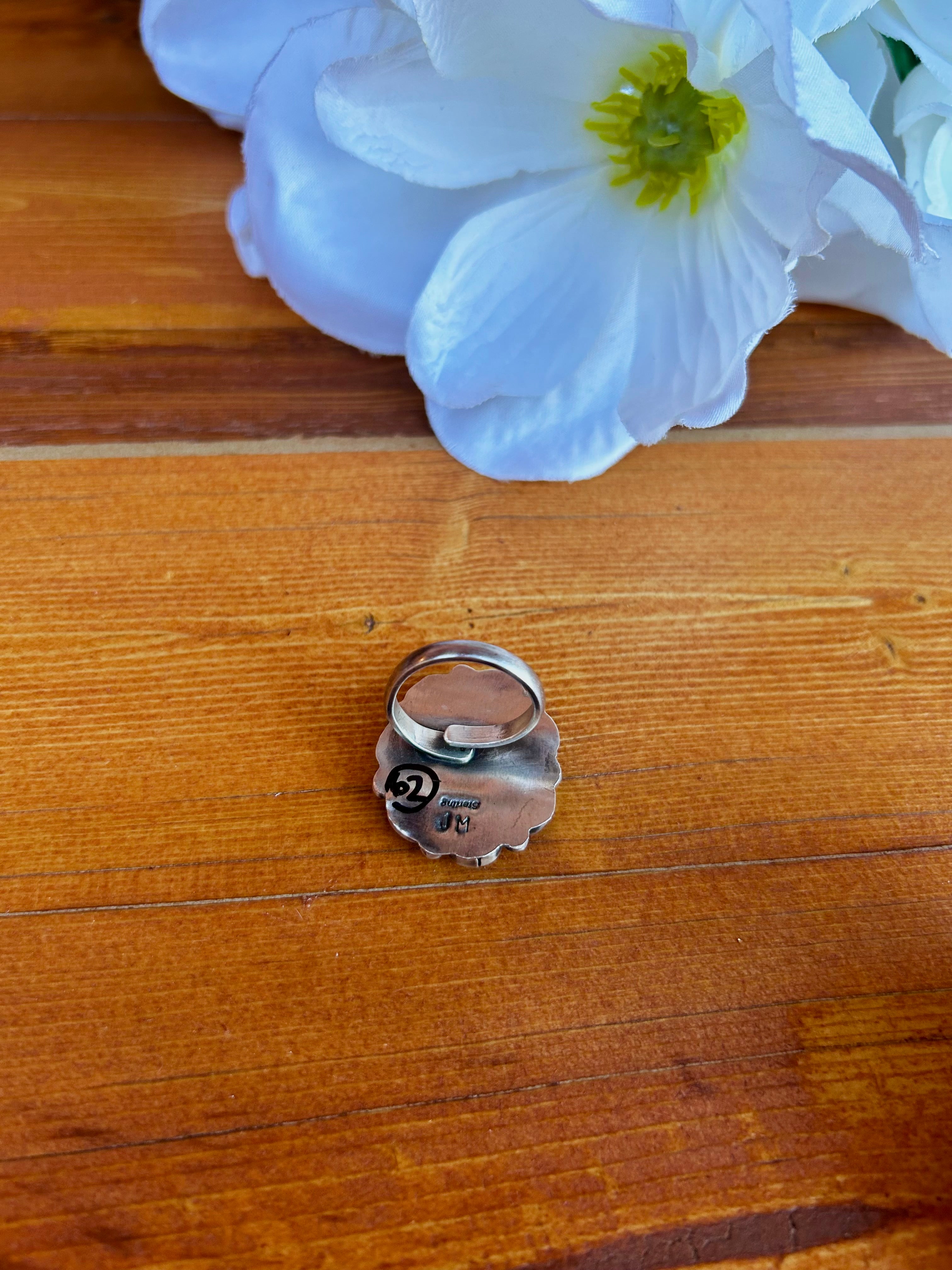 Navajo Made White Buffalo & Sterling Silver Adjustable Ring. It measures 1 1/4 inches long and 1 1/8 inches wide. Signed by the artist and stamped sterling silver. Stones will vary due to natural stones.