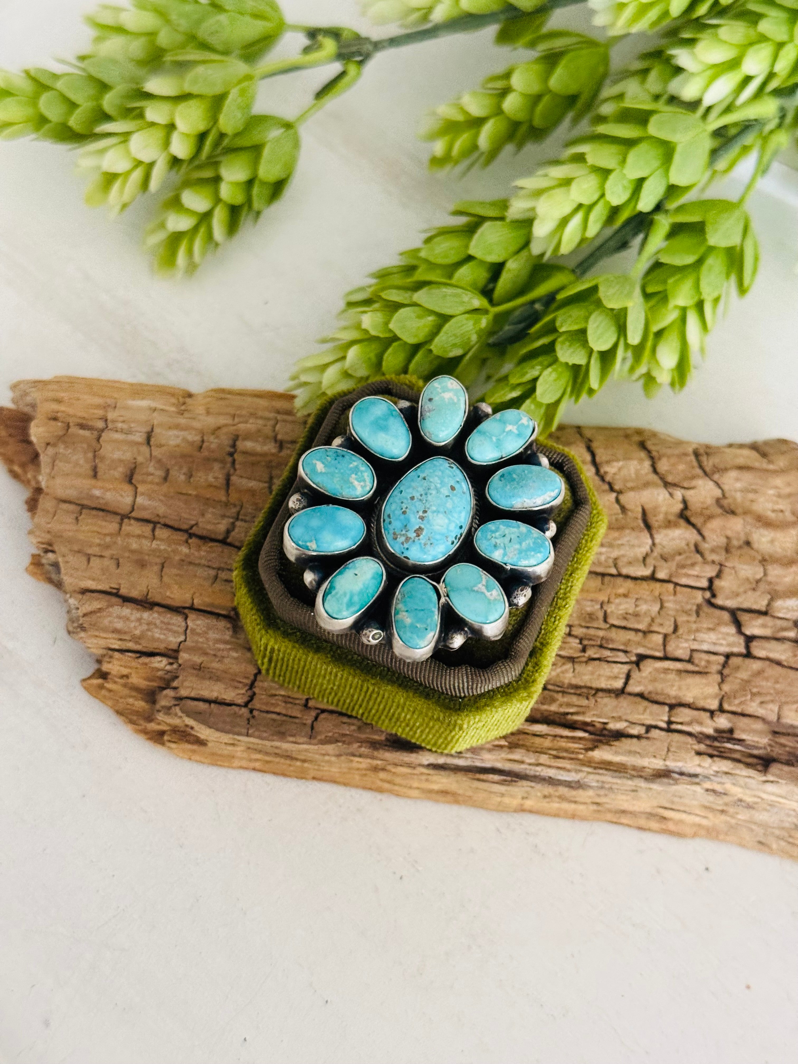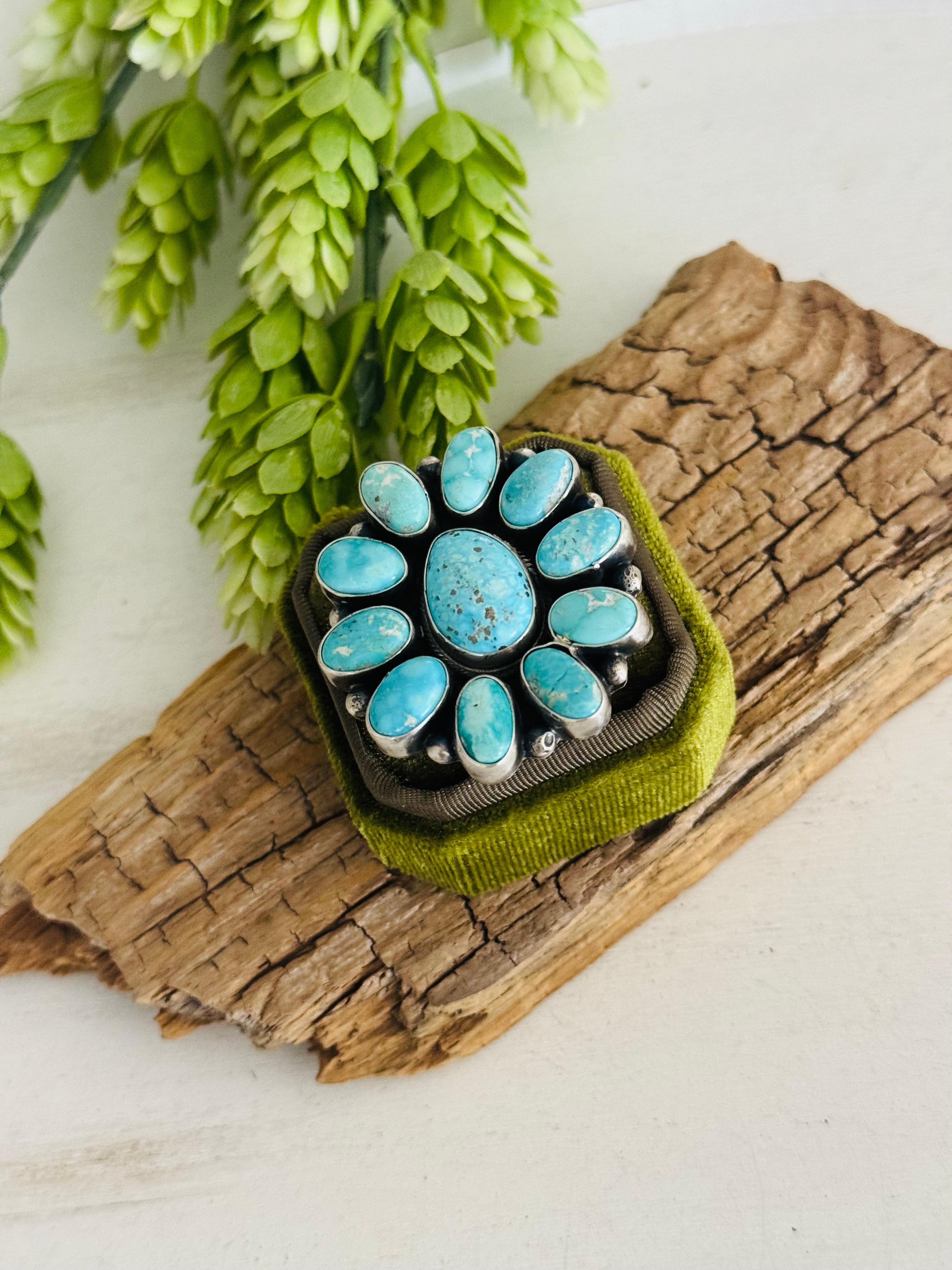 Navajo Made White Water Turquoise & Sterling Silver Cluster Ring Size 8.5