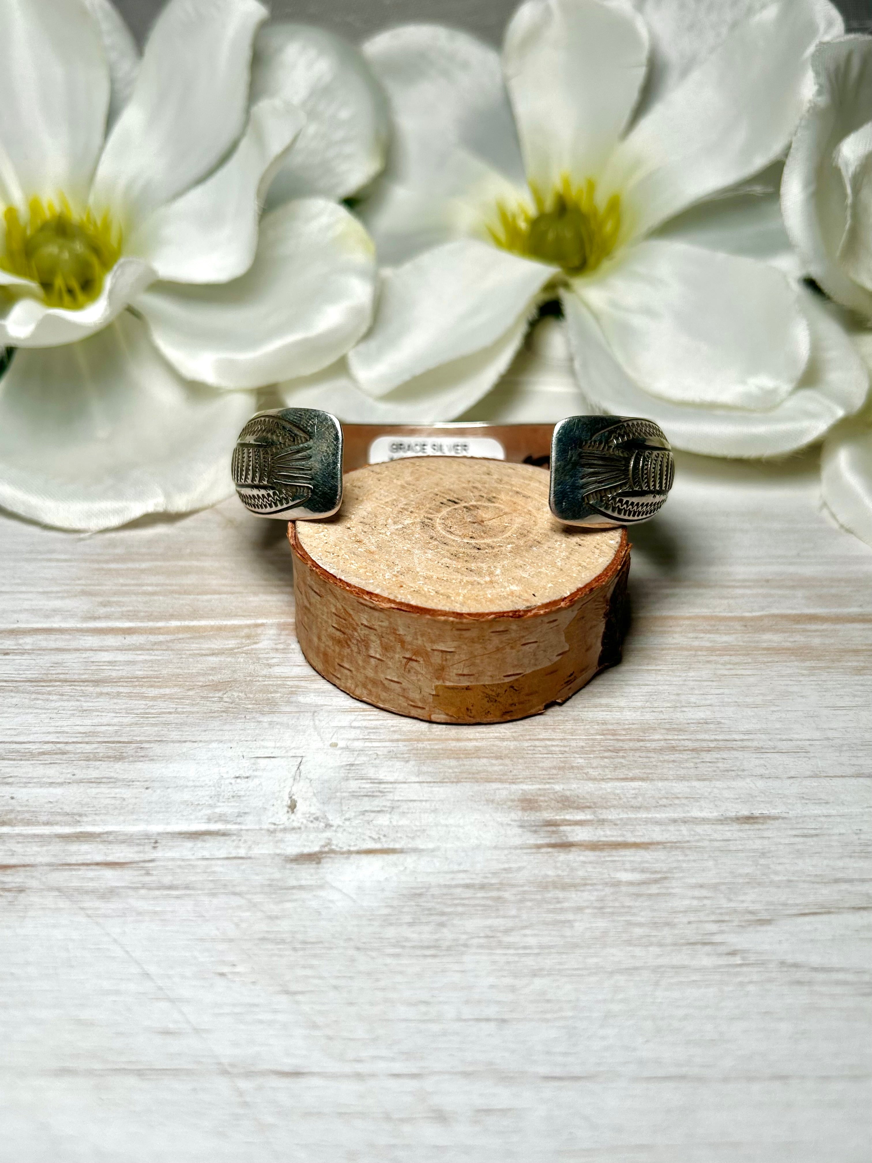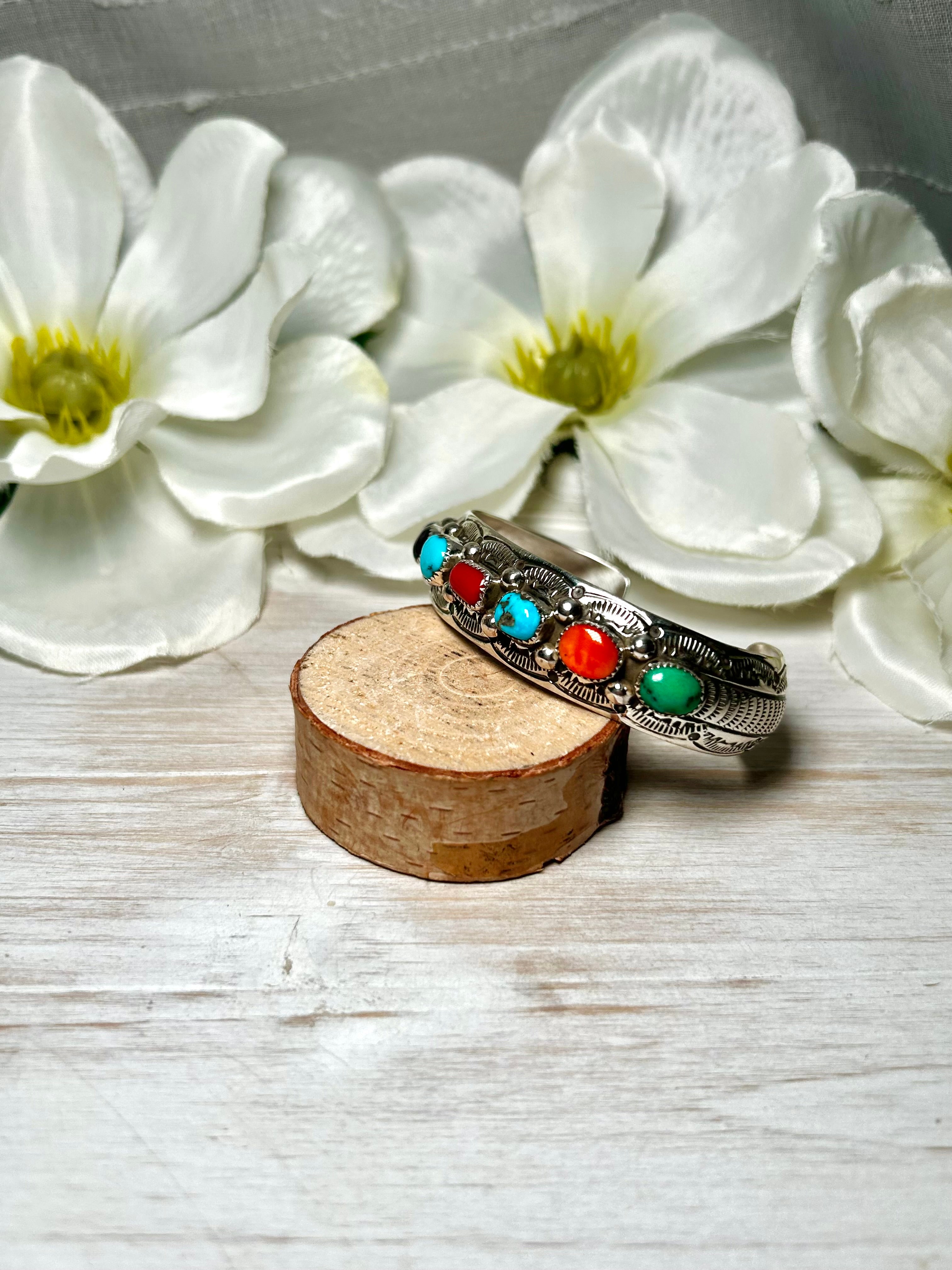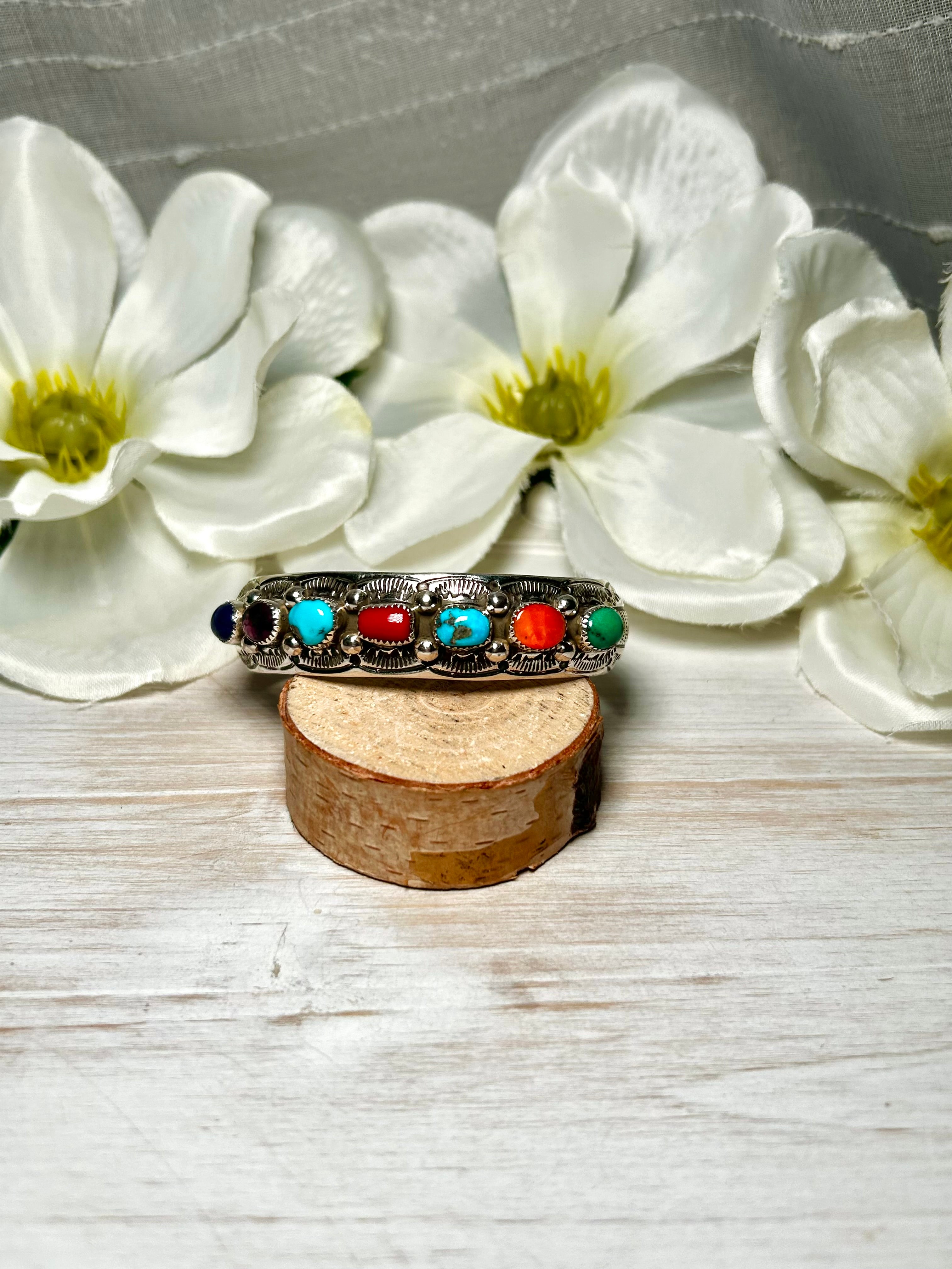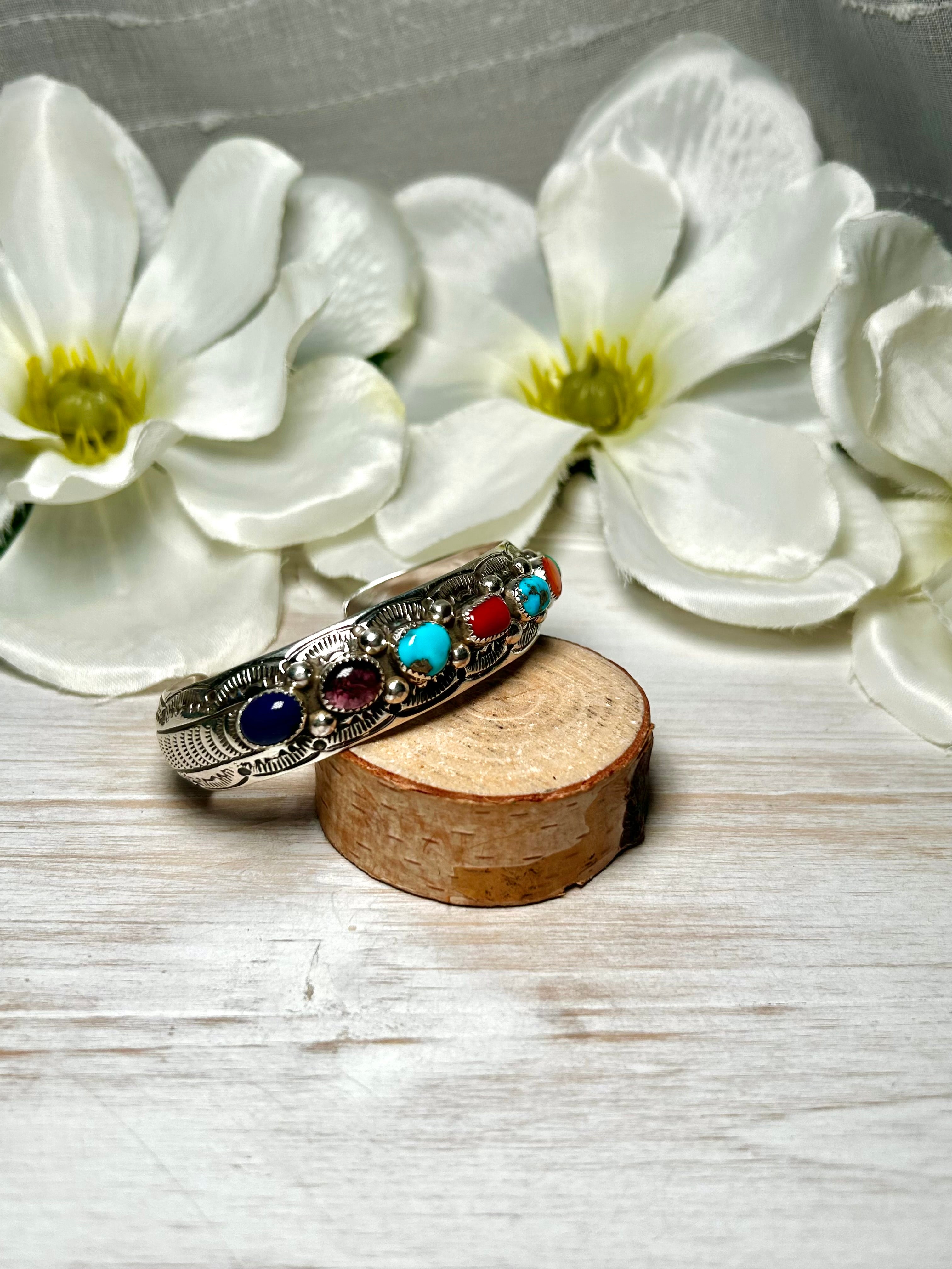 Grace Silver Multi Stone & Sterling Silver Cuff Bracelet. It measures 5/8 of an inch wide with an inside circumference of 5 7/8 inches and a gap of 1 1/8 inches. Signed by the artist and stamped sterling silver.