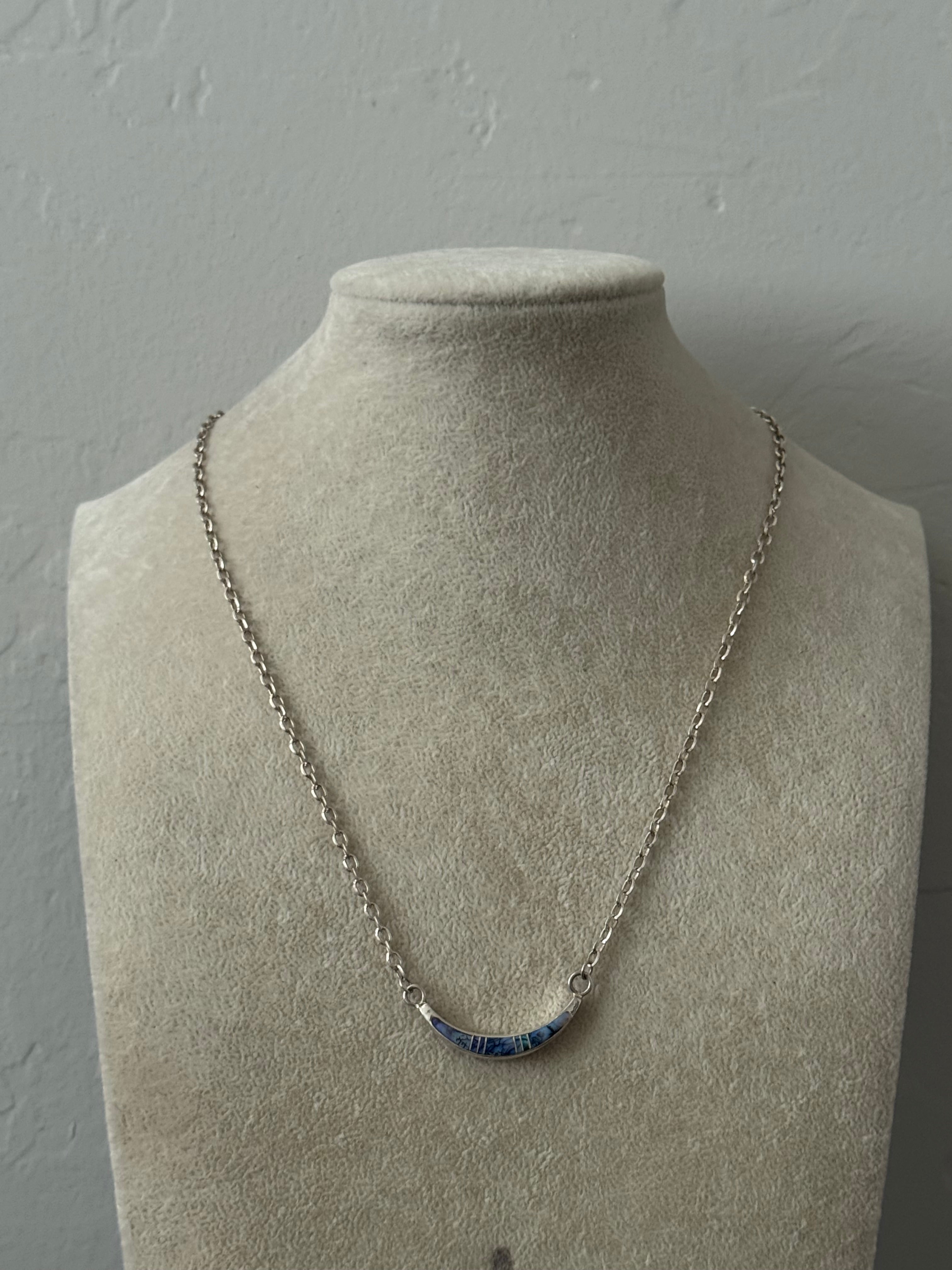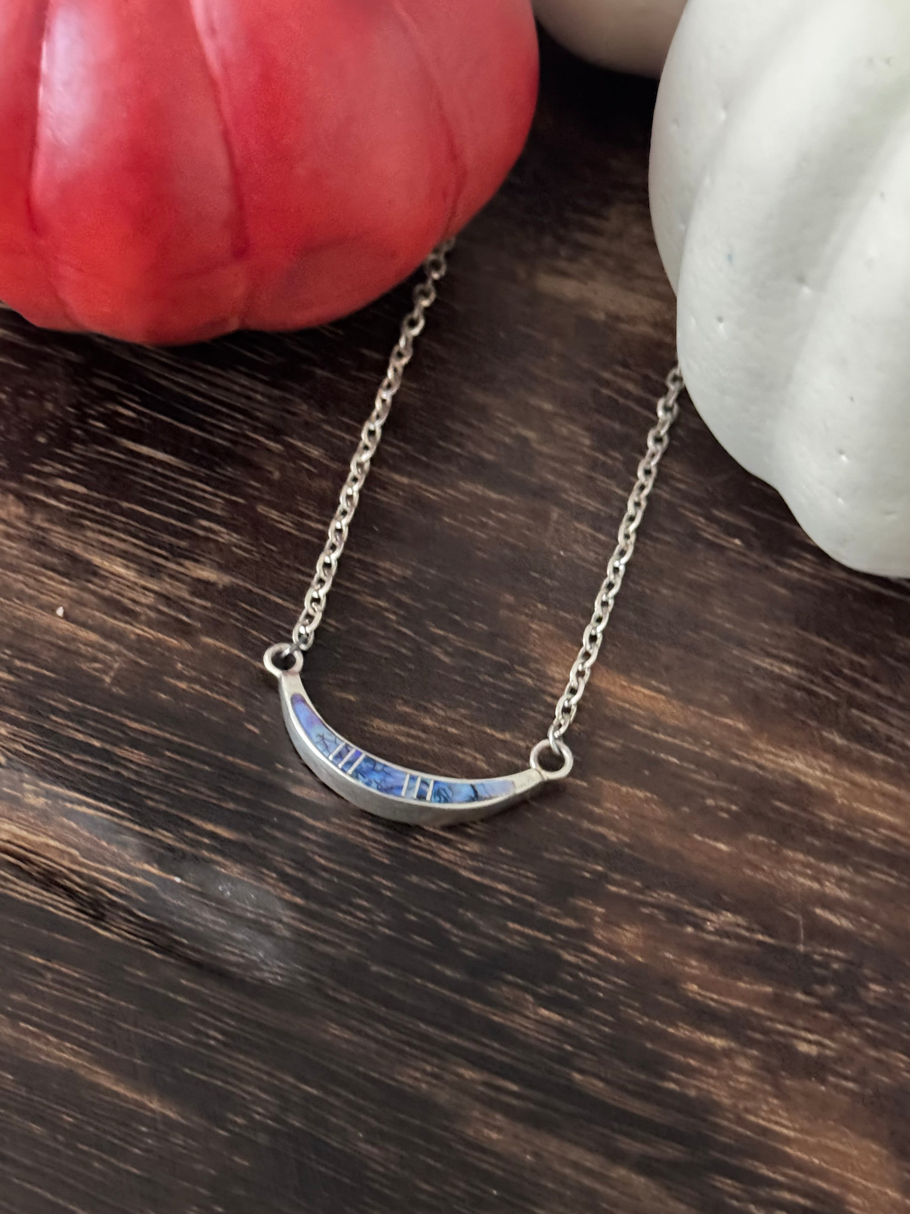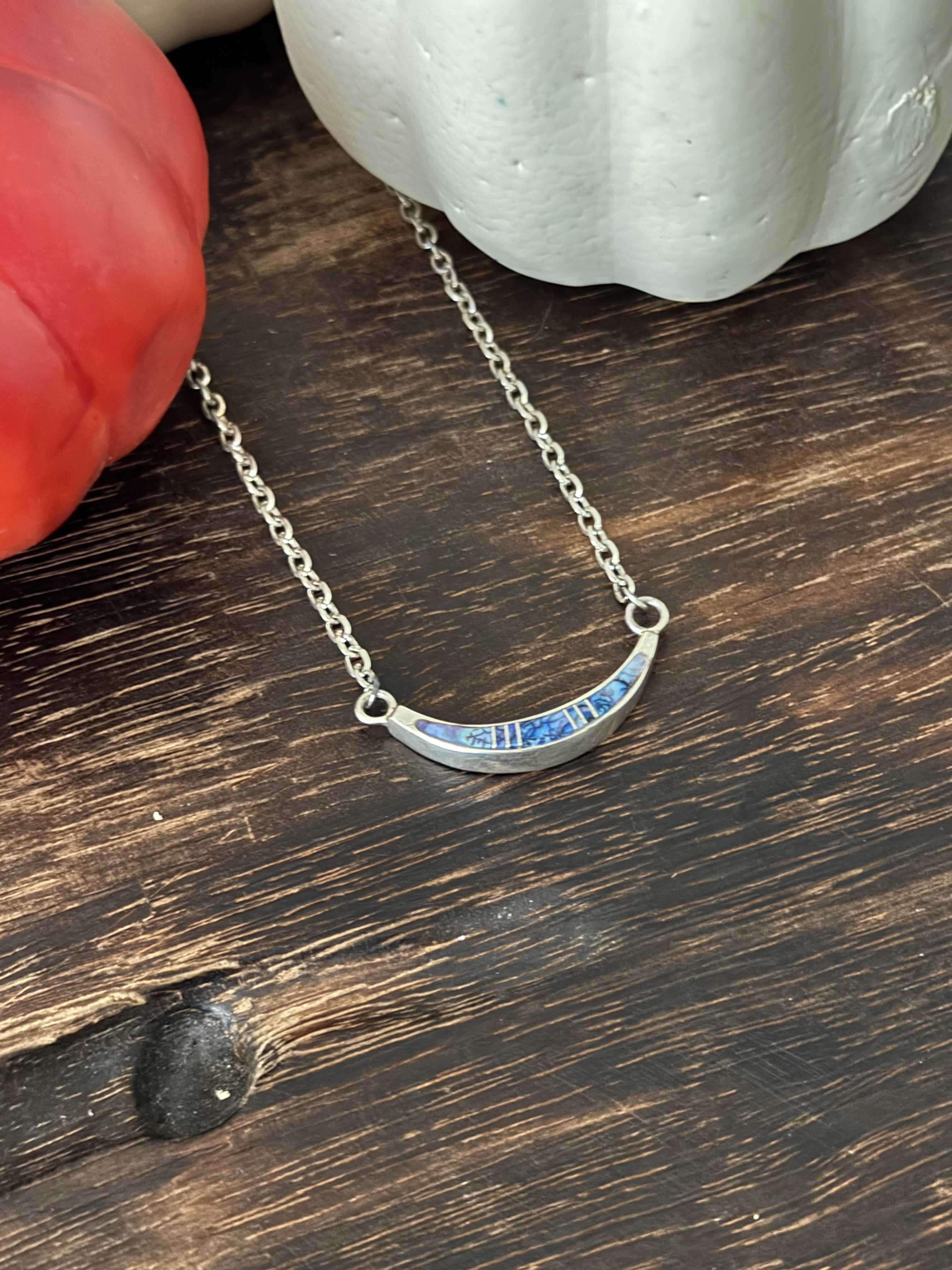 Navajo Opal & Sterling Silver Inlay Necklace. The necklace measures 19 inches long while the custom itself measures 18 inches long. Signed by the artist and stamped sterling silver.