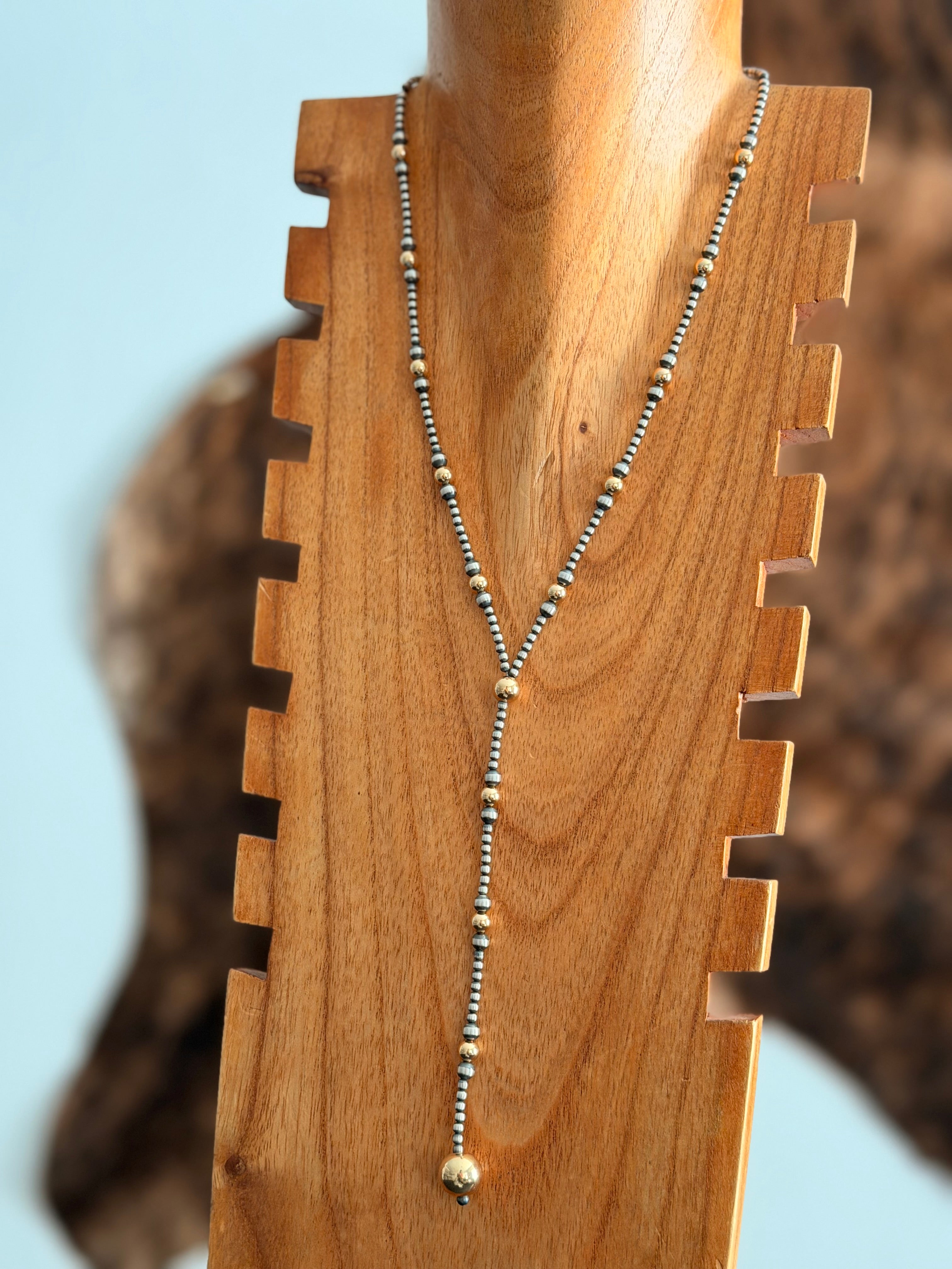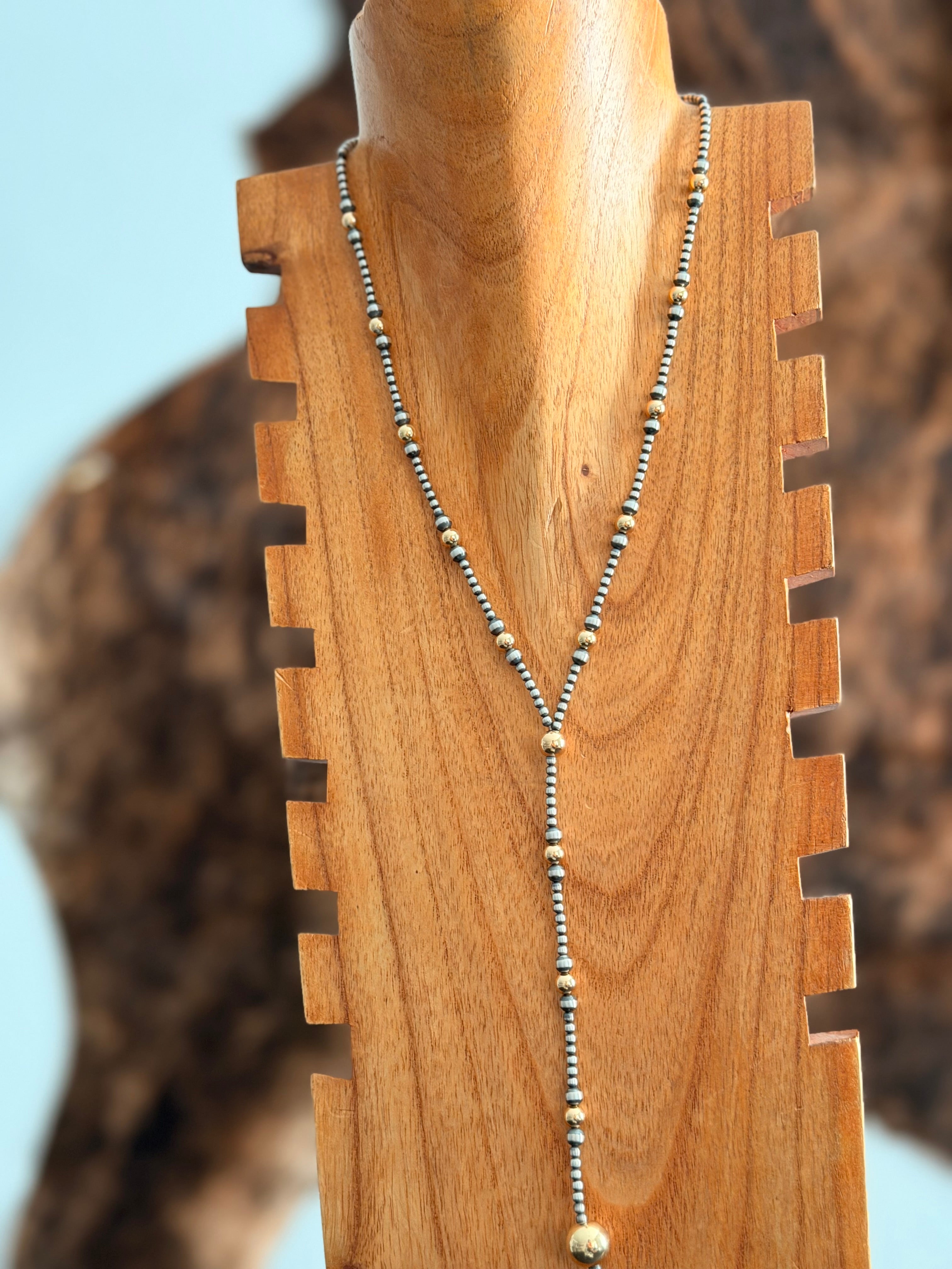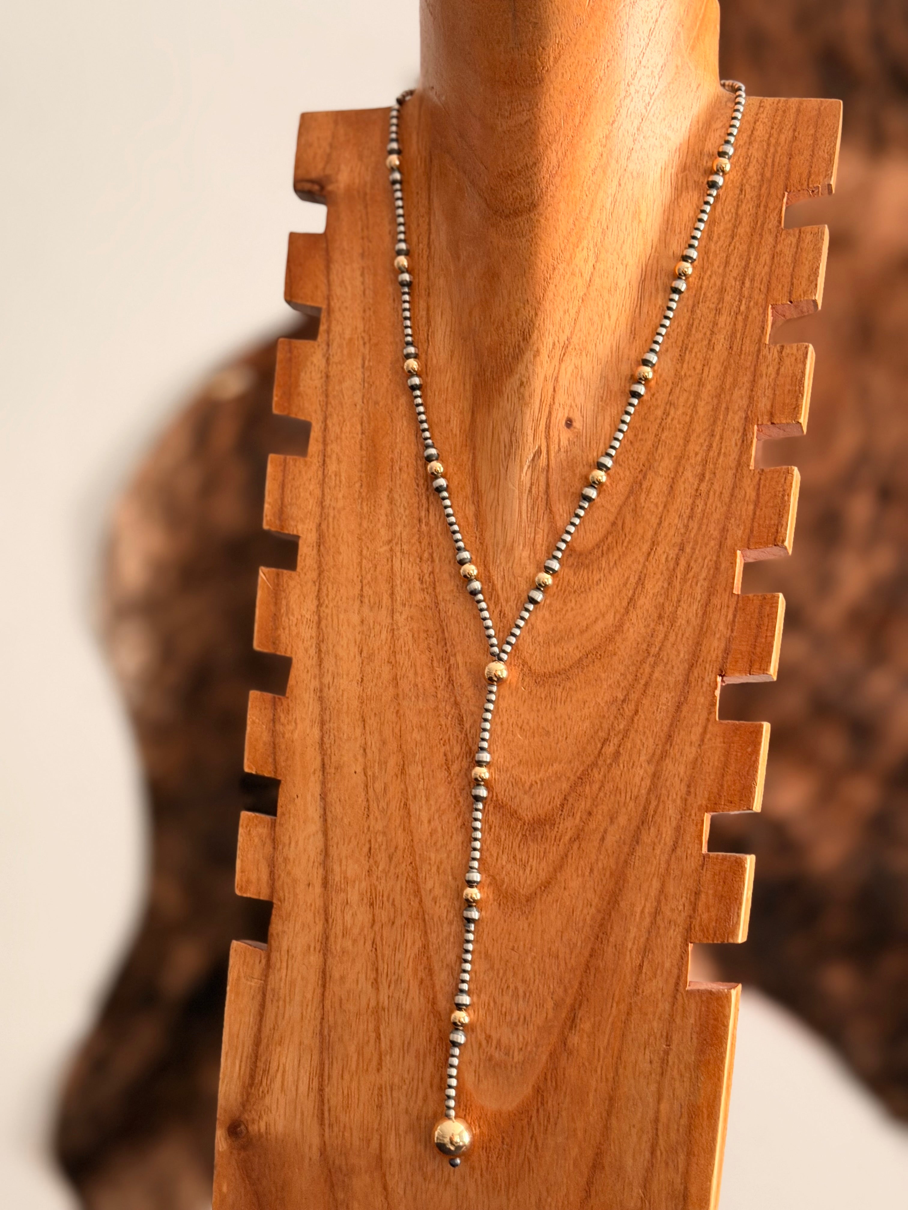 Navajo Strung 14 K Gold Plated Sterling Silver Graduated Beaded Pearl Lariat Necklace. It measures 20 inches long.