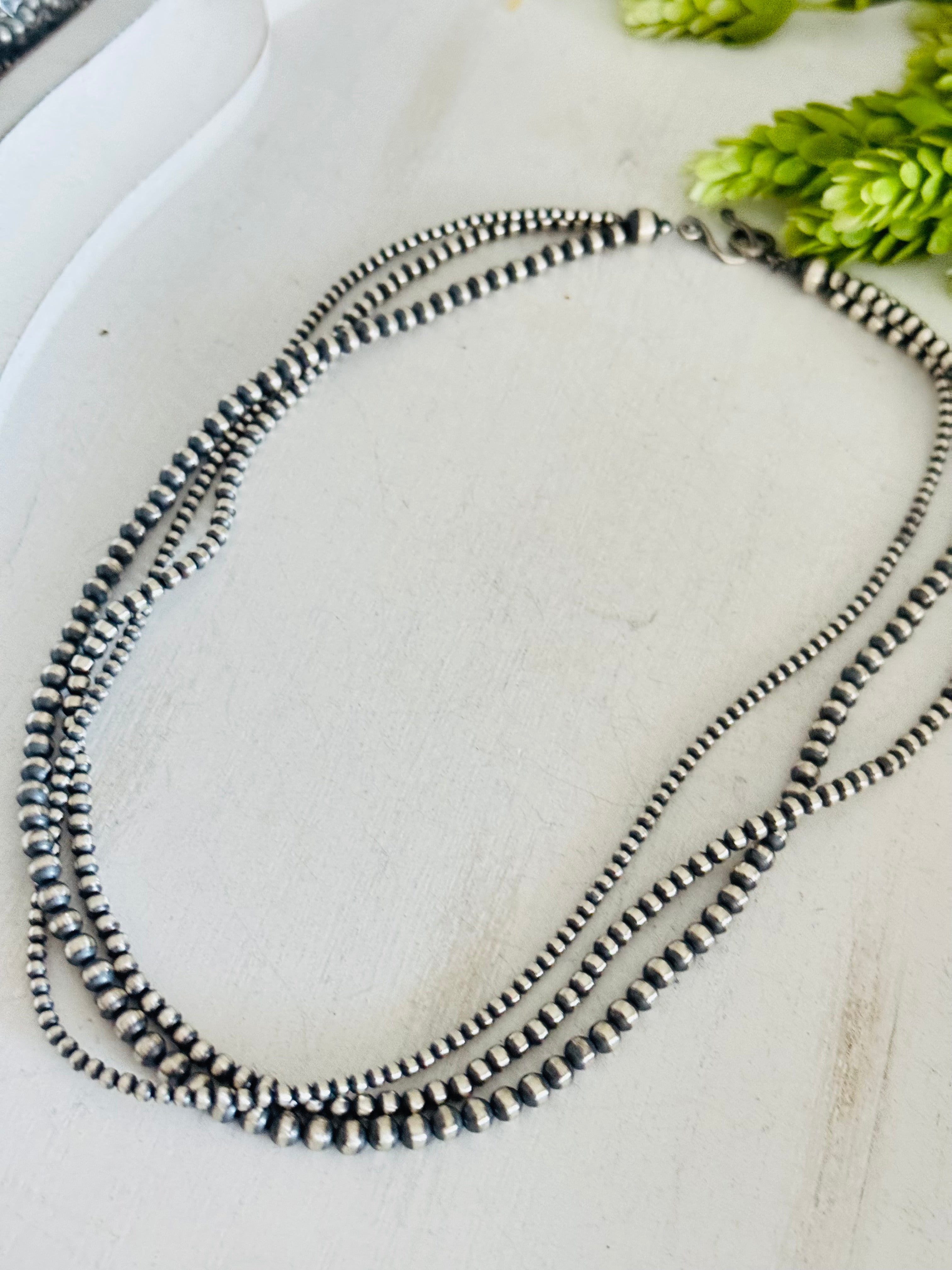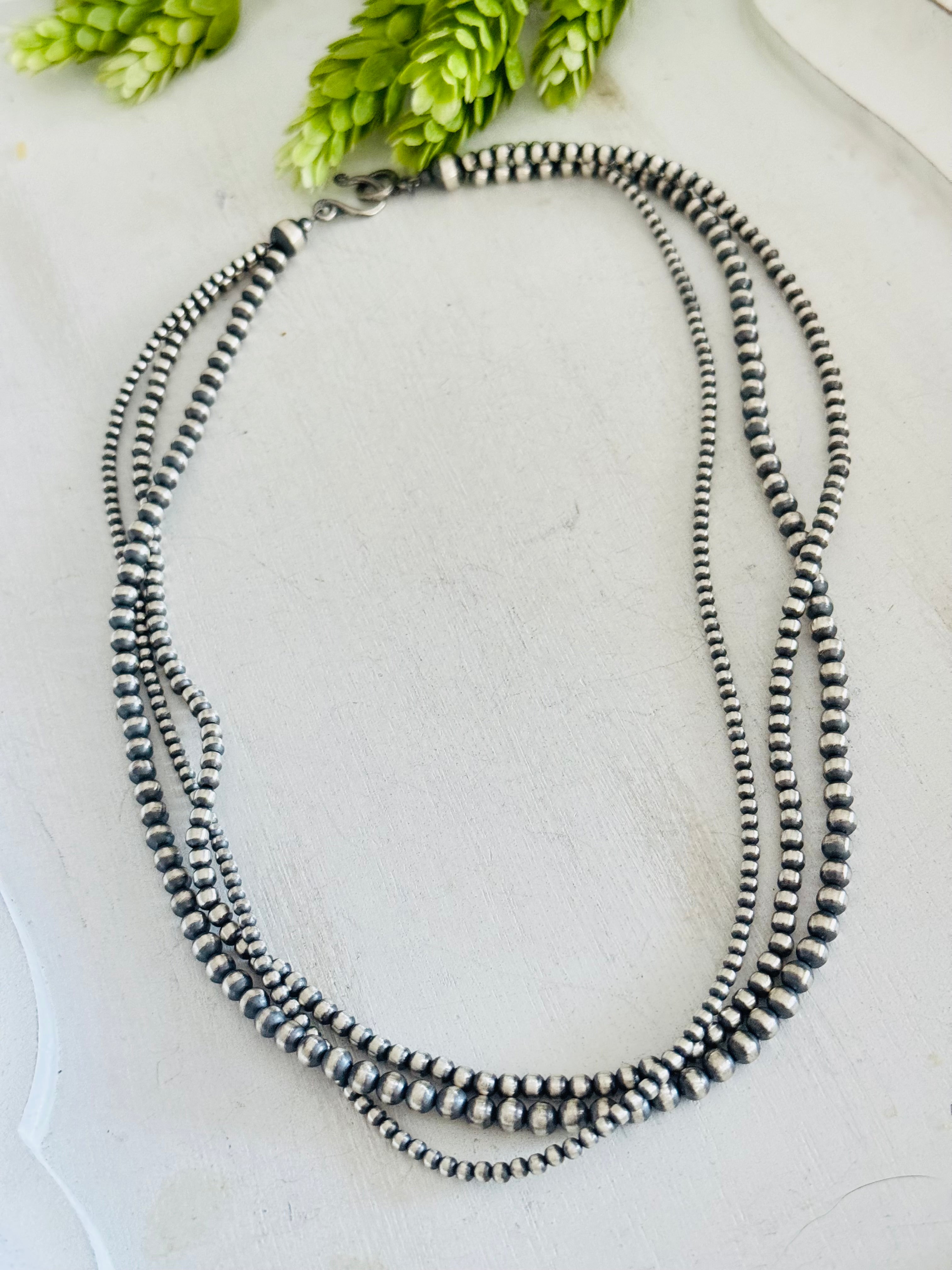 Navajo Strung 3 Strand Sterling Silver Pearls Beaded Necklace. It measures 22 inches long.