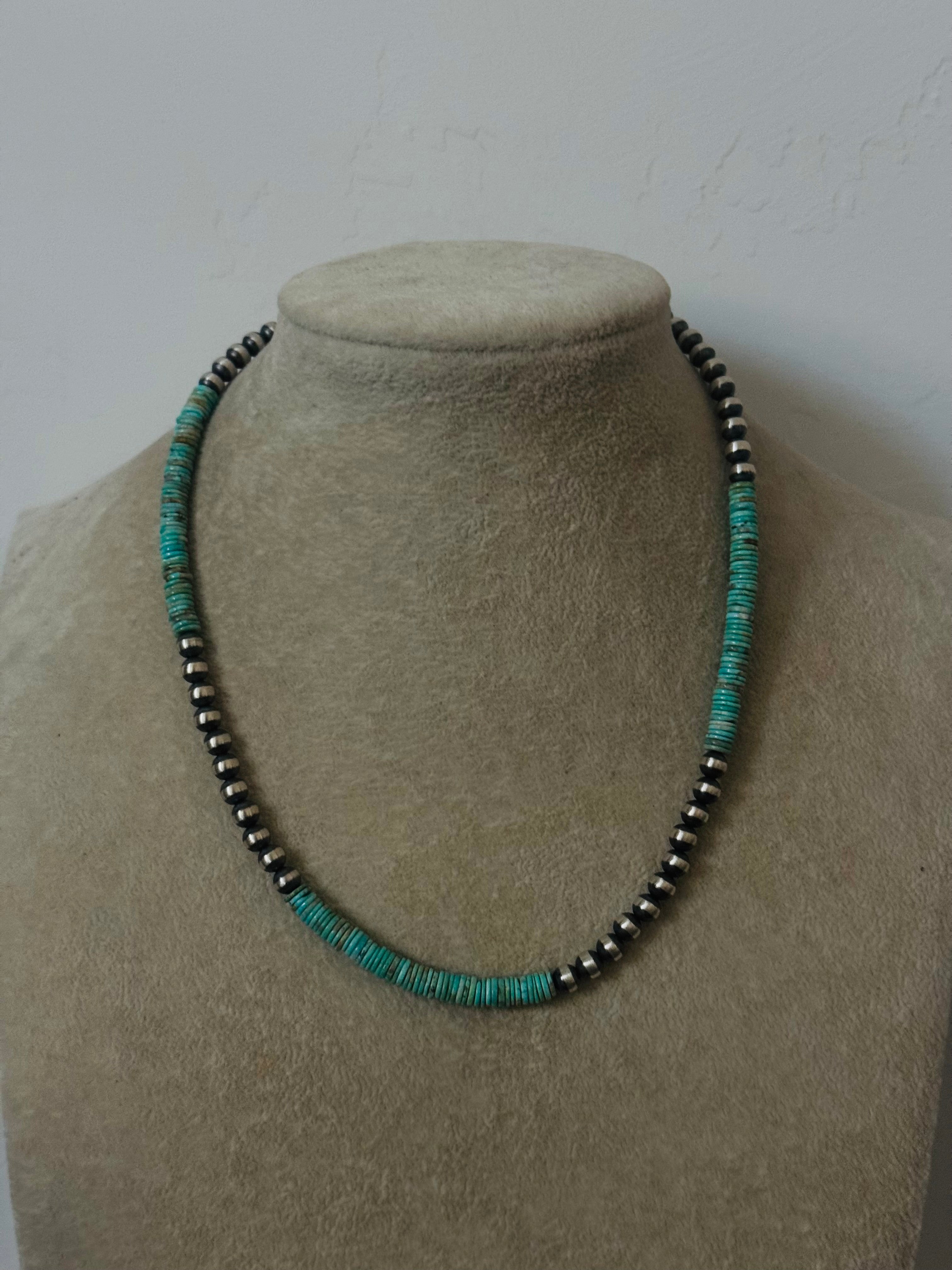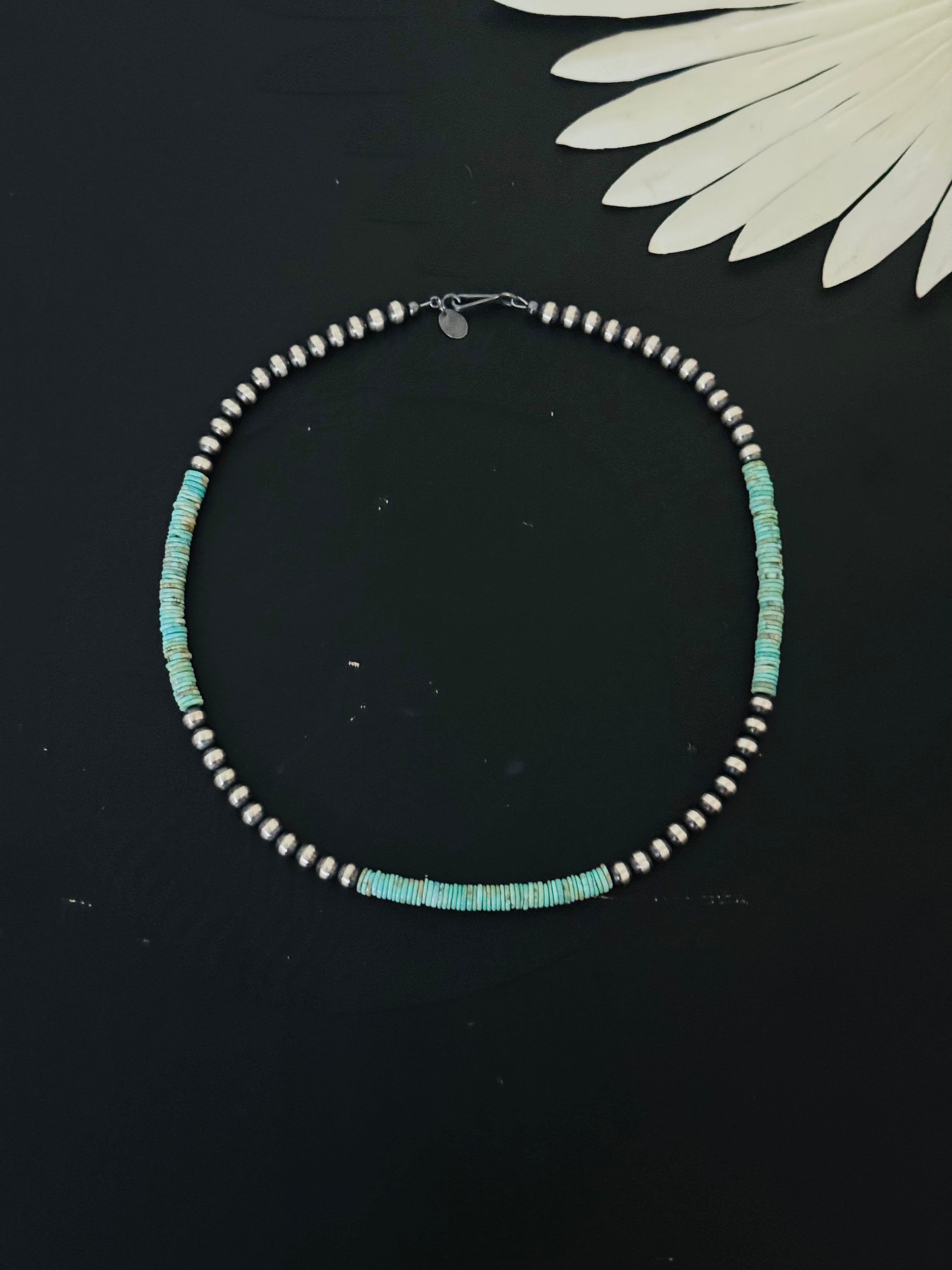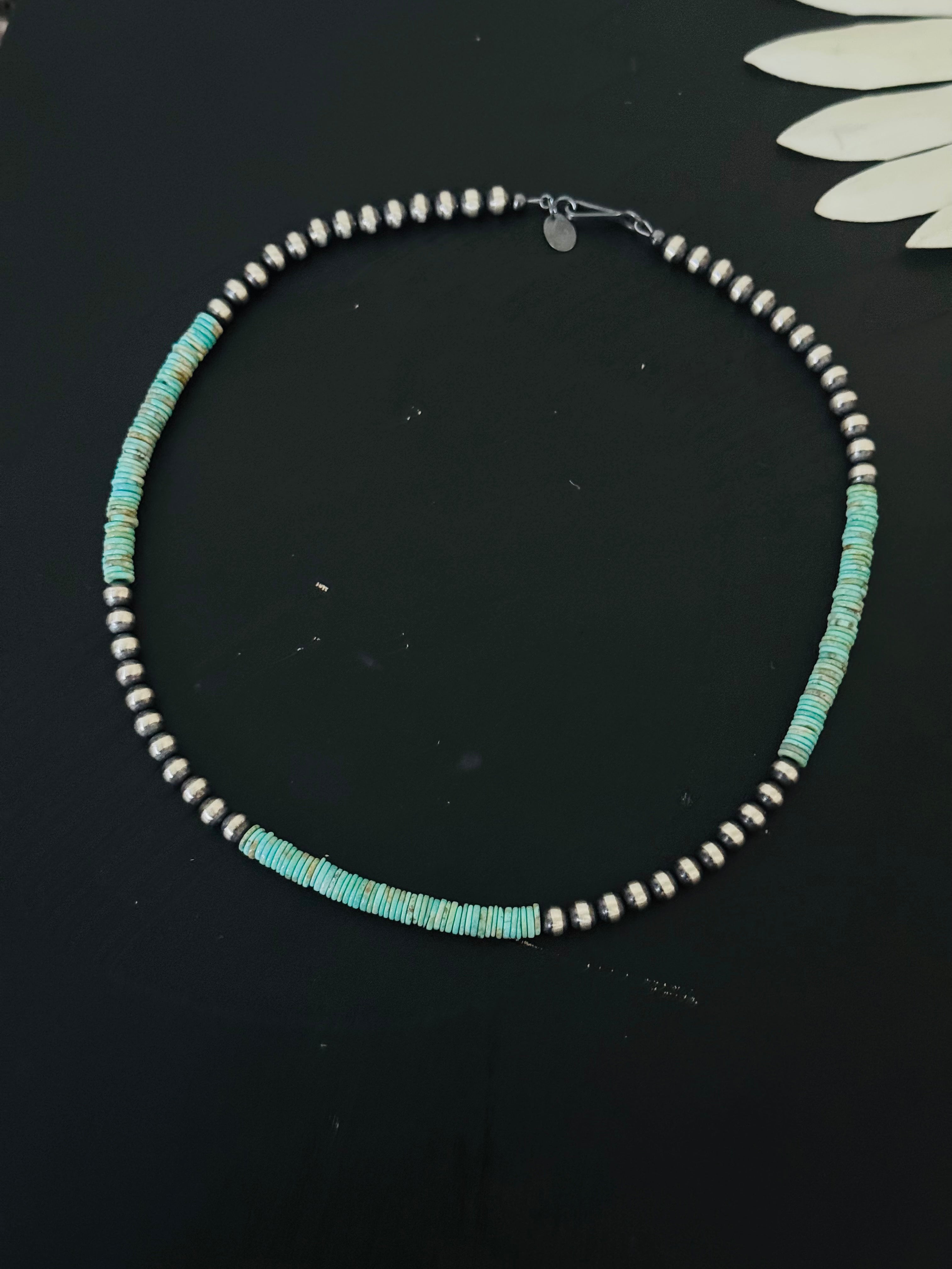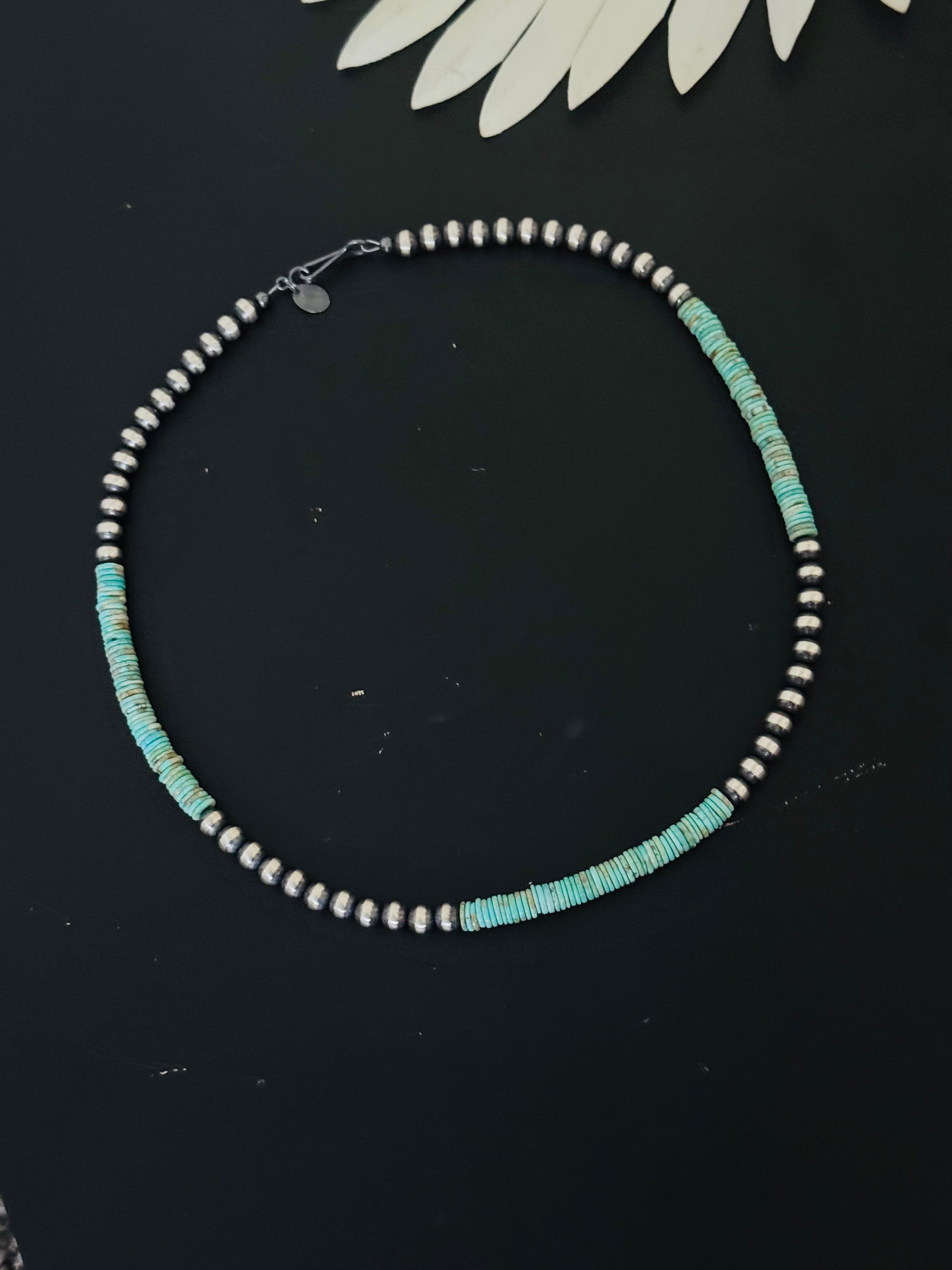 Navajo Strung Composite Turquoise & Sterling Silver Beaded Pearl Necklace. It measures 16 inches long.