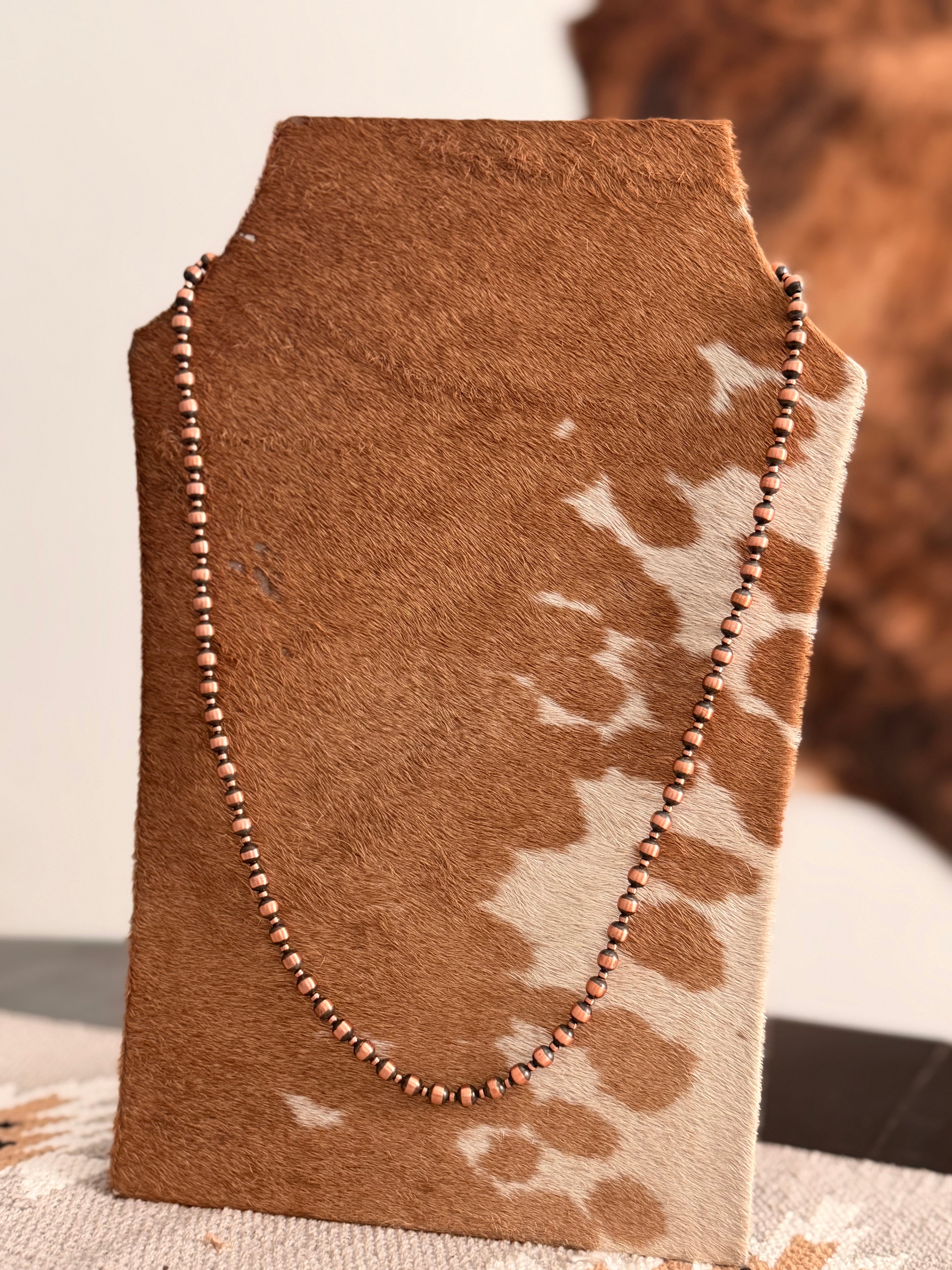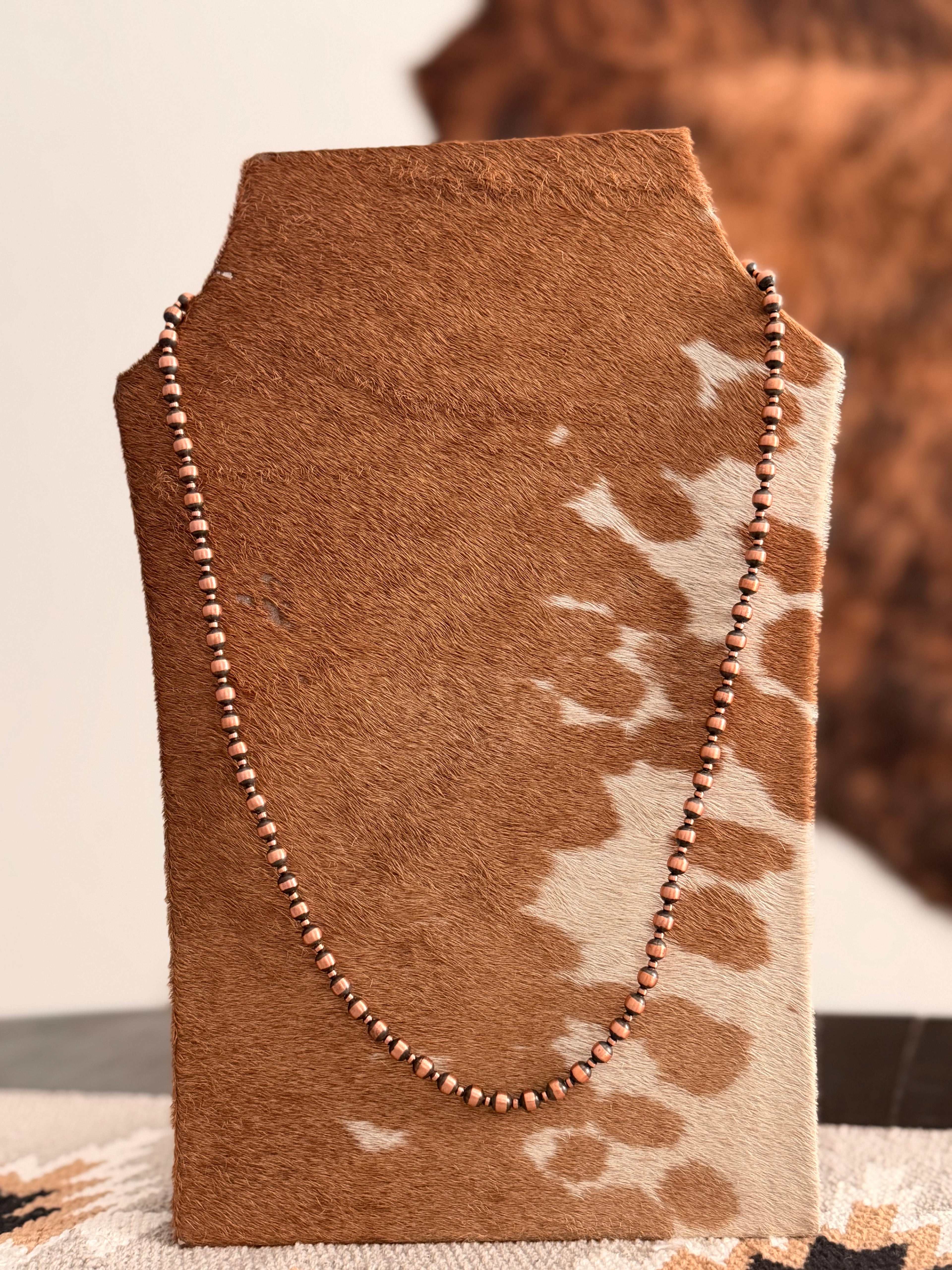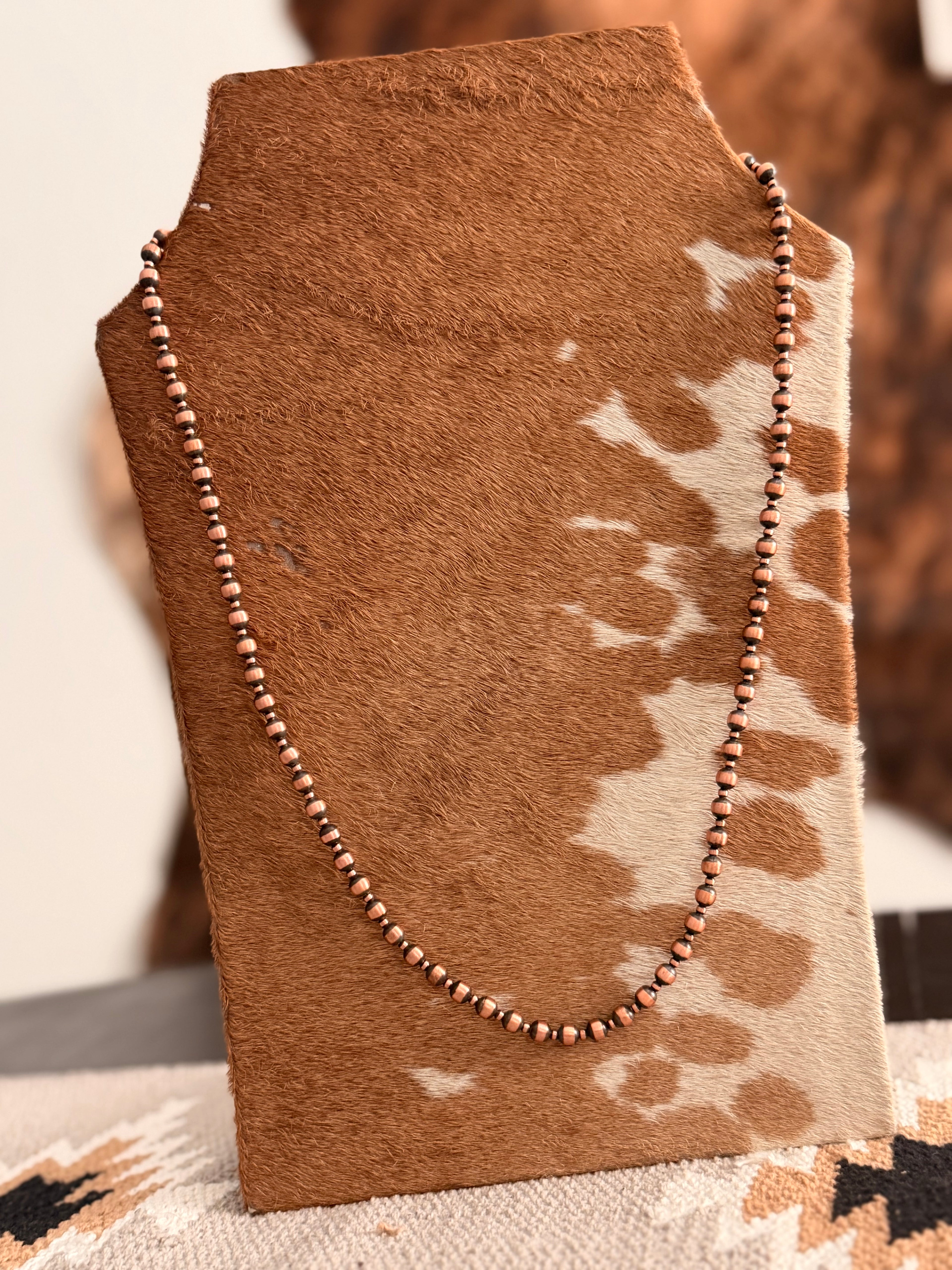 Navajo Strung Copper Machine Made Pearl Necklace. It measures 30 inches long.