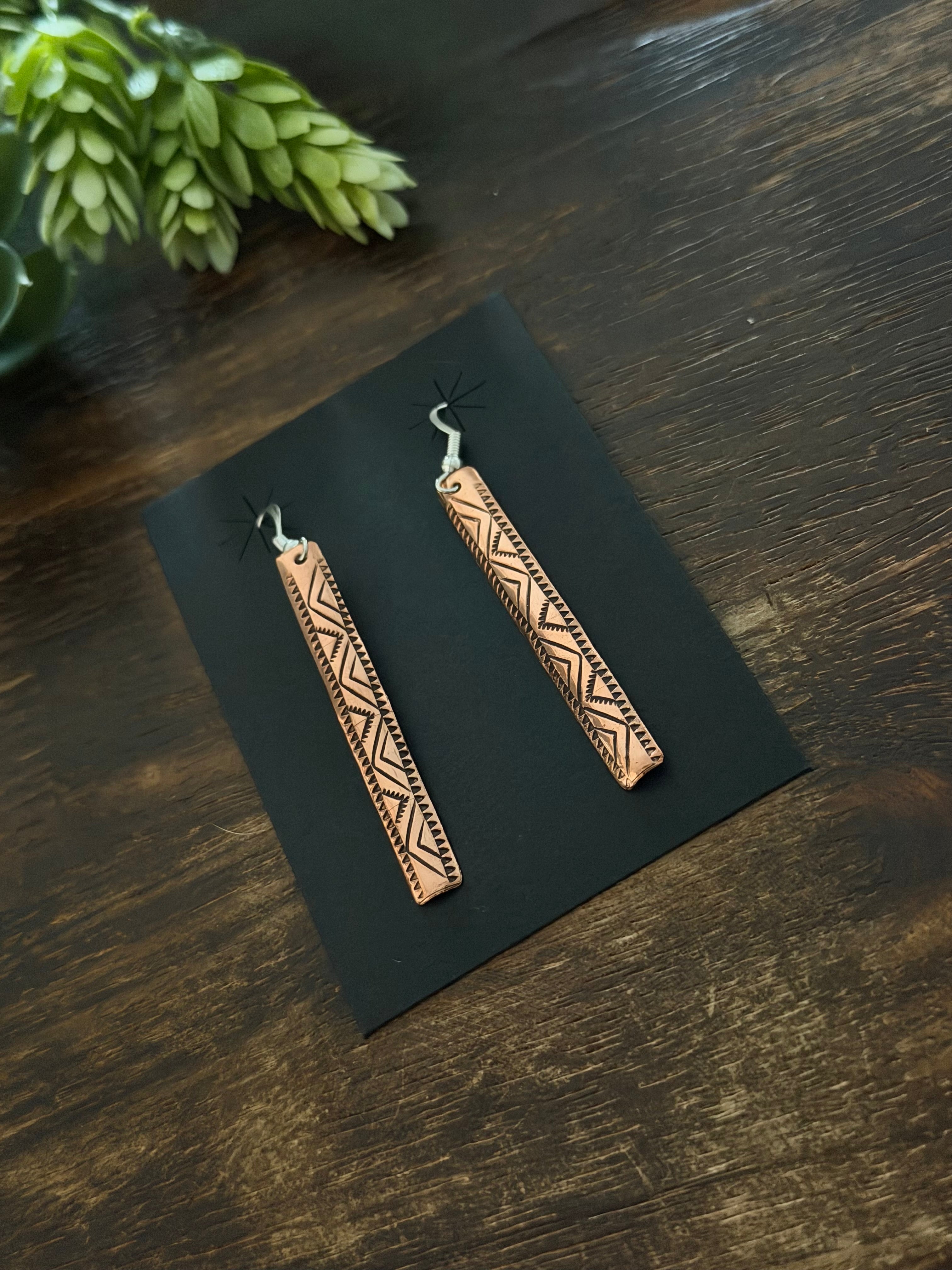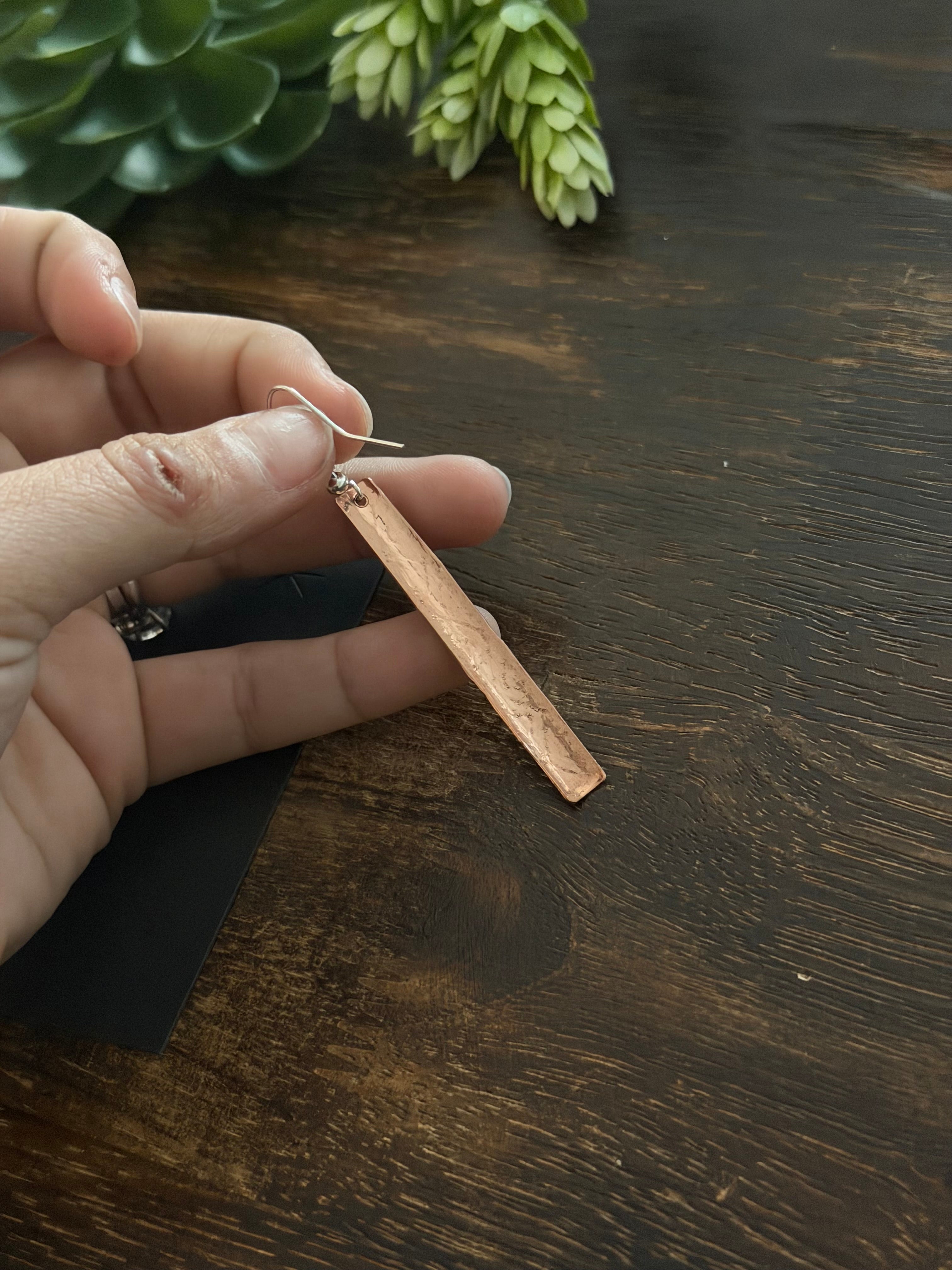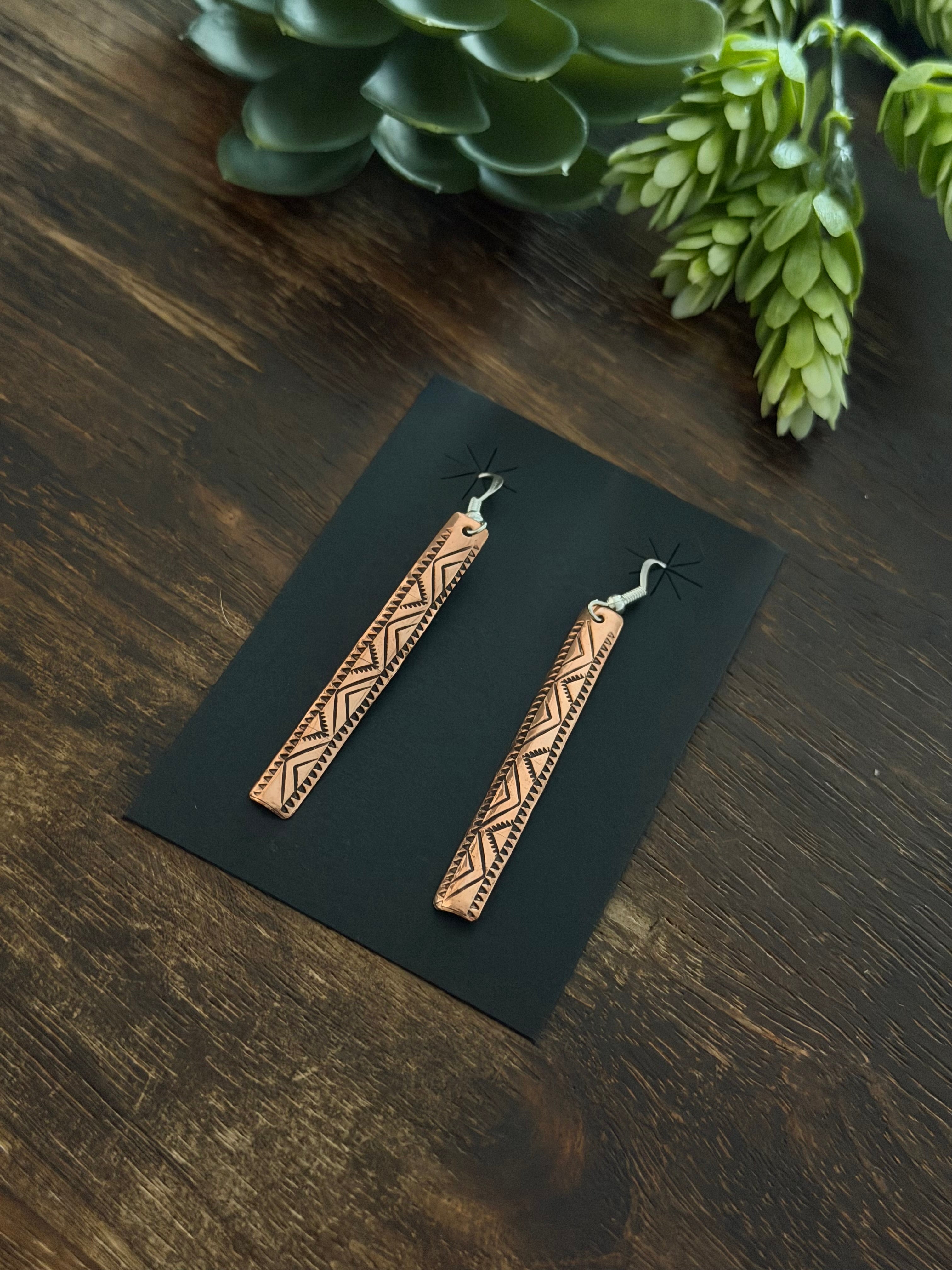 Navajo Strung Copper & Sterling Silver Dangle Earrings. It measures 2 3/4 inches long and 1/4 of an inch wide.