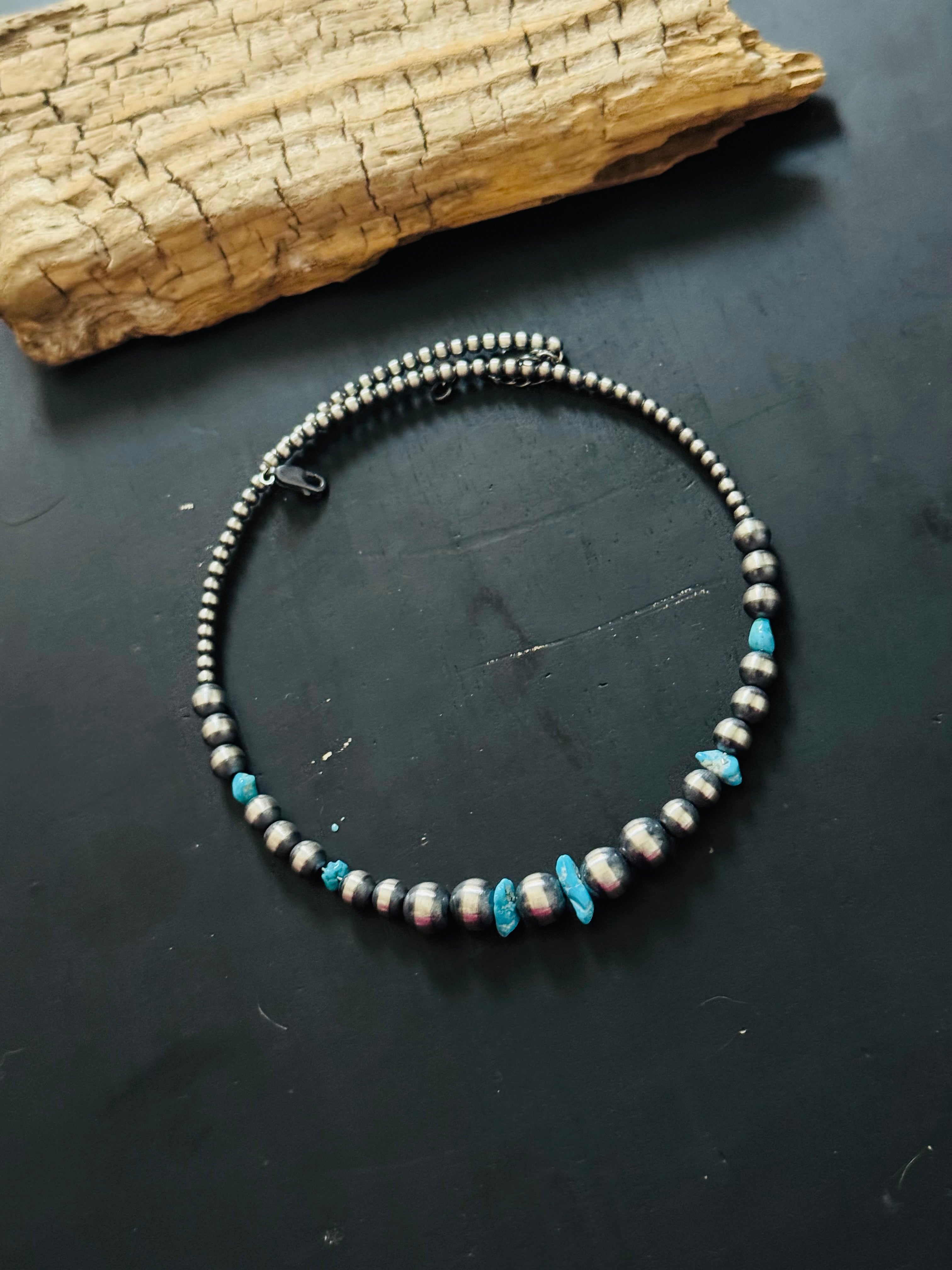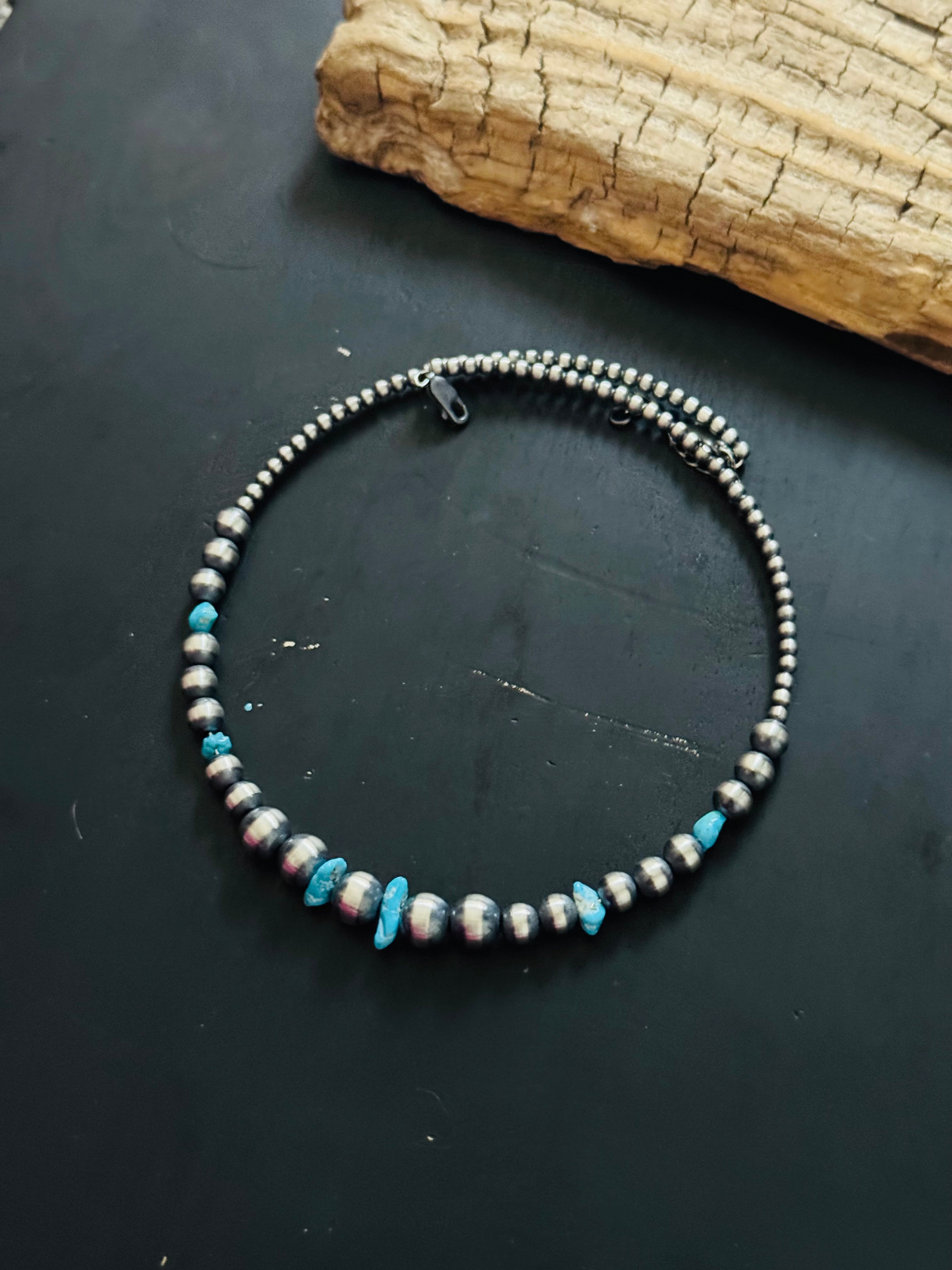 Navajo Strung Kingman Turquoise & Graduated Sterling Silver Pearls Beaded Memory Wire Necklace. It measures 15-16 1/2 inches long.