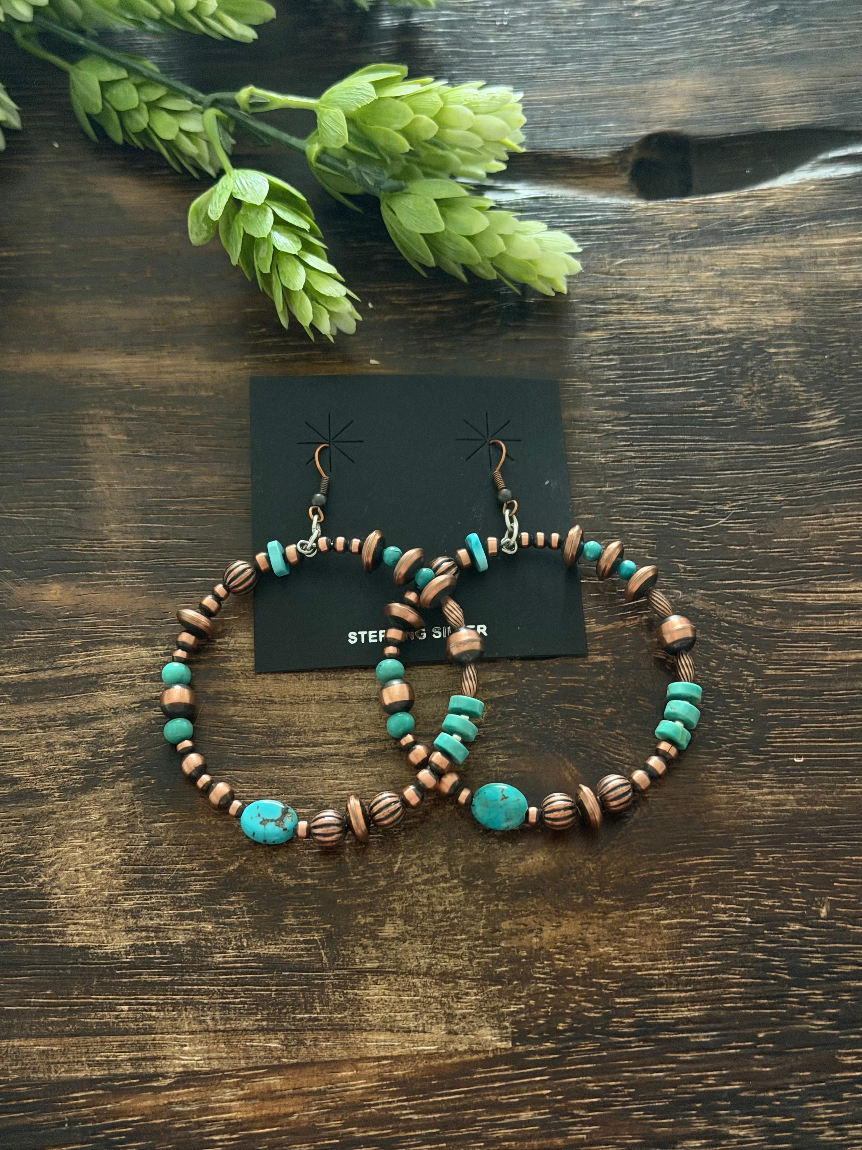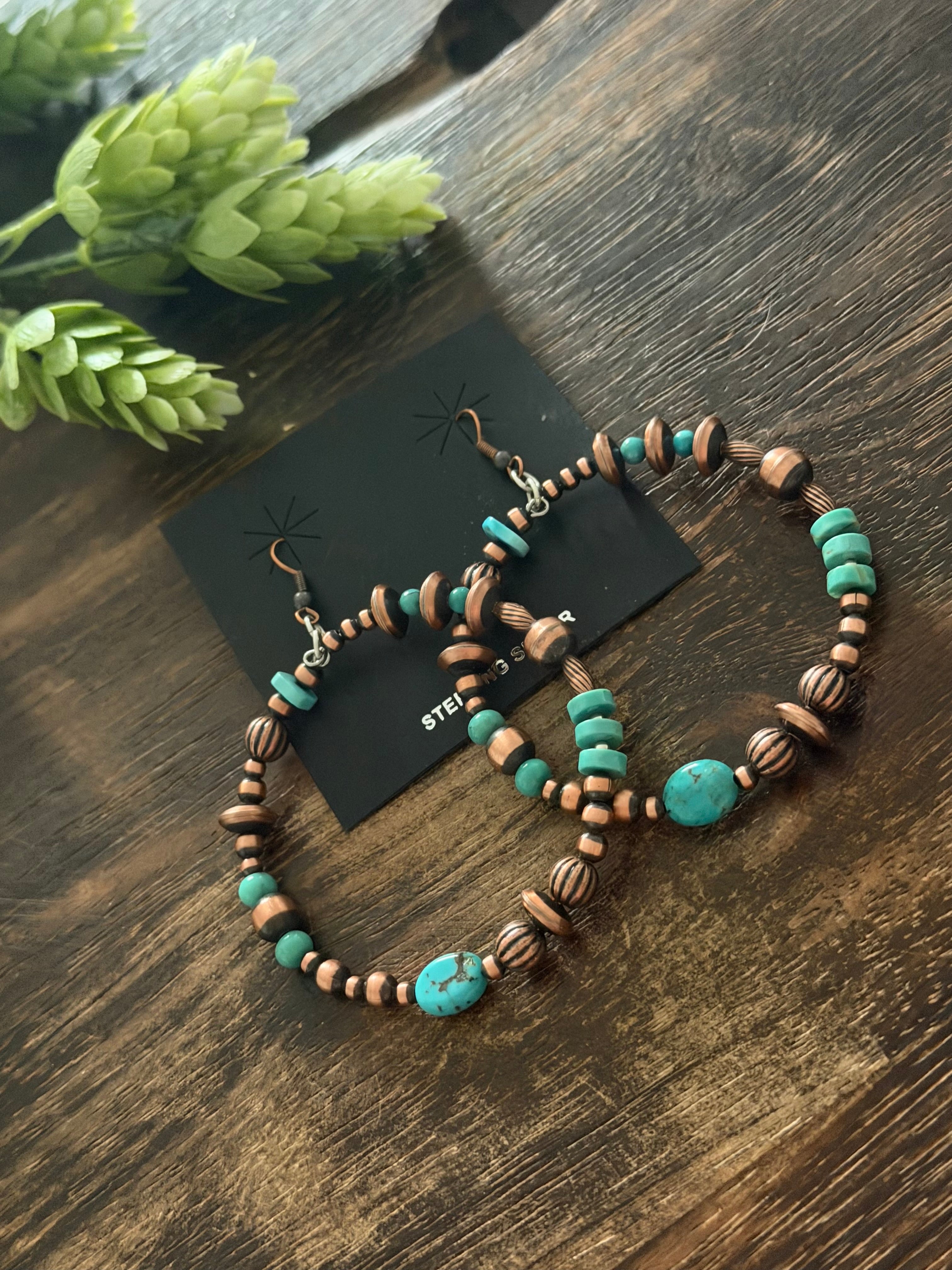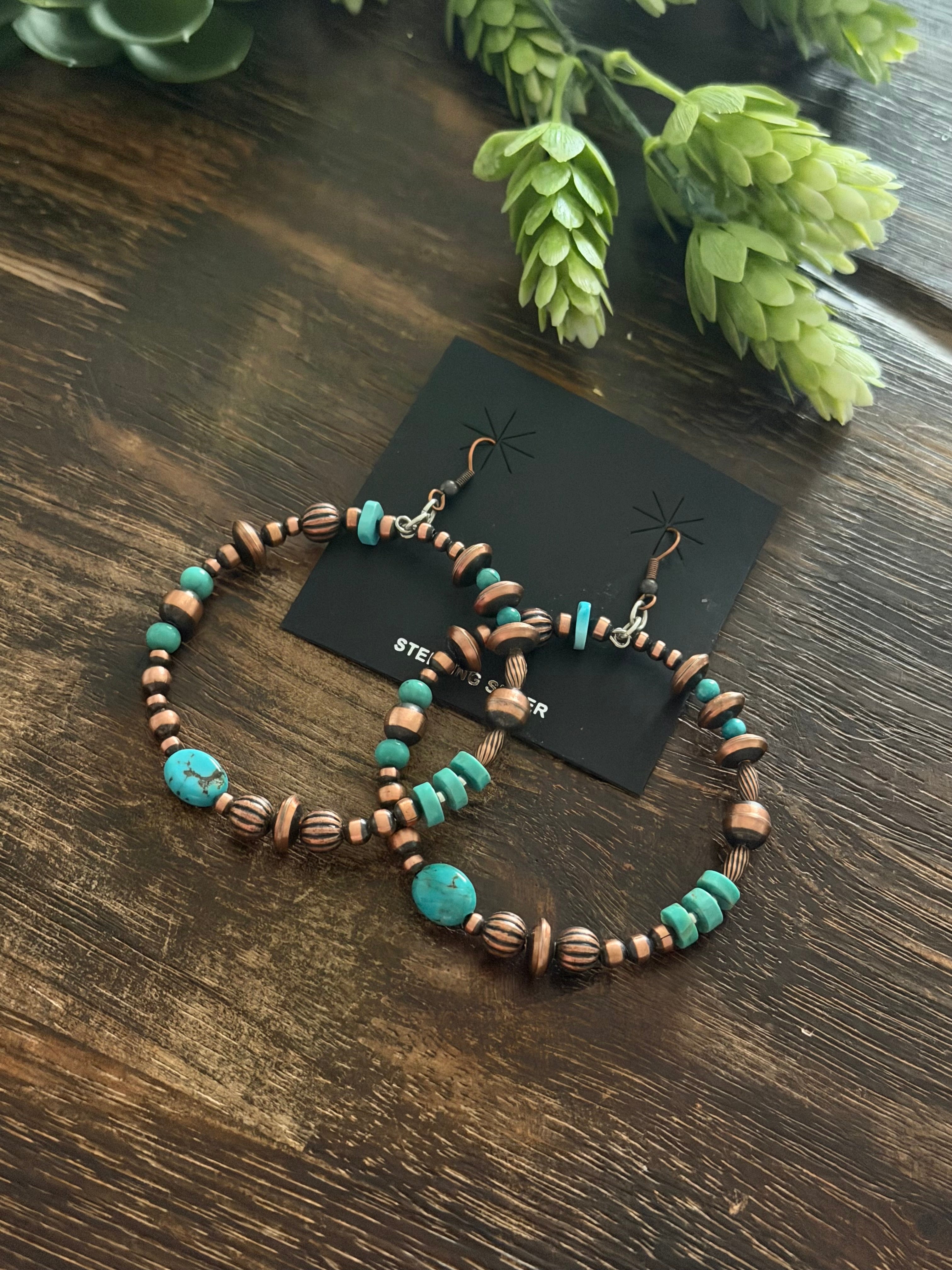 Navajo Strung Kingman Turquoise & Copper Graduated Machine Made Pearls Dangle Earrings