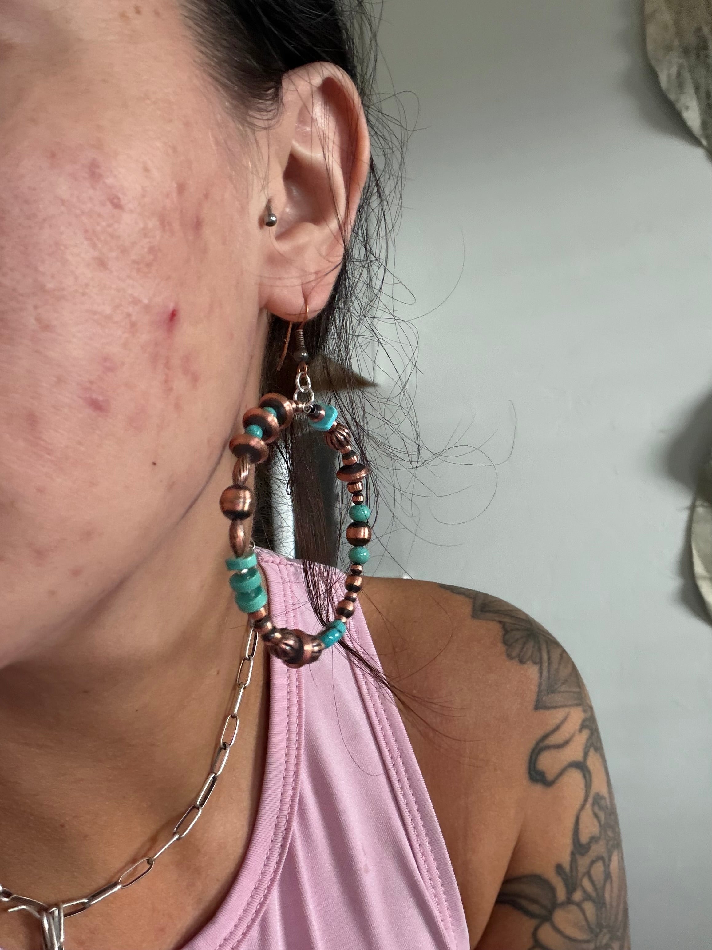 Navajo Strung Kingman Turquoise & Copper Graduated Machine Made Pearls Dangle Earrings. It measures 3 1/4 inches long.