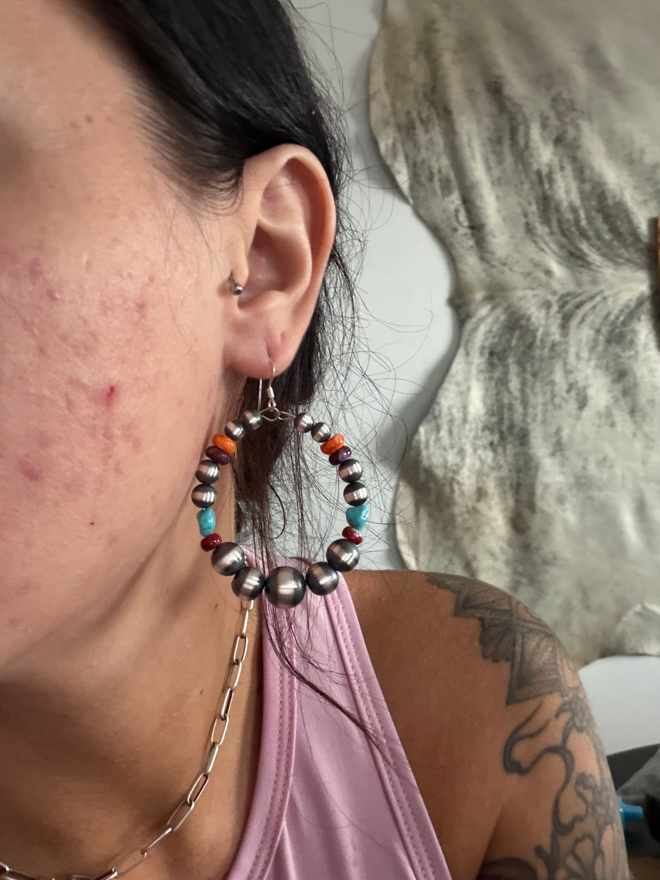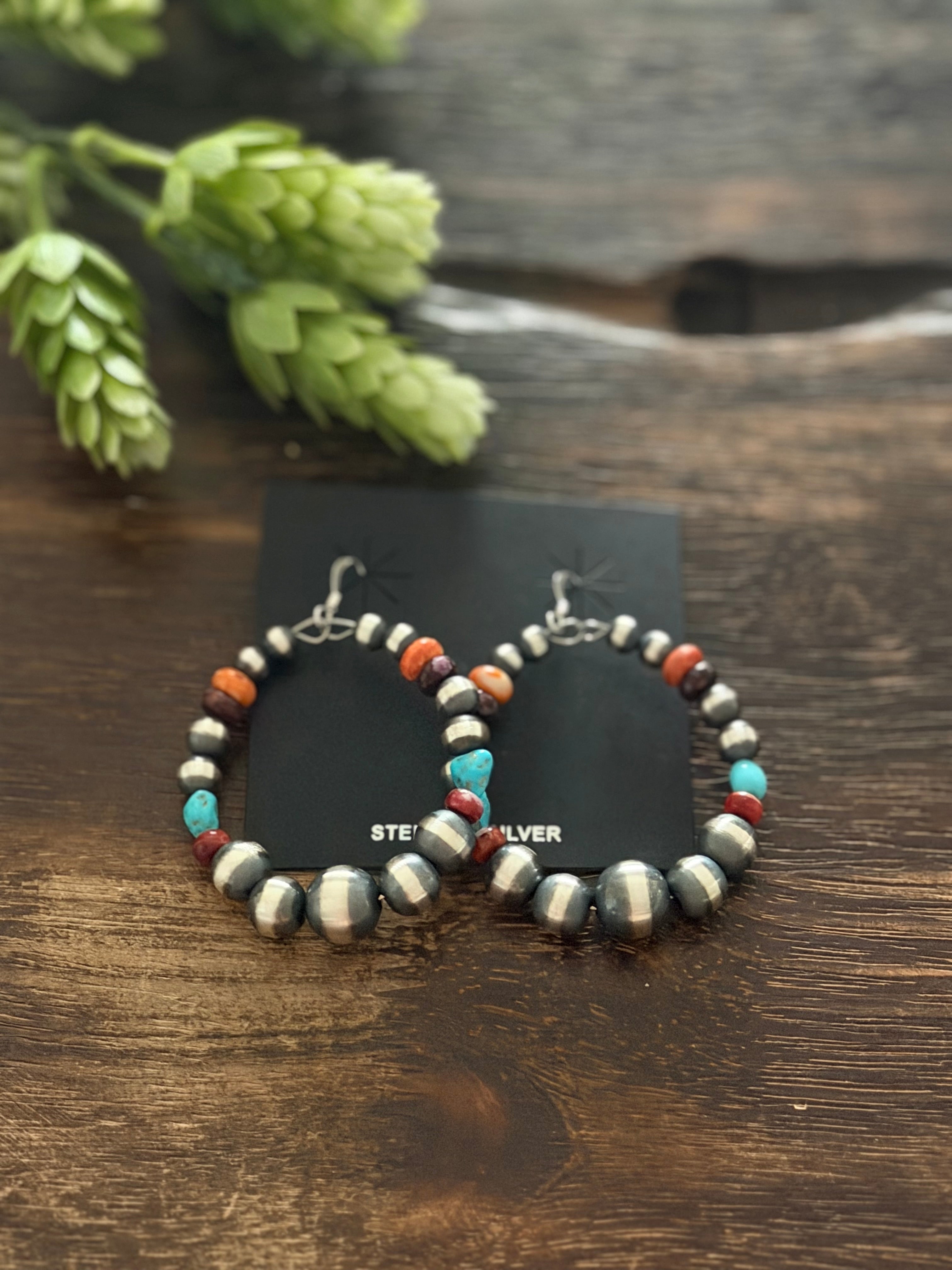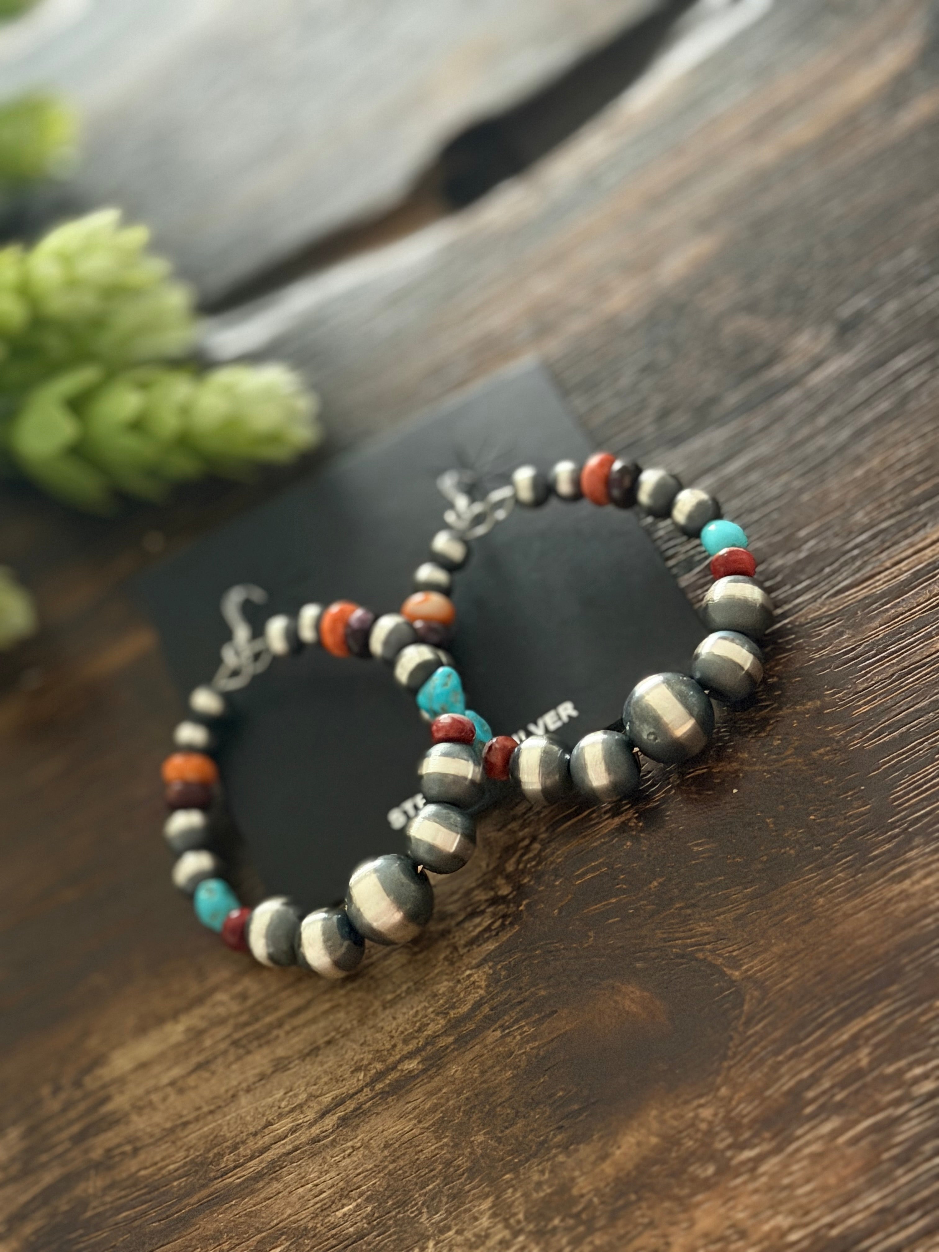 Navajo Strung Multi Stone & Sterling Silver Graduated Machine Made Pearls Dangle Earrings. It measures 2 3/8 inches long.