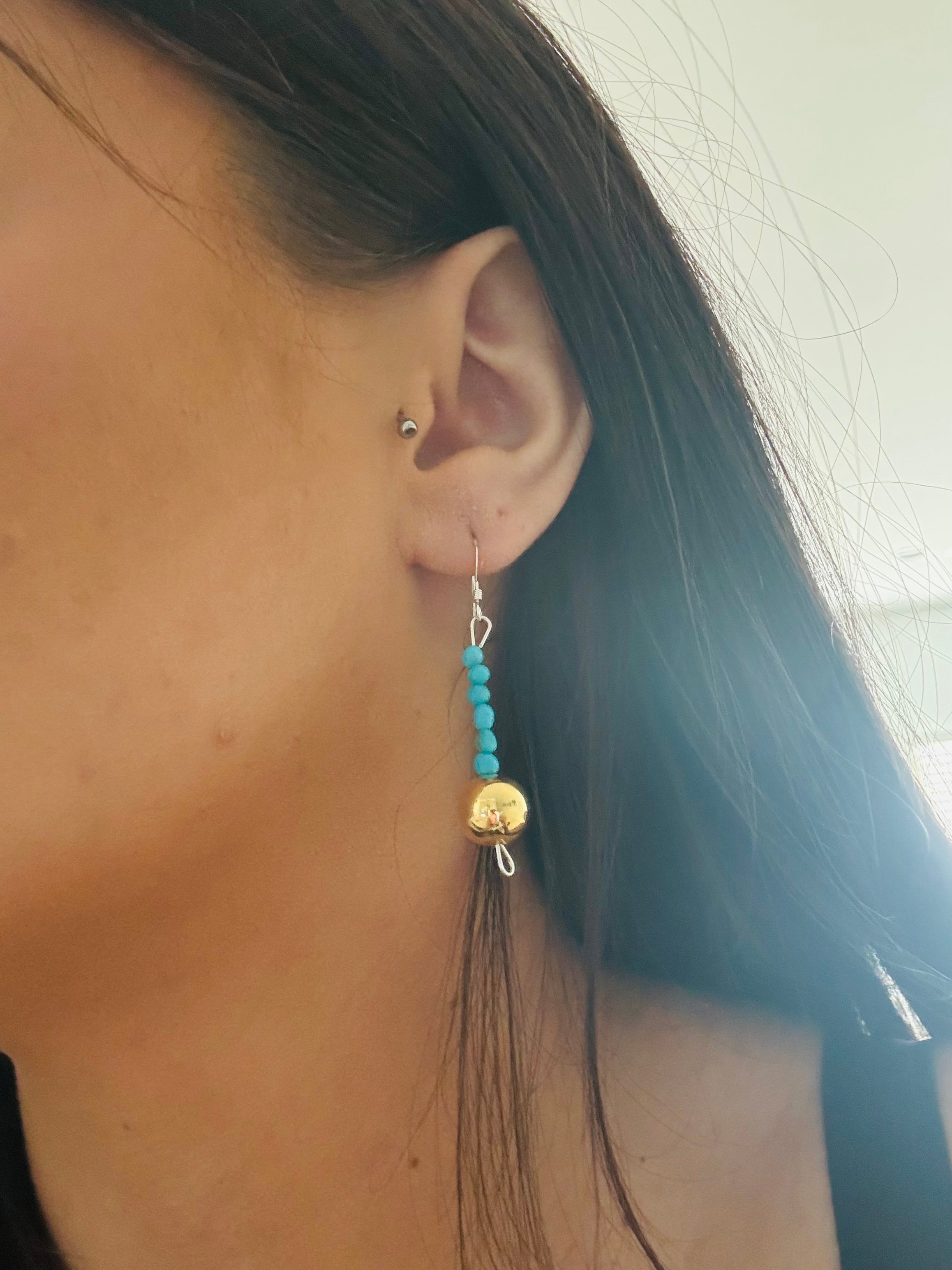 Navajo Strung Kingman Turquoise & 18K Gold Plated Sterling Silver Beaded Dangle Earrings. It measures 2 inches long. Stones will differ due to natural stones.