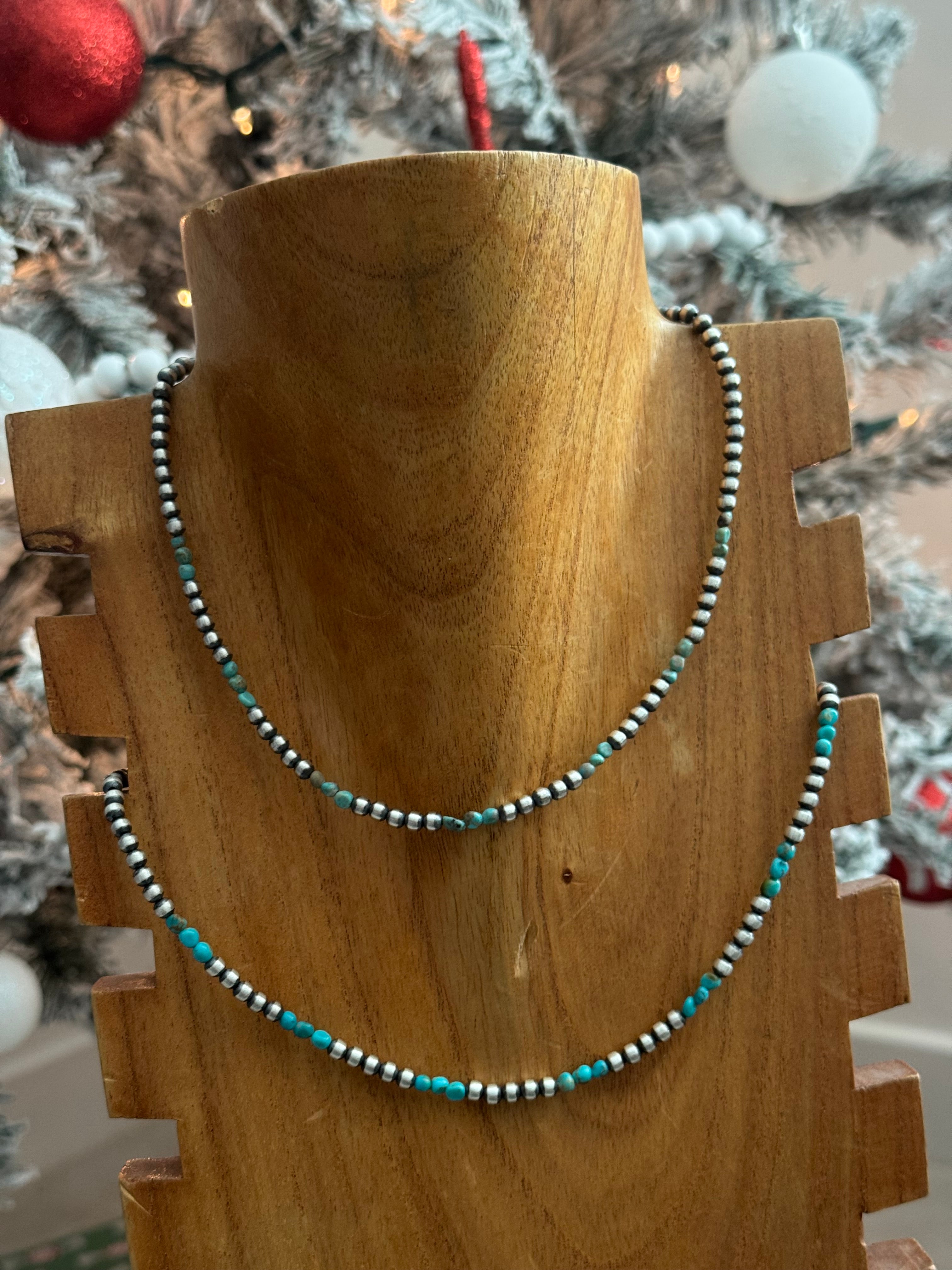 Navajo Strung Kingman Turquoise & Sterling Silver Beaded Pearl Necklace. It measures 16 inches long.